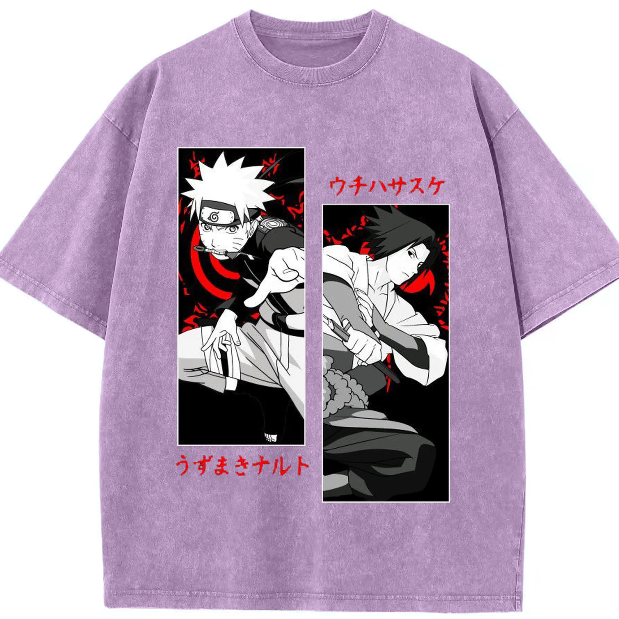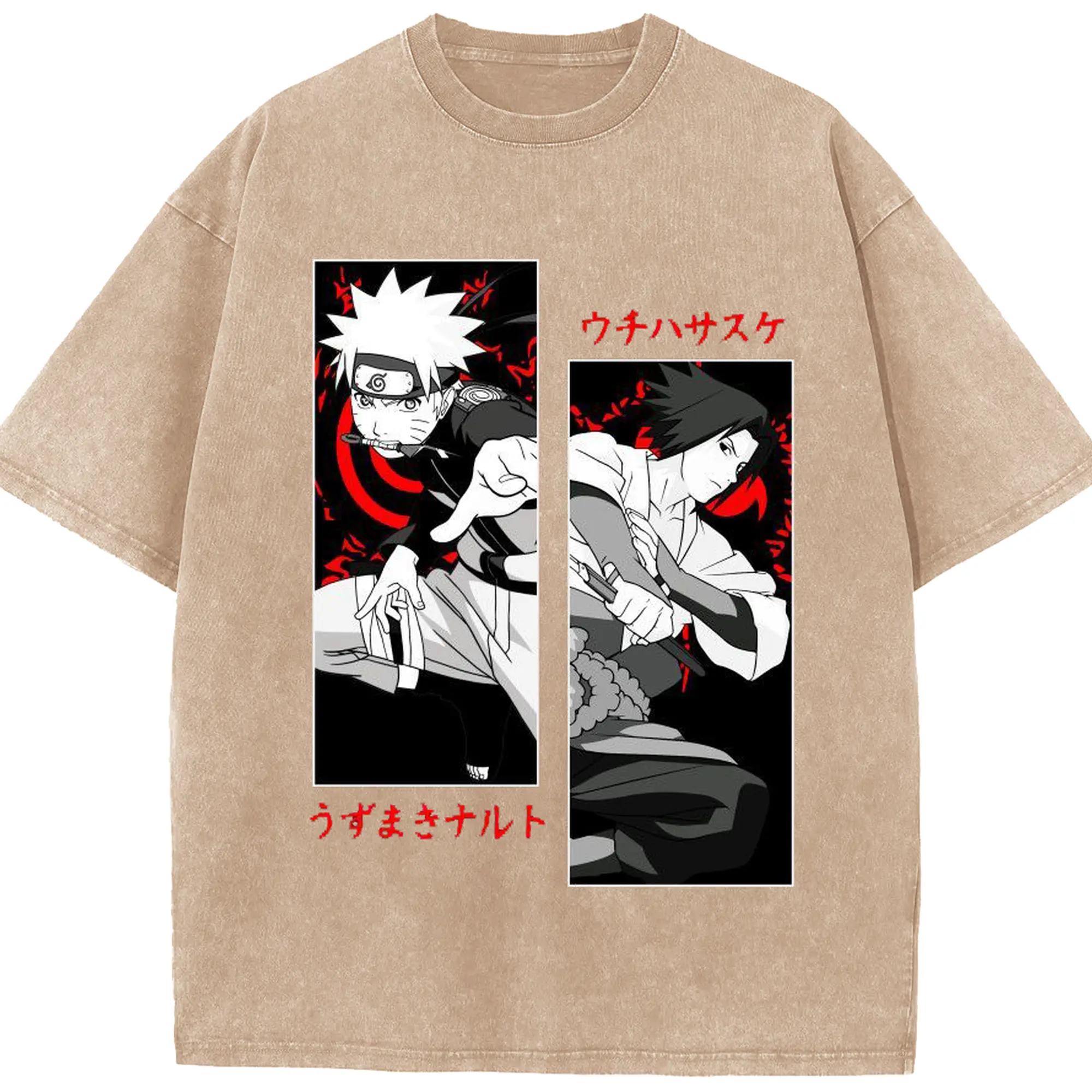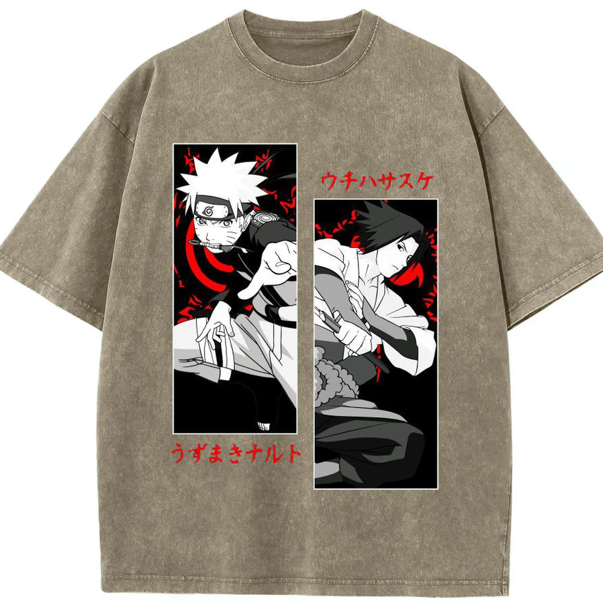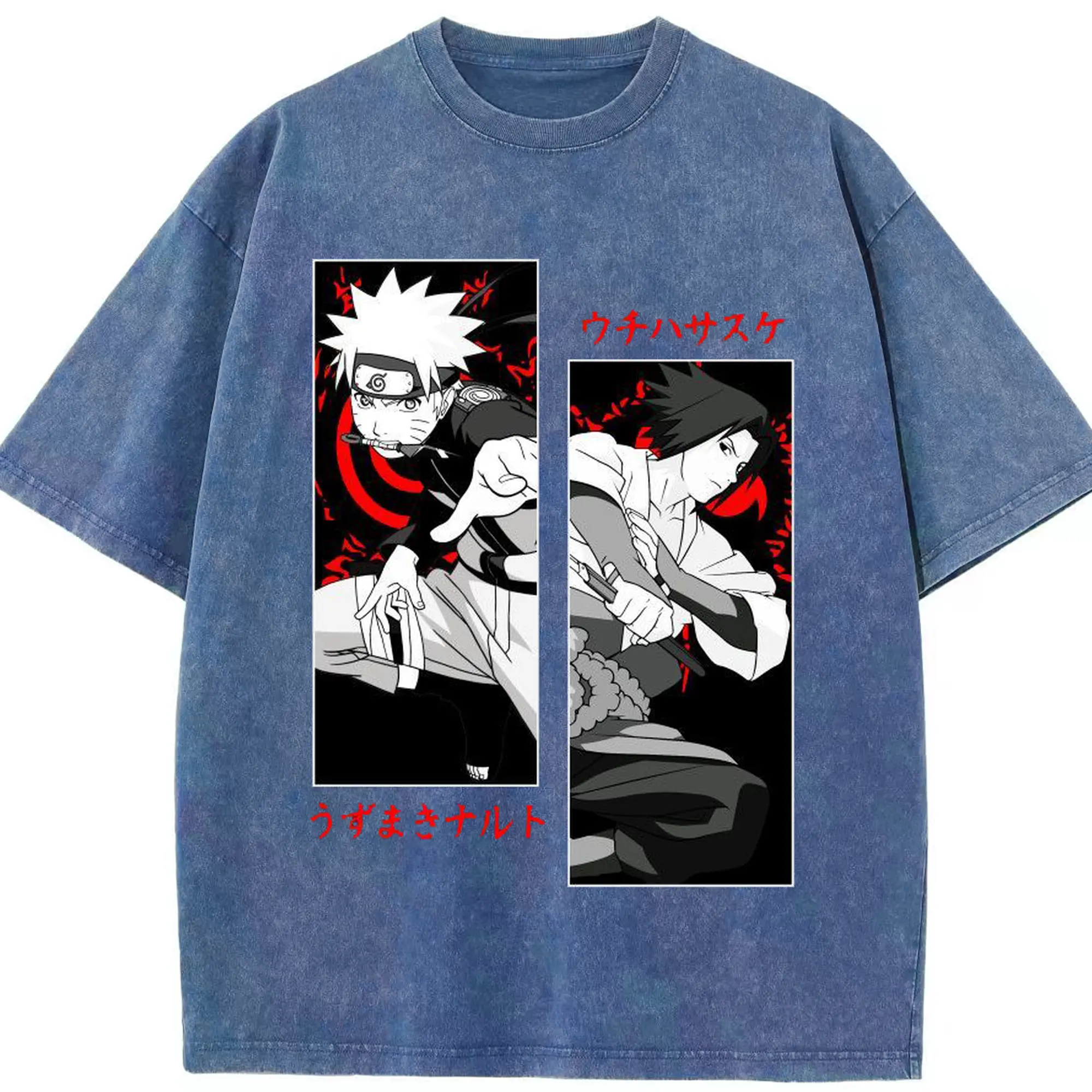 うずまき ナルト ナルト サスケ対決 - 綿100% ヴィンテージ風 半袖Tシャツ ・ フロントプリント ・ 柔らか肌触り ・ 通気性 快適 ・ スポーツ カジュアル 外出用