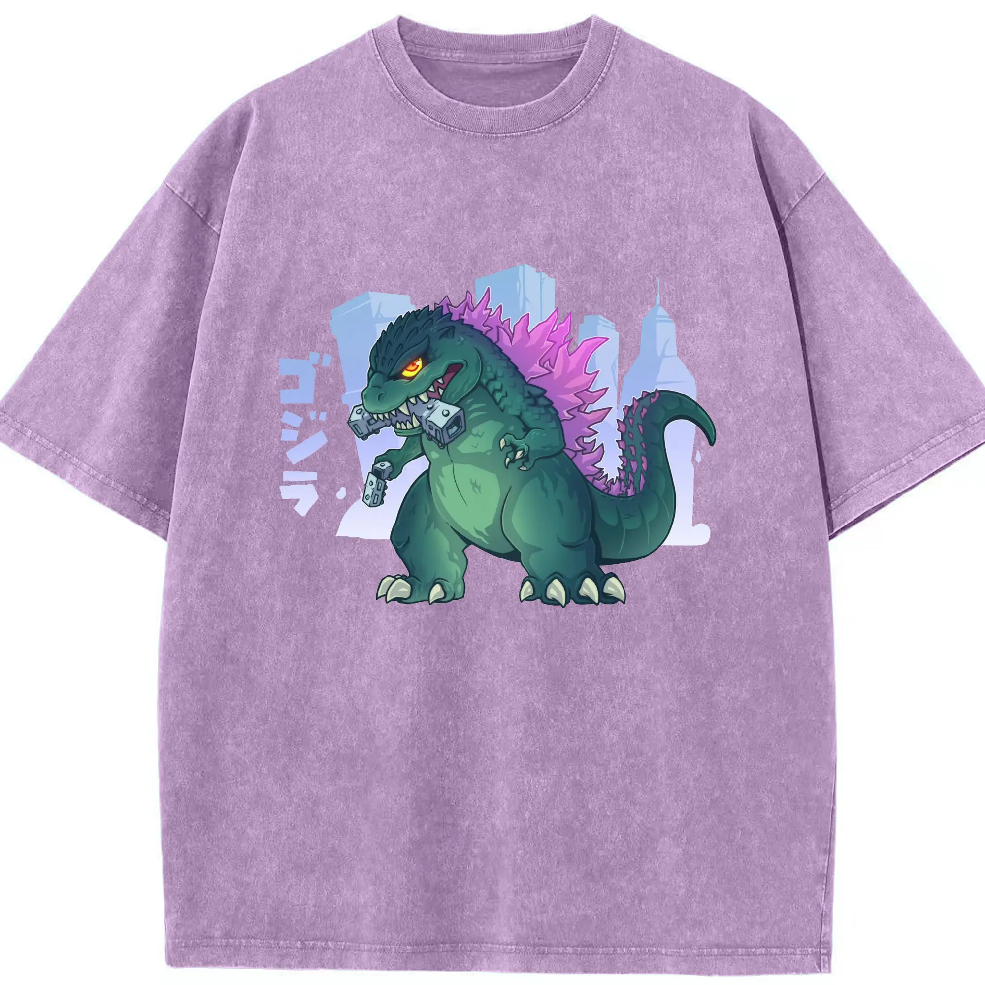 ゴジラの食事タイム - 綿100% ヴィンテージ風 半袖Tシャツ ・ フロントプリント ・ 柔らか肌触り ・ 通気性 快適 ・ スポーツ カジュアル 外出用