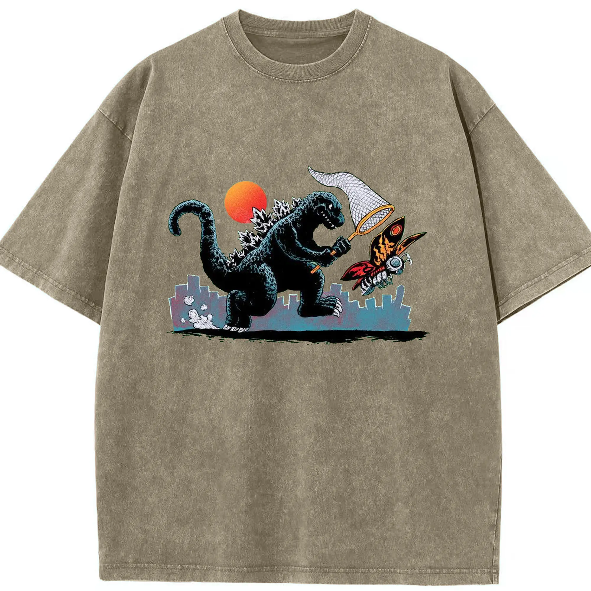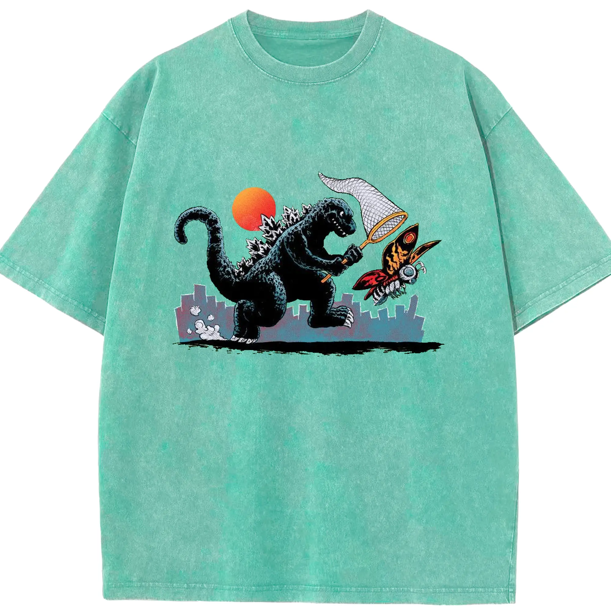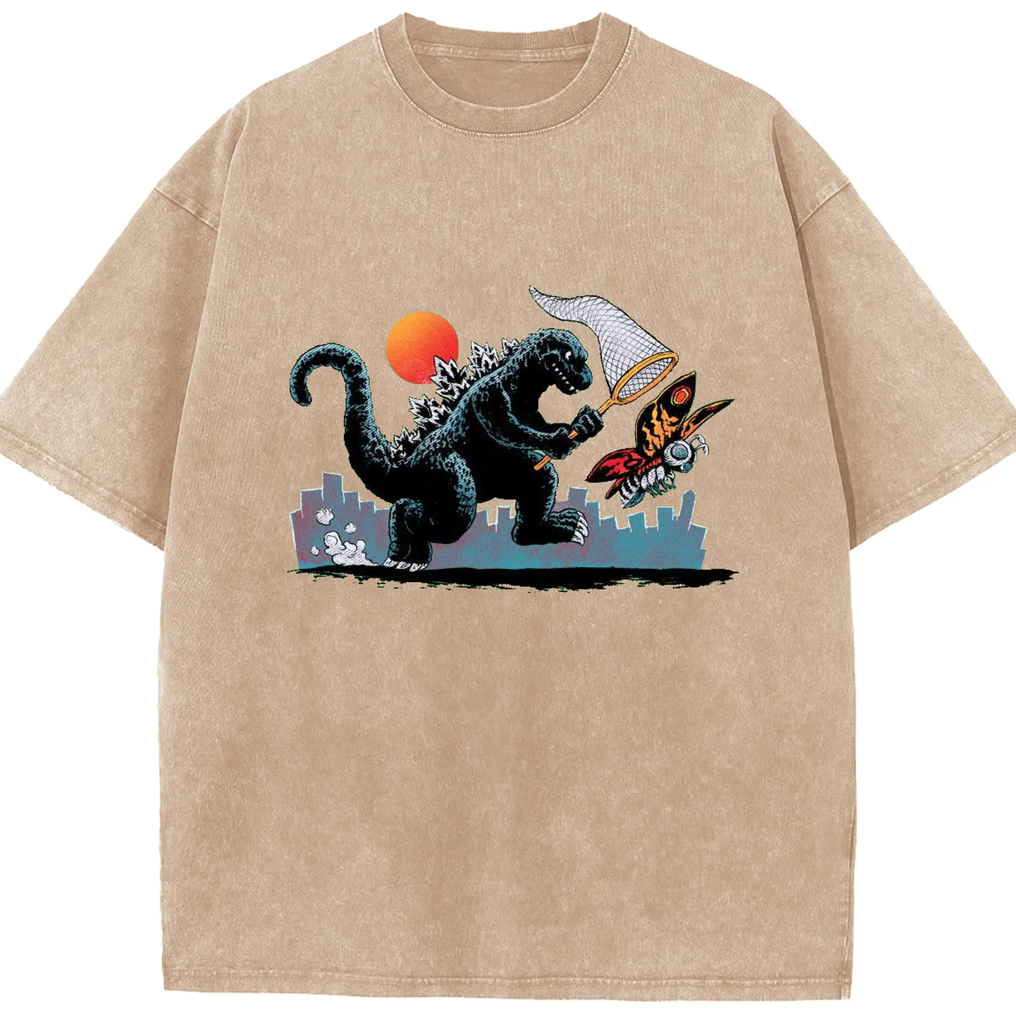 ゴジラとモスラ 怪獣アート - 綿100% ヴィンテージ風 半袖Tシャツ ・ フロントプリント ・ 柔らか肌触り ・ 通気性 快適 ・ スポーツ カジュアル 外出用
