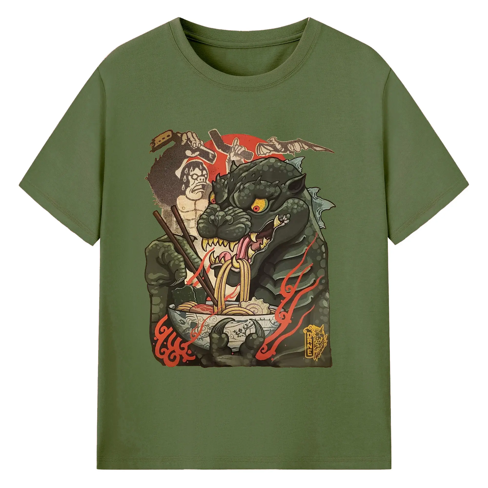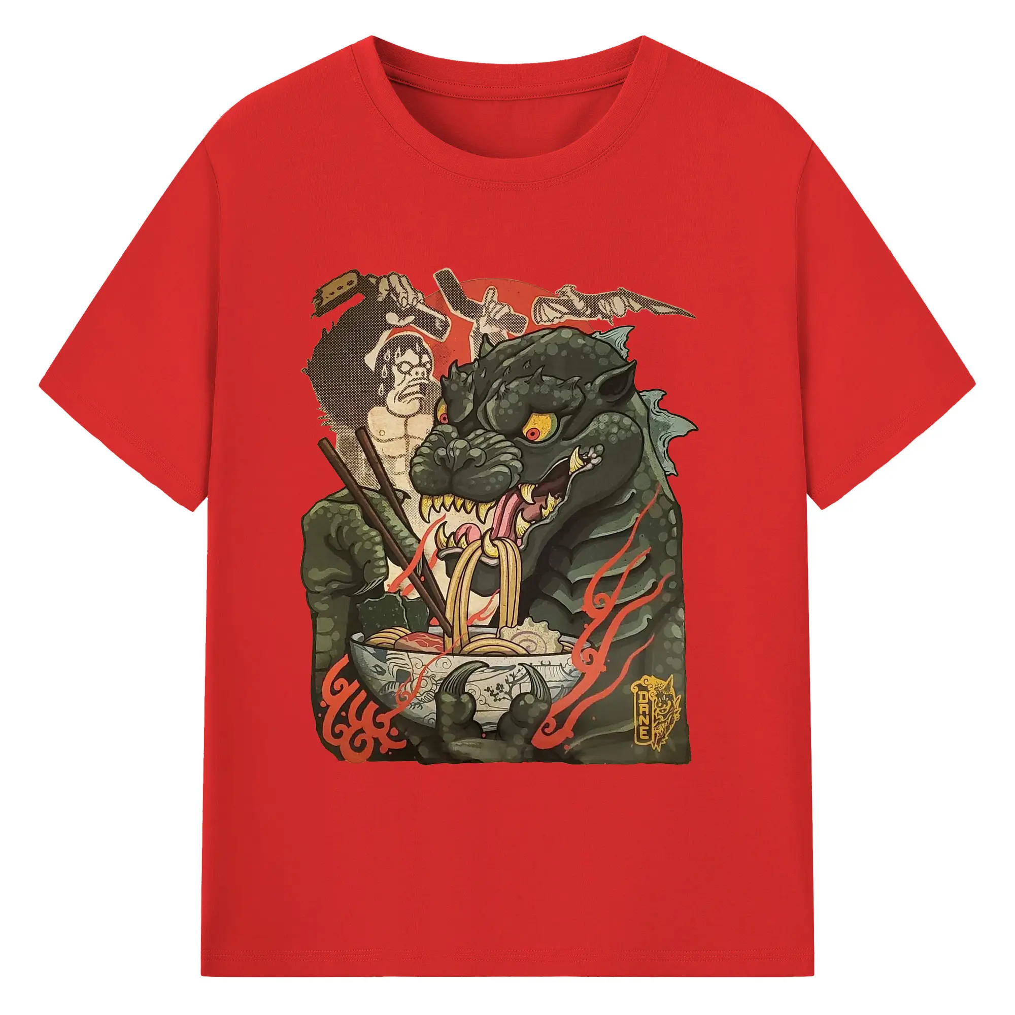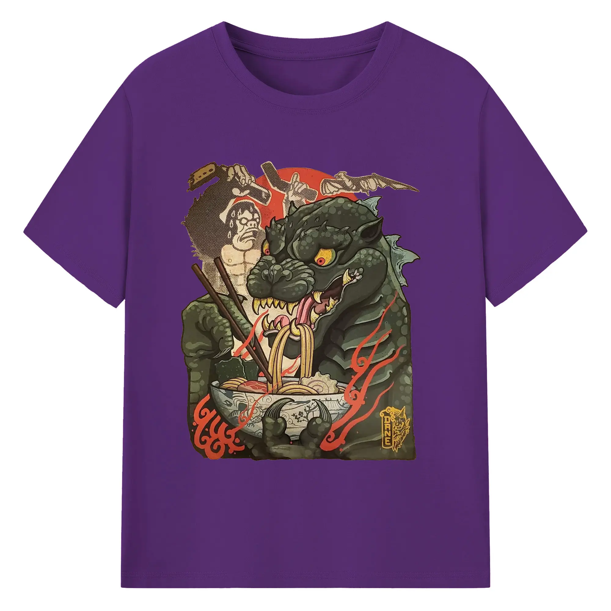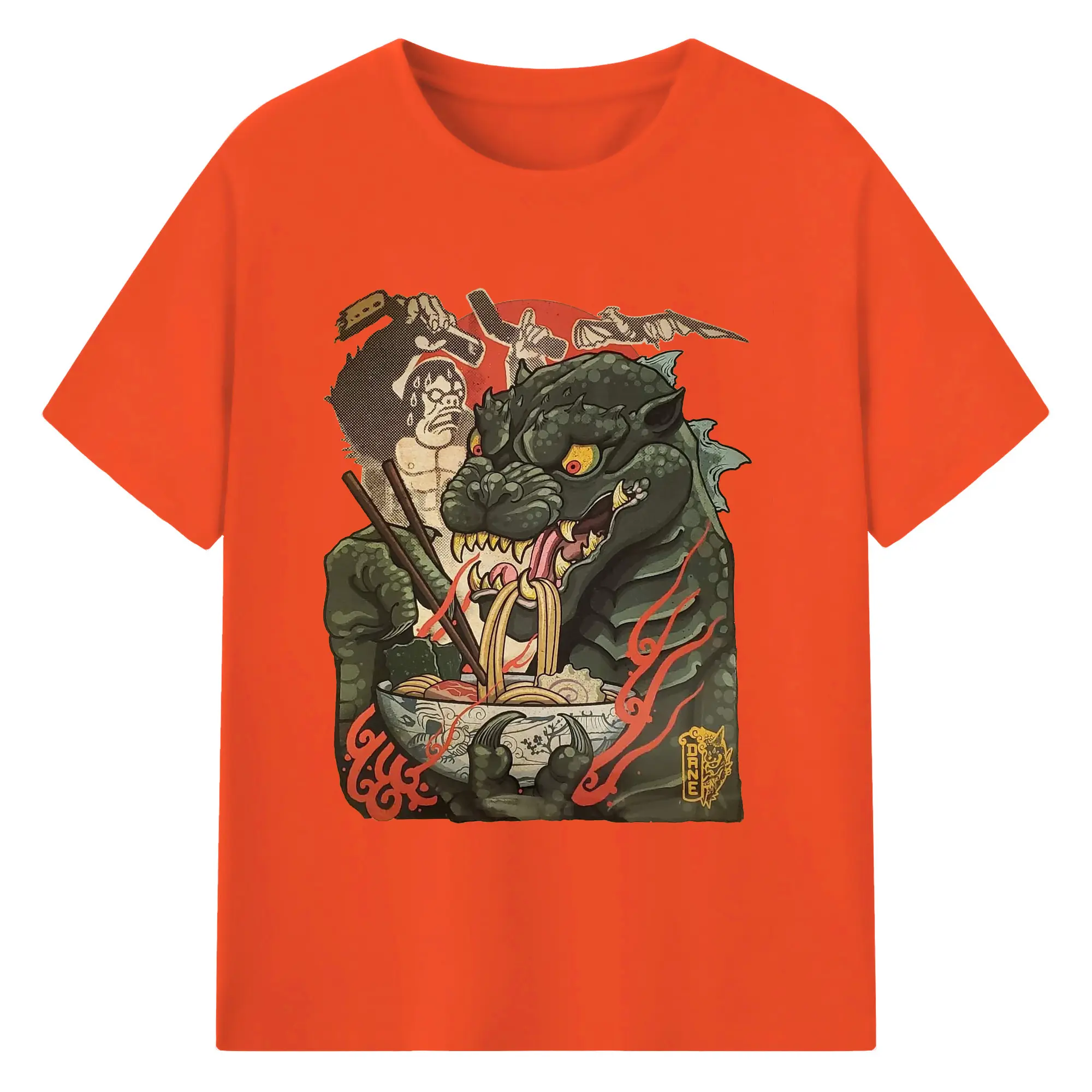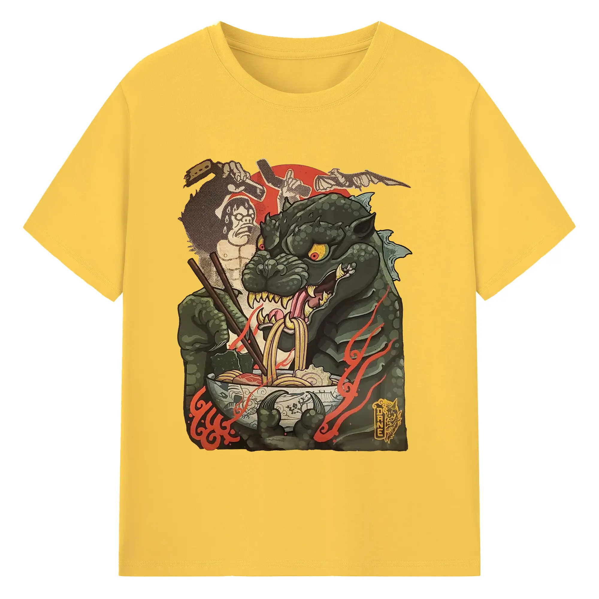 ゴジラの食事タイム - 綿100% 半袖Tシャツ ・ フロントプリント ・ 快適 通気性 ・ 日常使い 散歩 スポーツ用