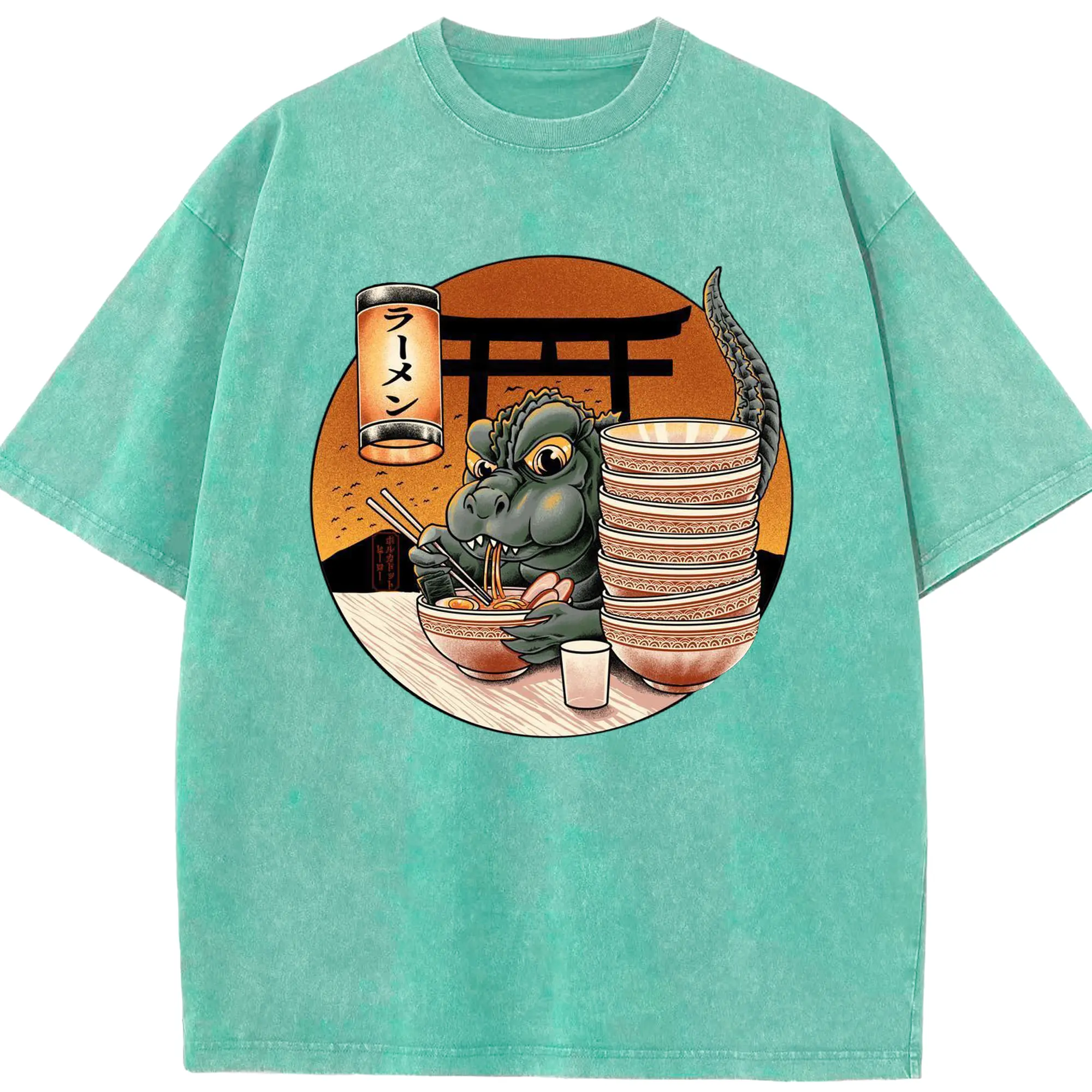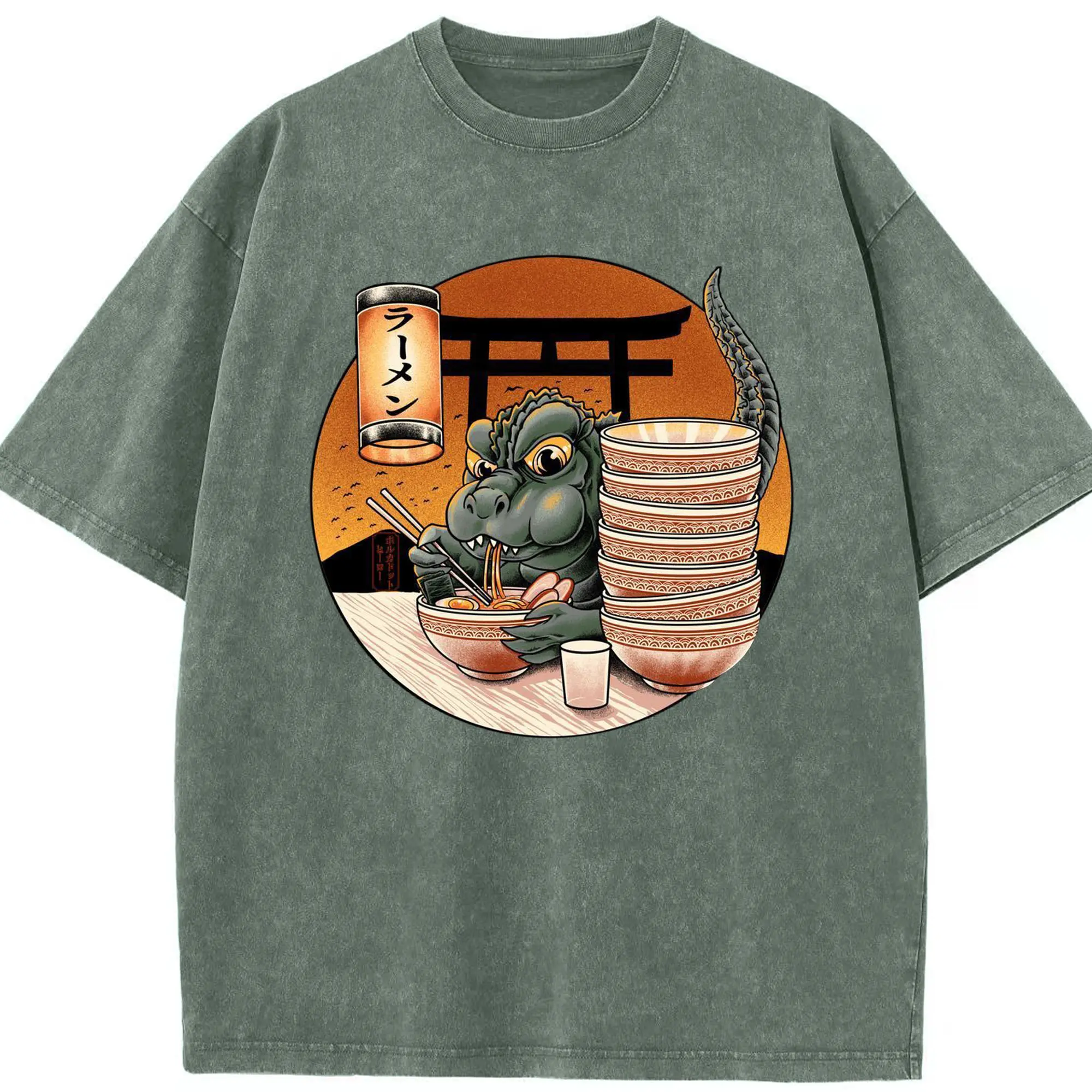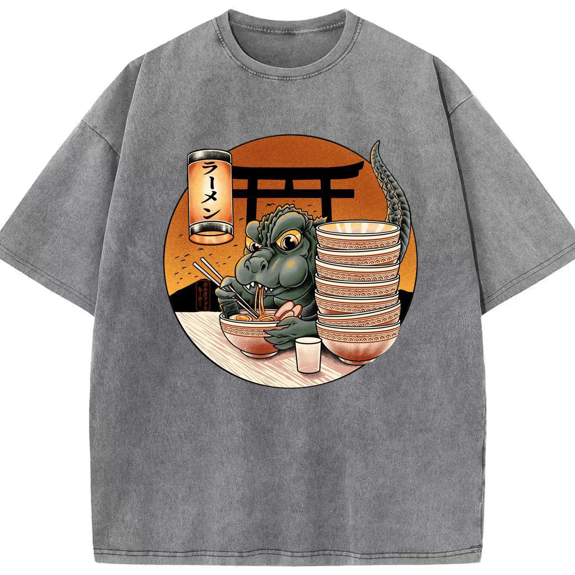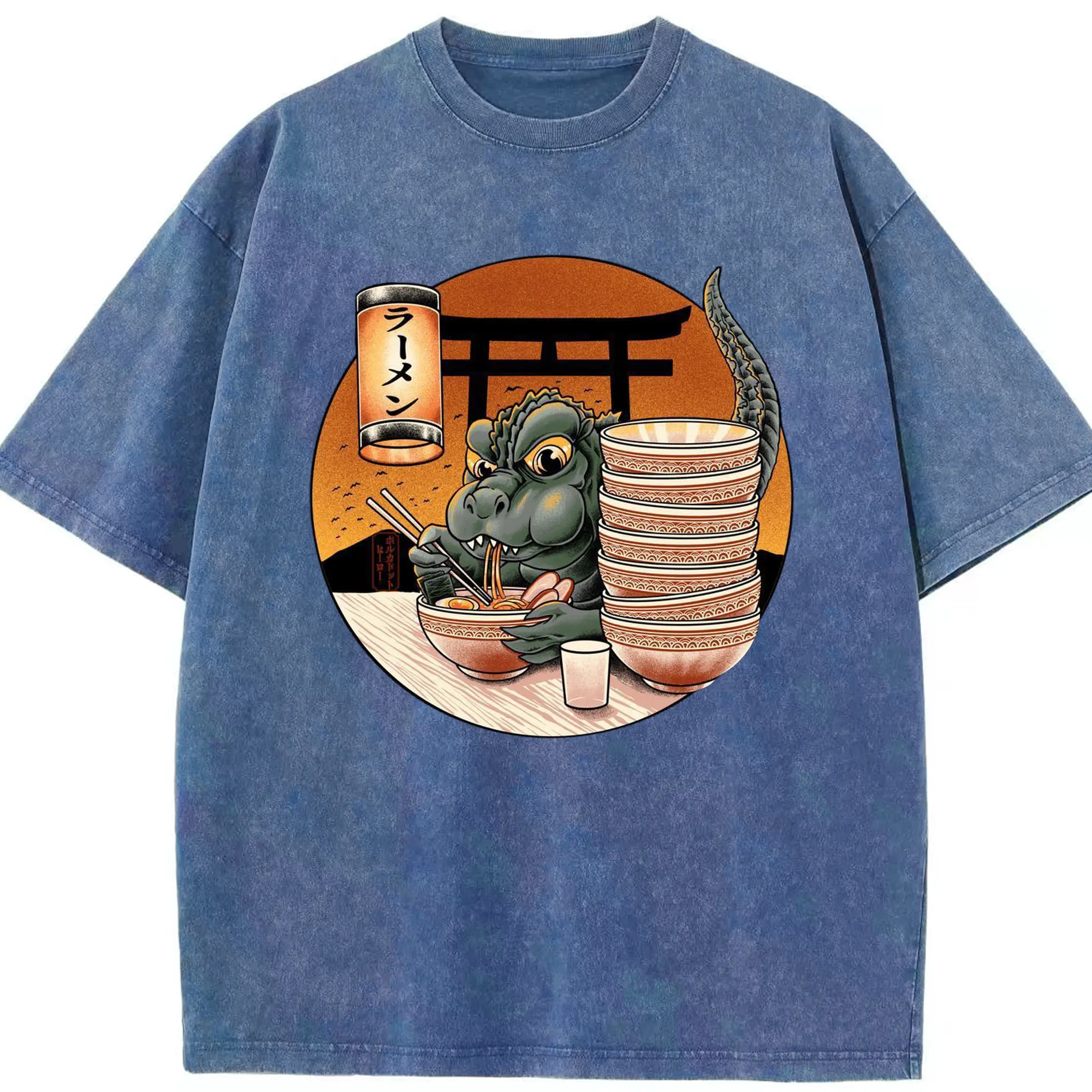 ゴジラの食事タイム - 綿100% ヴィンテージ風 半袖Tシャツ ・ フロントプリント ・ 柔らか肌触り ・ 通気性 快適 ・ スポーツ カジュアル 外出用