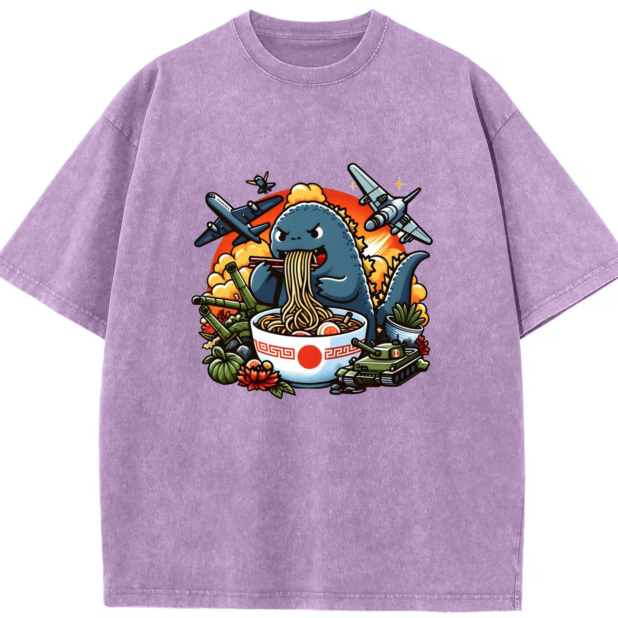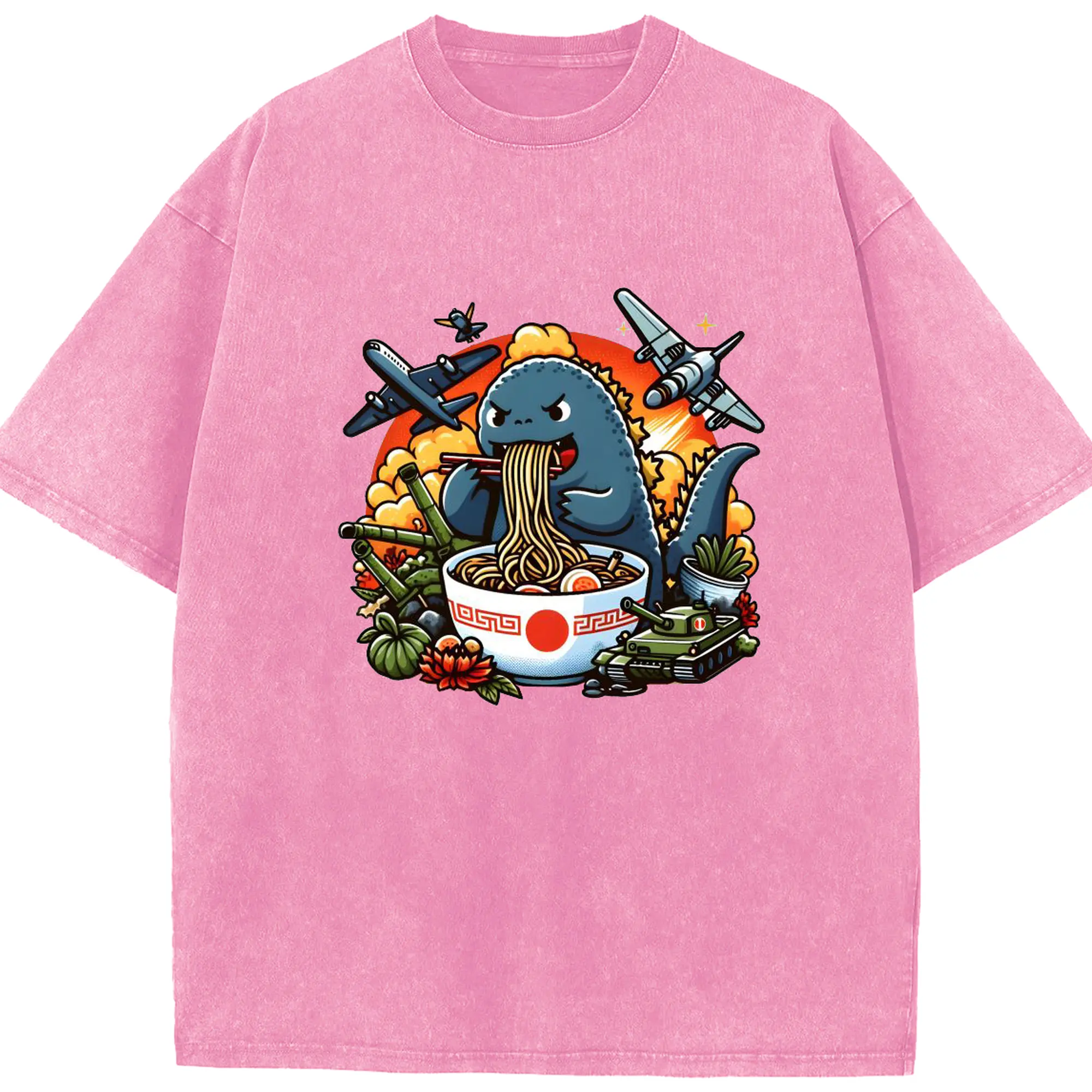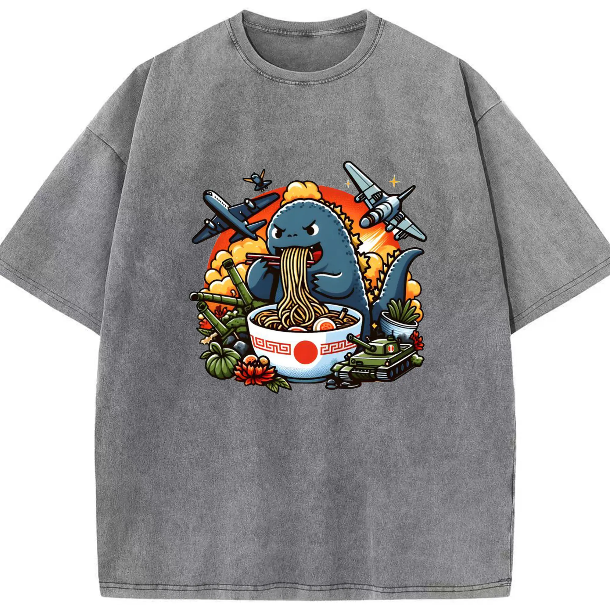ゴジラの食事タイム - 綿100% ヴィンテージ風 半袖Tシャツ ・ フロントプリント ・ 柔らか肌触り ・ 通気性 快適 ・ スポーツ カジュアル 外出用