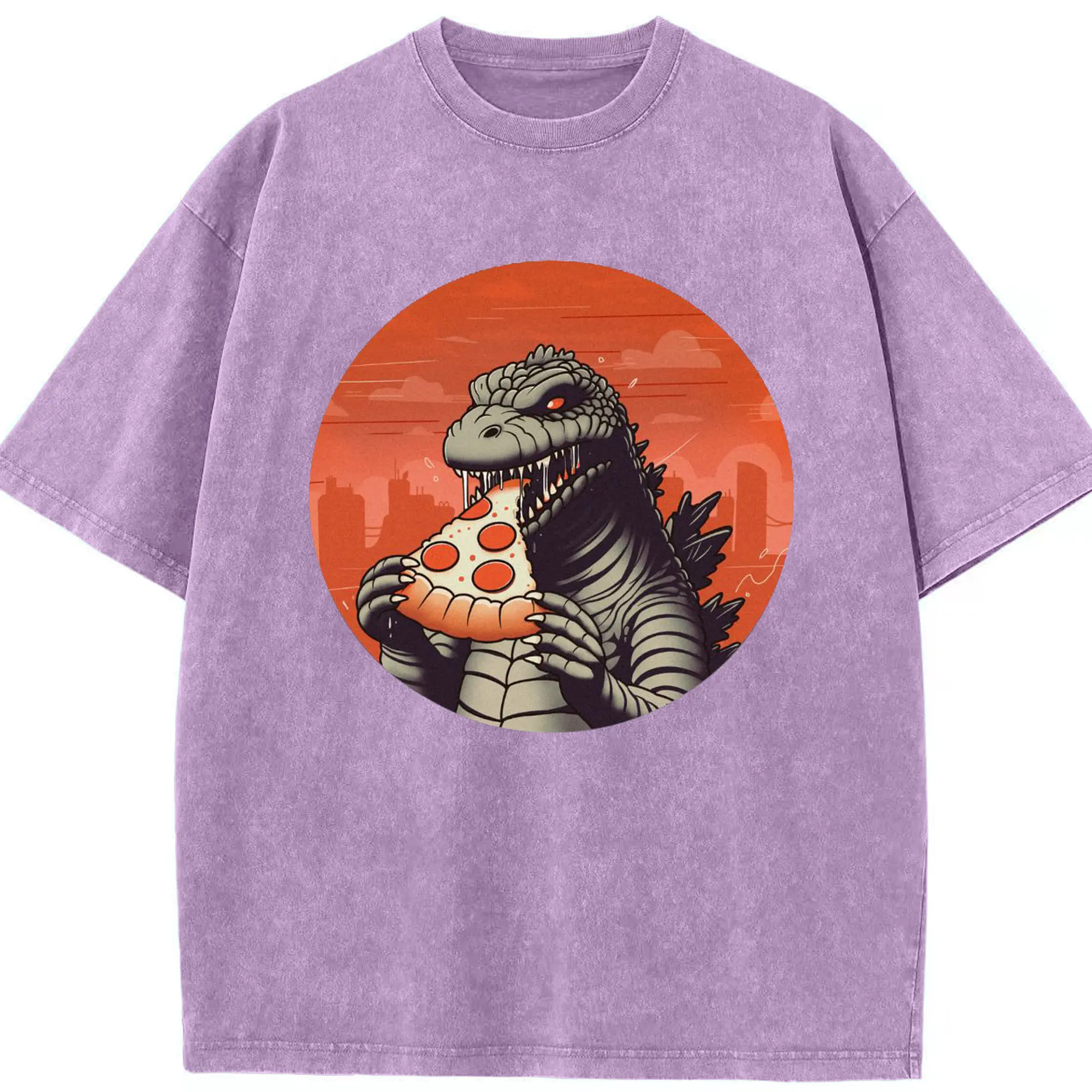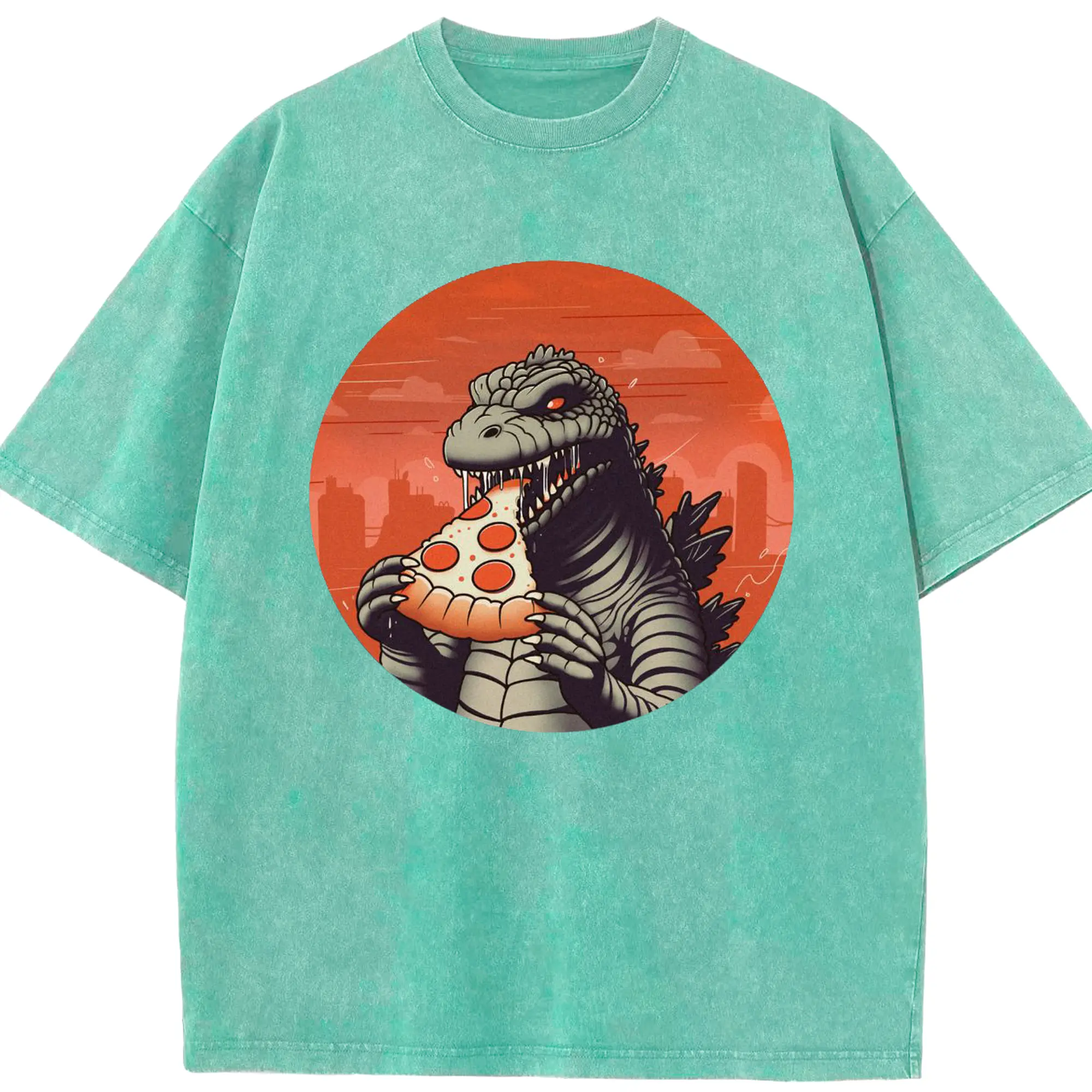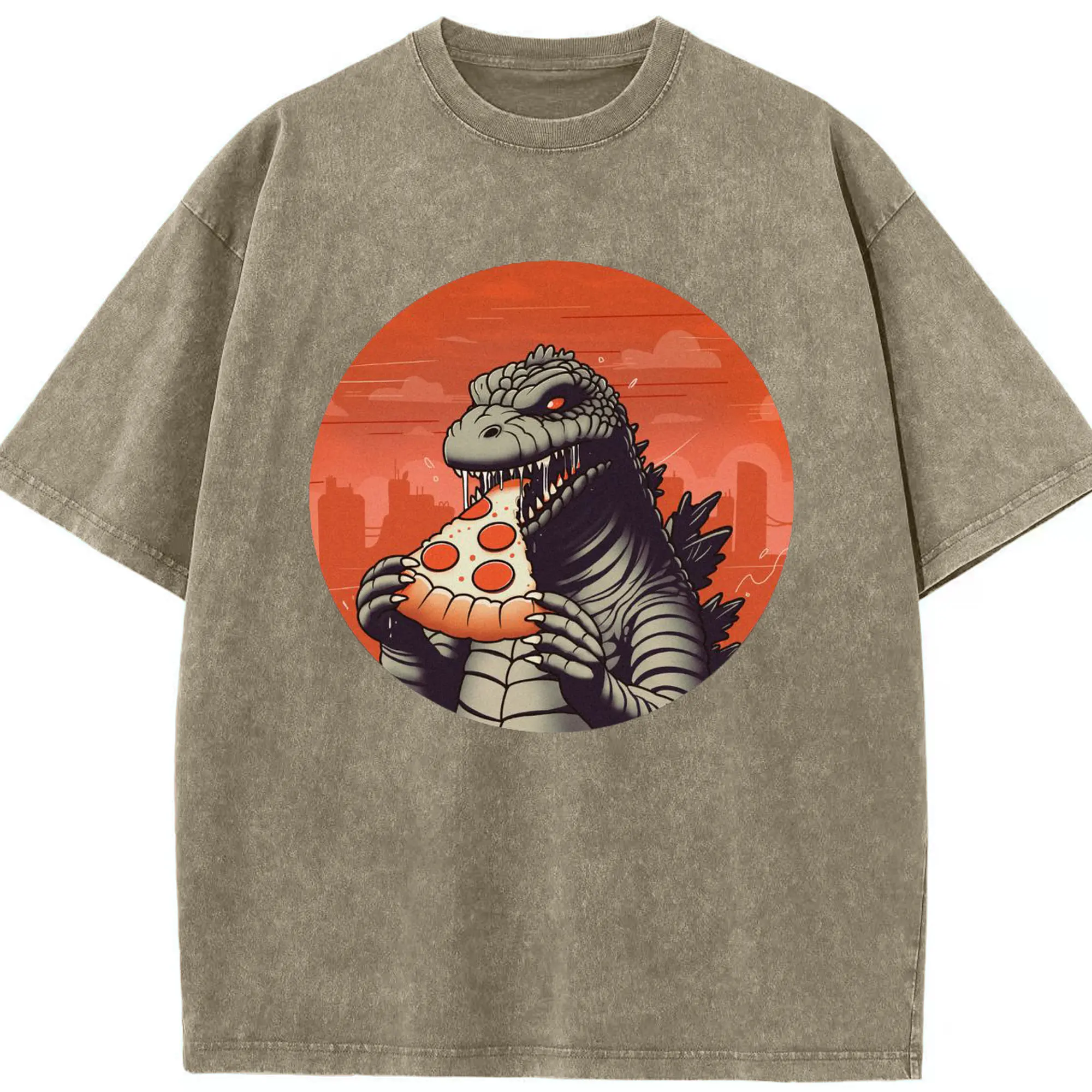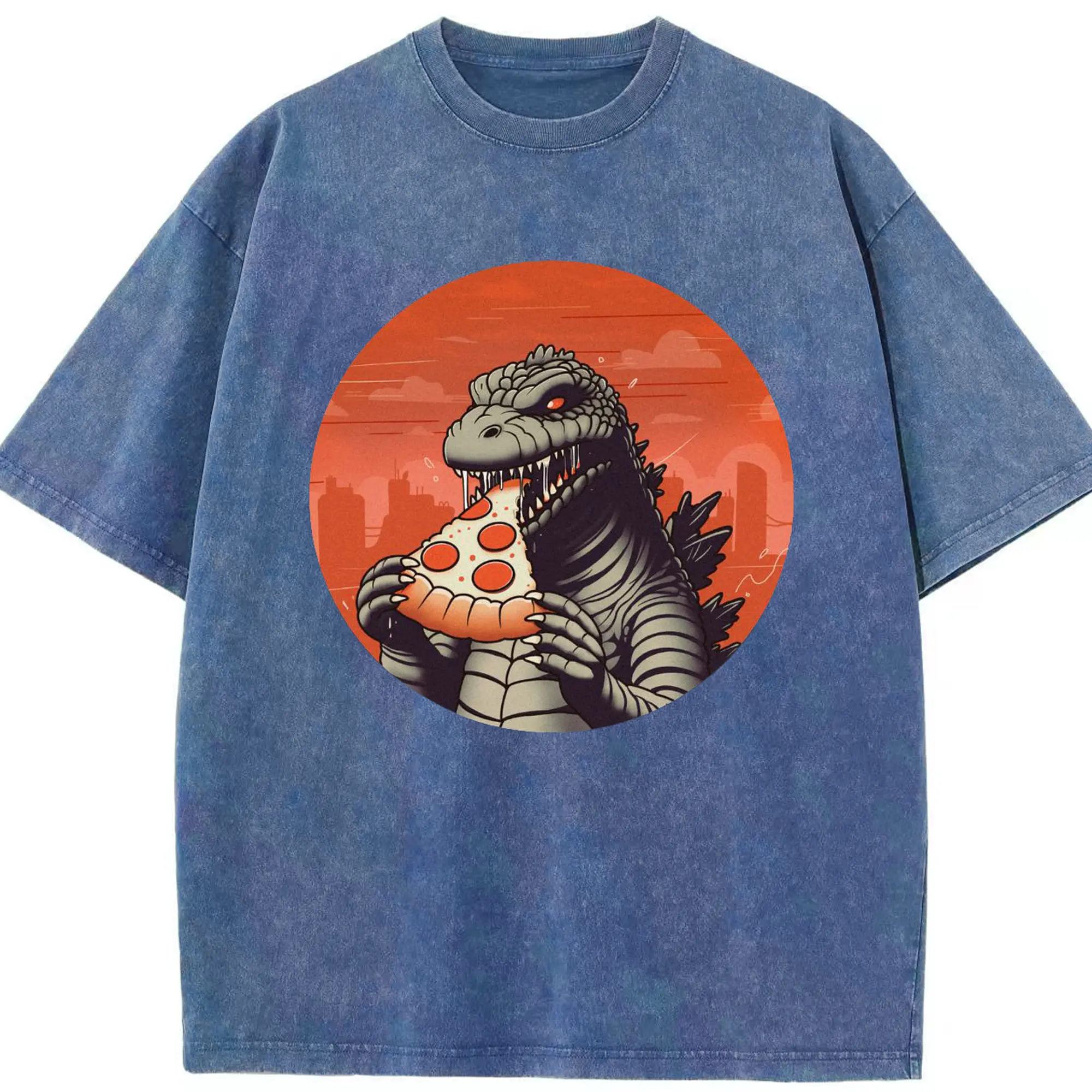 ゴジラの食事タイム - 綿100% ヴィンテージ風 半袖Tシャツ ・ フロントプリント ・ 柔らか肌触り ・ 通気性 快適 ・ スポーツ カジュアル 外出用