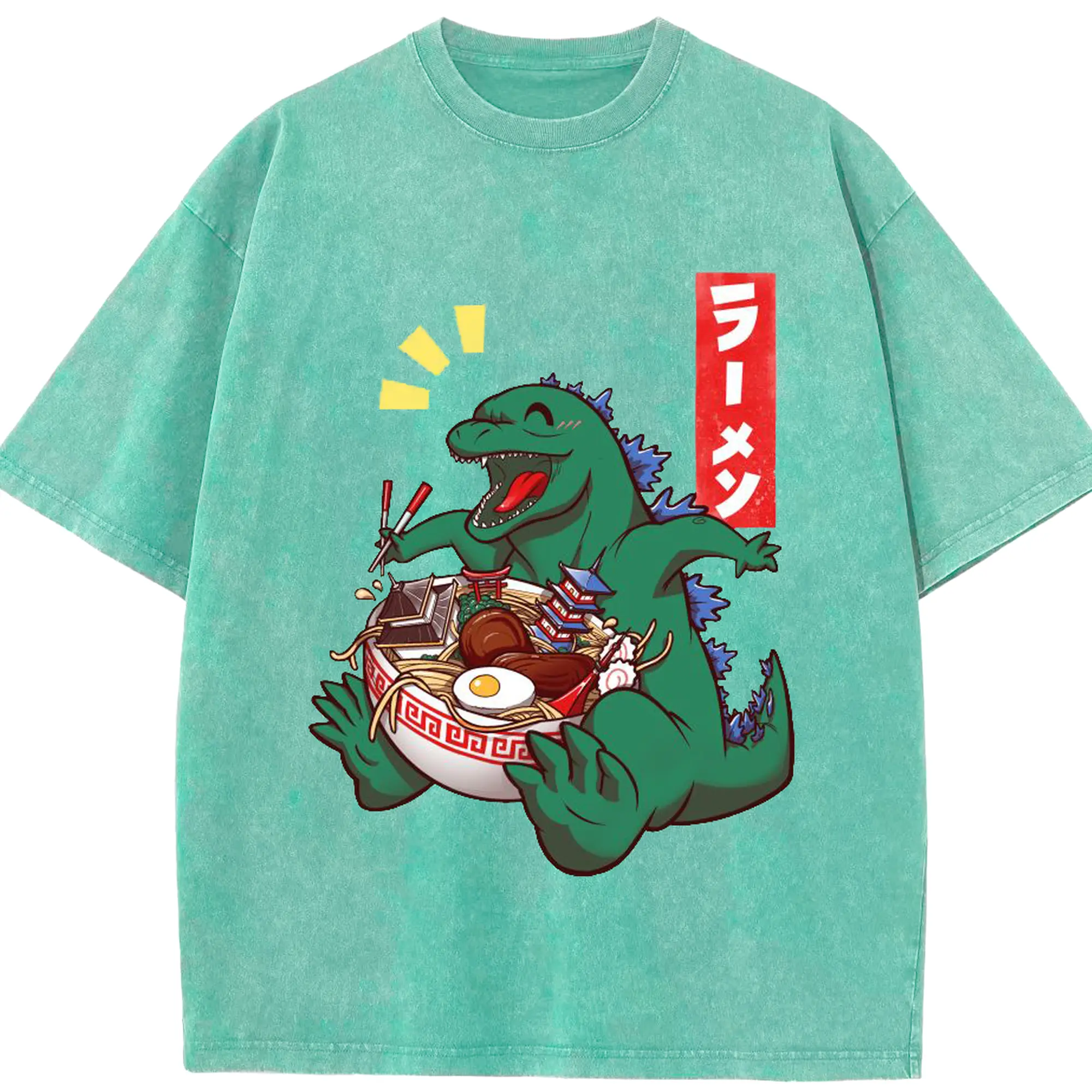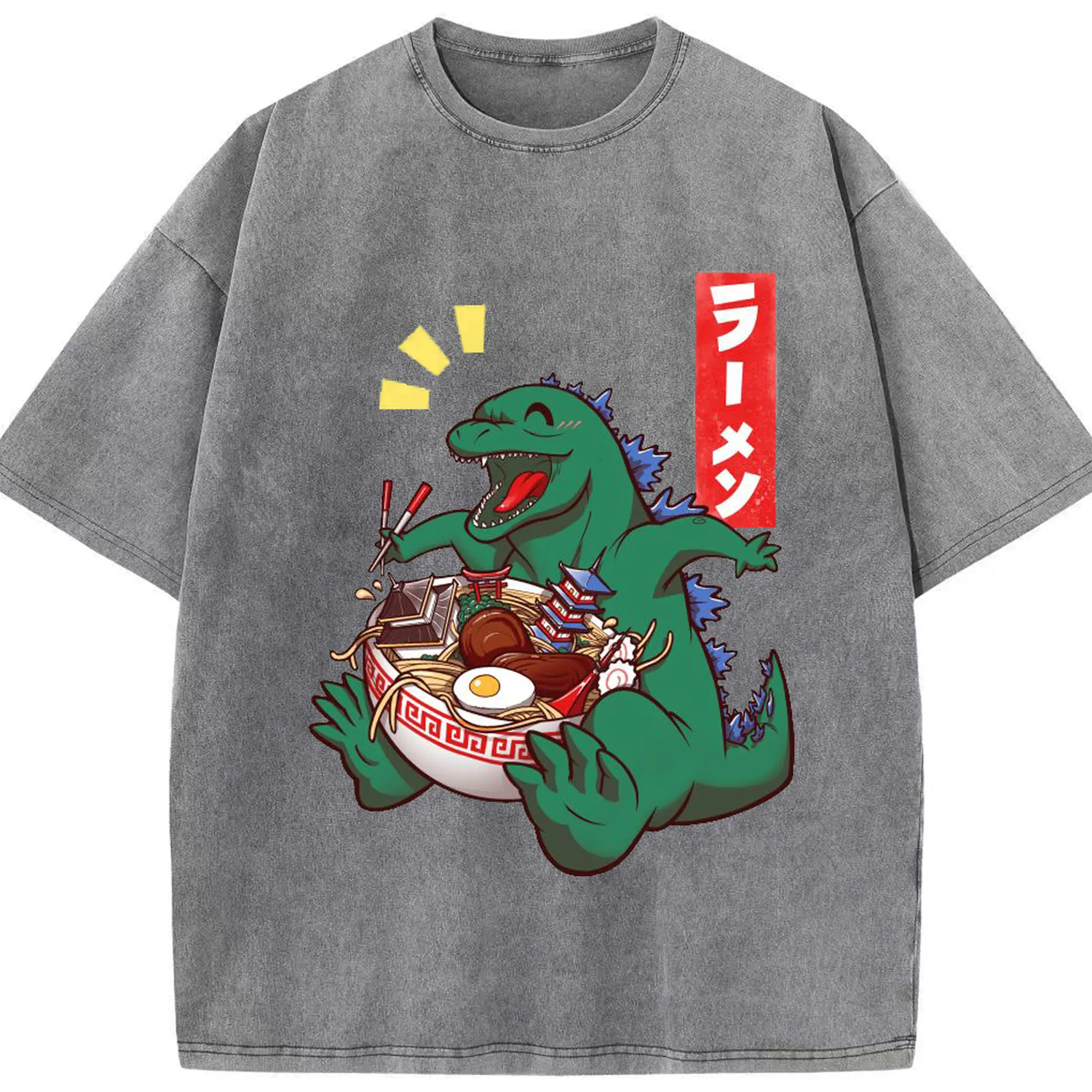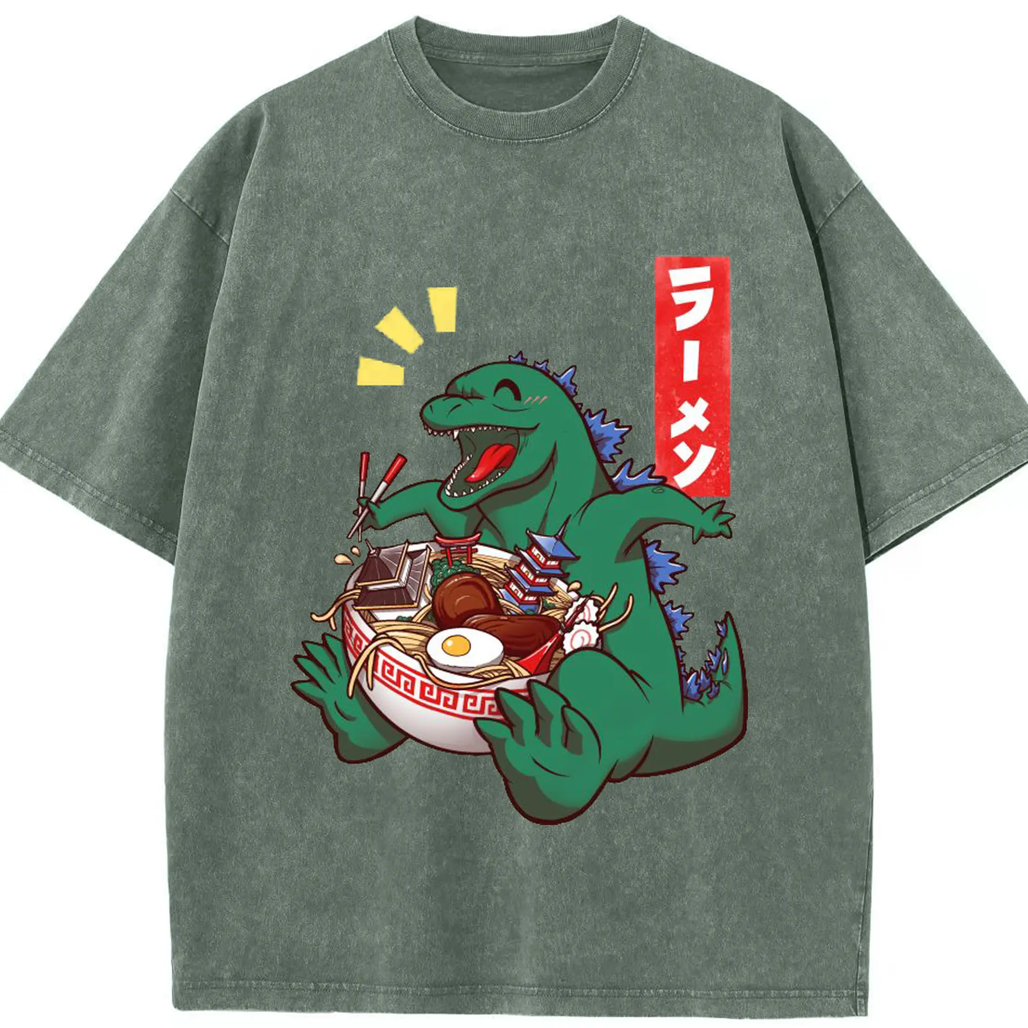 ゴジラの食事タイム - 綿100% ヴィンテージ風 半袖Tシャツ ・ フロントプリント ・ 柔らか肌触り ・ 通気性 快適 ・ スポーツ カジュアル 外出用