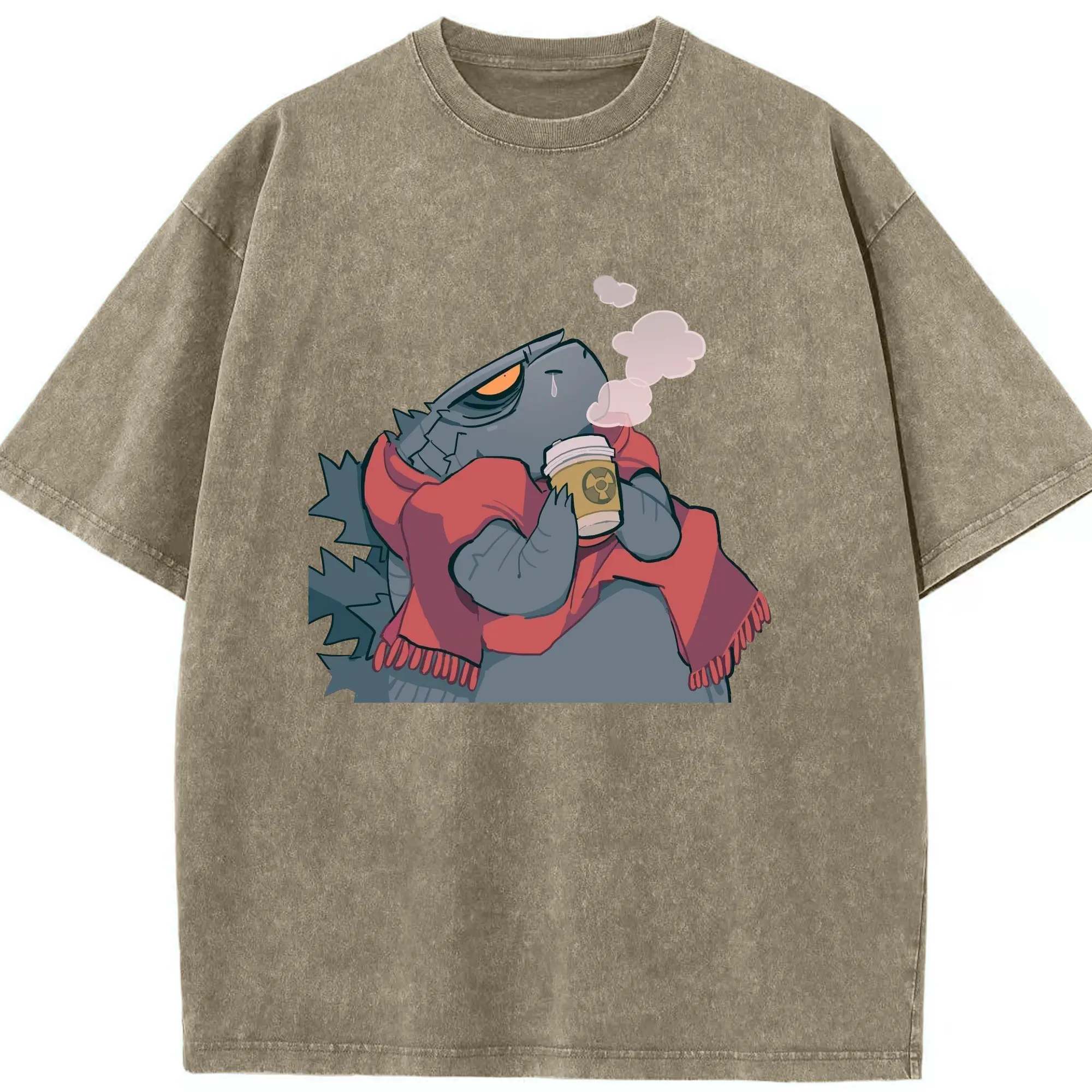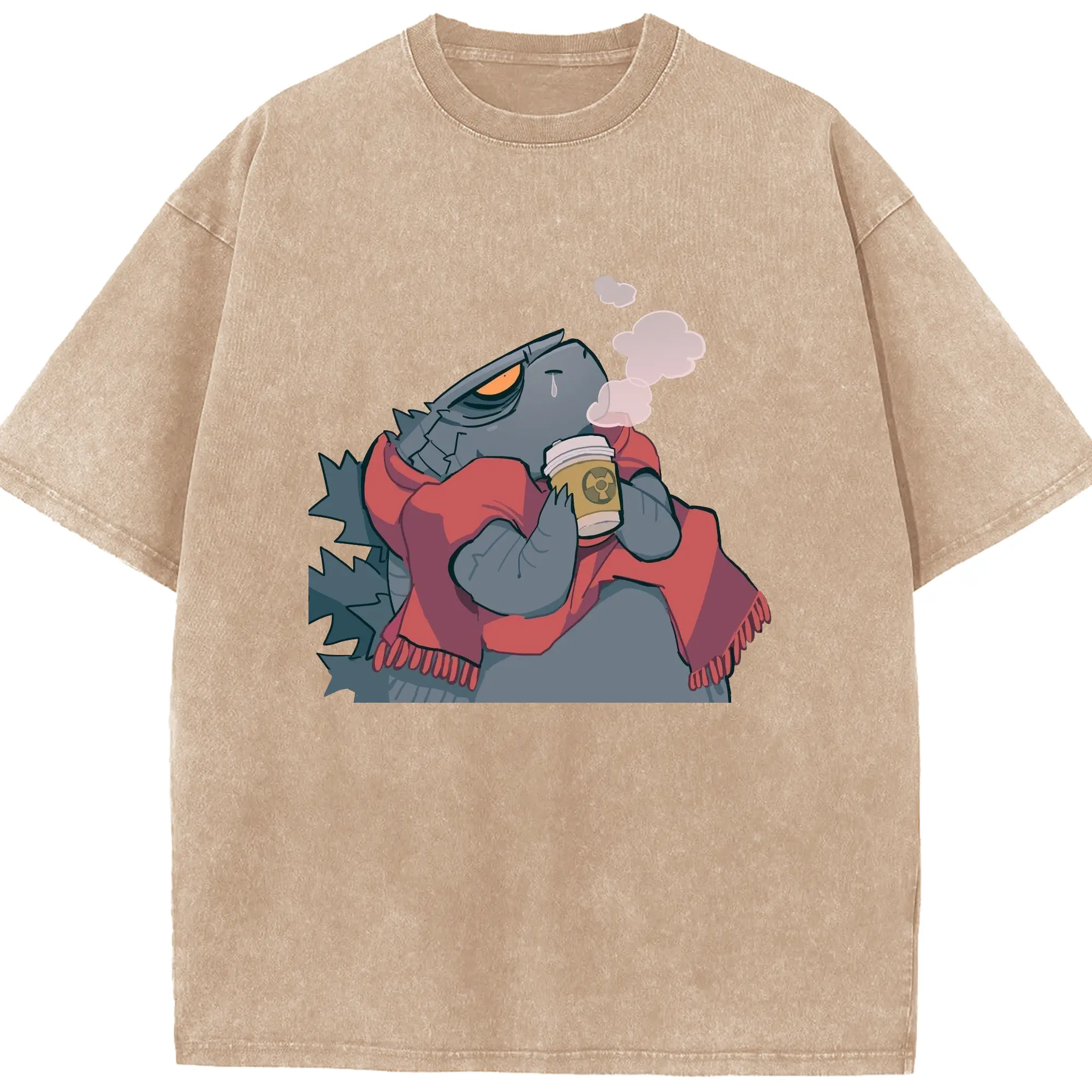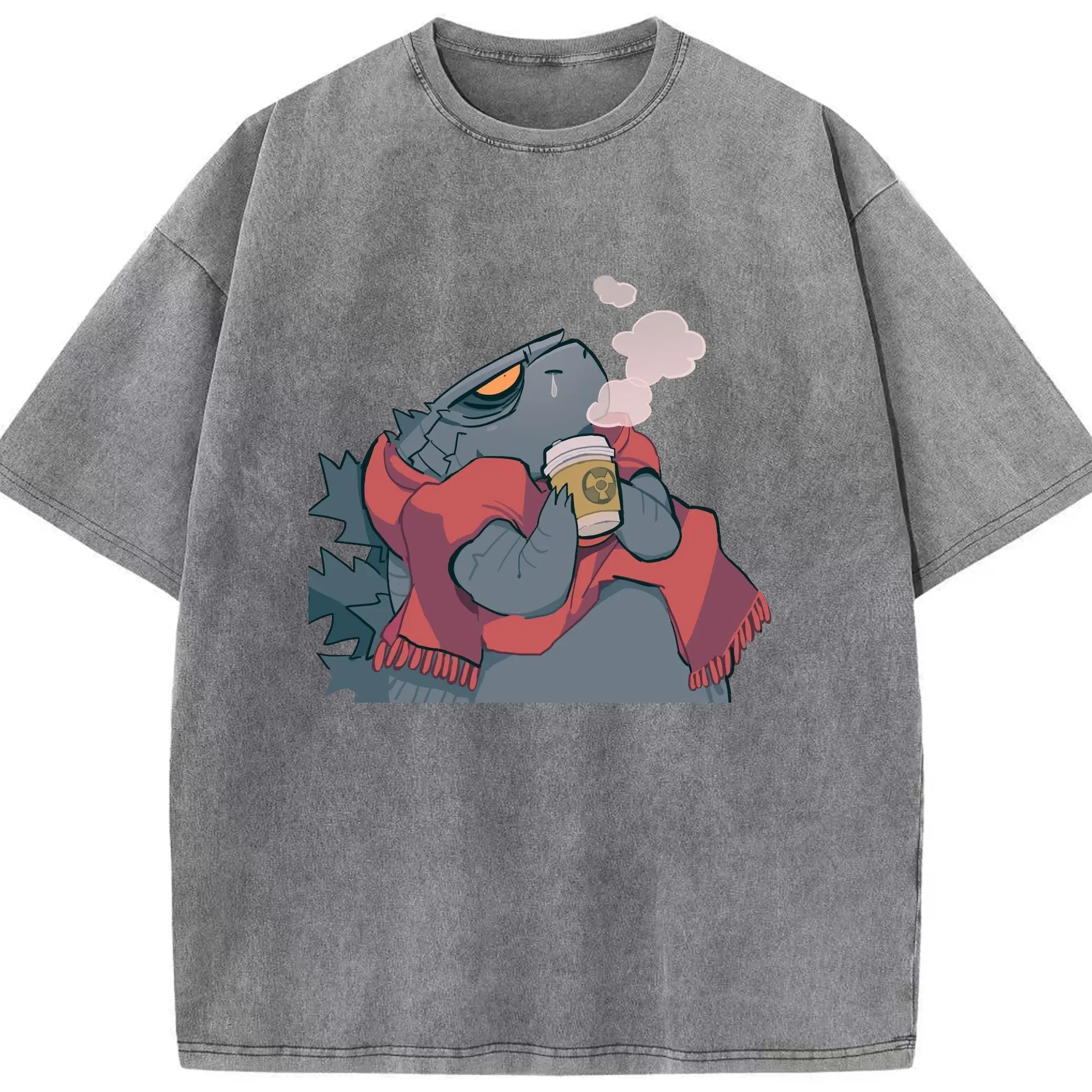 ゴジラの食事タイム - 綿100% ヴィンテージ風 半袖Tシャツ ・ フロントプリント ・ 柔らか肌触り ・ 通気性 快適 ・ スポーツ カジュアル 外出用