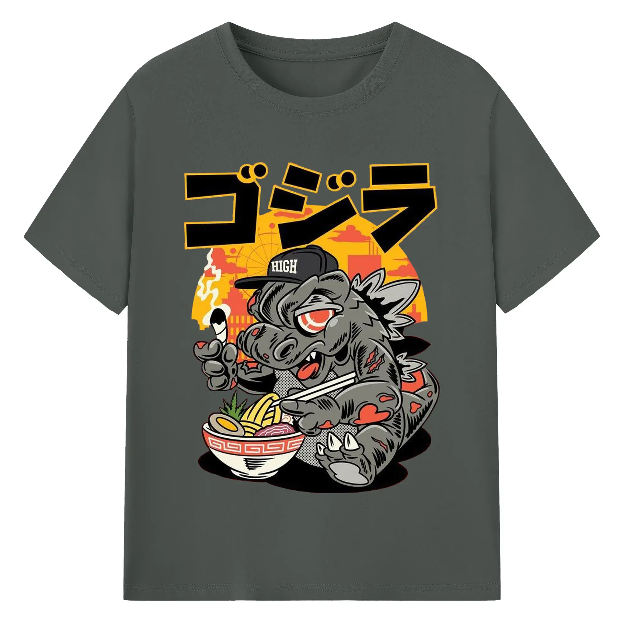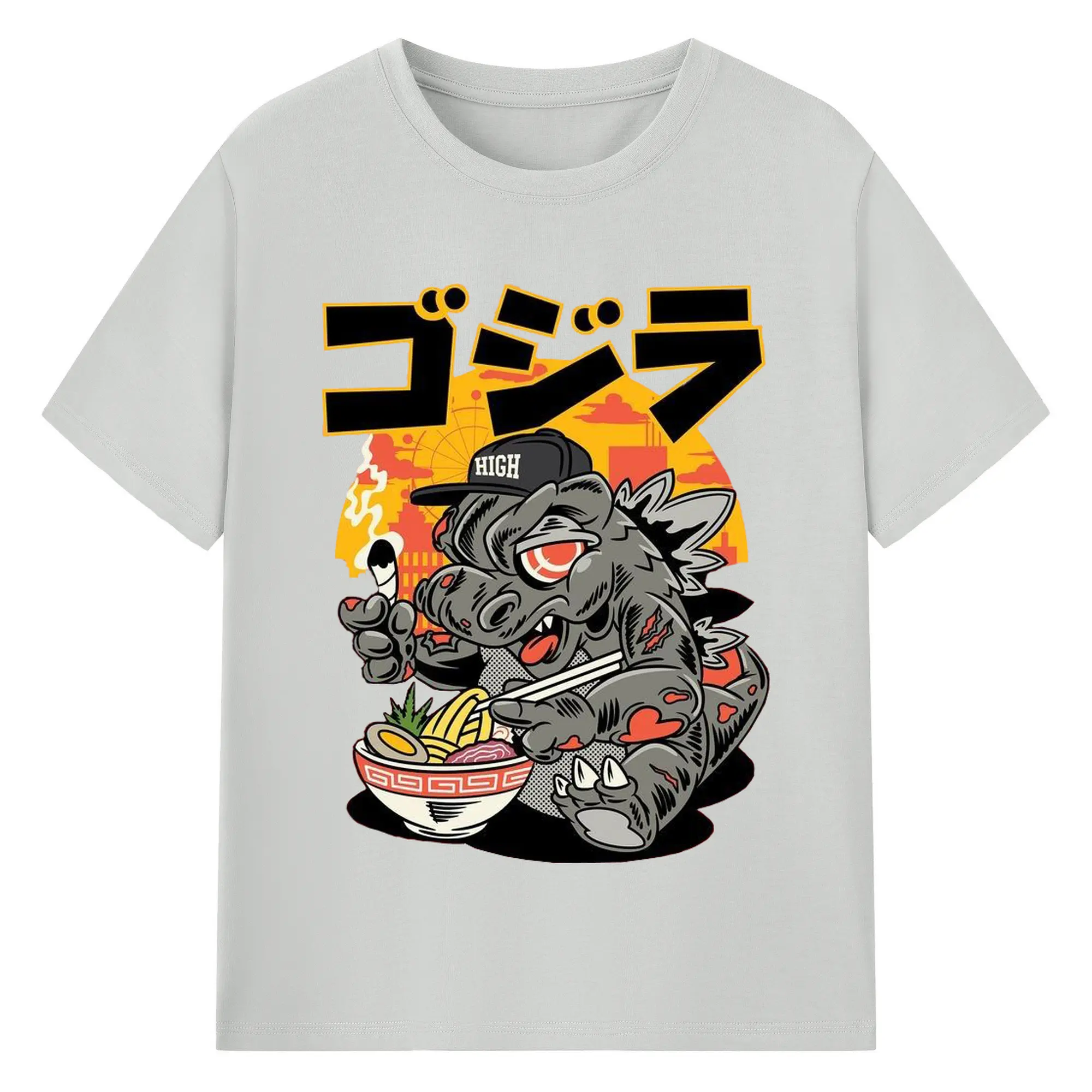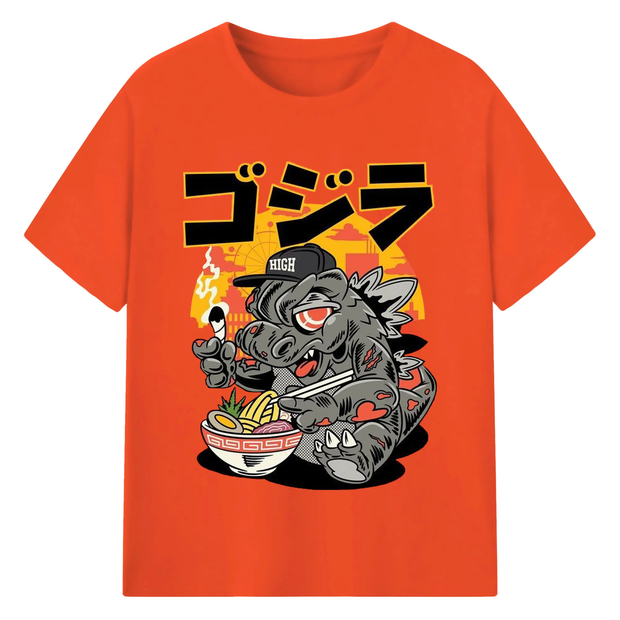 ゴジラの食事タイム - 綿100% 半袖Tシャツ ・ フロントプリント ・ 快適 通気性 ・ 日常使い 散歩 スポーツ用