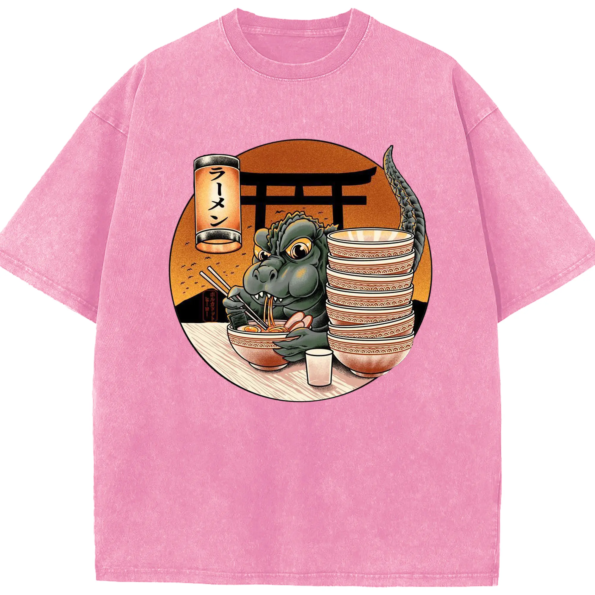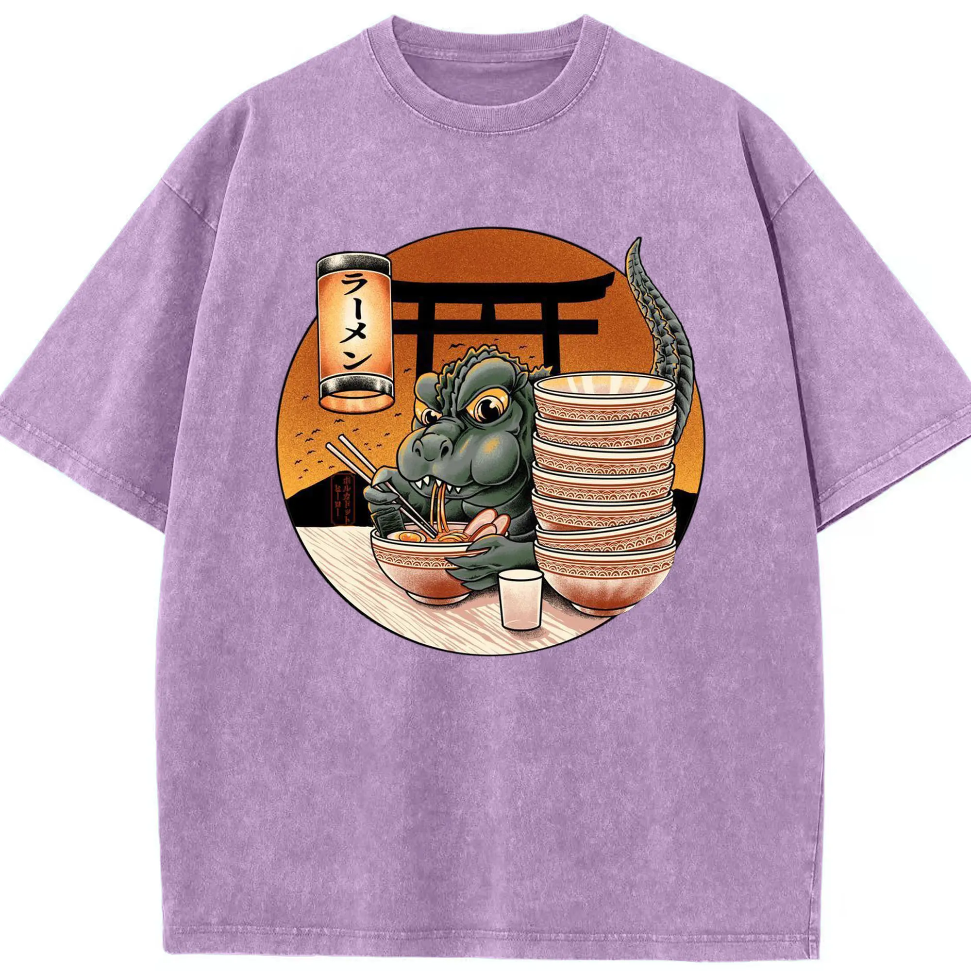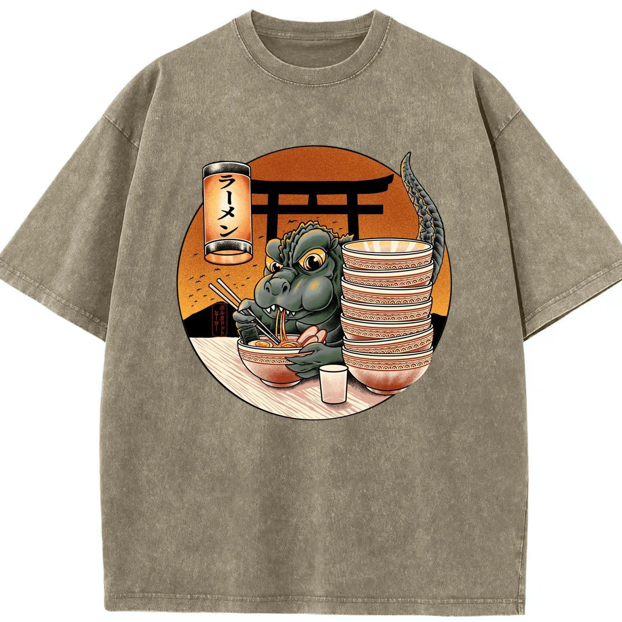 ゴジラの食事タイム - 綿100% ヴィンテージ風 半袖Tシャツ ・ フロントプリント ・ 柔らか肌触り ・ 通気性 快適 ・ スポーツ カジュアル 外出用