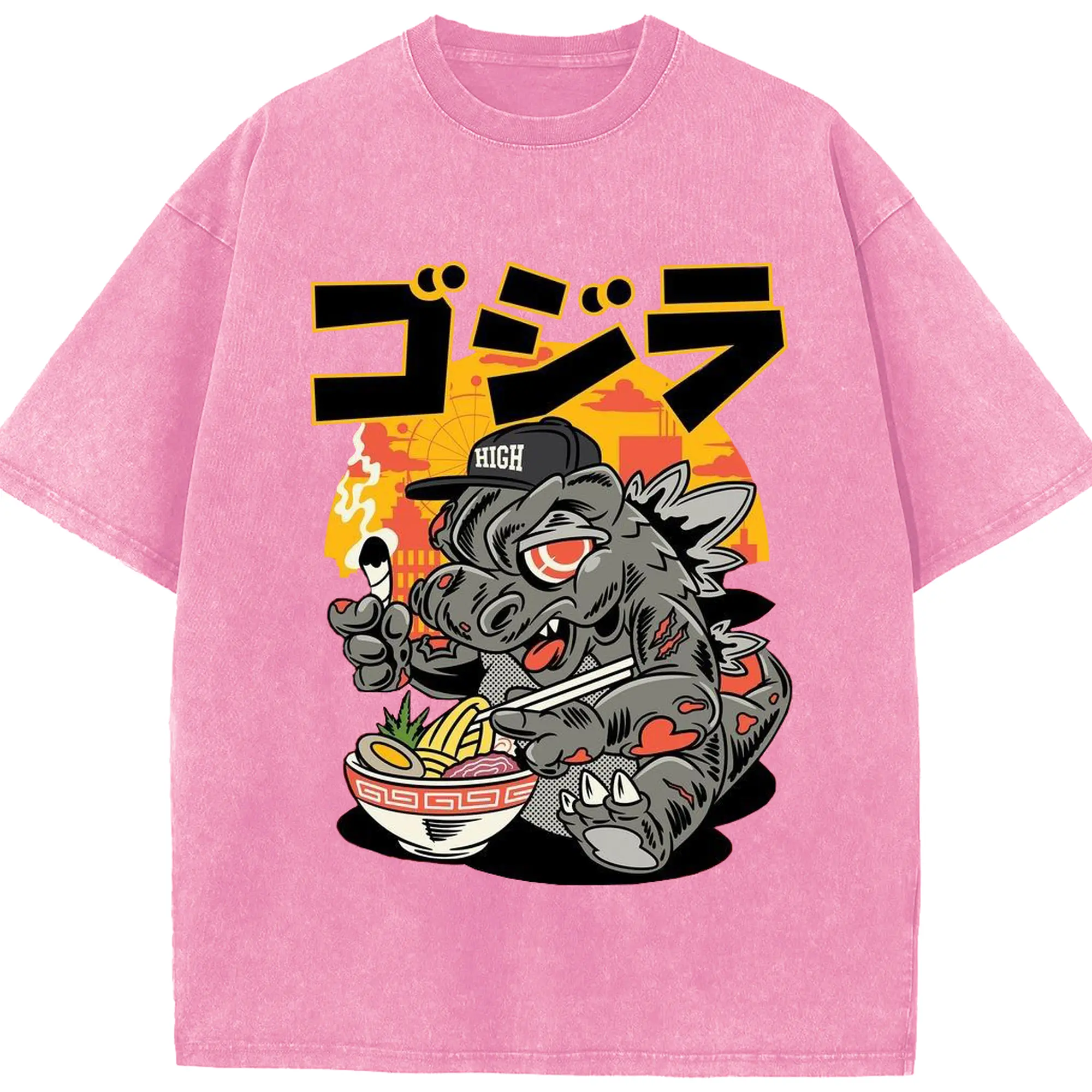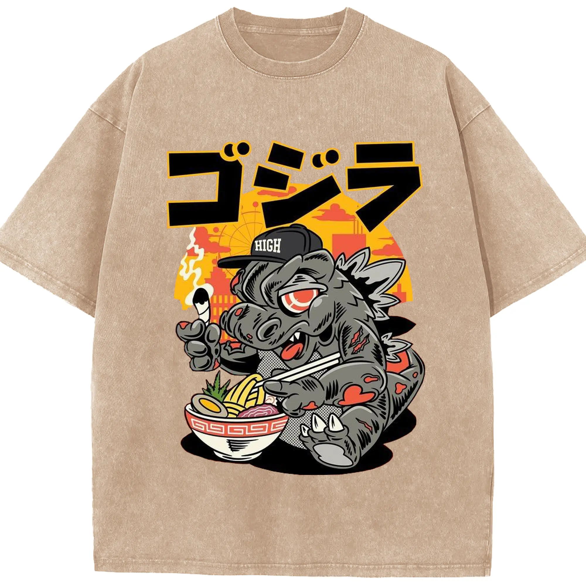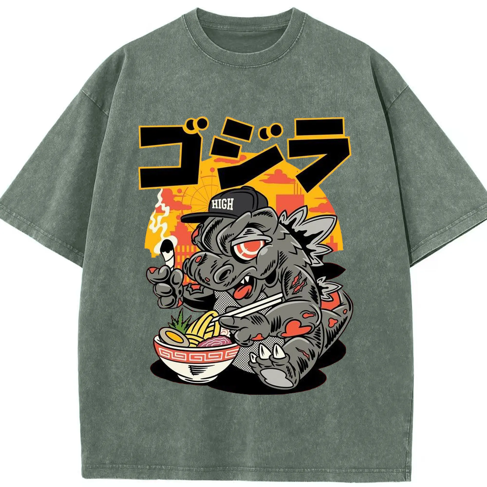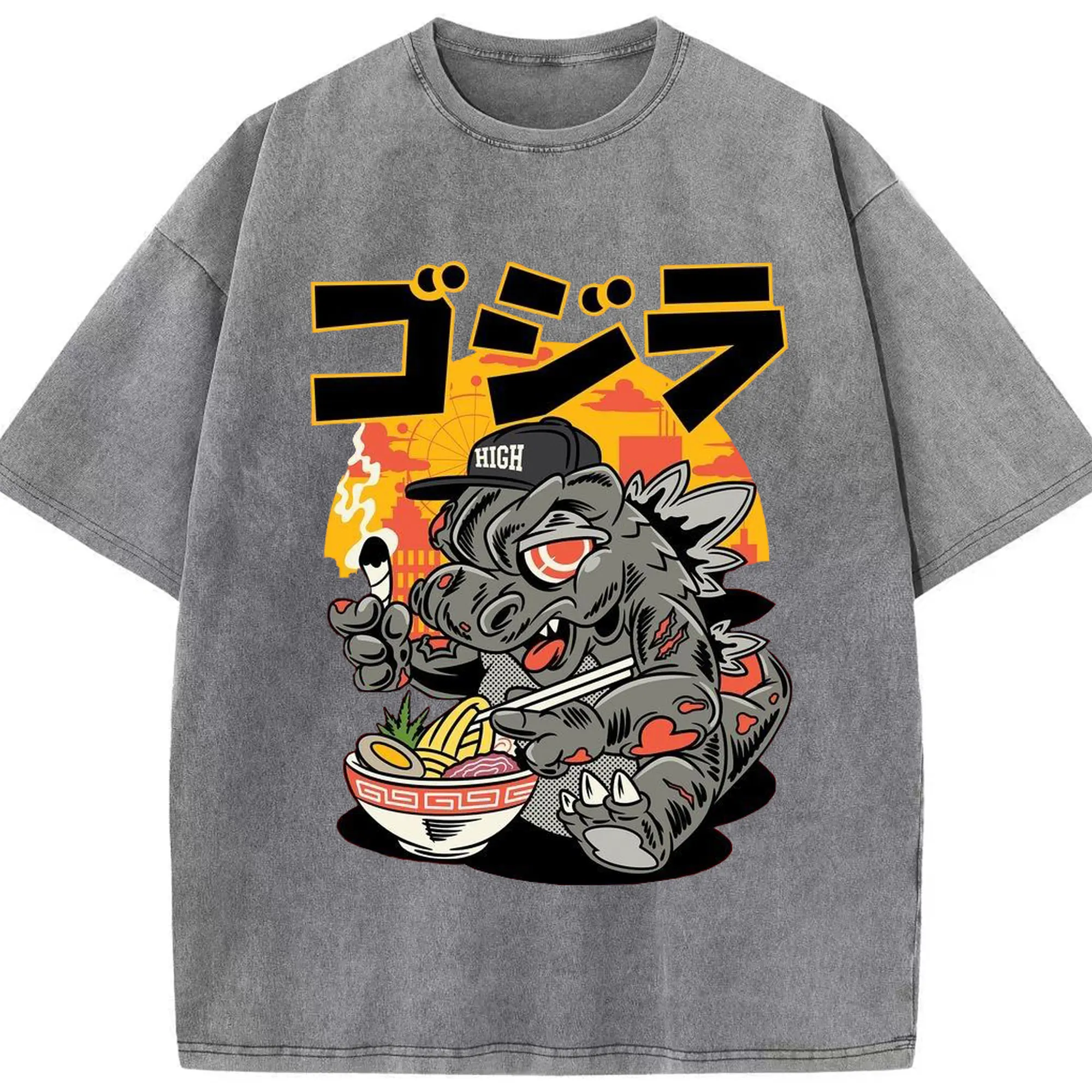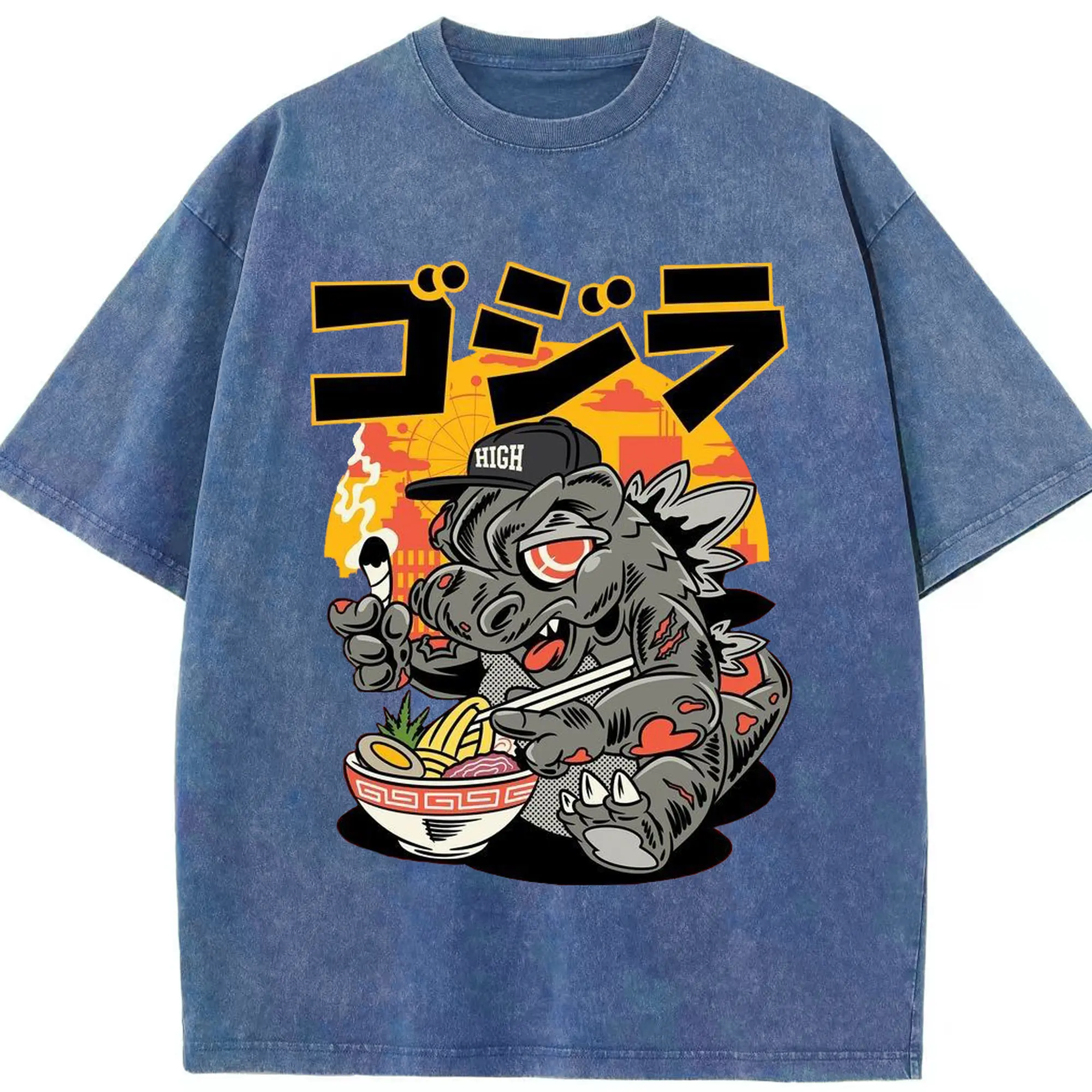ゴジラの食事タイム - 綿100% ヴィンテージ風 半袖Tシャツ ・ フロントプリント ・ 柔らか肌触り ・ 通気性 快適 ・ スポーツ カジュアル 外出用