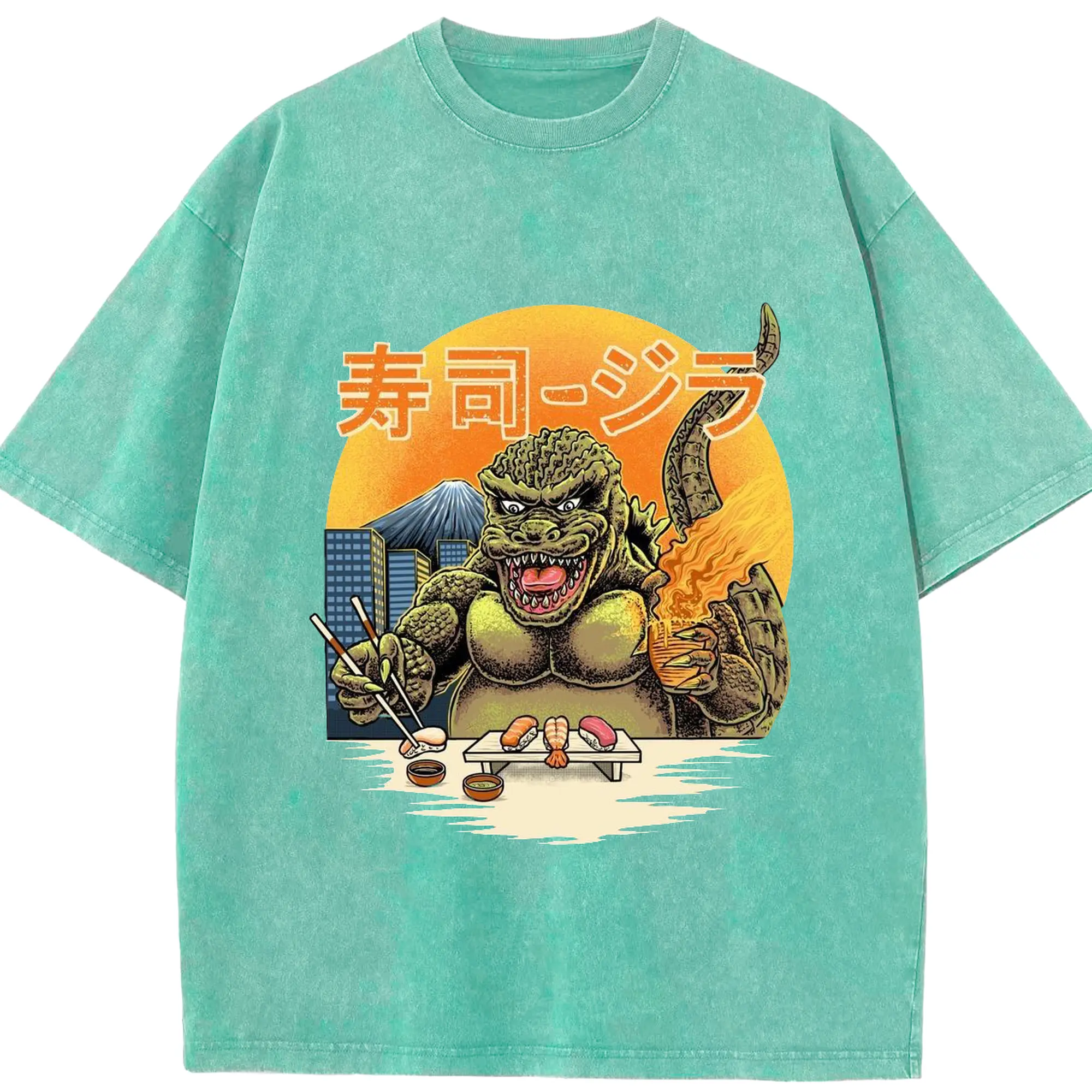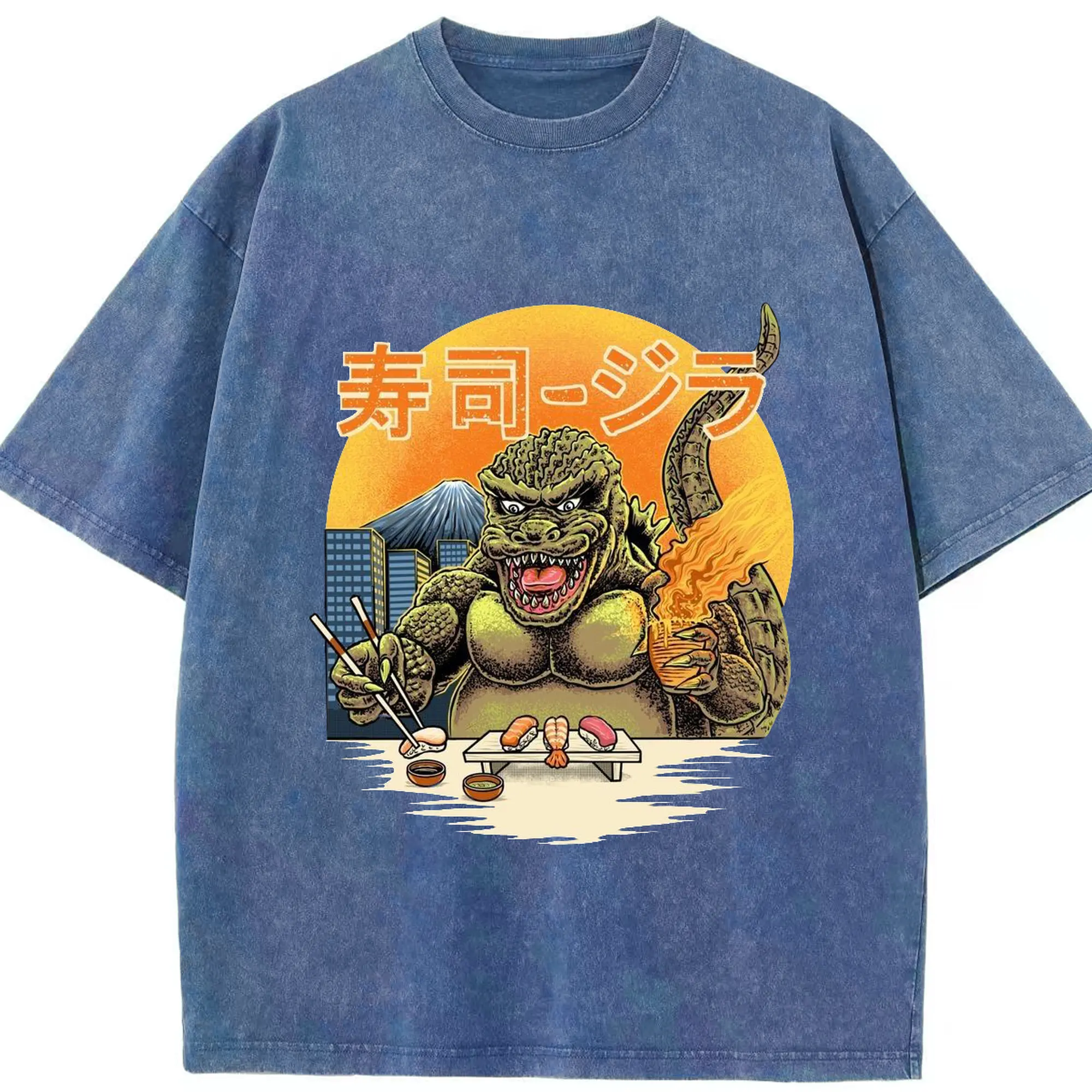ゴジラの食事タイム - 綿100% ヴィンテージ風 半袖Tシャツ ・ フロントプリント ・ 柔らか肌触り ・ 通気性 快適 ・ スポーツ カジュアル 外出用