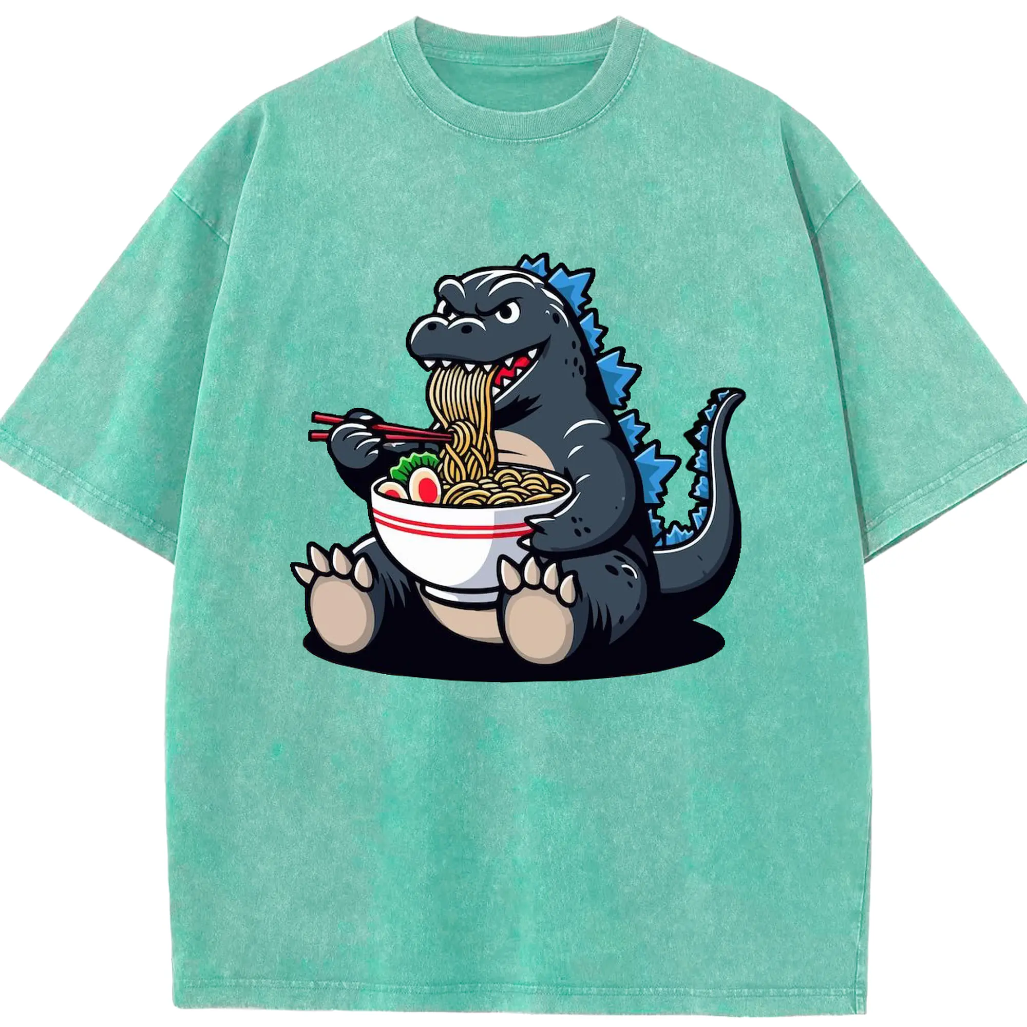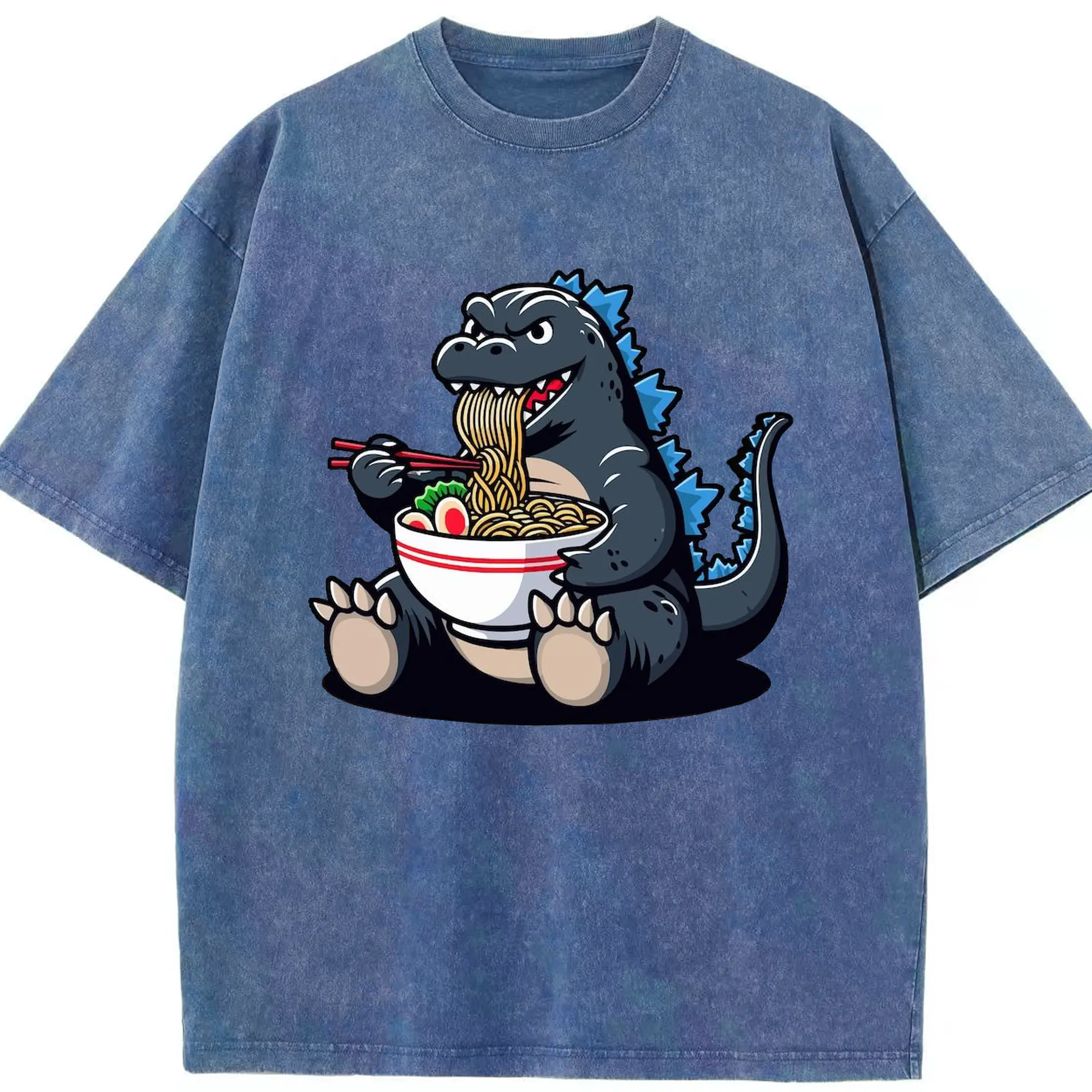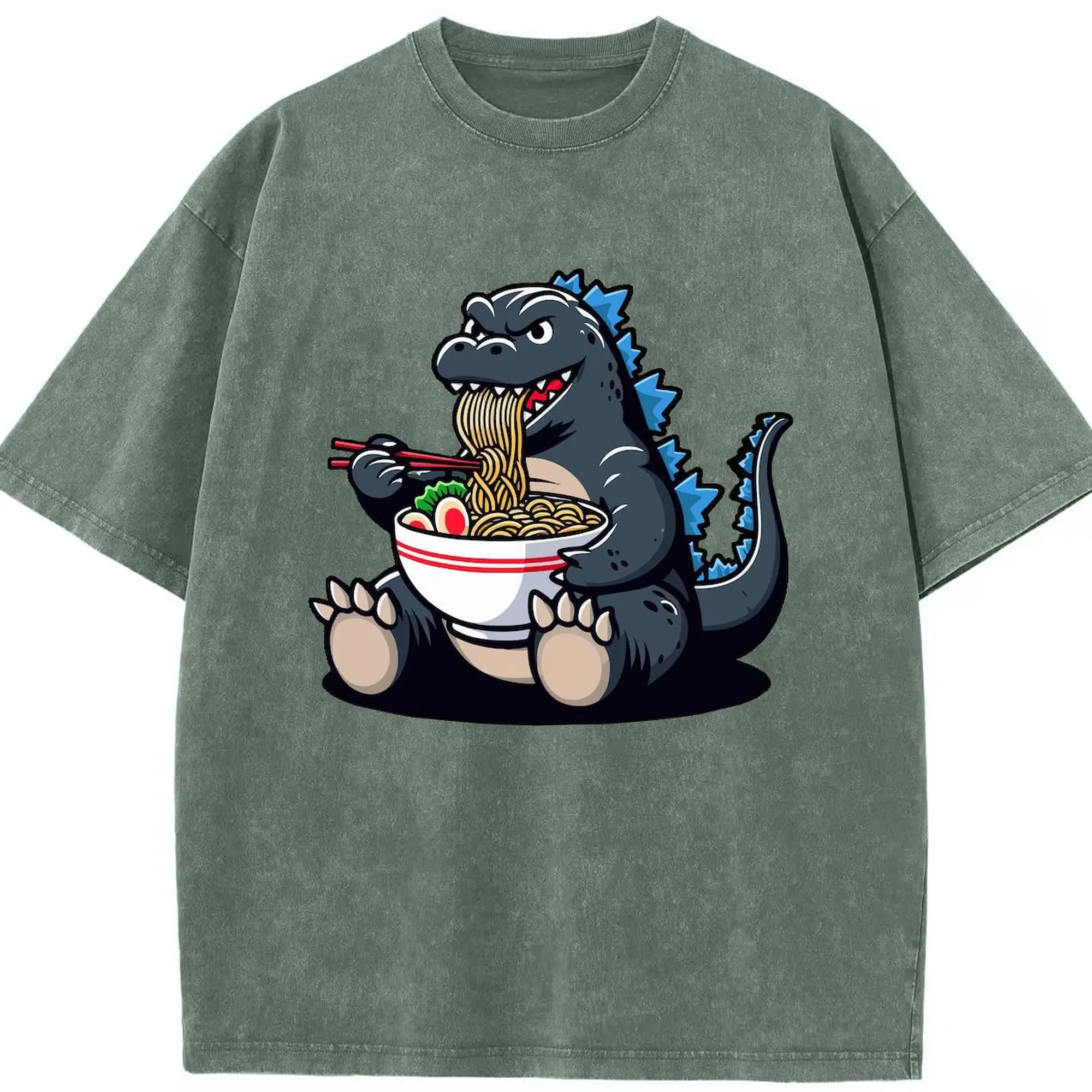 ゴジラの食事タイム - 綿100% ヴィンテージ風 半袖Tシャツ ・ フロントプリント ・ 柔らか肌触り ・ 通気性 快適 ・ スポーツ カジュアル 外出用