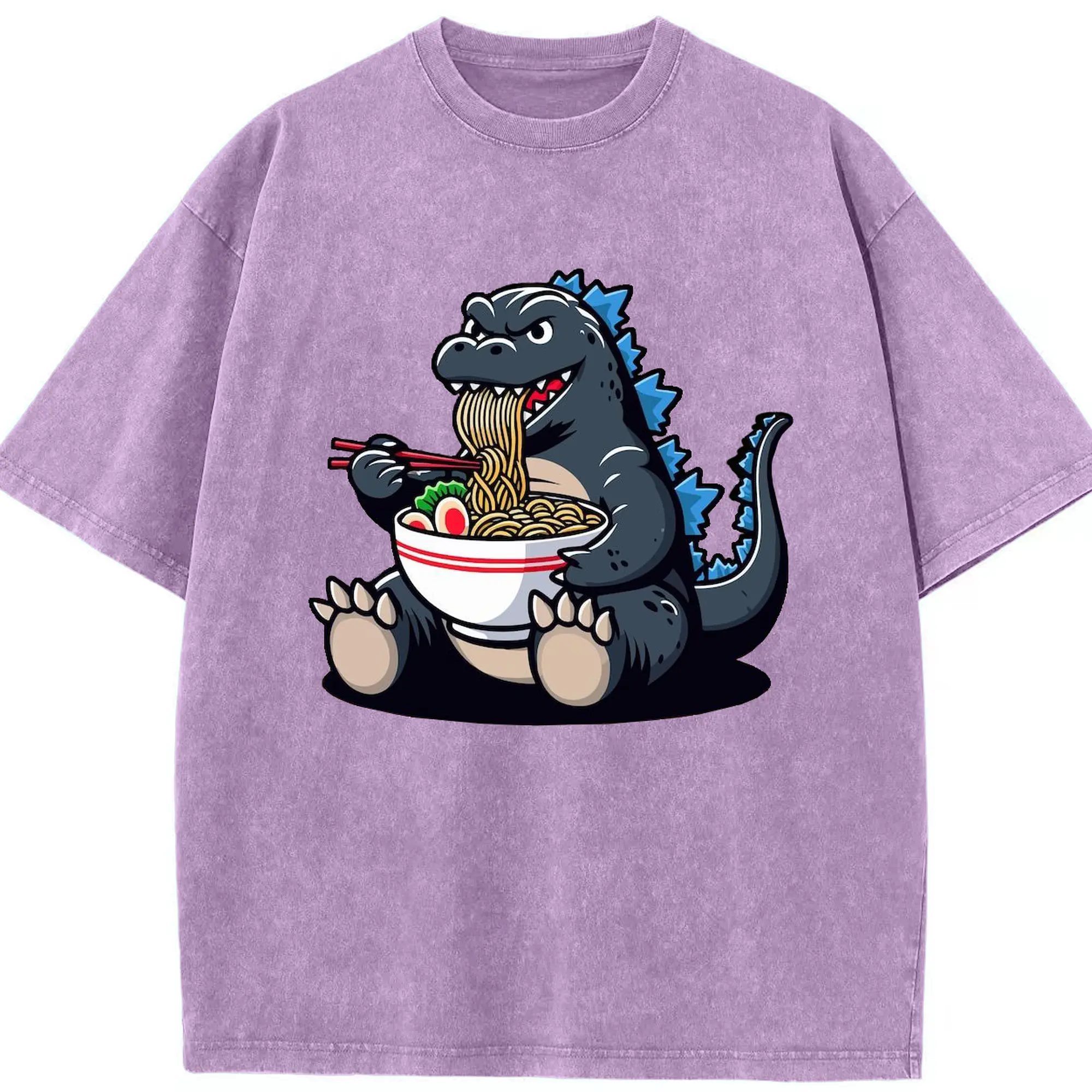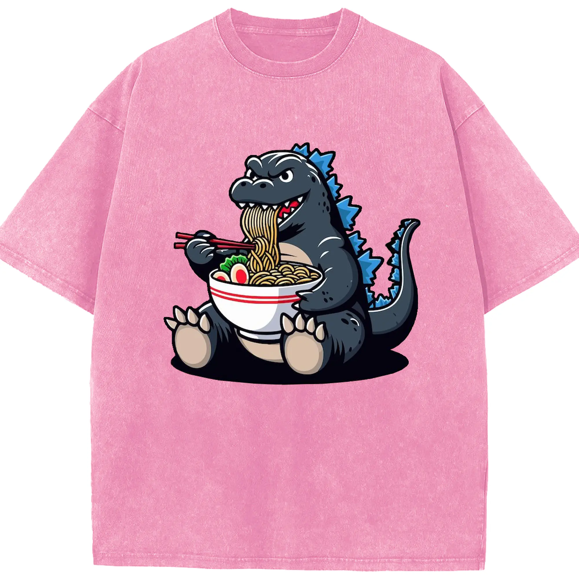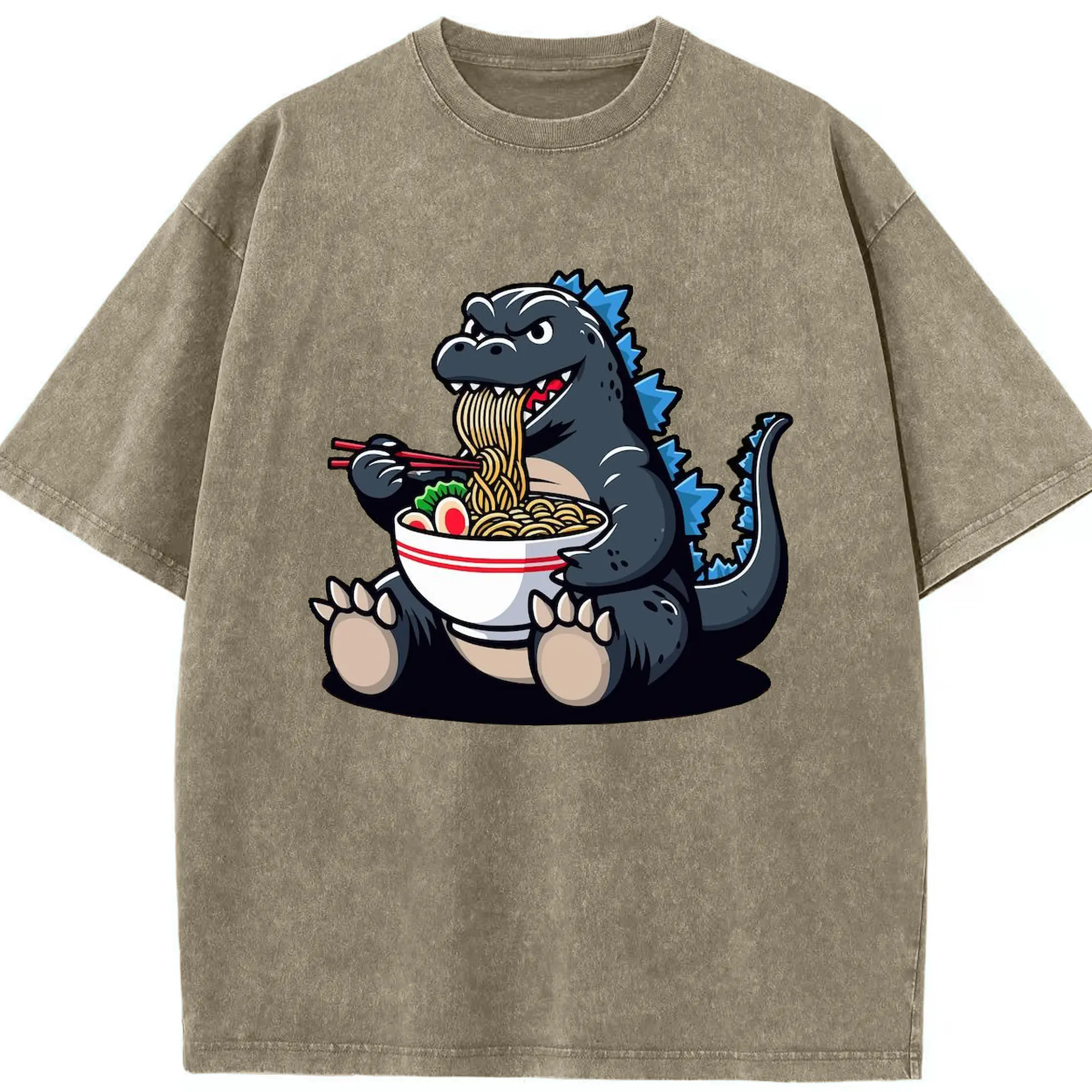 ゴジラの食事タイム - 綿100% ヴィンテージ風 半袖Tシャツ ・ フロントプリント ・ 柔らか肌触り ・ 通気性 快適 ・ スポーツ カジュアル 外出用