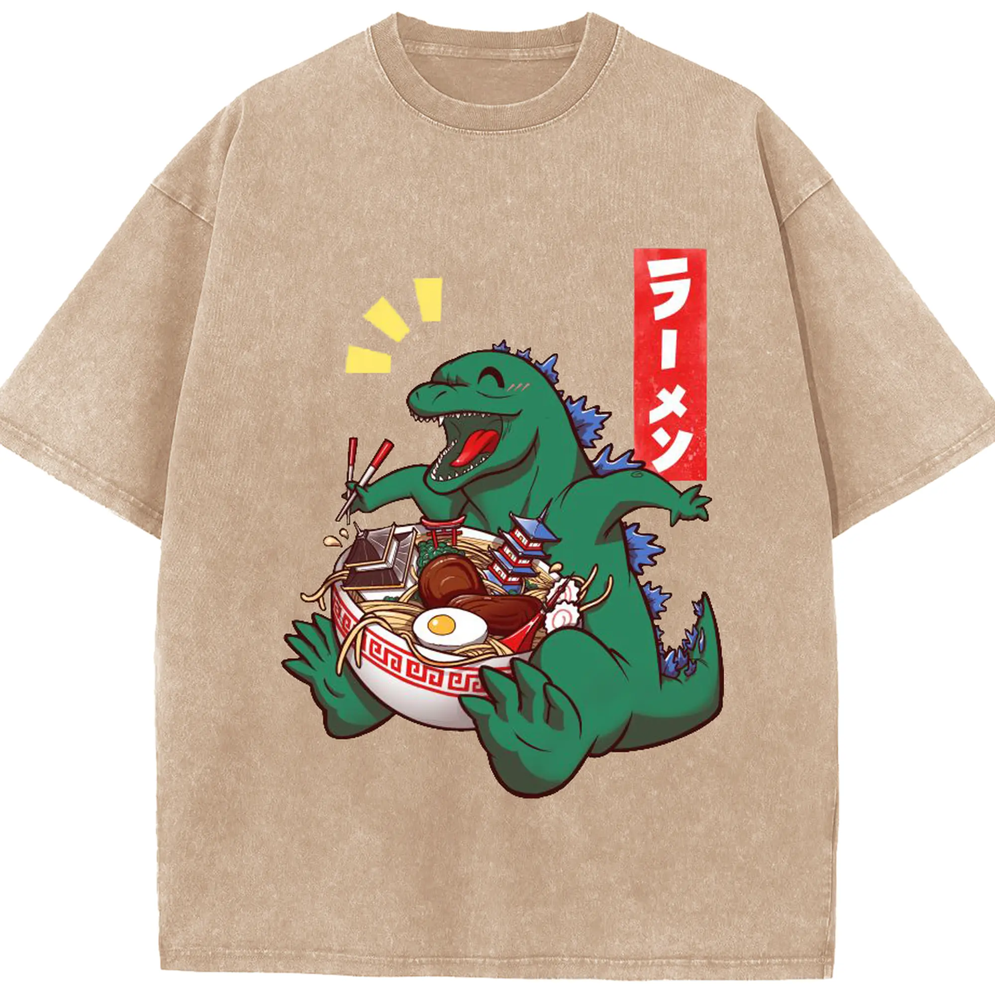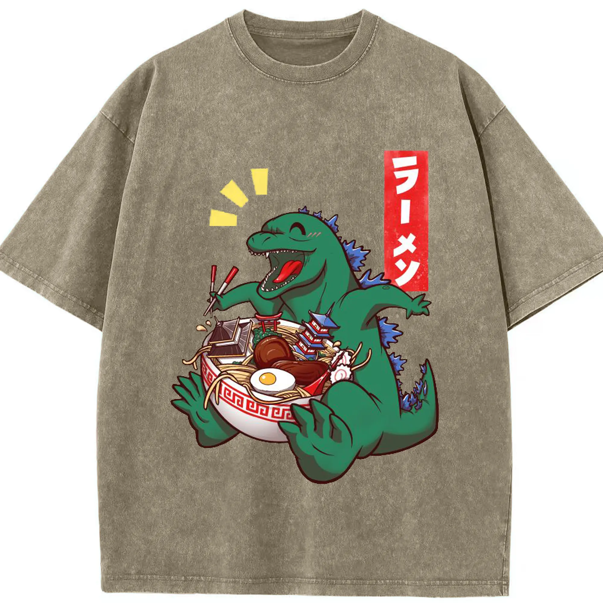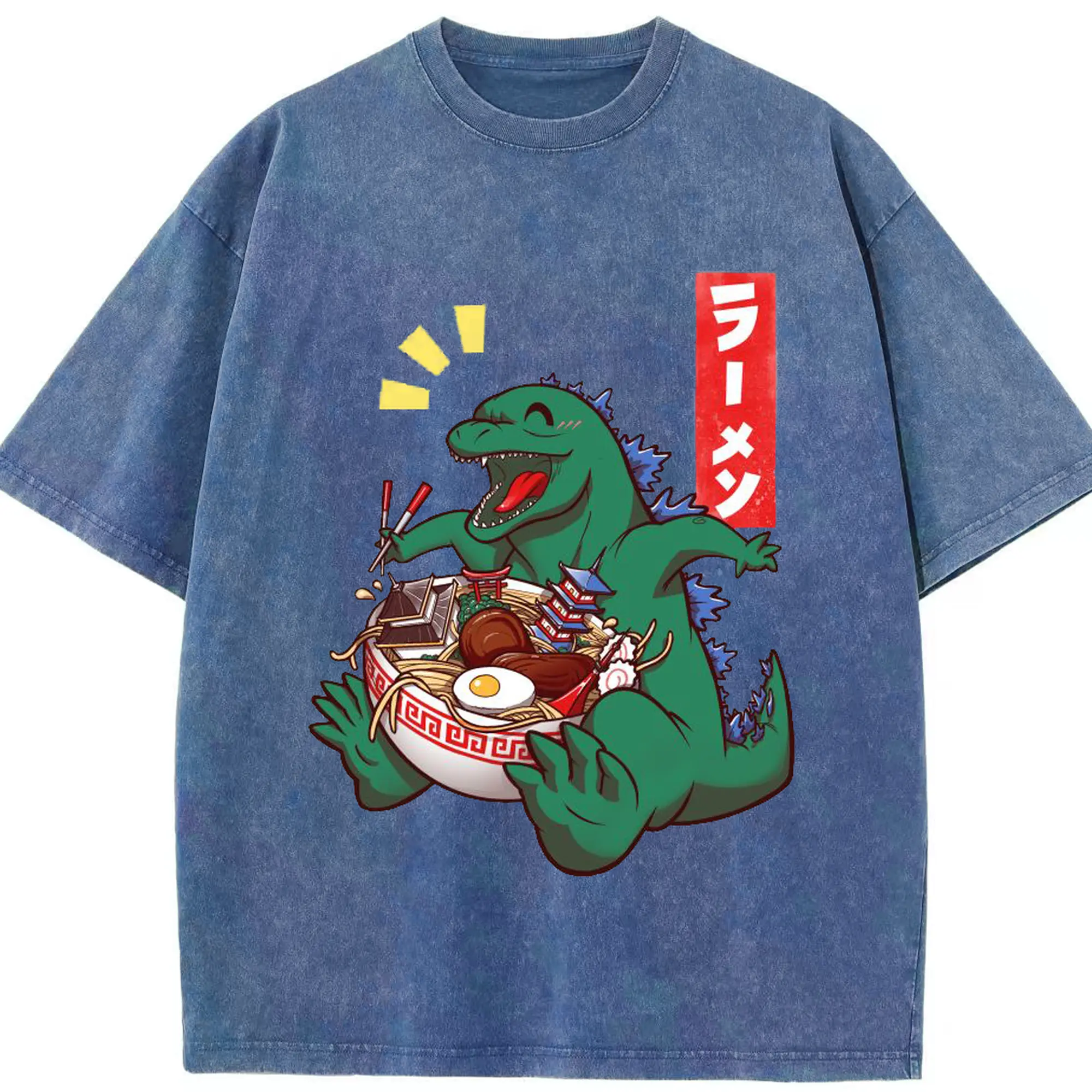 ゴジラの食事タイム - 綿100% ヴィンテージ風 半袖Tシャツ ・ フロントプリント ・ 柔らか肌触り ・ 通気性 快適 ・ スポーツ カジュアル 外出用