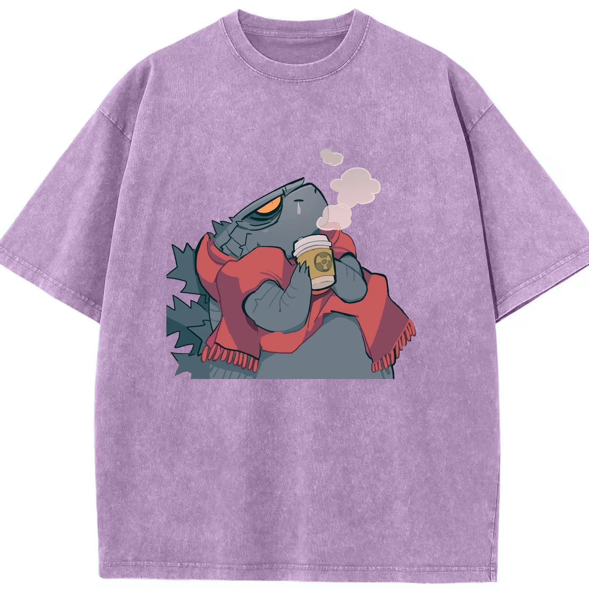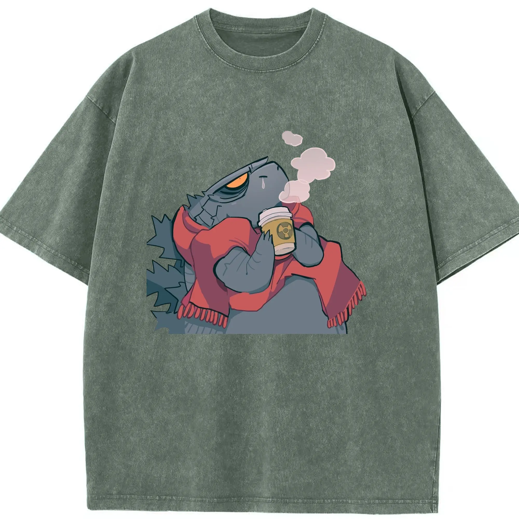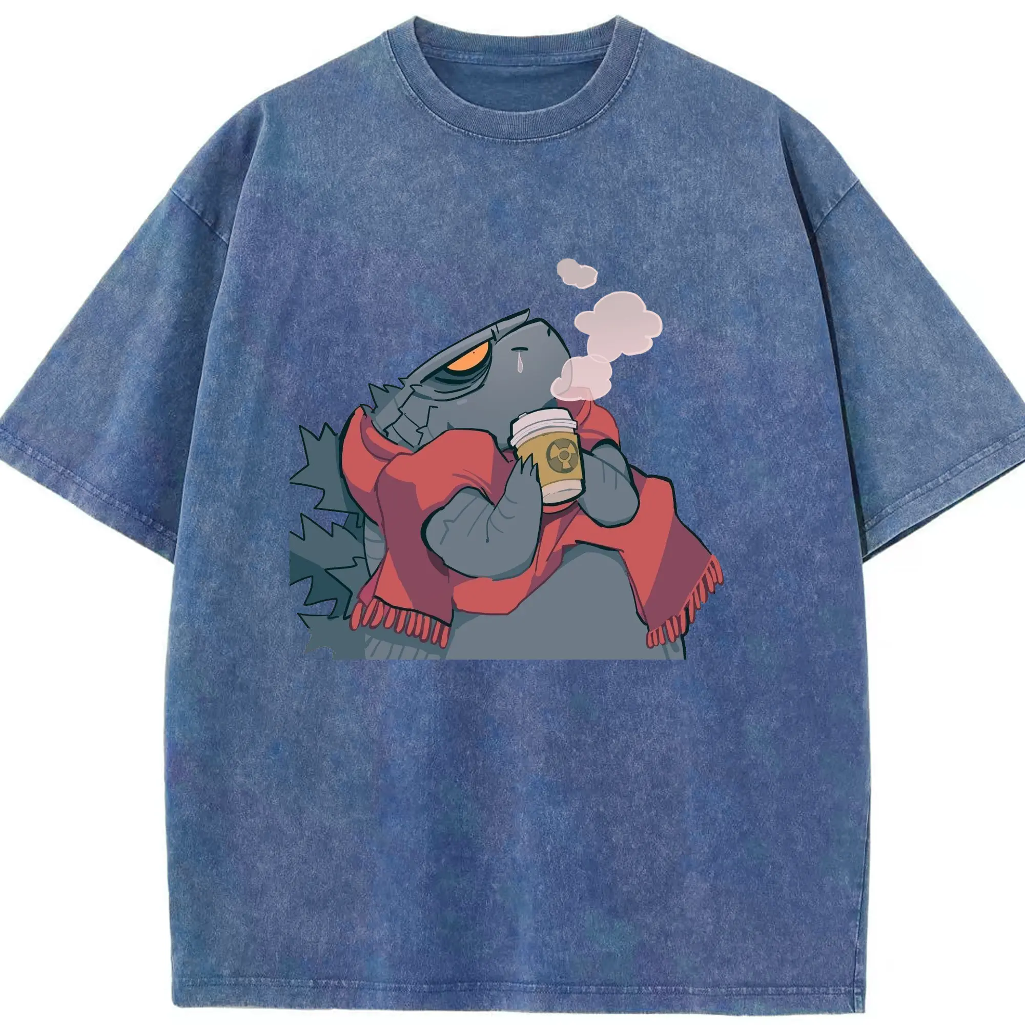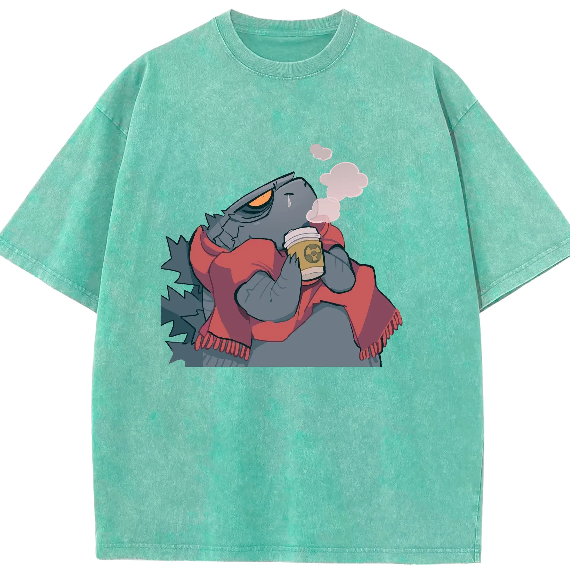ゴジラの食事タイム - 綿100% ヴィンテージ風 半袖Tシャツ ・ フロントプリント ・ 柔らか肌触り ・ 通気性 快適 ・ スポーツ カジュアル 外出用