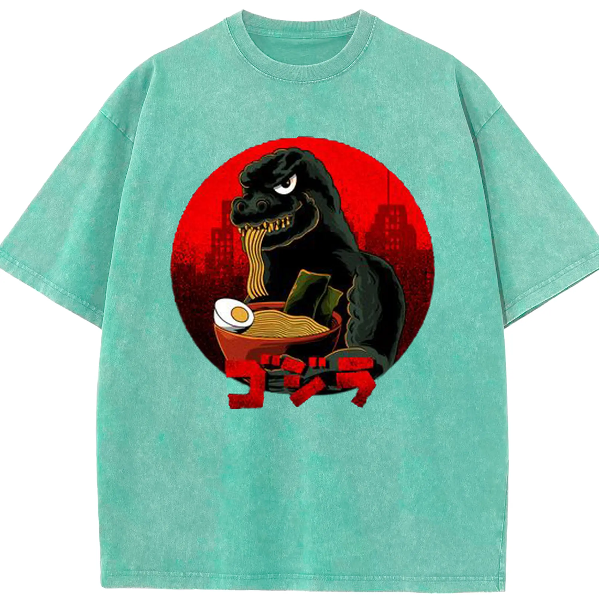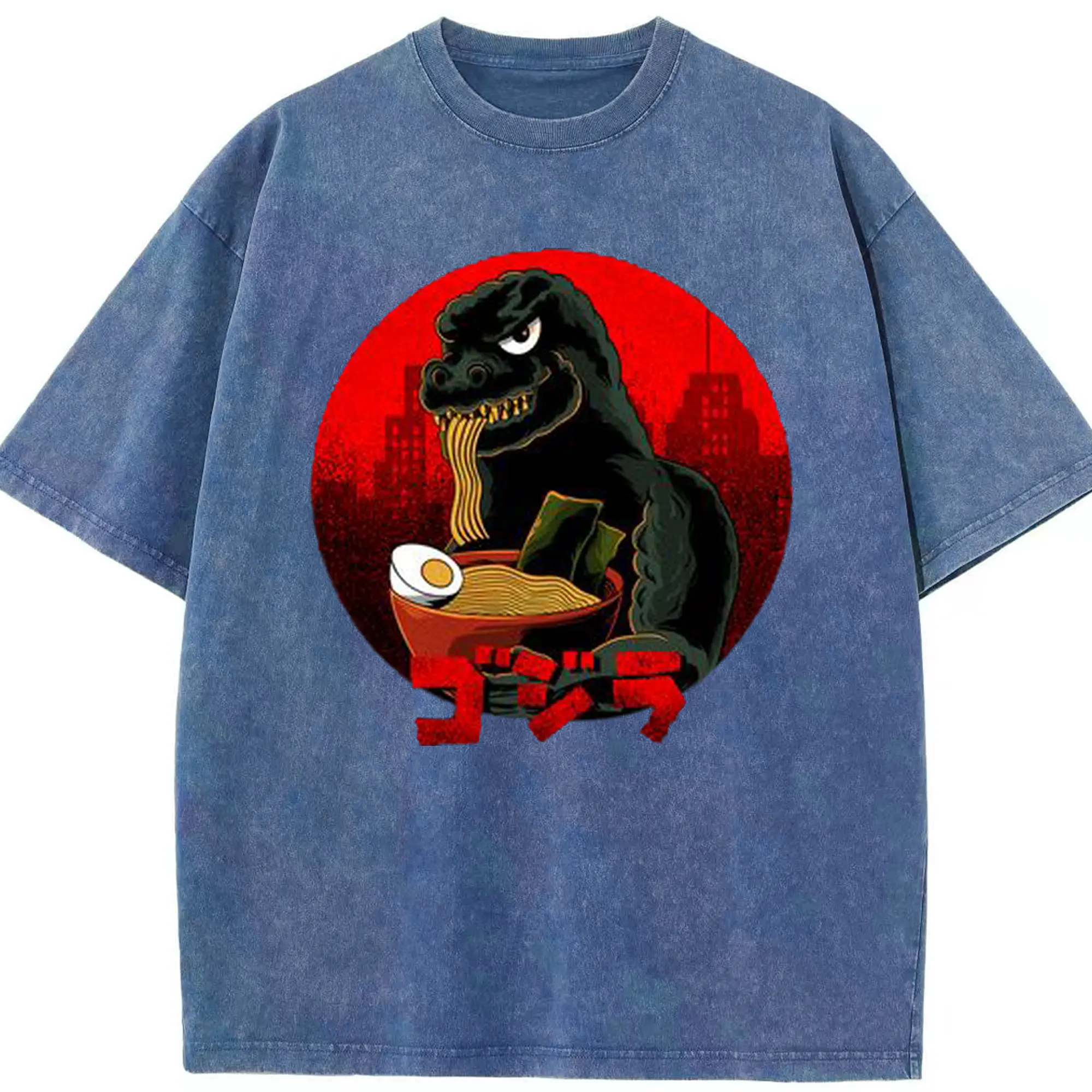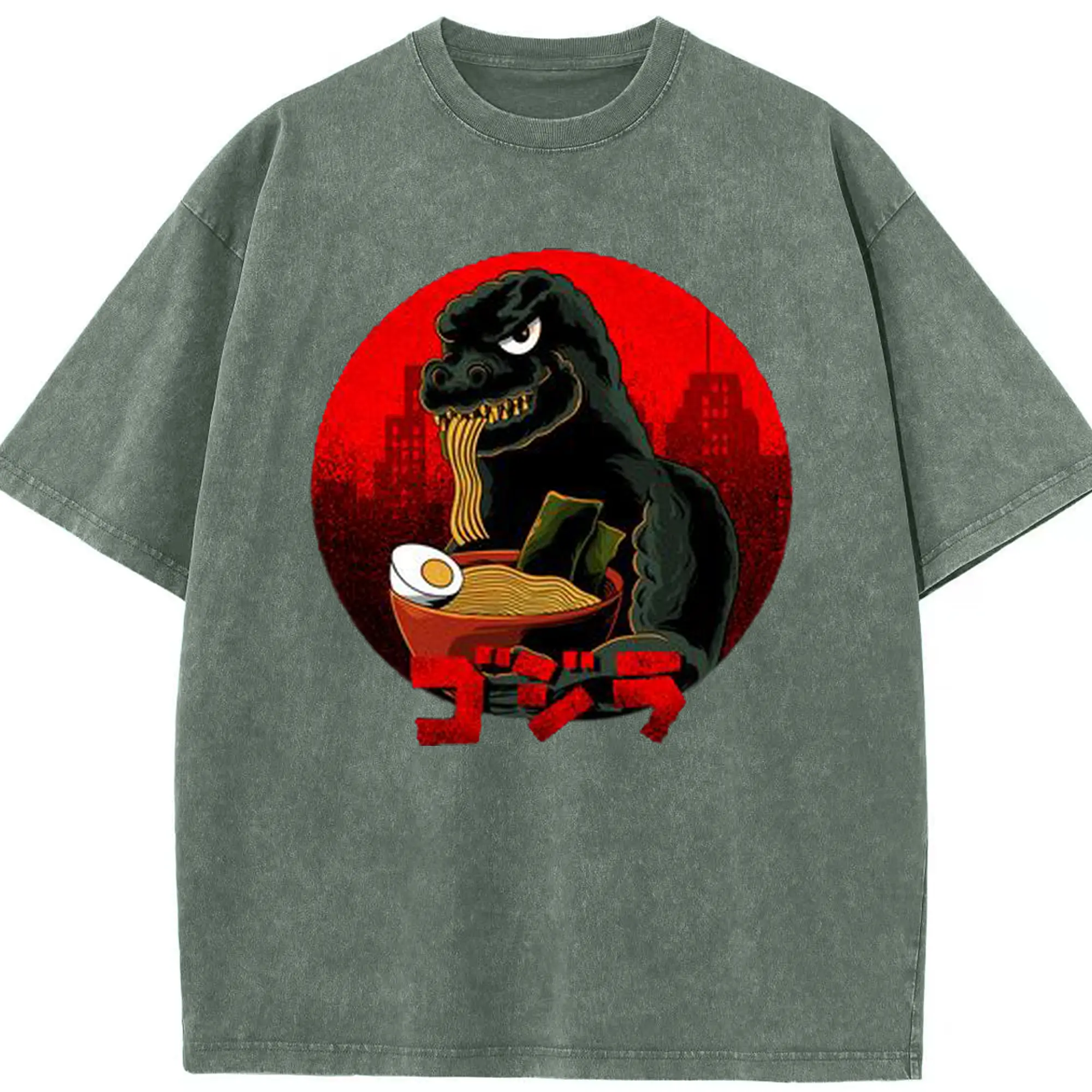 ゴジラの食事タイム - 綿100% ヴィンテージ風 半袖Tシャツ ・ フロントプリント ・ 柔らか肌触り ・ 通気性 快適 ・ スポーツ カジュアル 外出用