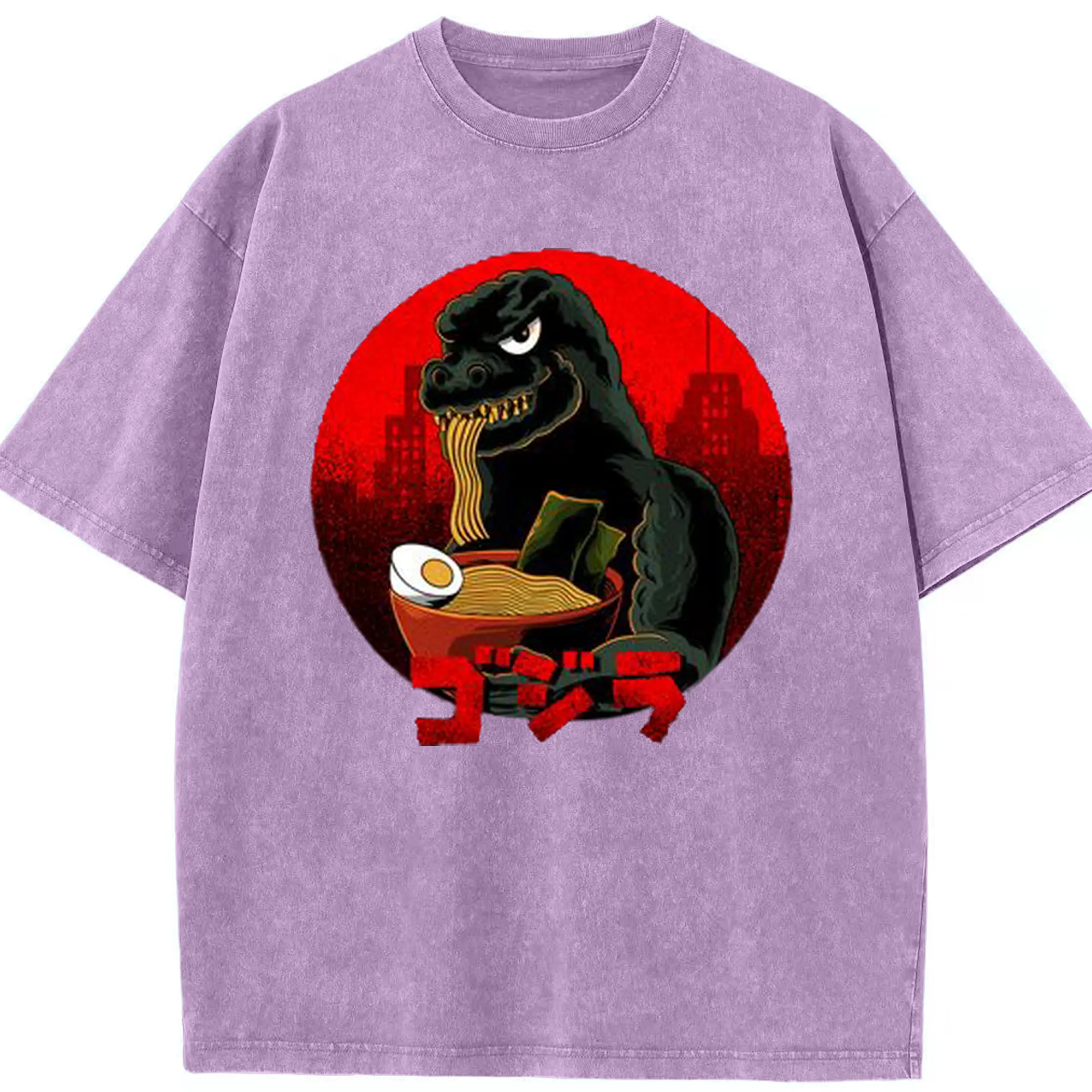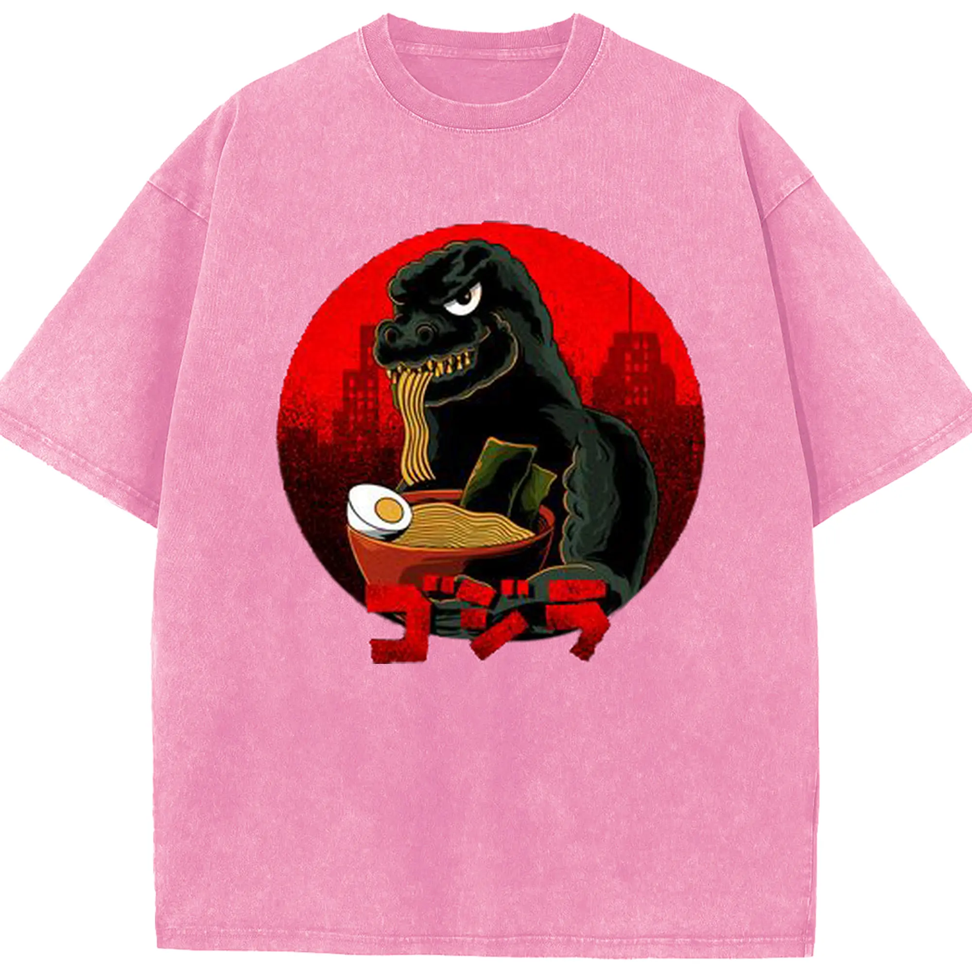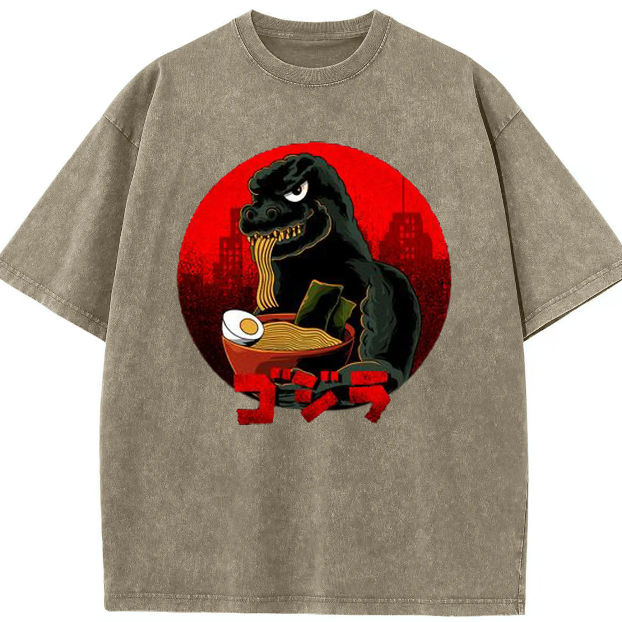 ゴジラの食事タイム - 綿100% ヴィンテージ風 半袖Tシャツ ・ フロントプリント ・ 柔らか肌触り ・ 通気性 快適 ・ スポーツ カジュアル 外出用