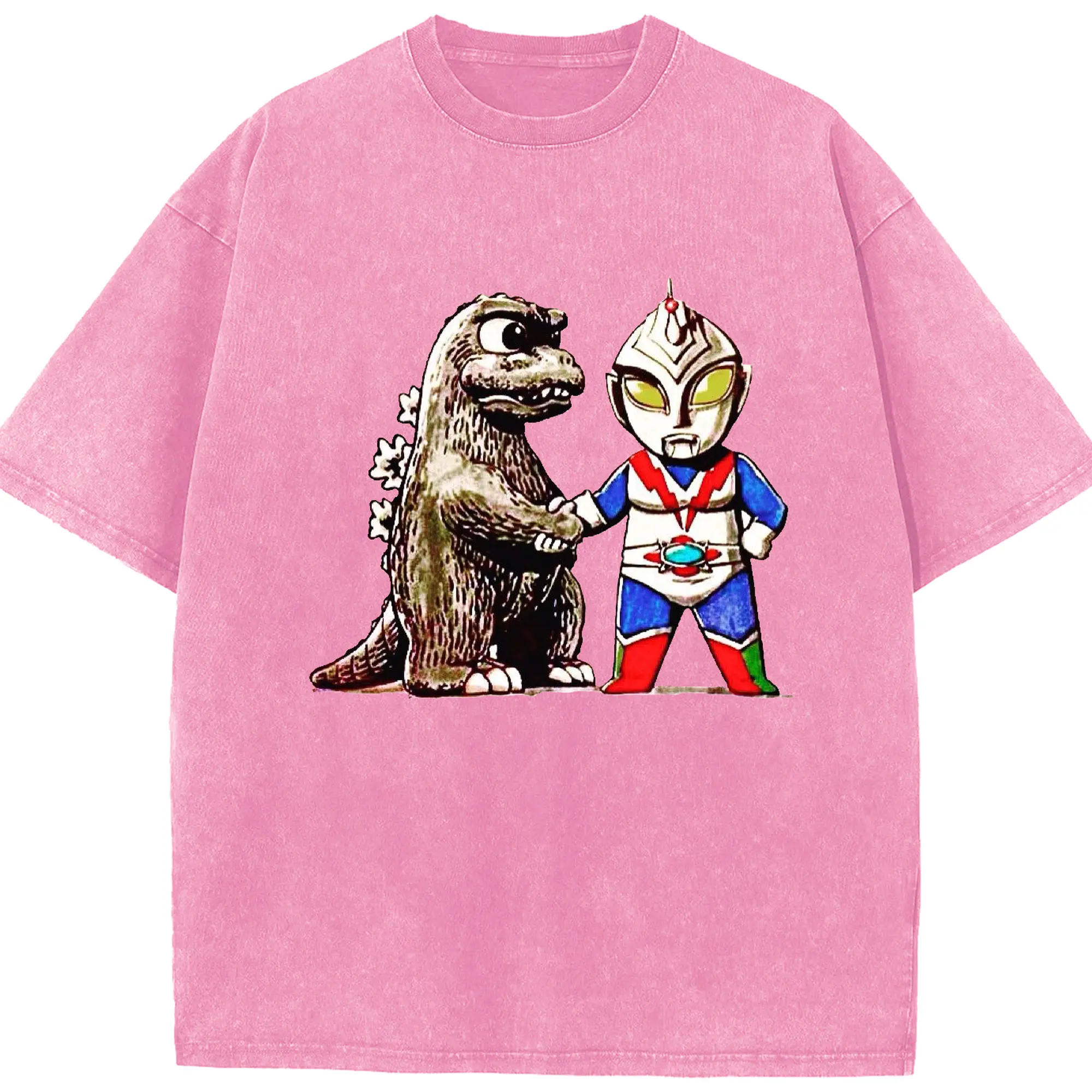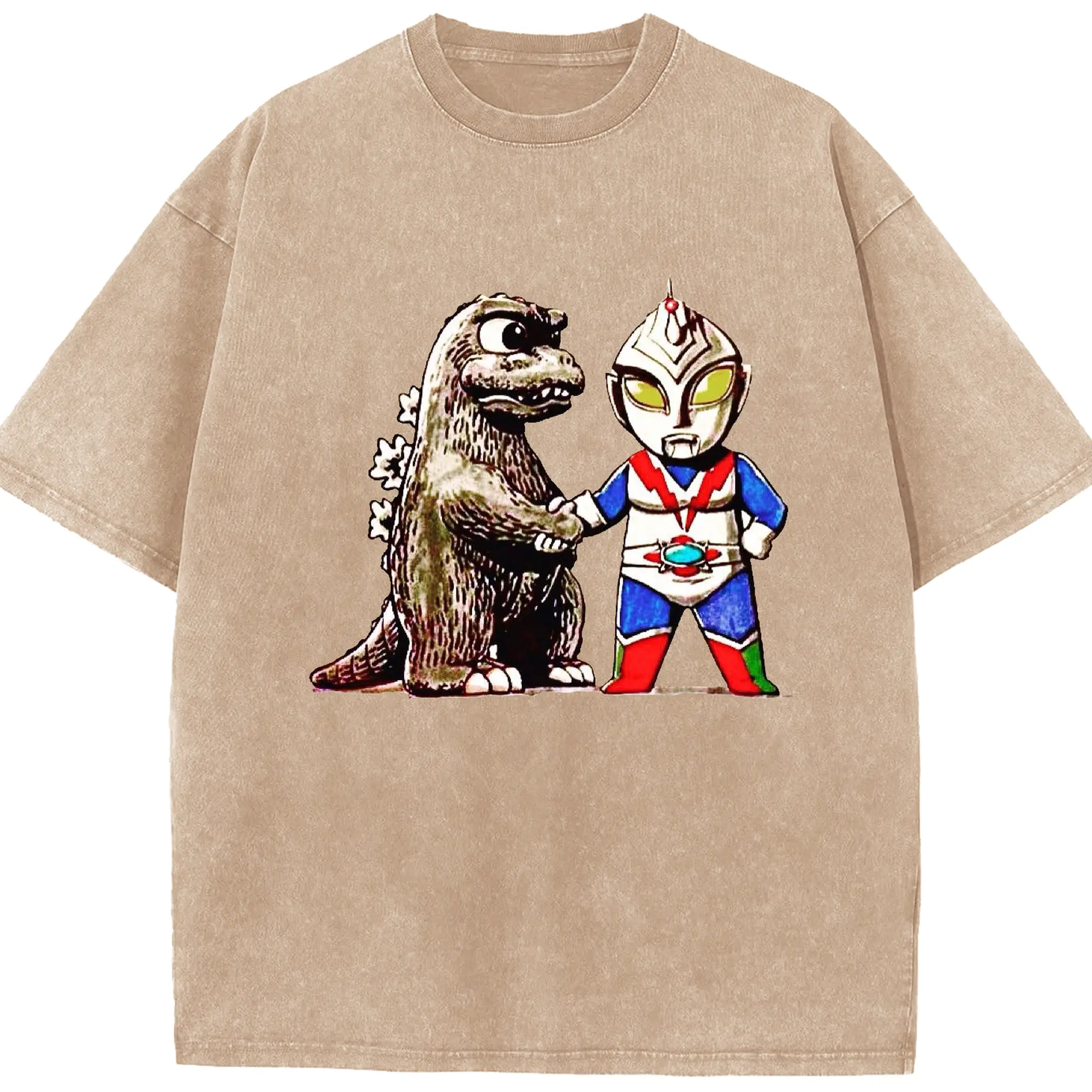 ゴジラ ウルトラマンコラボ - 綿100% ヴィンテージ風 半袖Tシャツ ・ フロントプリント ・ 柔らか肌触り ・ 通気性 快適 ・ スポーツ カジュアル 外出用