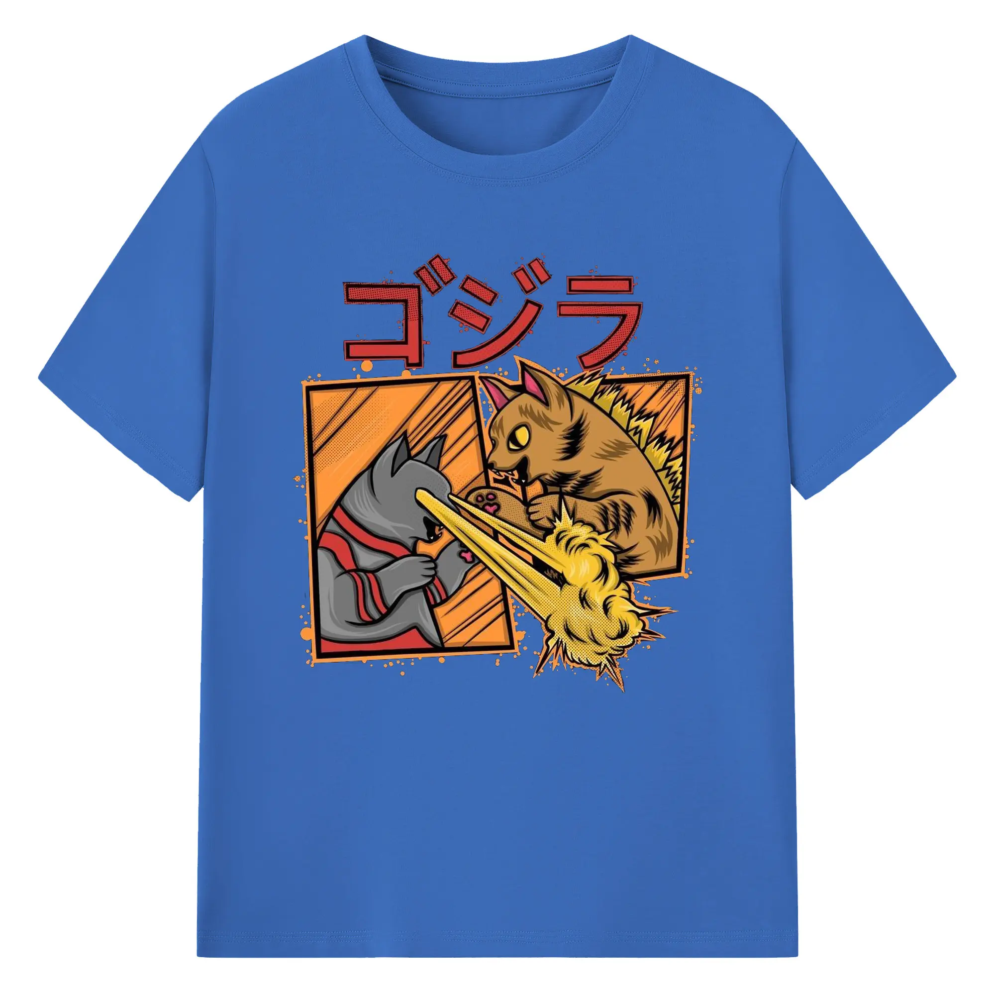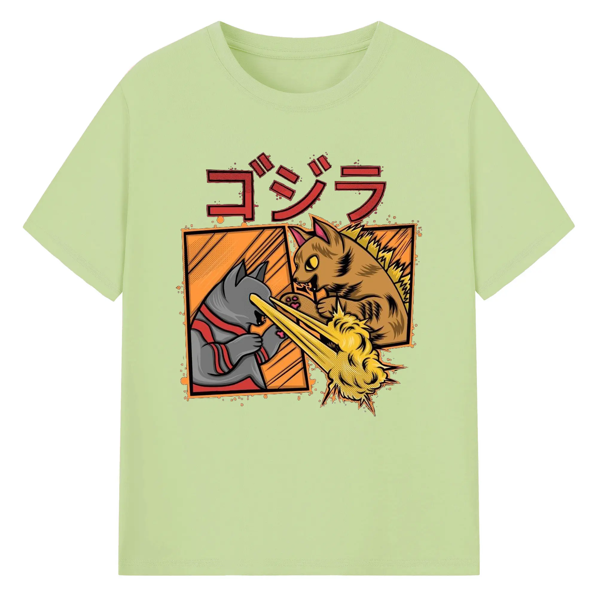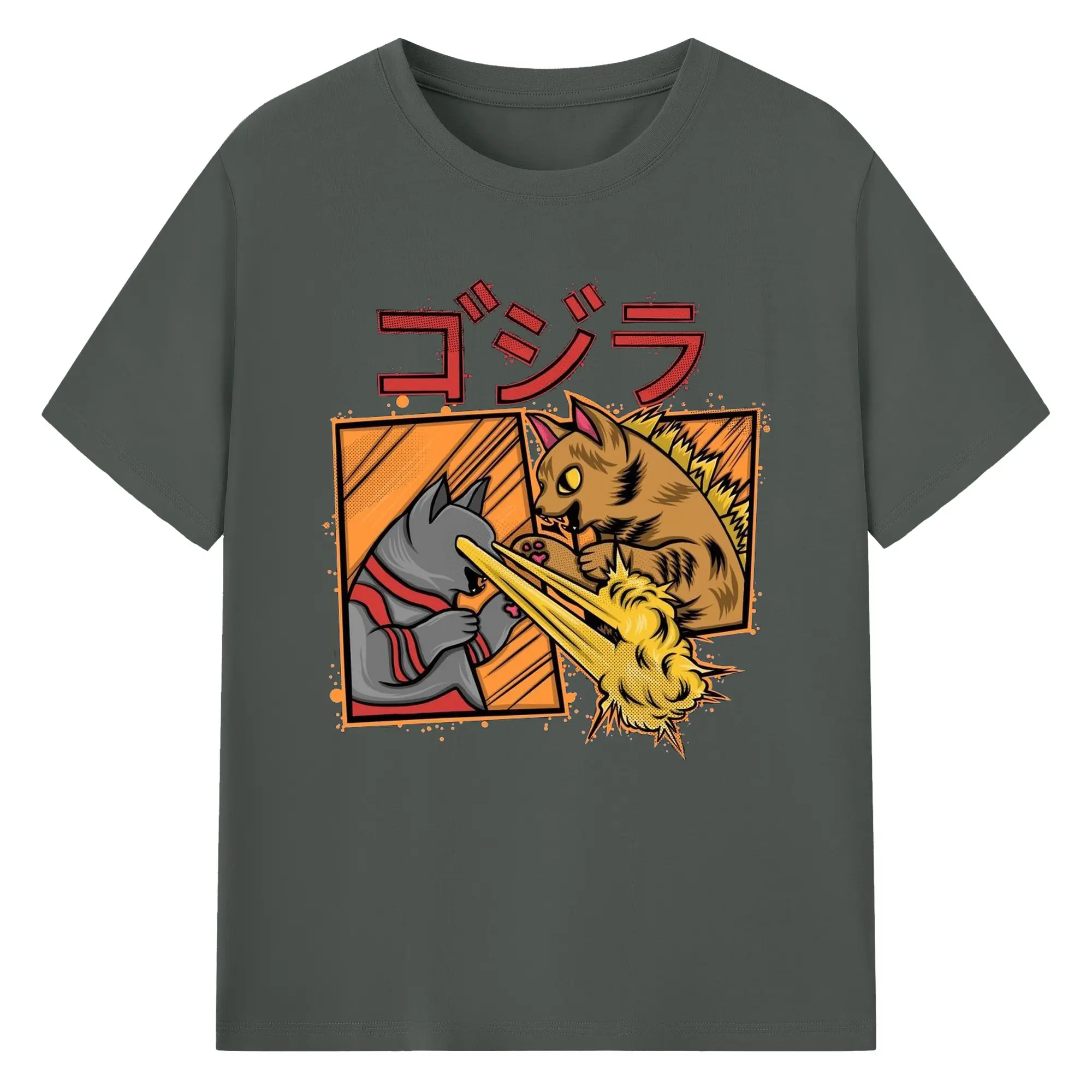 ゴジラ キャットジラ CATZILLA 怪獣ねこ - 綿100% 半袖Tシャツ ・ フロントプリント ・ 快適 通気性 ・ 日常使い 散歩 スポーツ用
