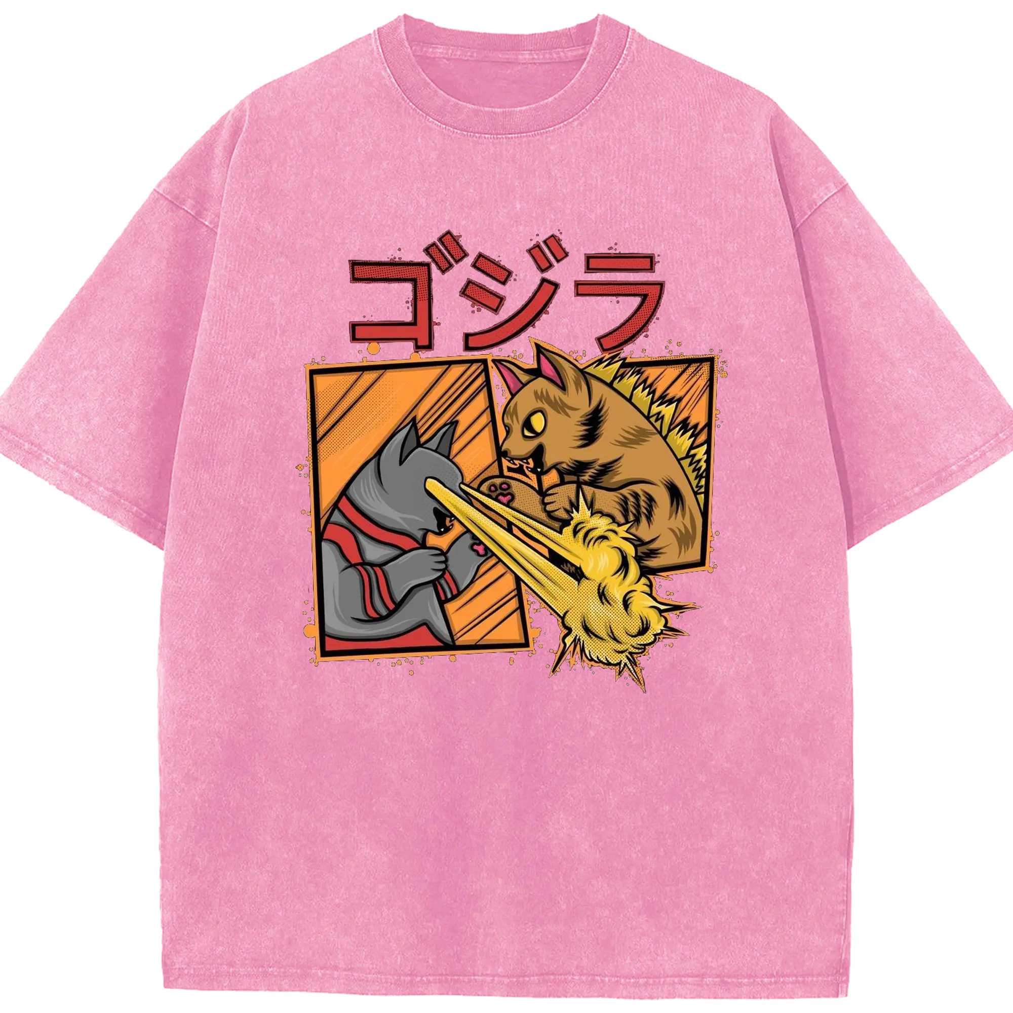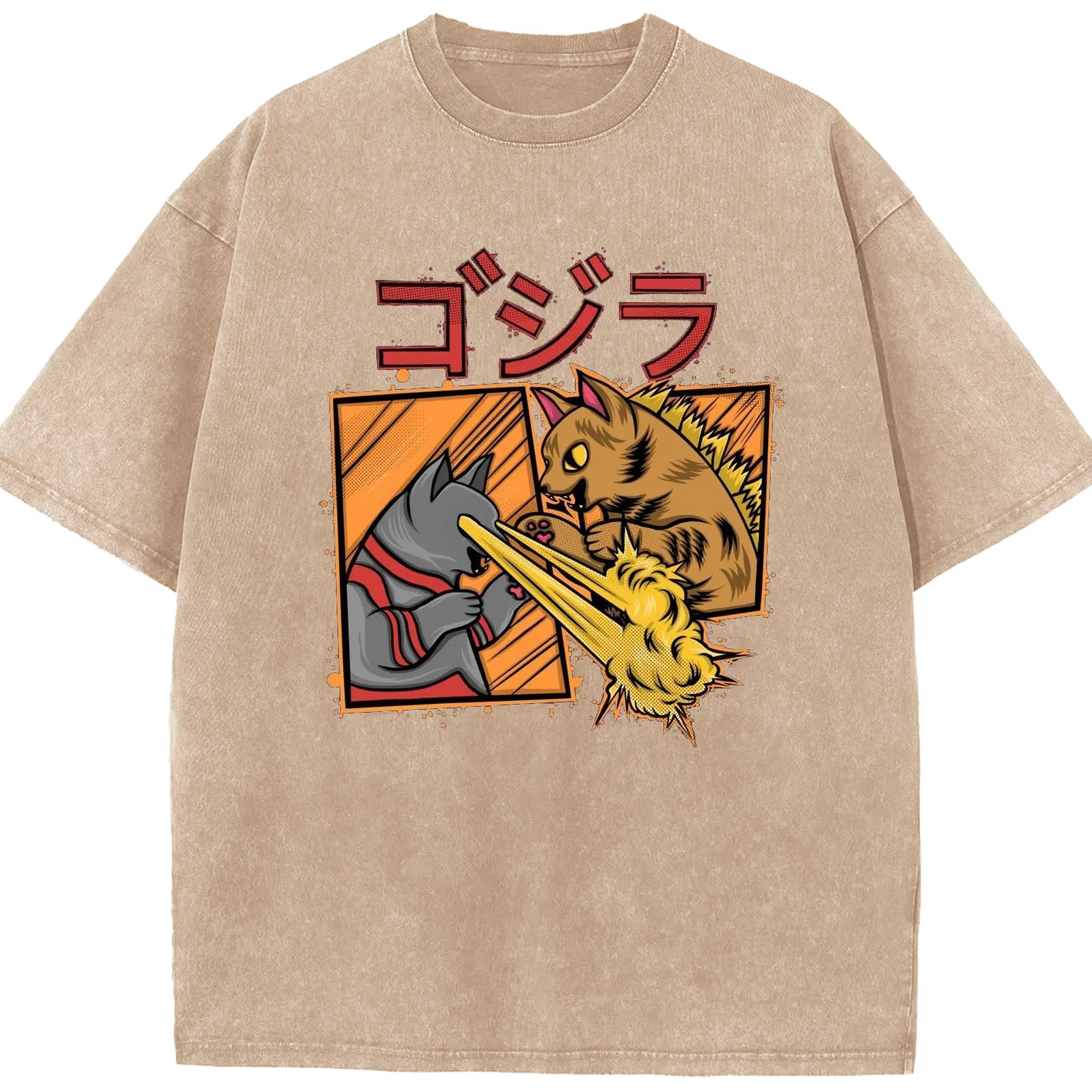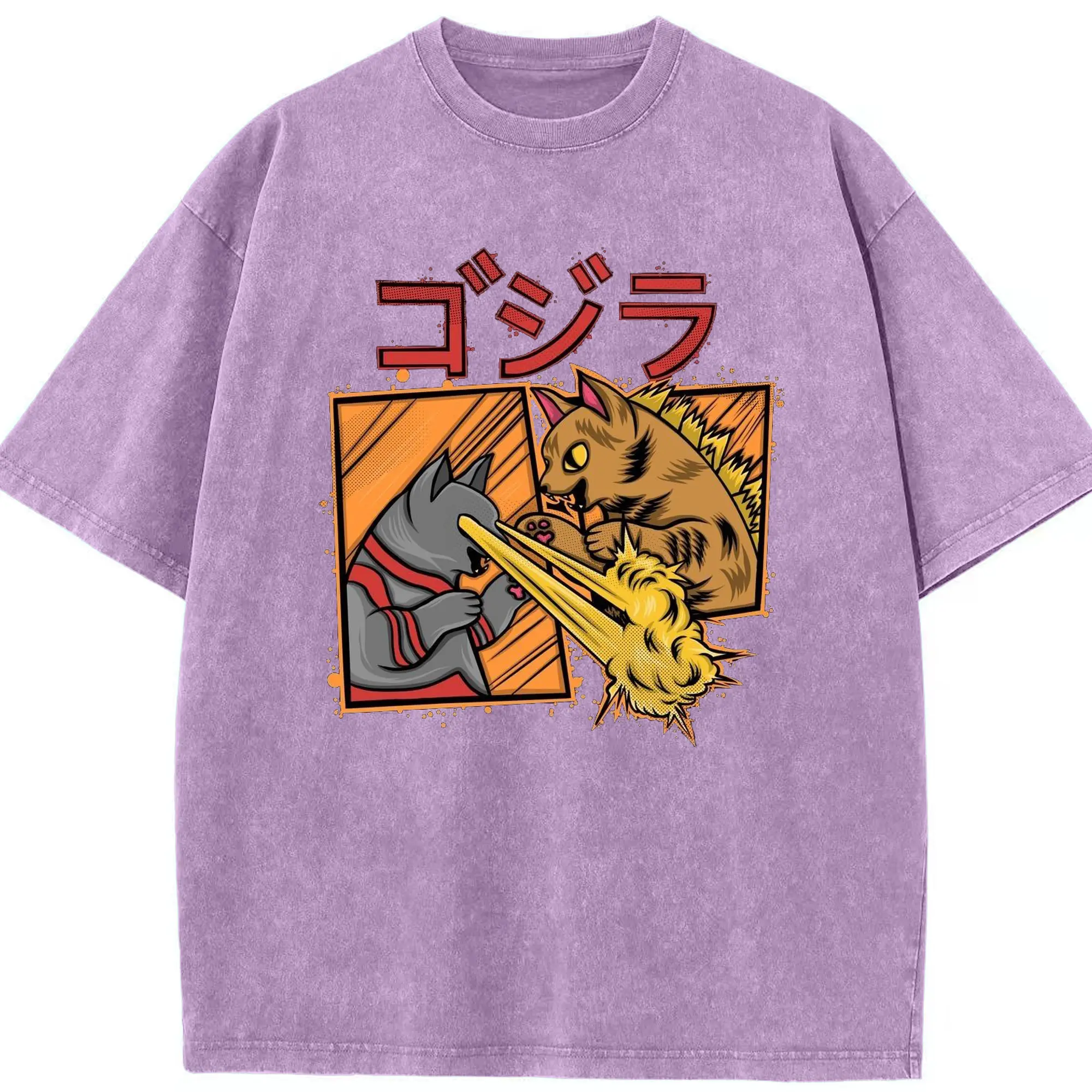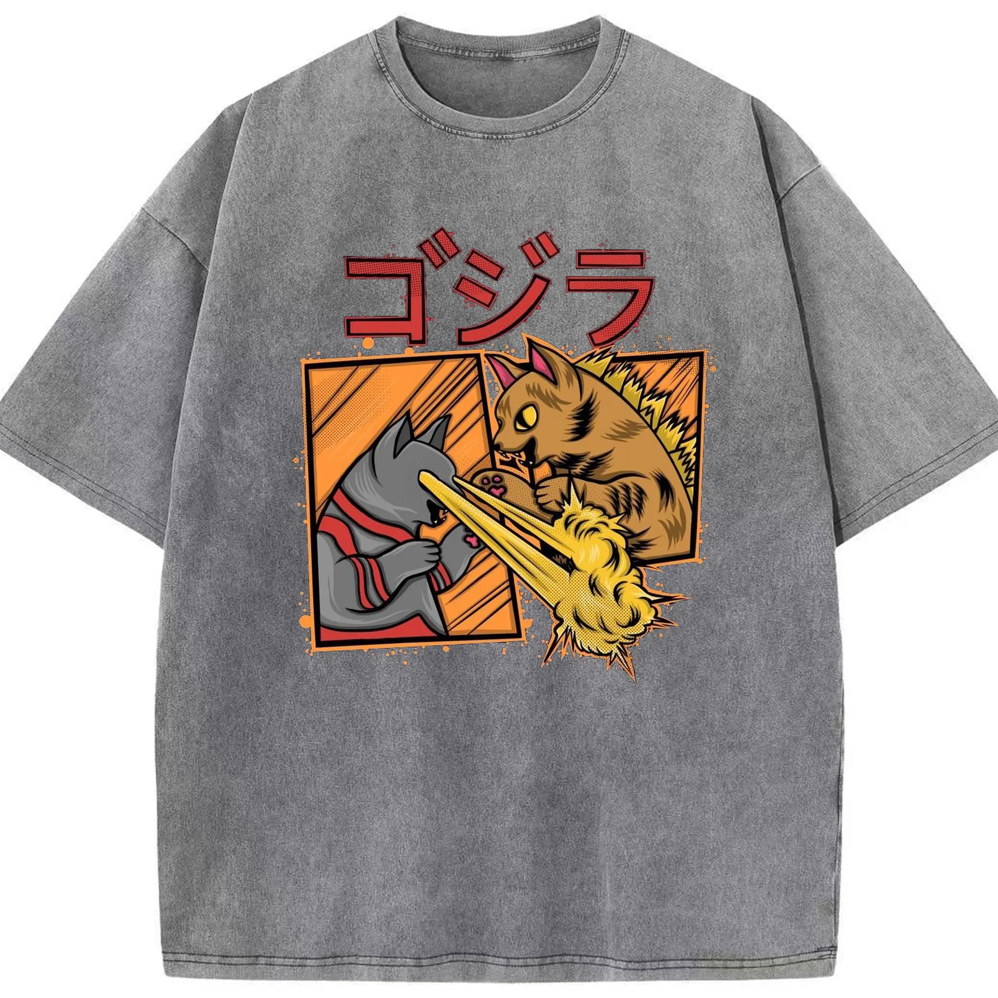 ゴジラ キャットジラ CATZILLA 怪獣ねこ - 綿100% ヴィンテージ風 半袖Tシャツ ・ フロントプリント ・ 柔らか肌触り ・ 通気性 快適 ・ スポーツ カジュアル 外出用