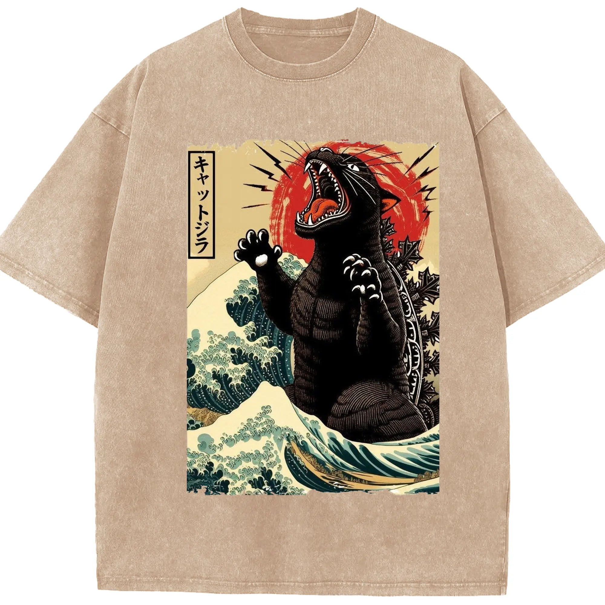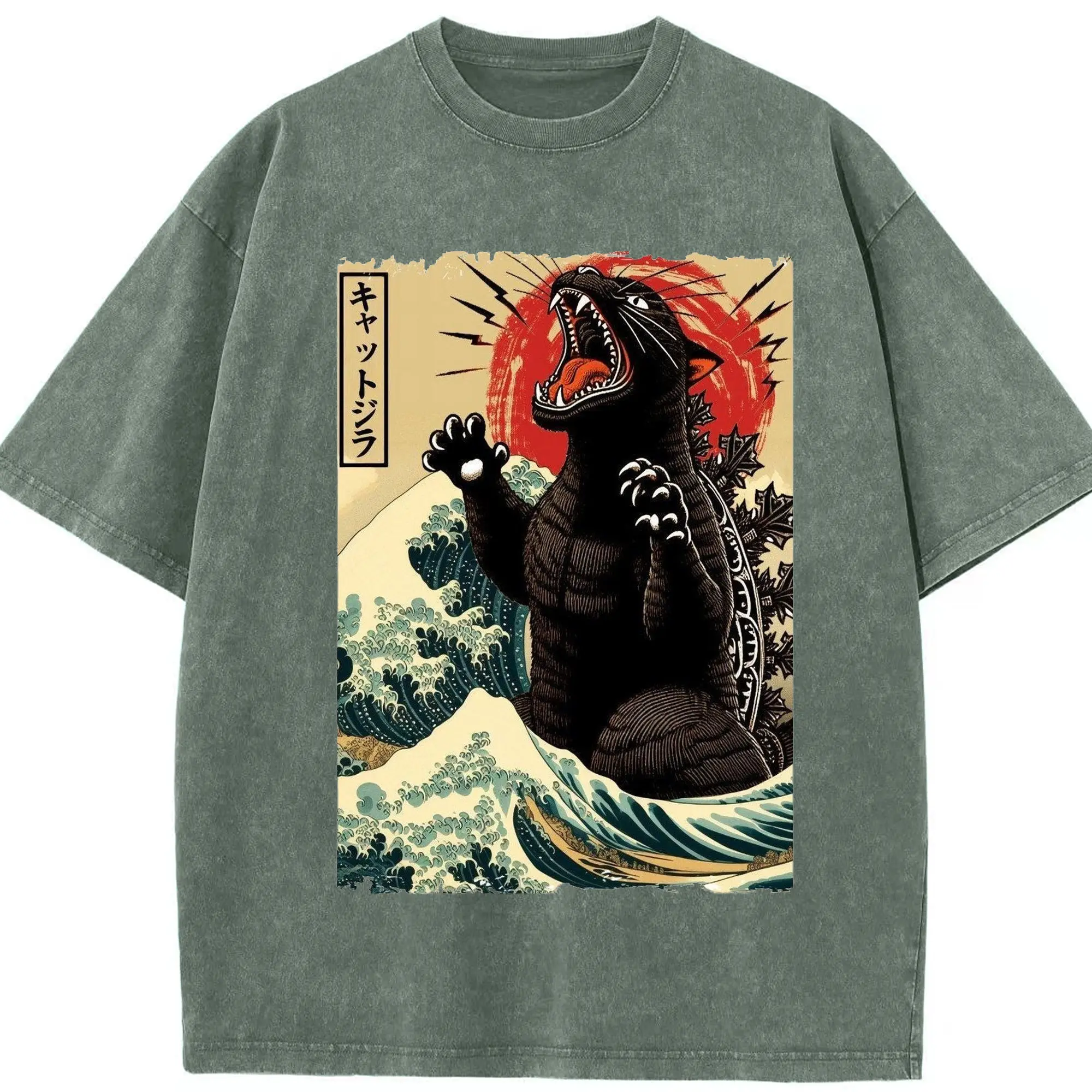 ゴジラ キャットジラ CATZILLA - 綿100% ヴィンテージ風 半袖Tシャツ ・ フロントプリント ・ 柔らか肌触り ・ 通気性 快適 ・ スポーツ カジュアル 外出用