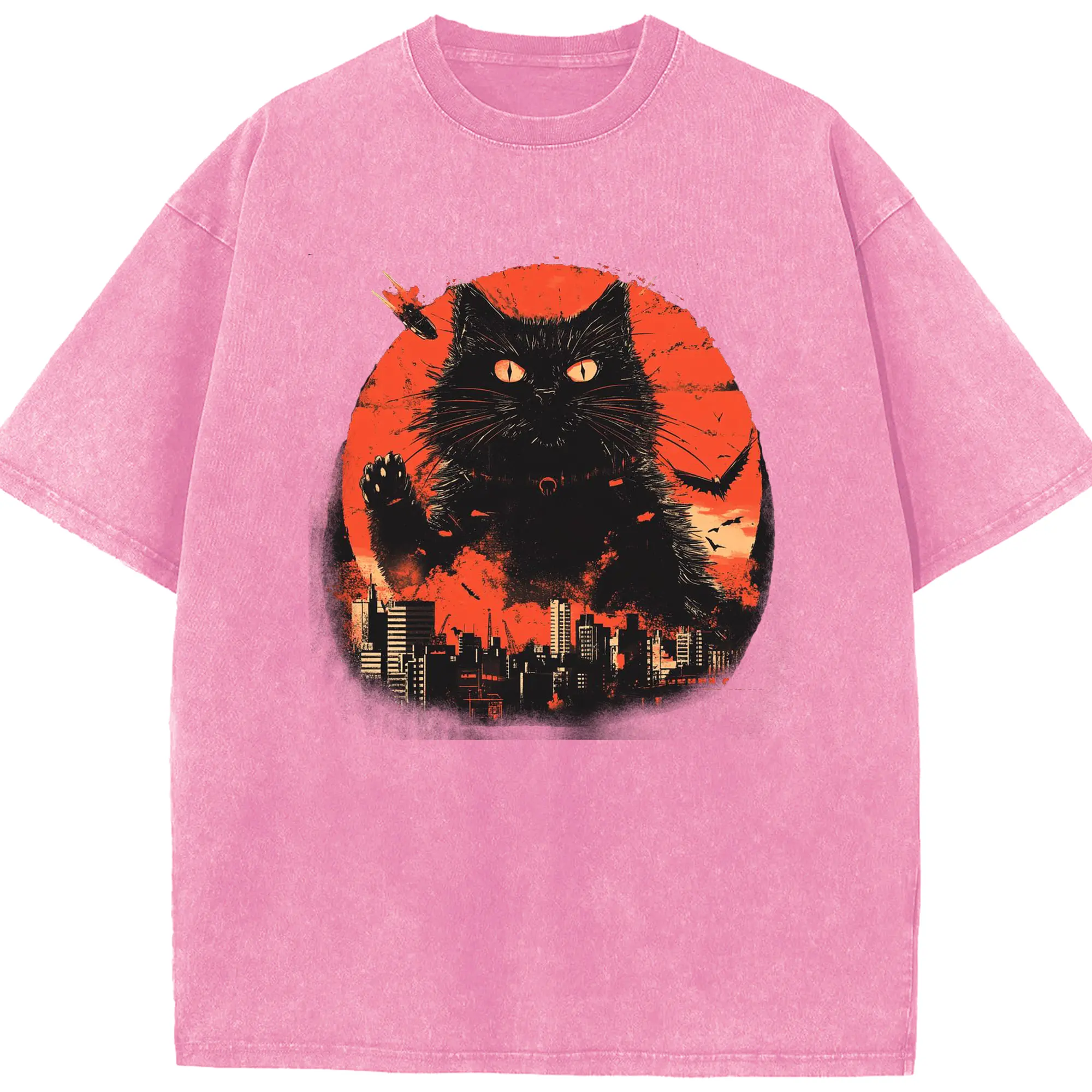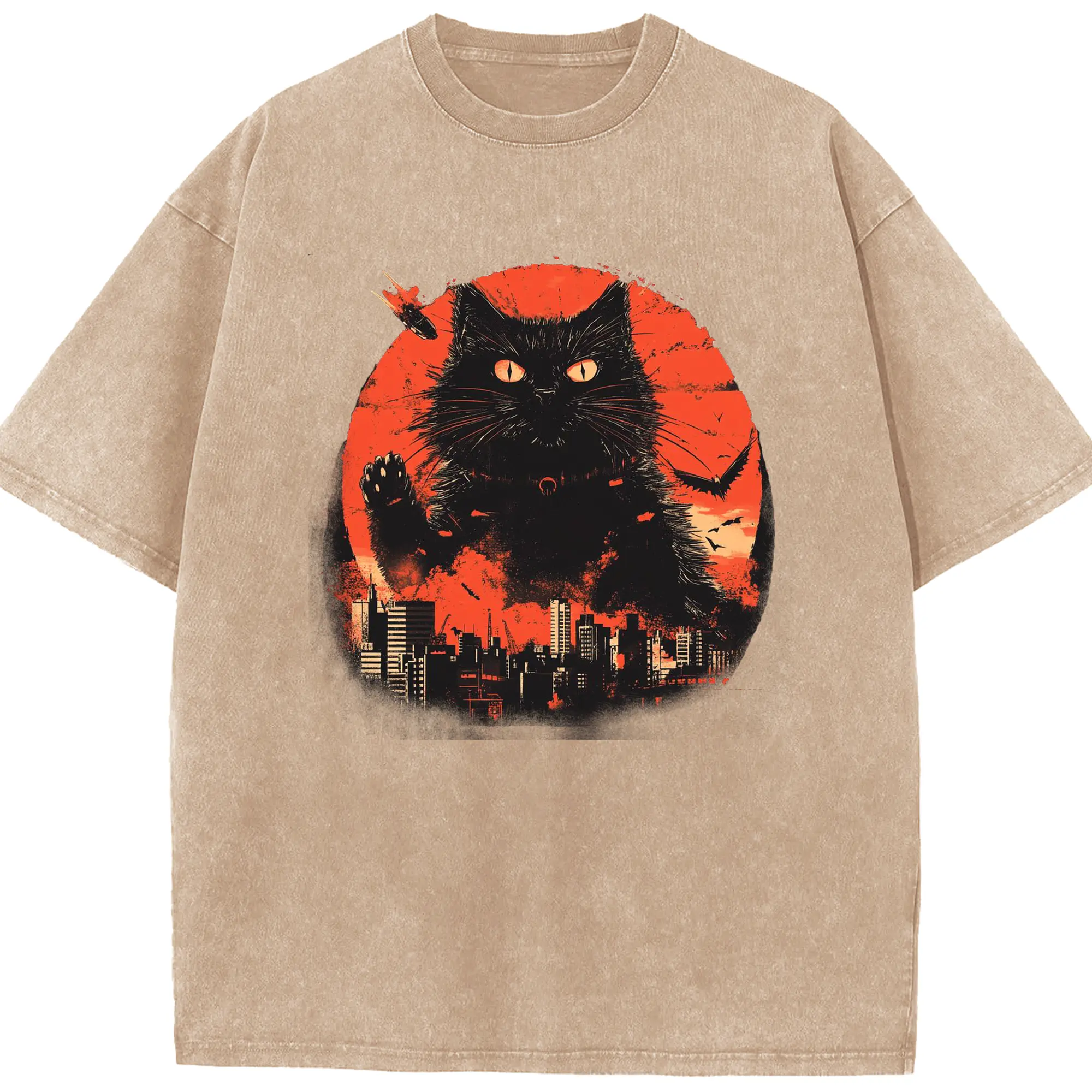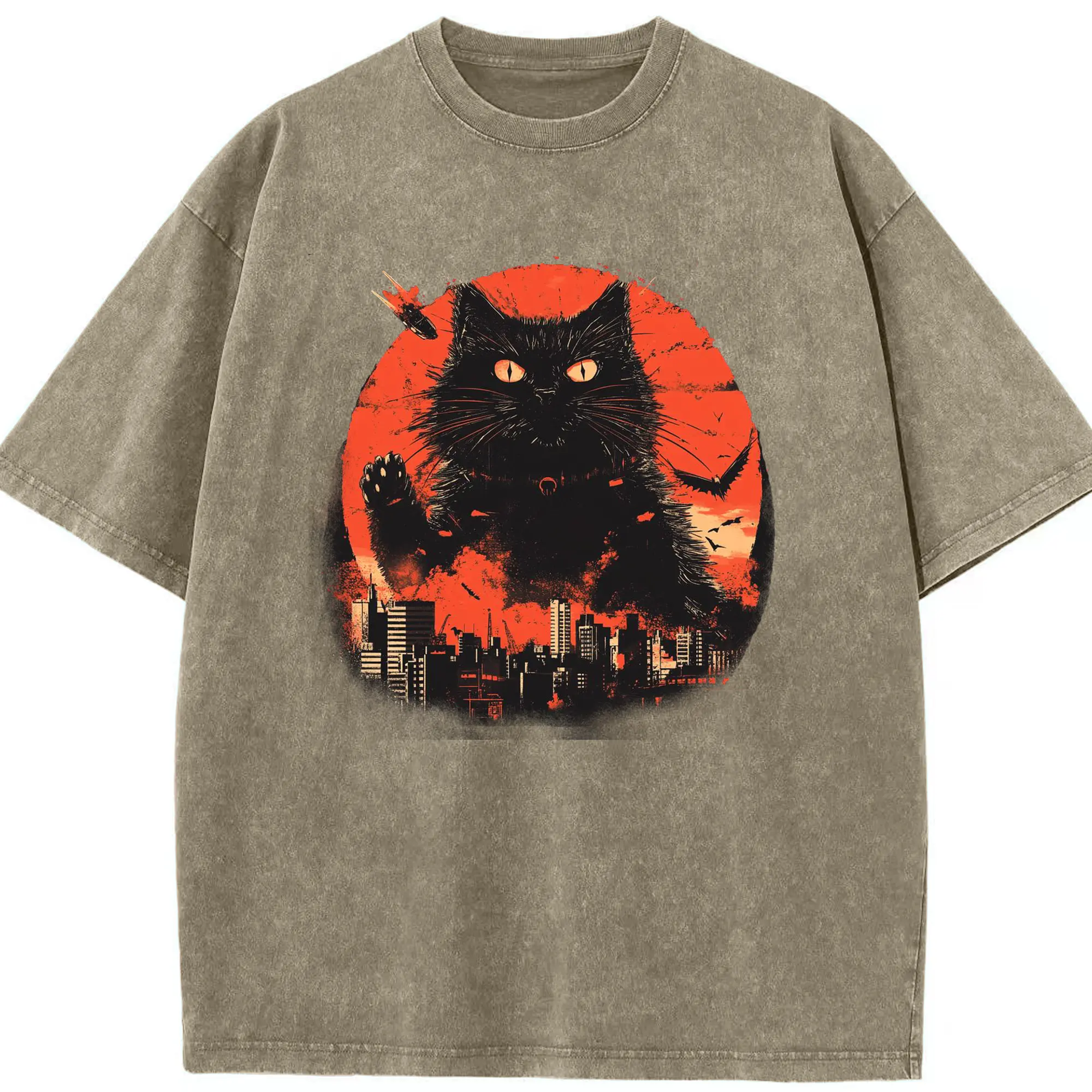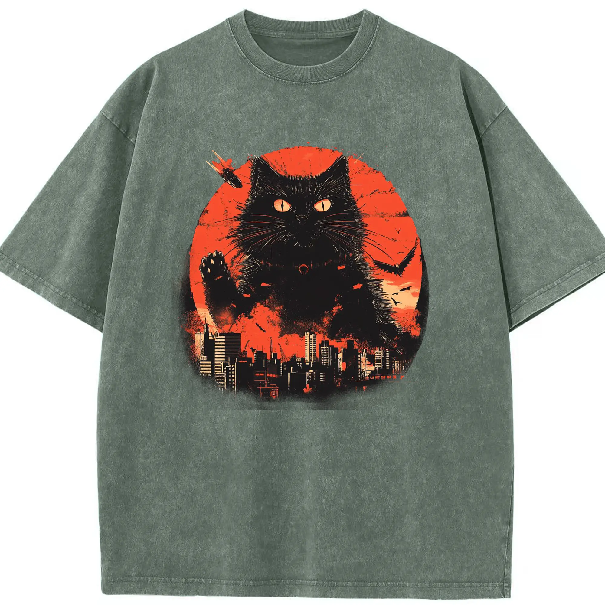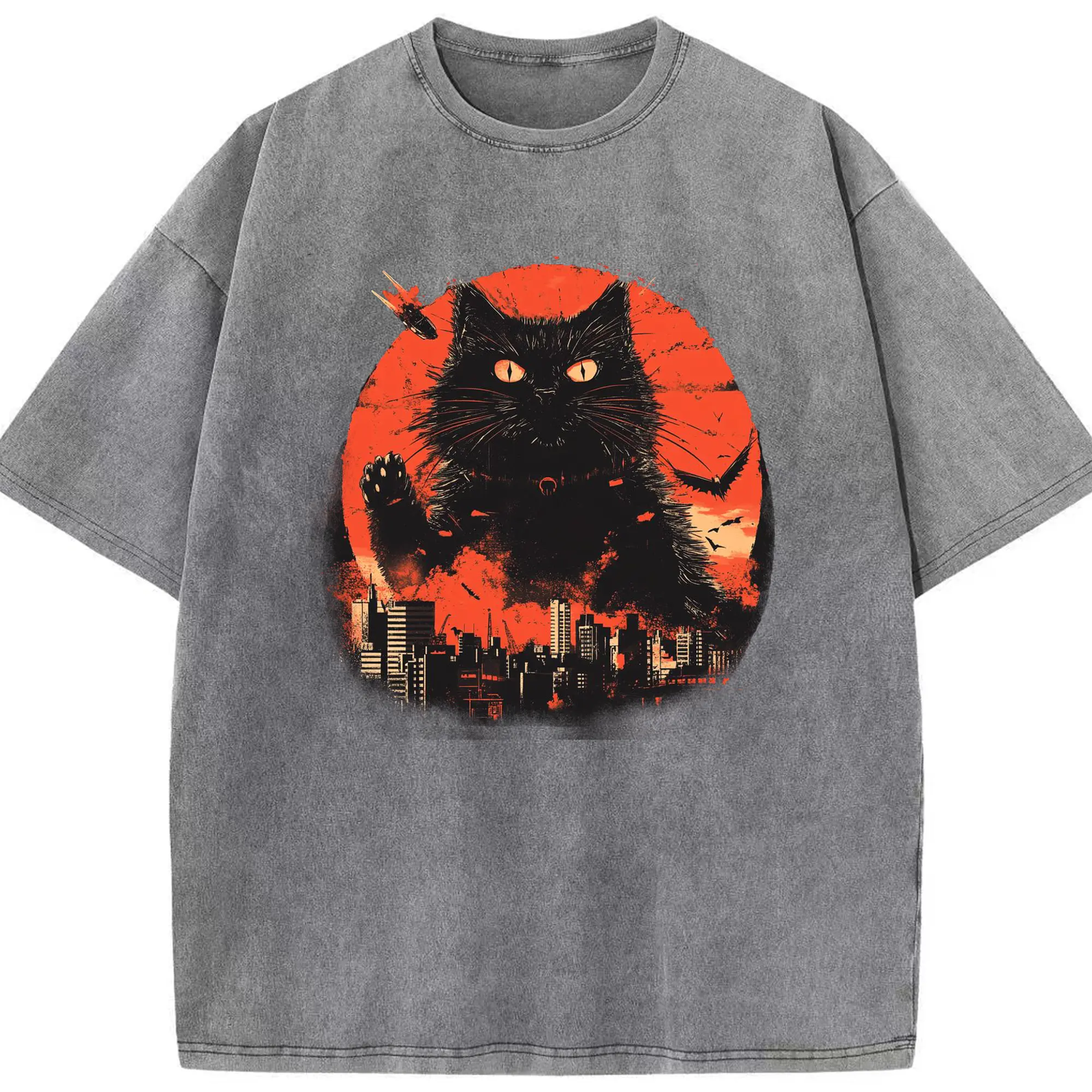 ゴジラ キャットジラ CATZILLA 怪獣ねこ - 綿100% ヴィンテージ風 半袖Tシャツ ・ フロントプリント ・ 柔らか肌触り ・ 通気性 快適 ・ スポーツ カジュアル 外出用
