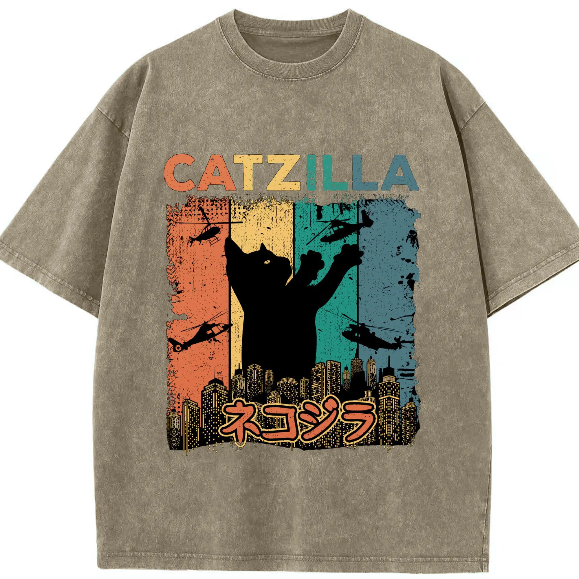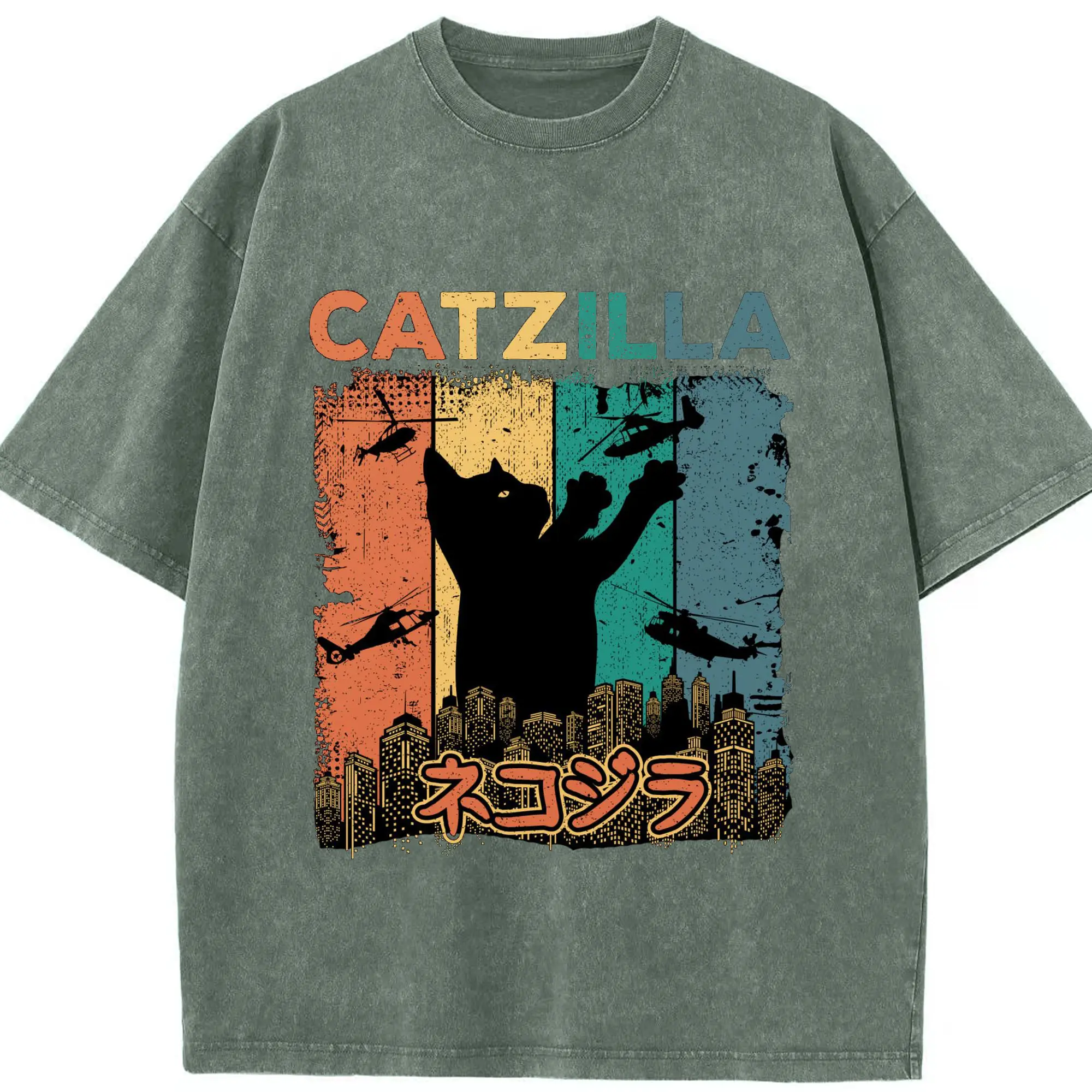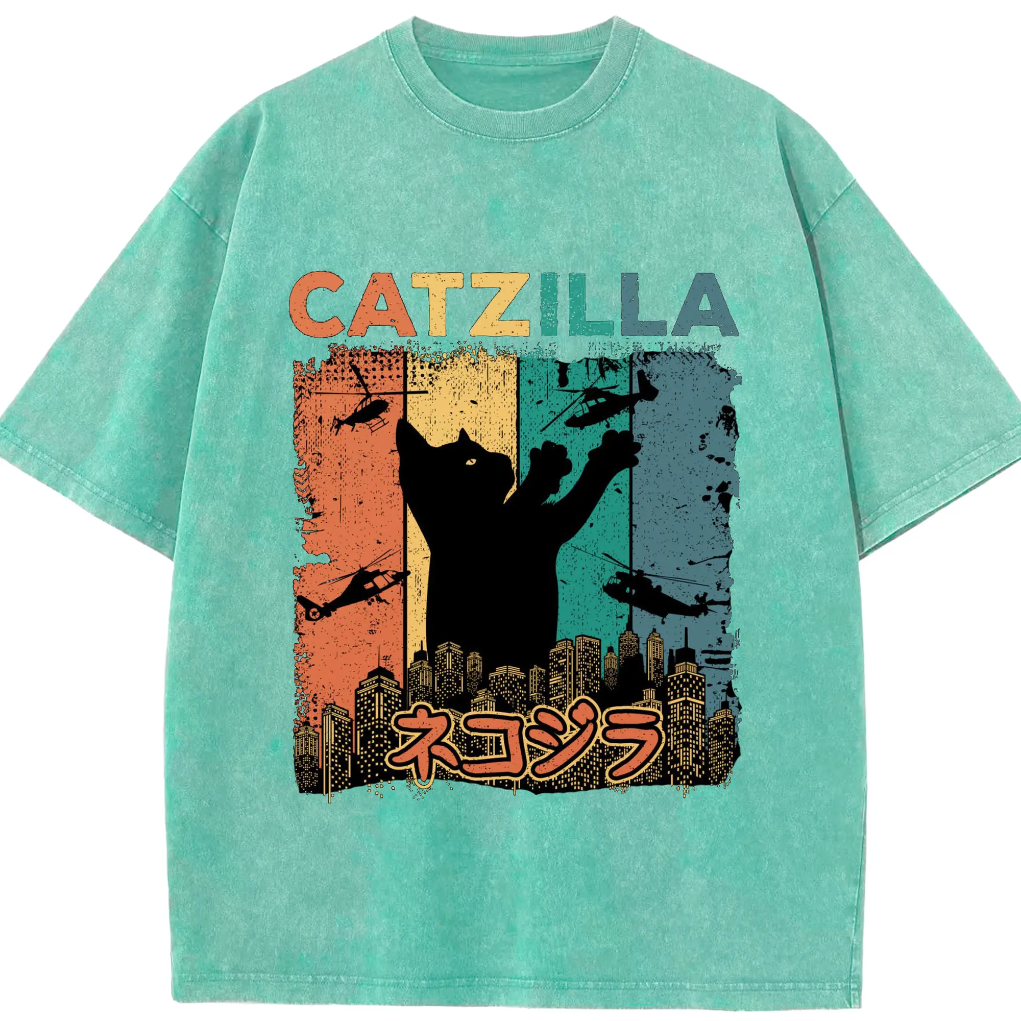 ゴジラ キャットジラ CATZILLA - 綿100% ヴィンテージ風 半袖Tシャツ ・ フロントプリント ・ 柔らか肌触り ・ 通気性 快適 ・ スポーツ カジュアル 外出用