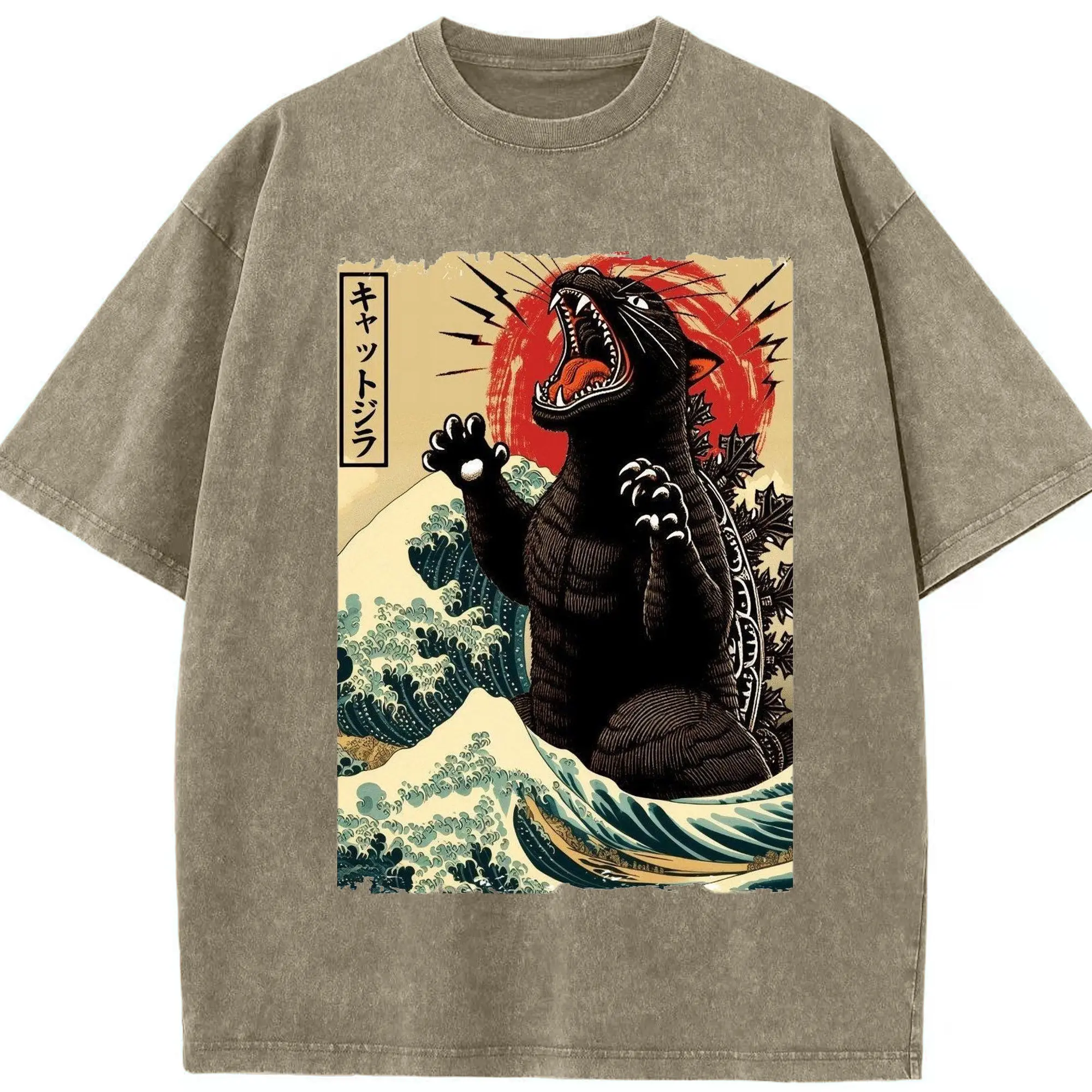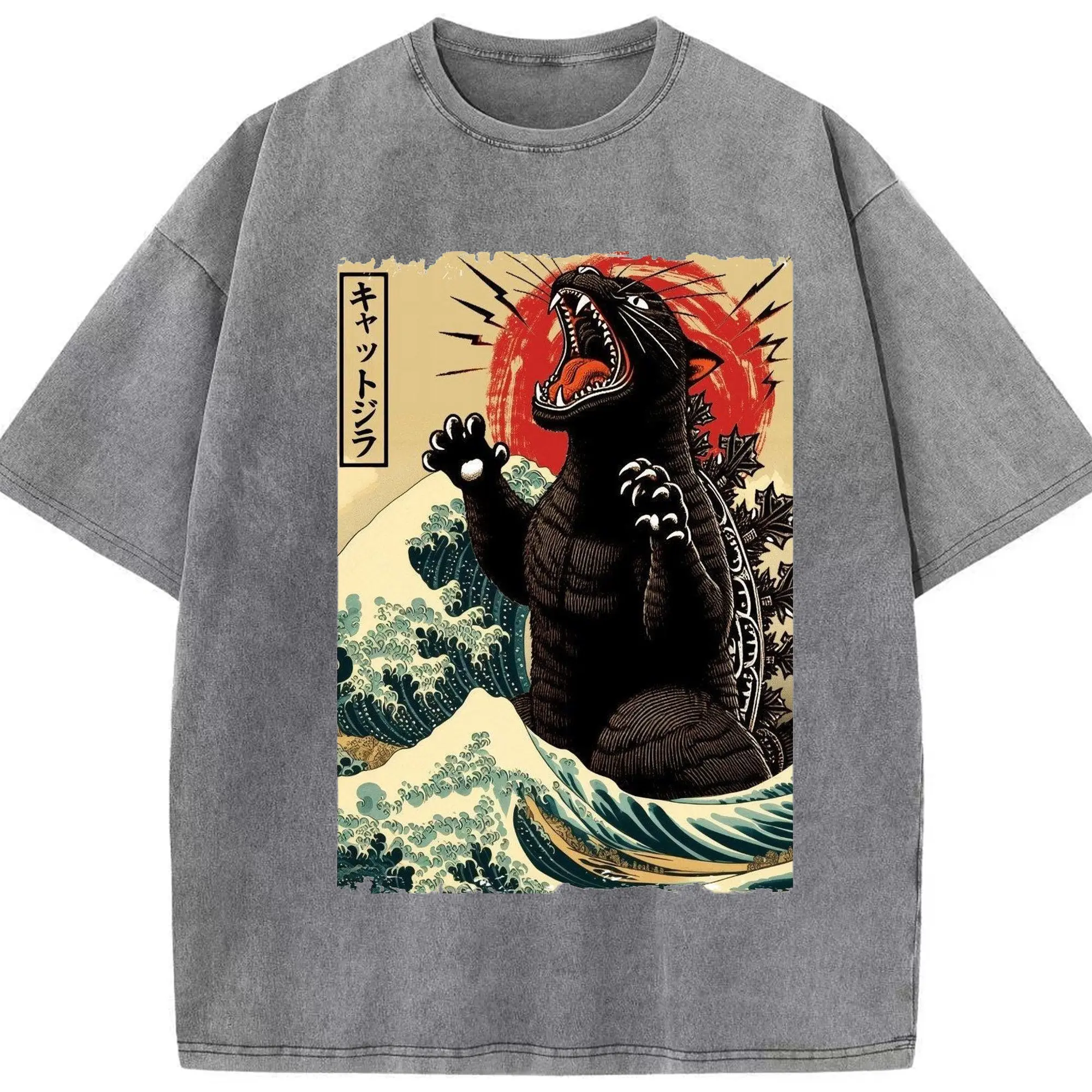 ゴジラ キャットジラ CATZILLA - 綿100% ヴィンテージ風 半袖Tシャツ ・ フロントプリント ・ 柔らか肌触り ・ 通気性 快適 ・ スポーツ カジュアル 外出用