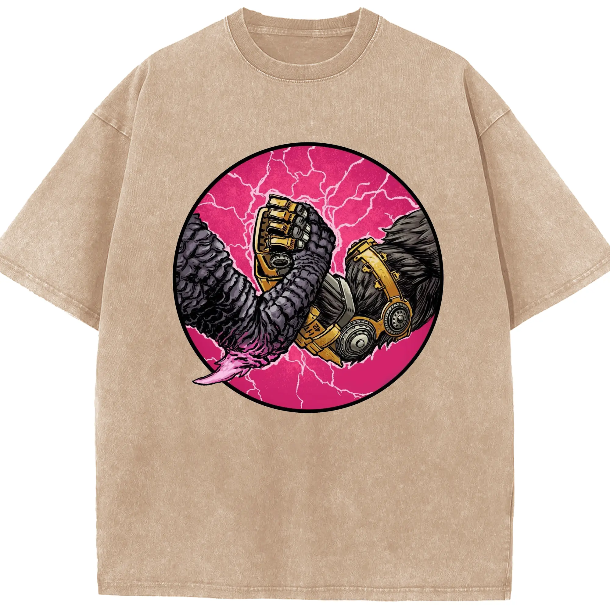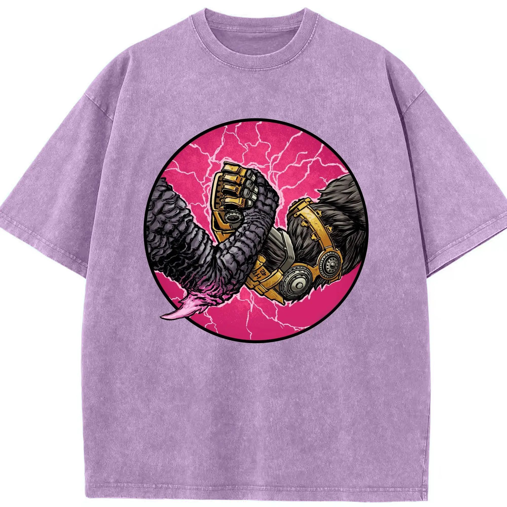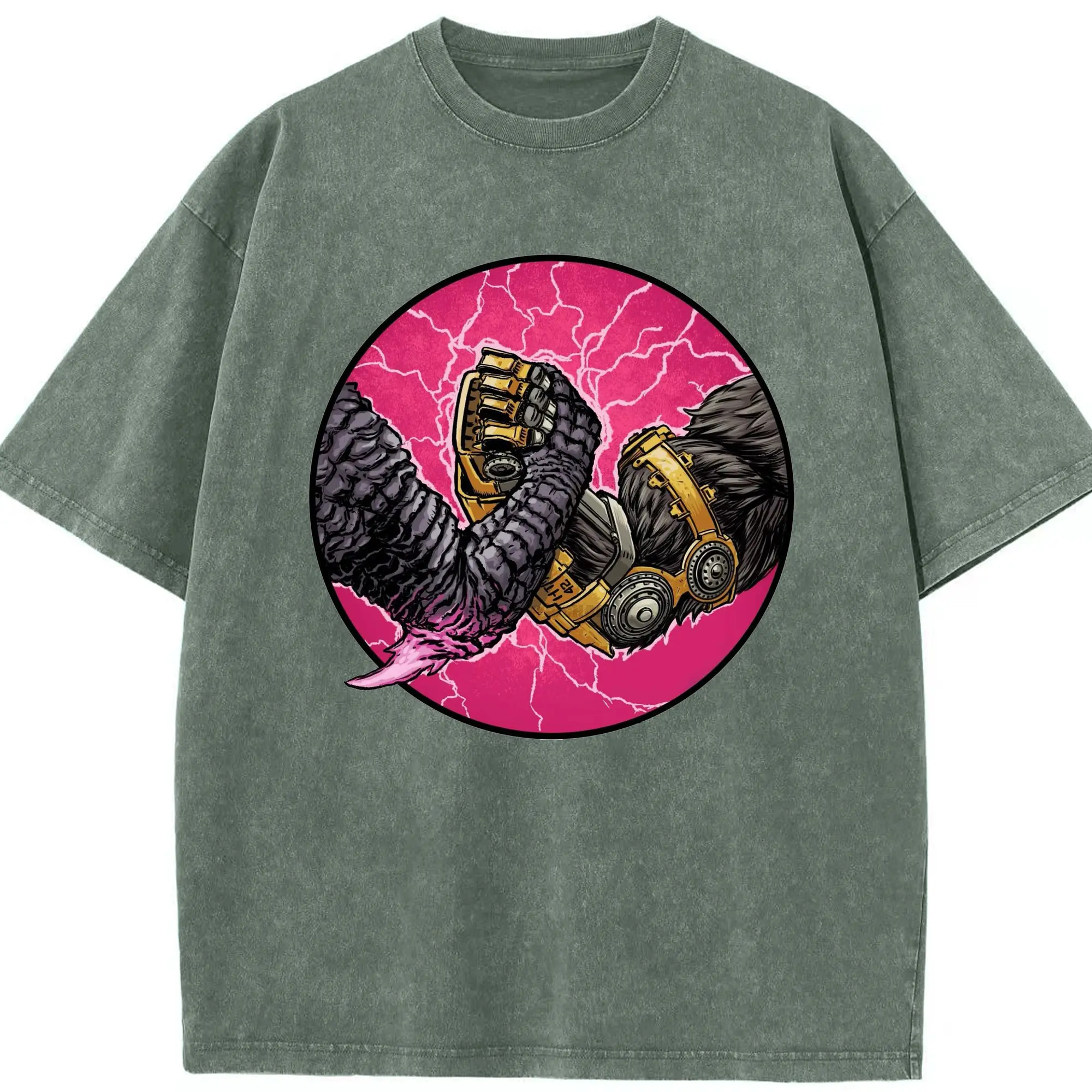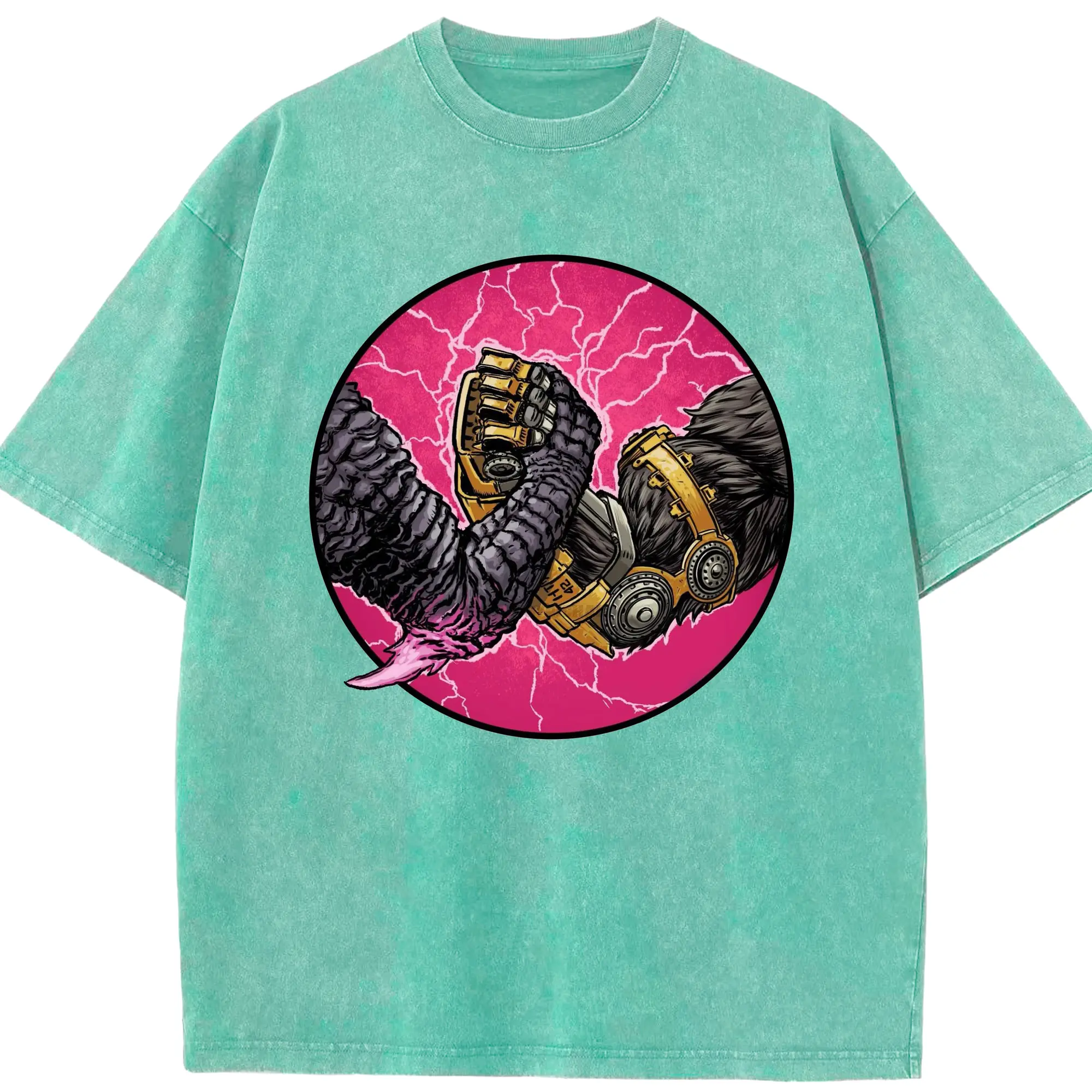 ゴジラ × コング 怪獣バトル - 綿100% ヴィンテージ風 半袖Tシャツ ・ フロントプリント ・ 柔らか肌触り ・ 通気性 快適 ・ スポーツ カジュアル 外出用