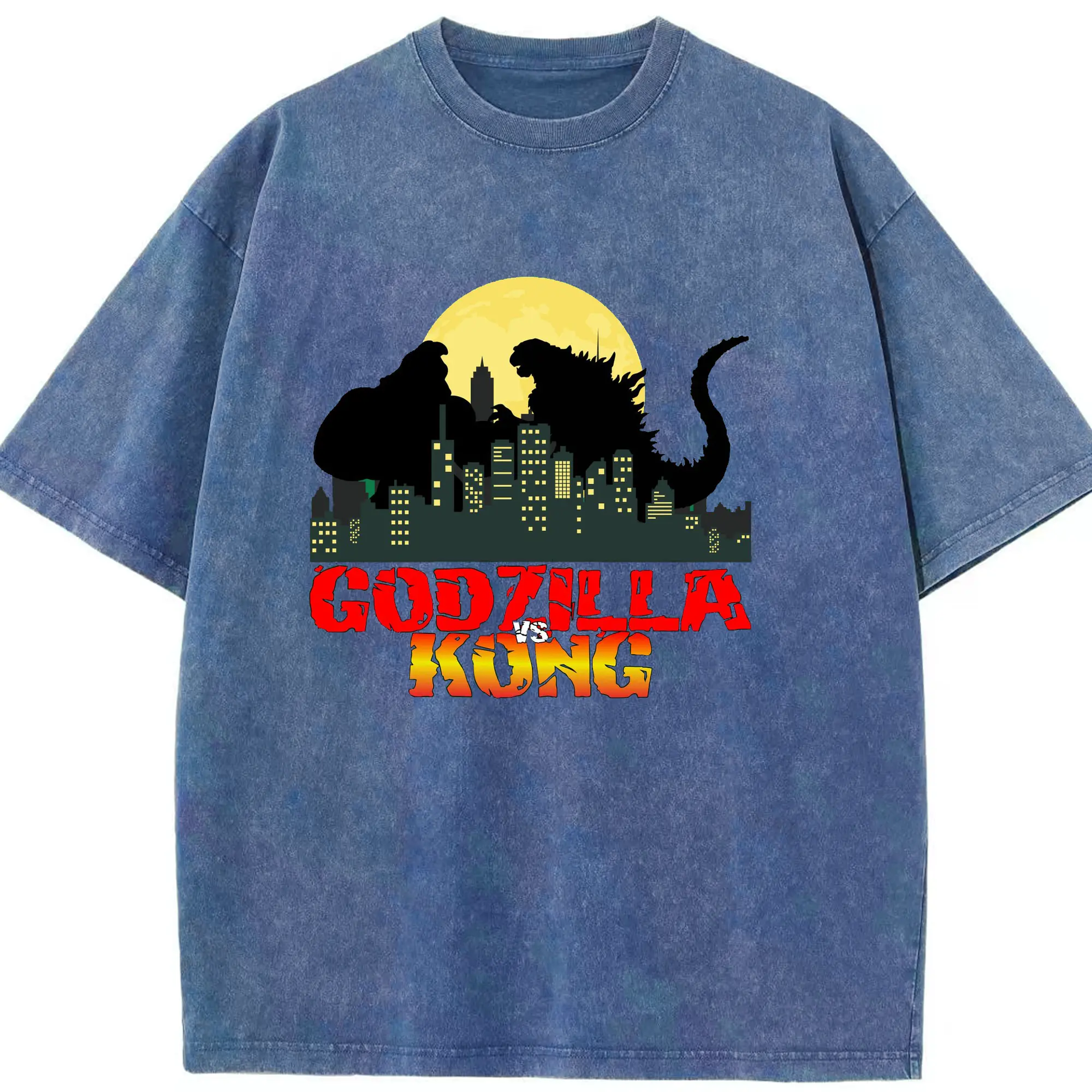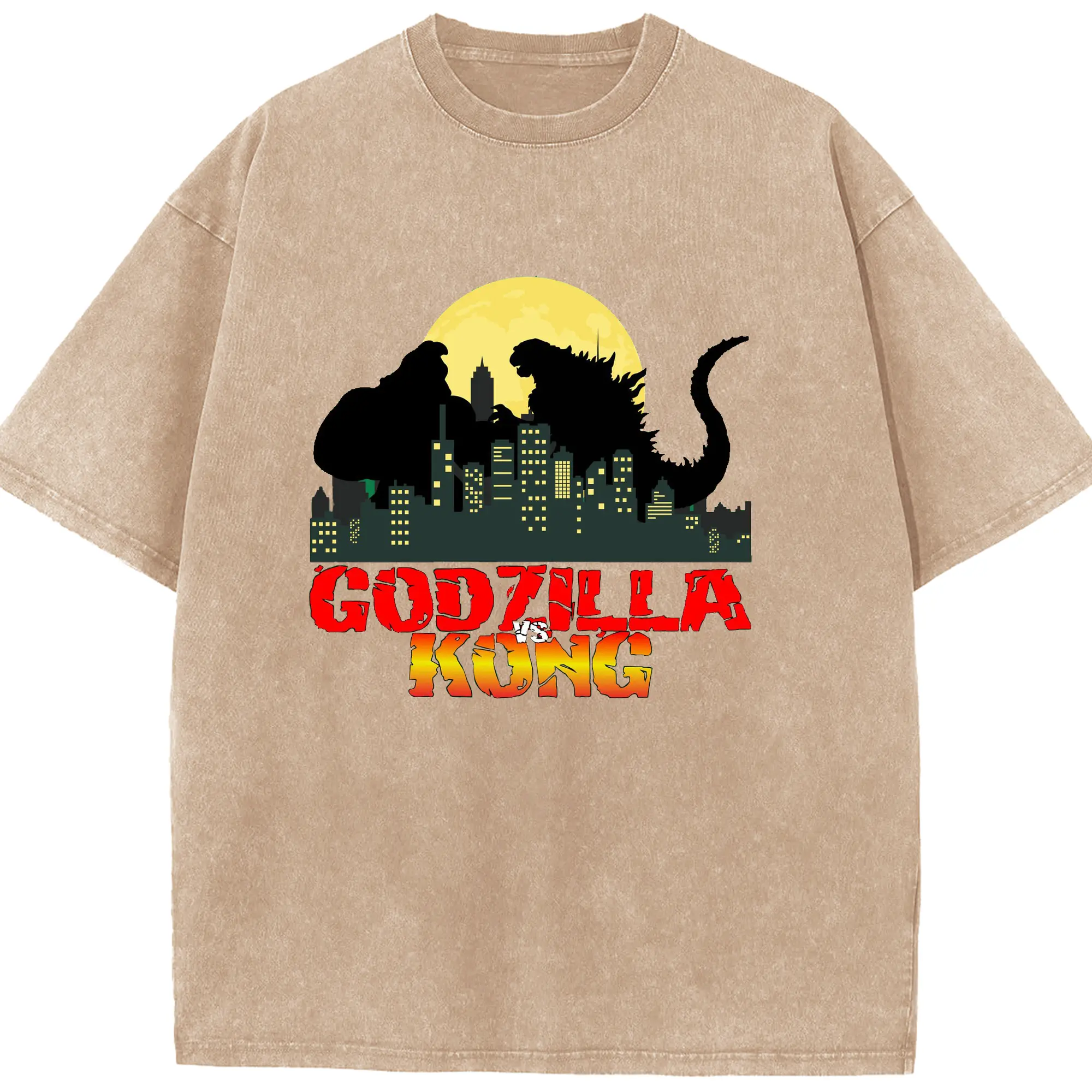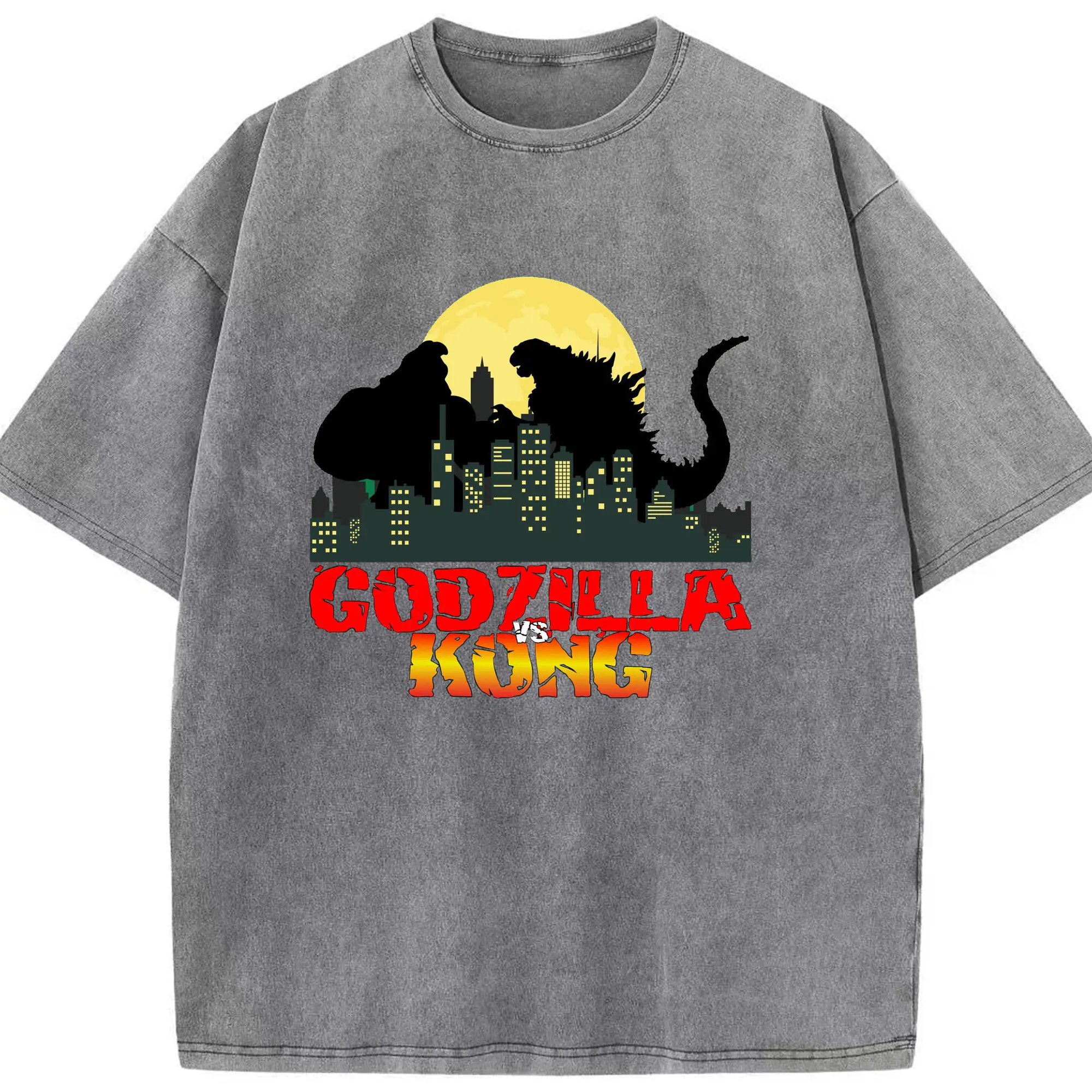 ゴジラ × コング 都市破壊 - 綿100% ヴィンテージ風 半袖Tシャツ ・ フロントプリント ・ 柔らか肌触り ・ 通気性 快適 ・ スポーツ カジュアル 外出用