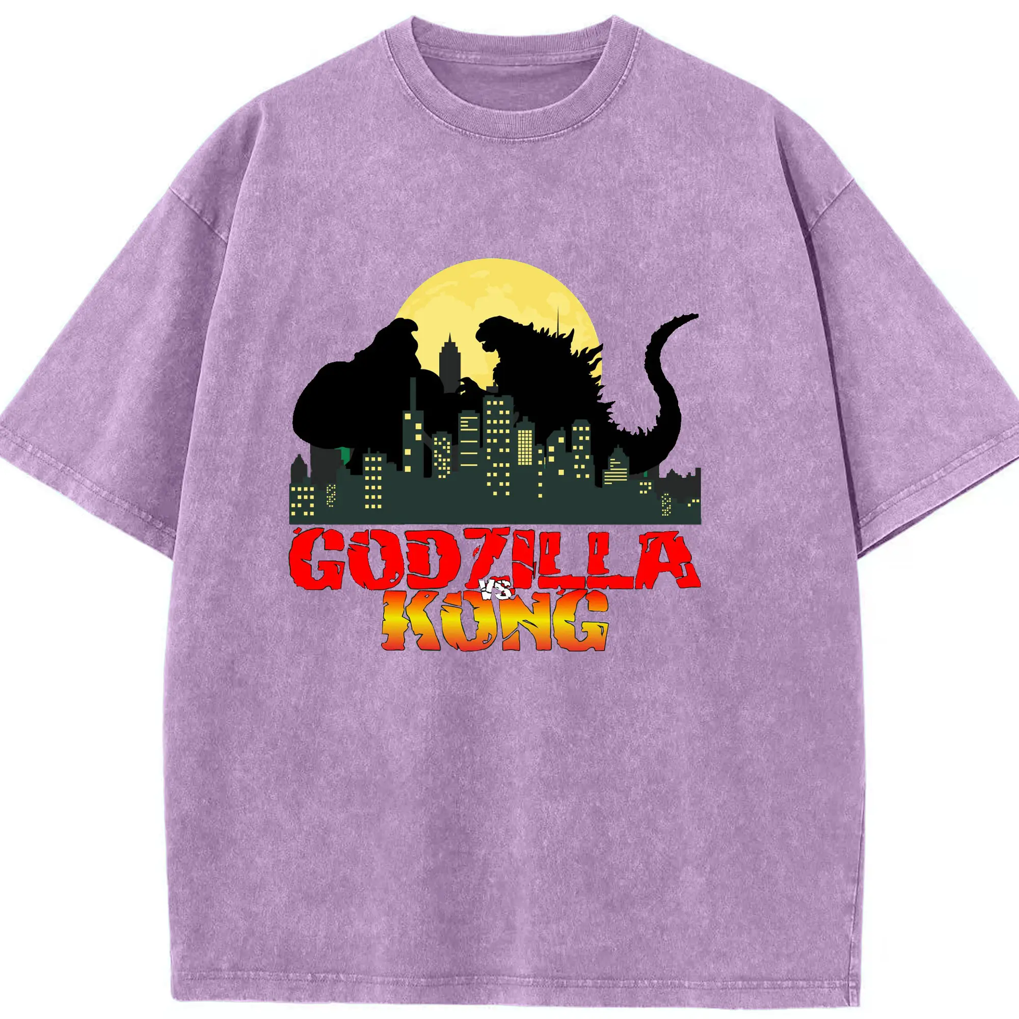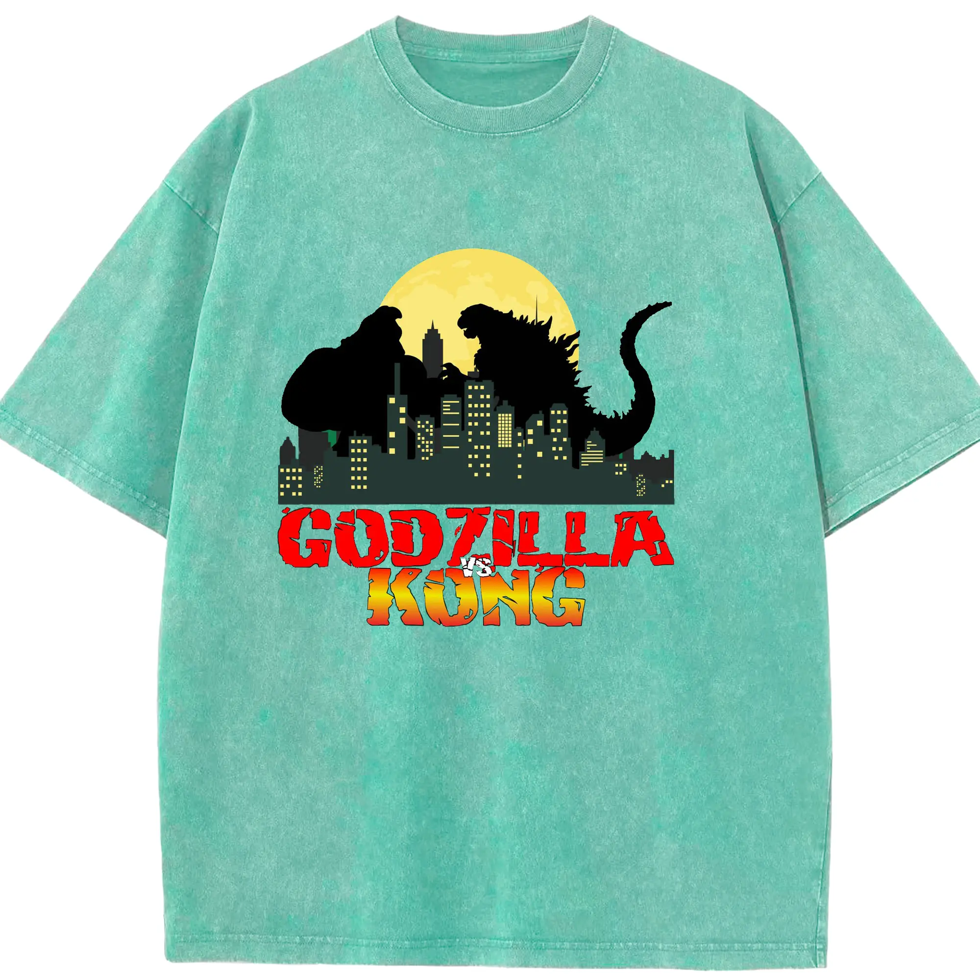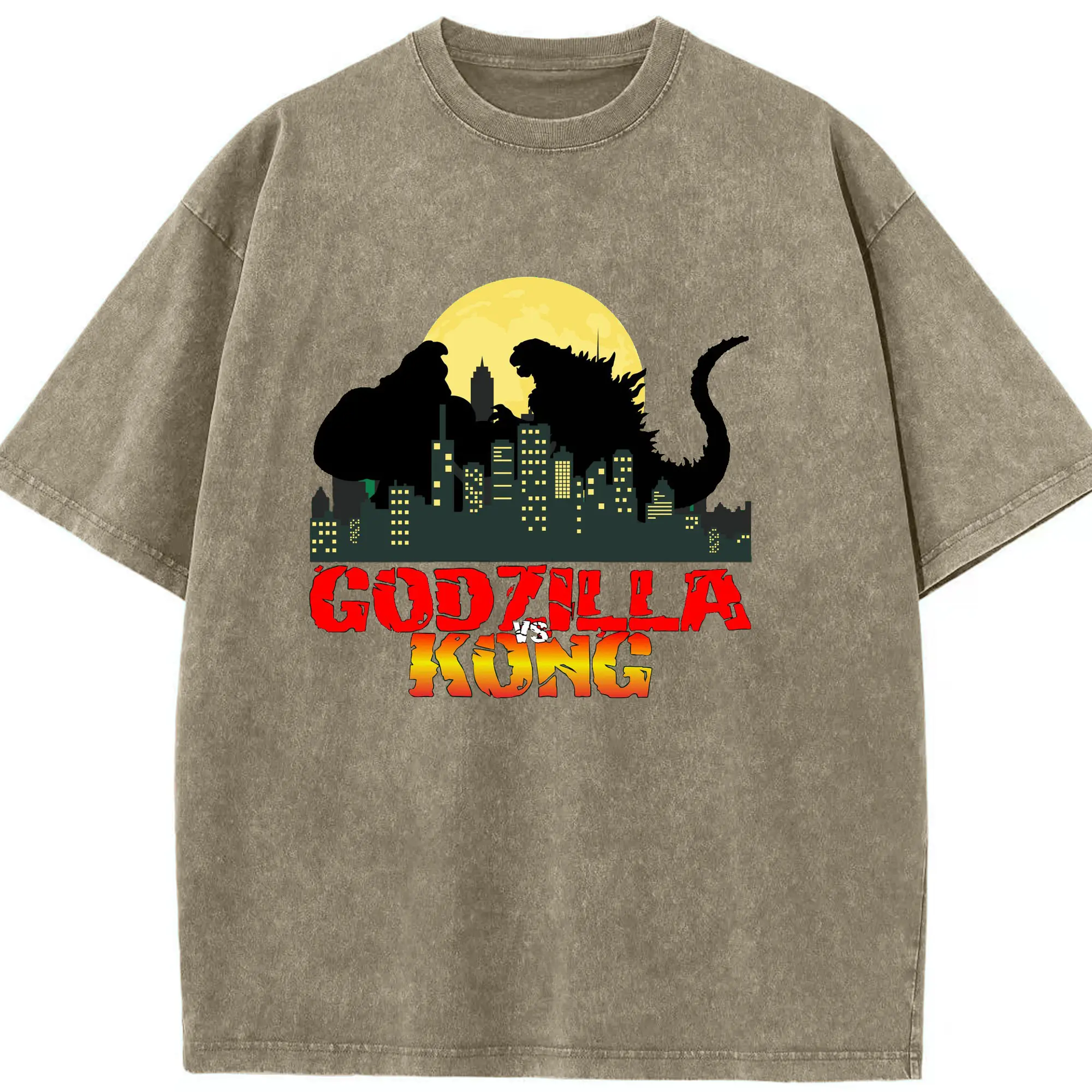 ゴジラ × コング 都市破壊 - 綿100% ヴィンテージ風 半袖Tシャツ ・ フロントプリント ・ 柔らか肌触り ・ 通気性 快適 ・ スポーツ カジュアル 外出用