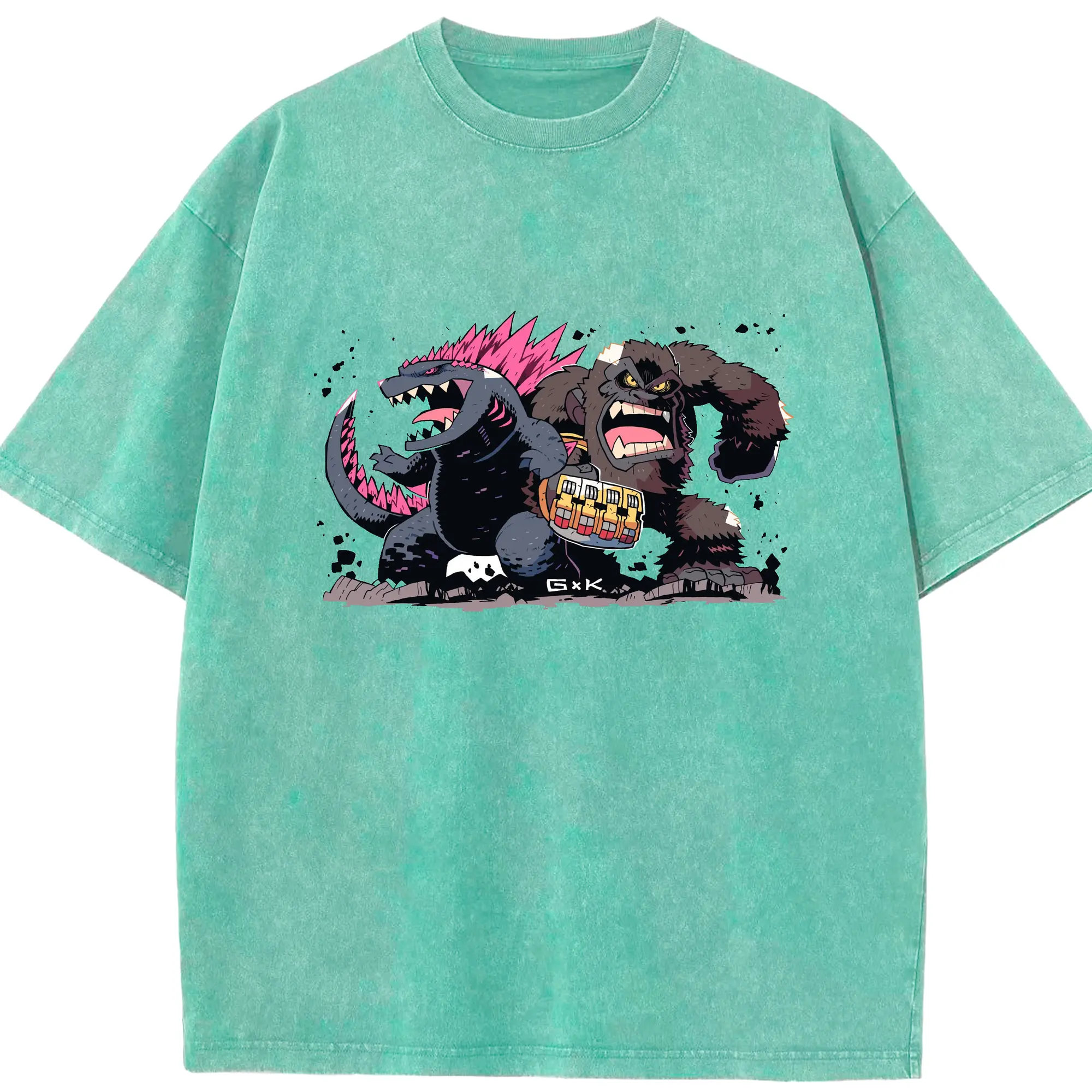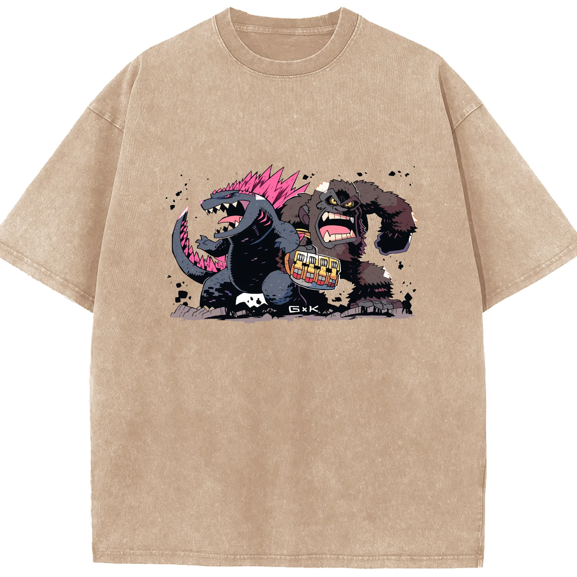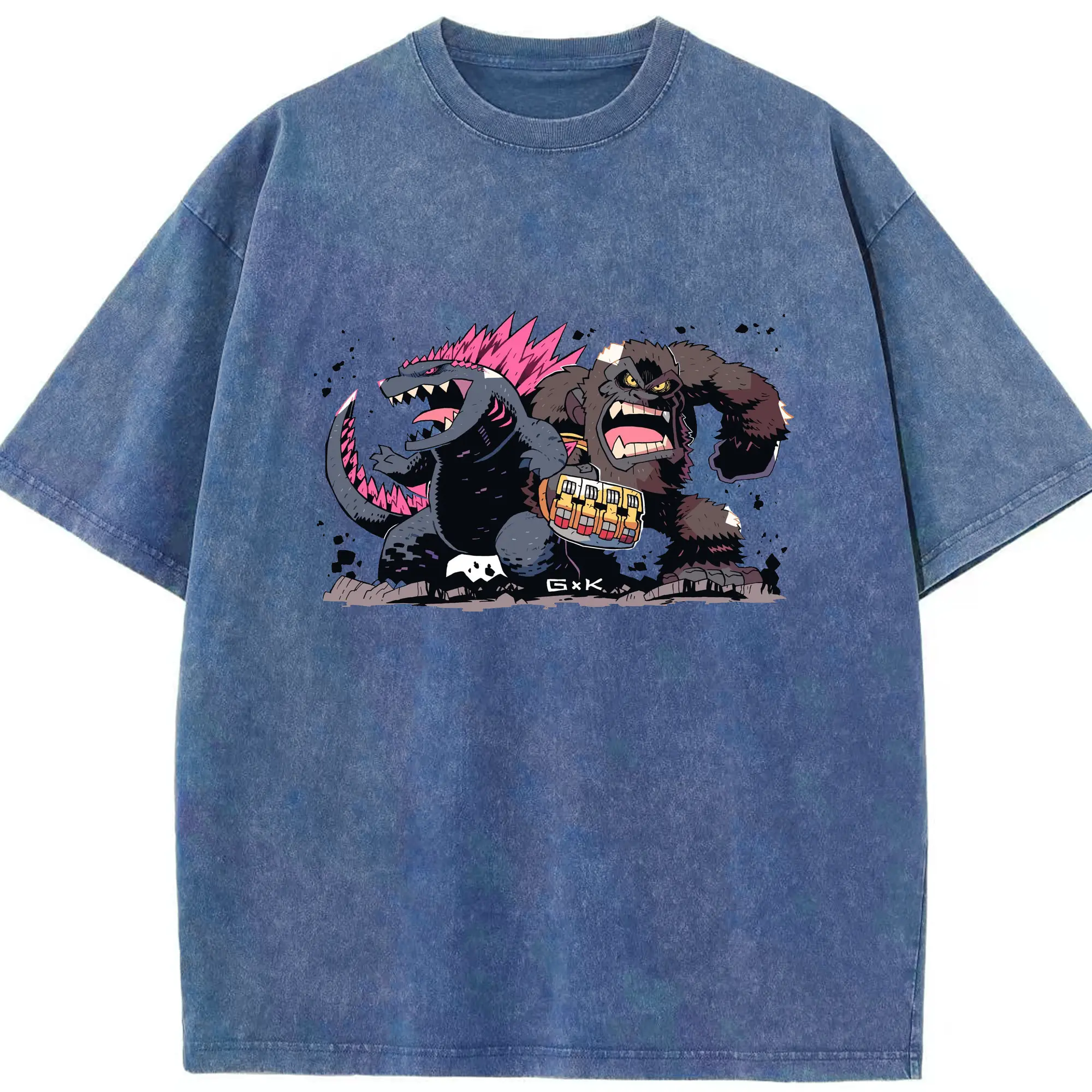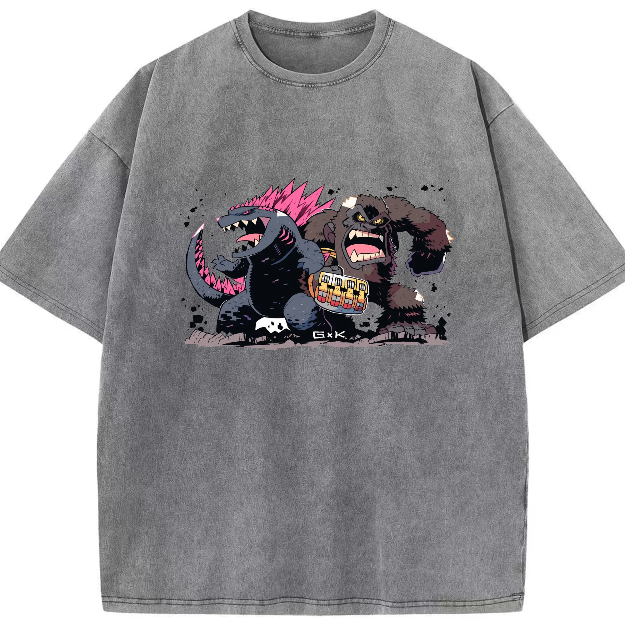 ゴジラ × コング 都市破壊 - 綿100% ヴィンテージ風 半袖Tシャツ ・ フロントプリント ・ 柔らか肌触り ・ 通気性 快適 ・ スポーツ カジュアル 外出用