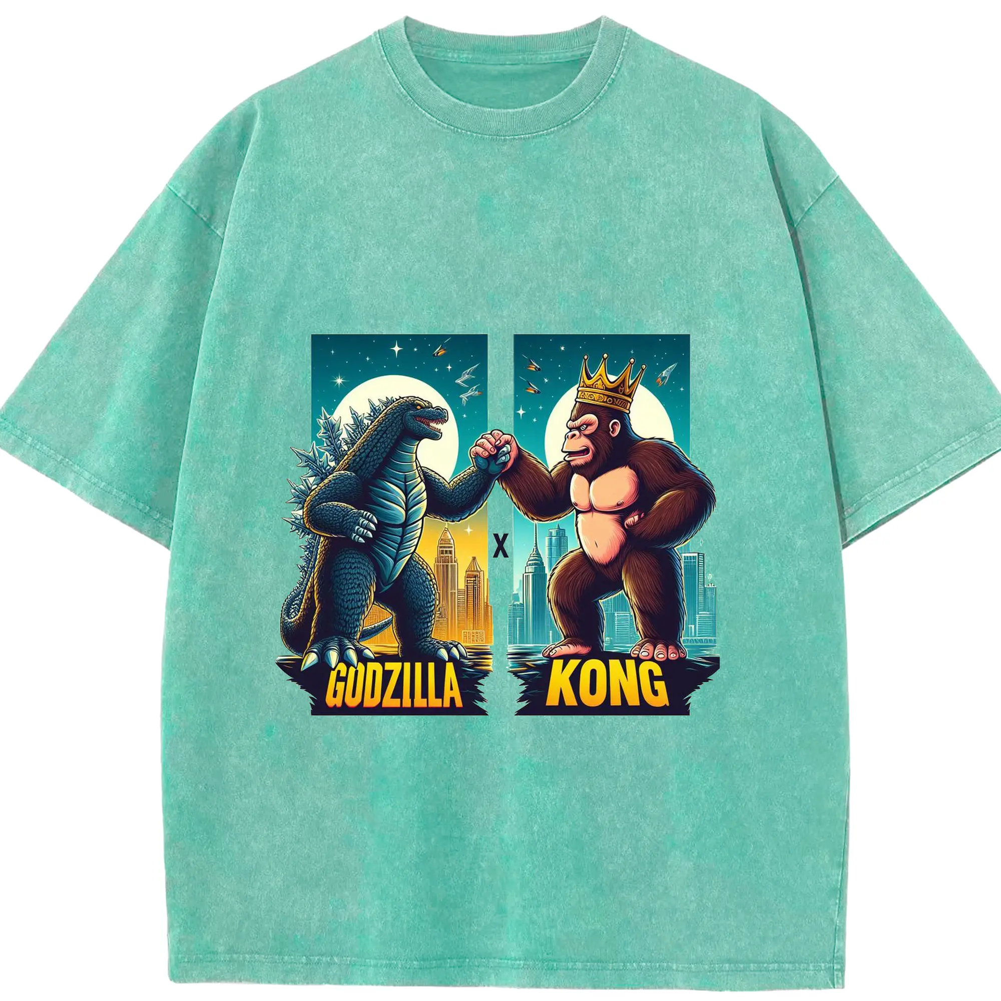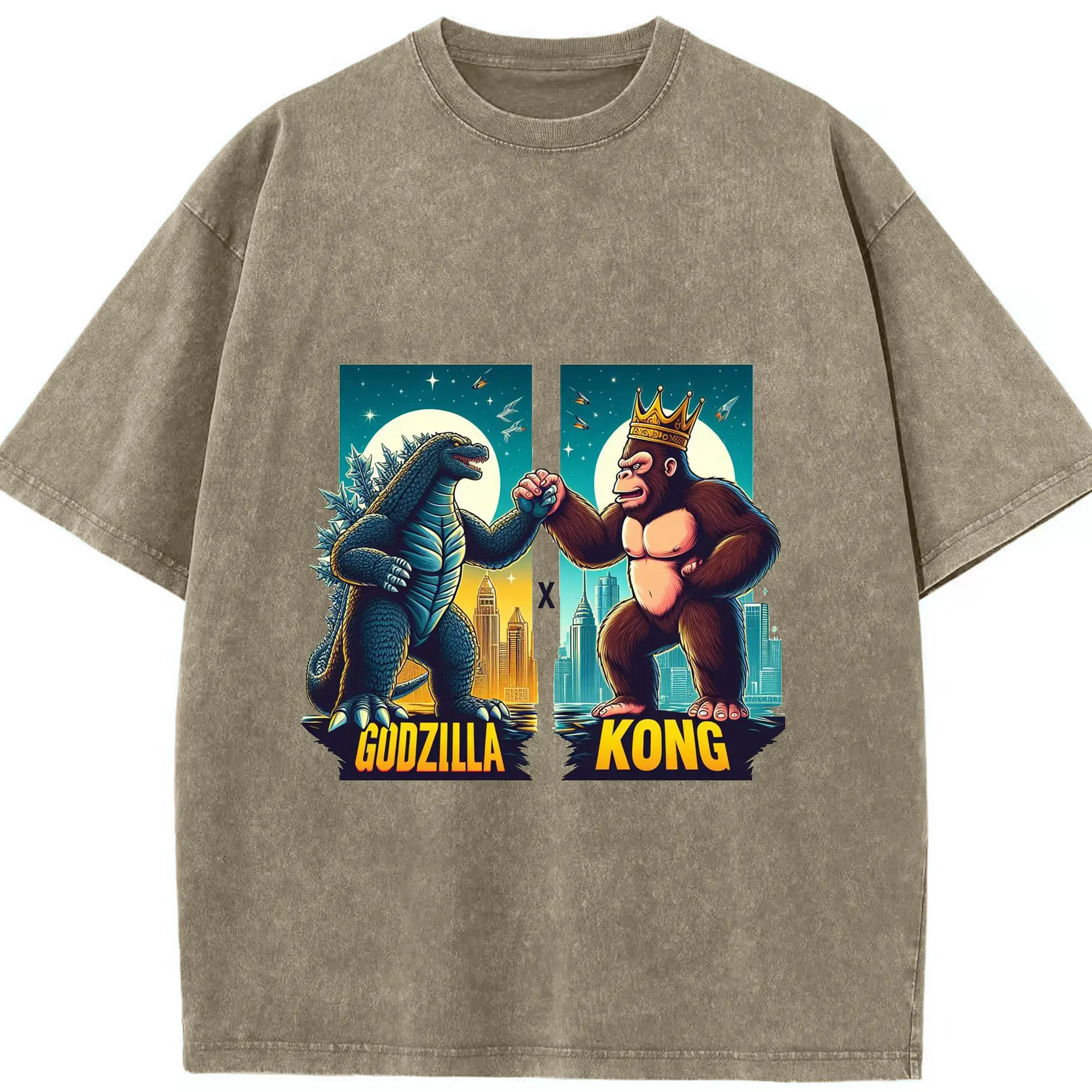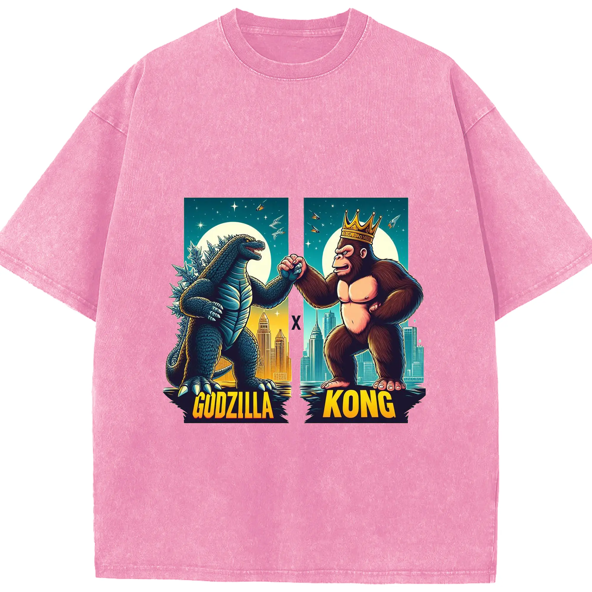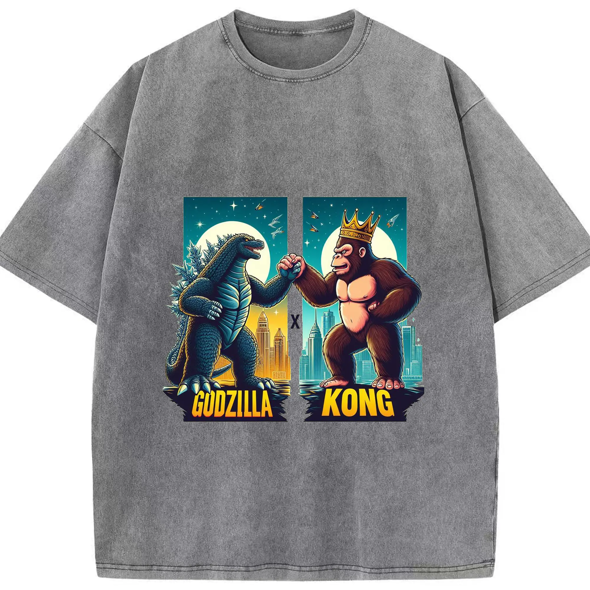 ゴジラ × コング - 綿100% ヴィンテージ風 半袖Tシャツ ・ フロントプリント ・ 柔らか肌触り ・ 通気性 快適 ・ スポーツ カジュアル 外出用