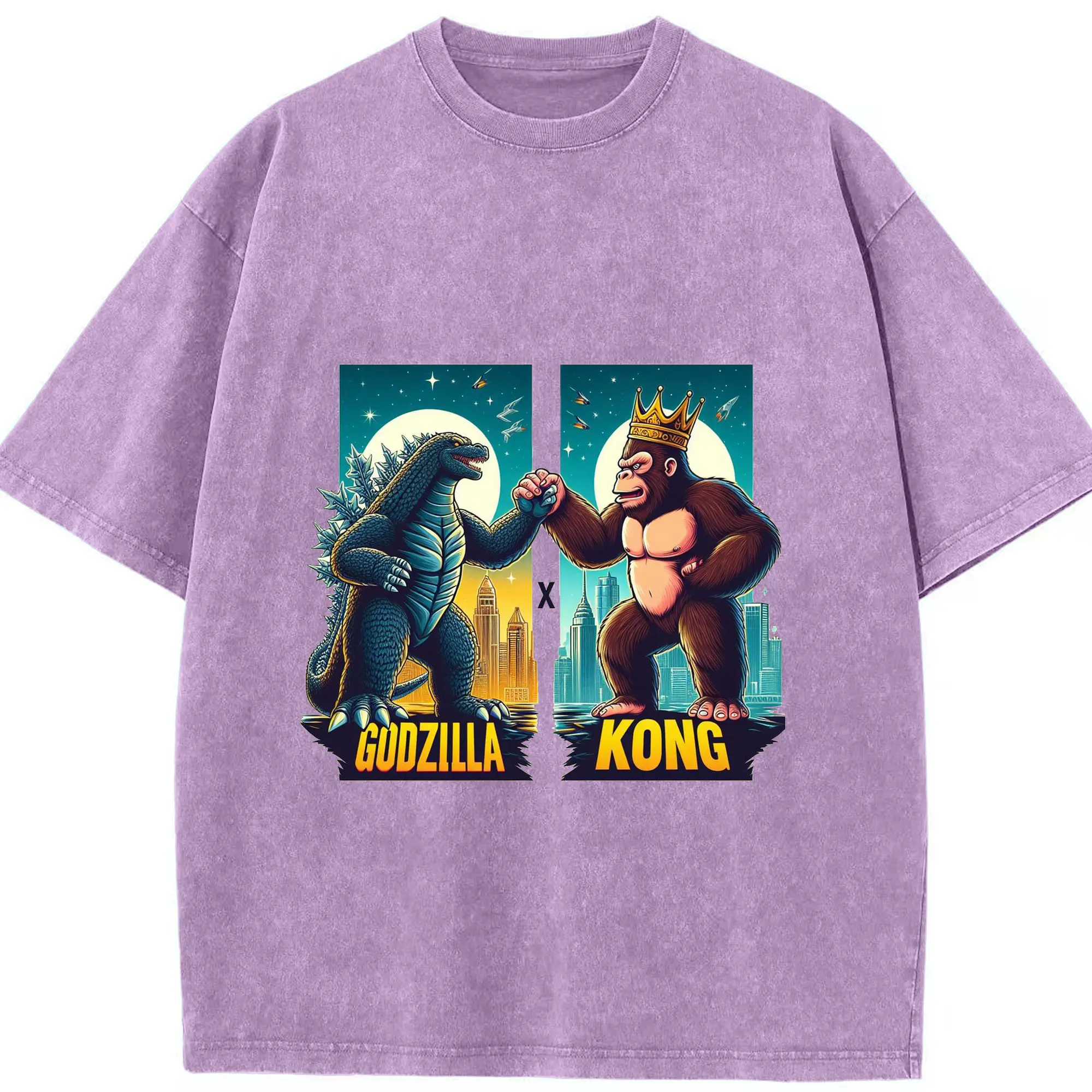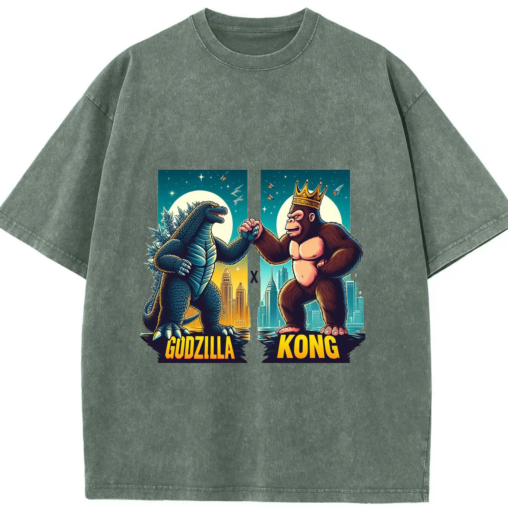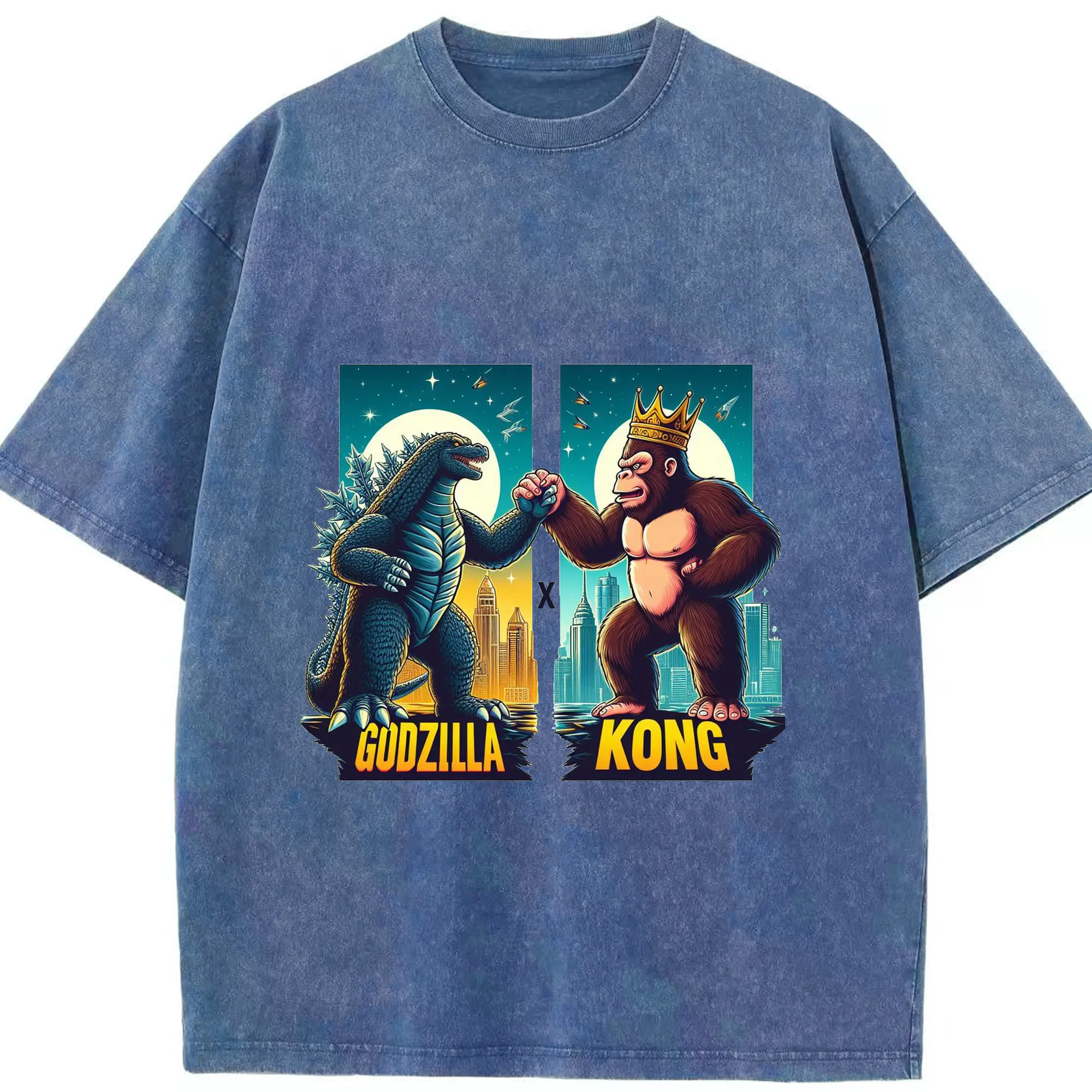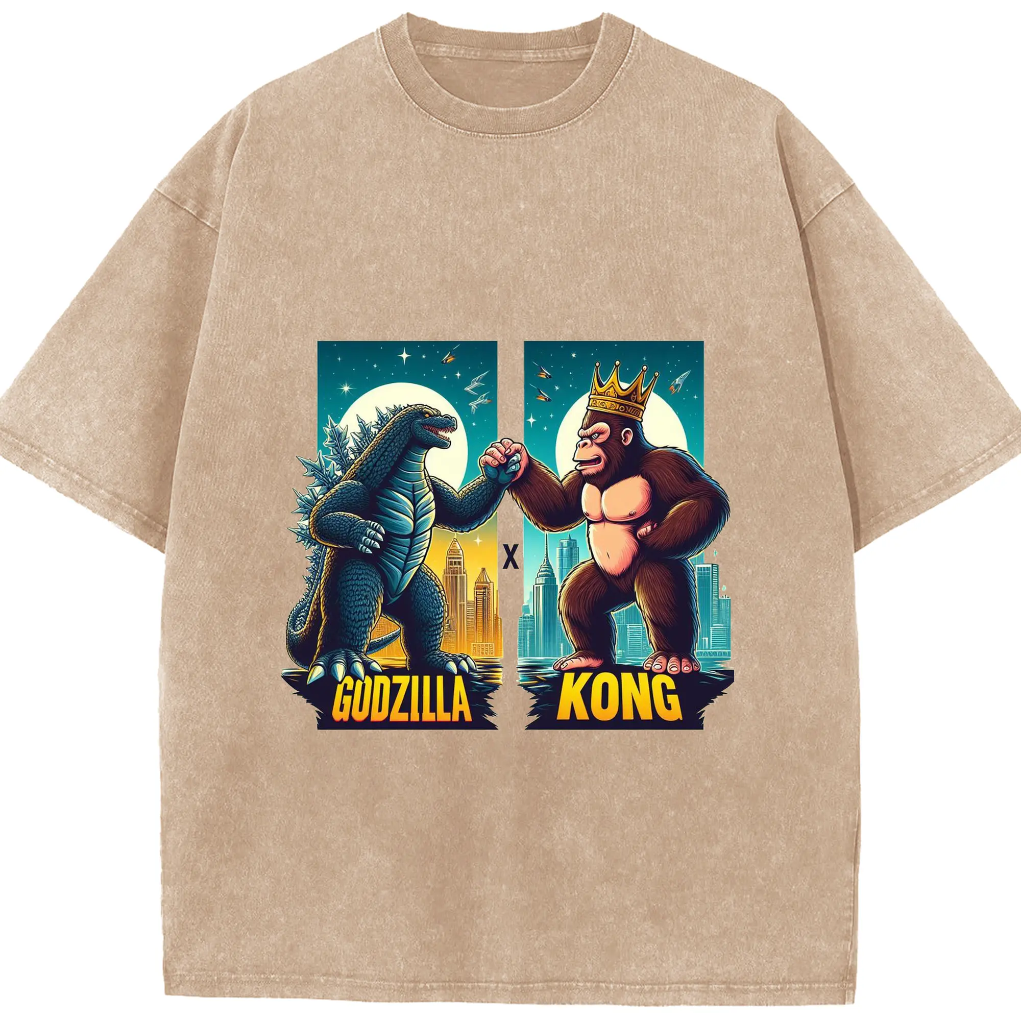 ゴジラ × コング - 綿100% ヴィンテージ風 半袖Tシャツ ・ フロントプリント ・ 柔らか肌触り ・ 通気性 快適 ・ スポーツ カジュアル 外出用