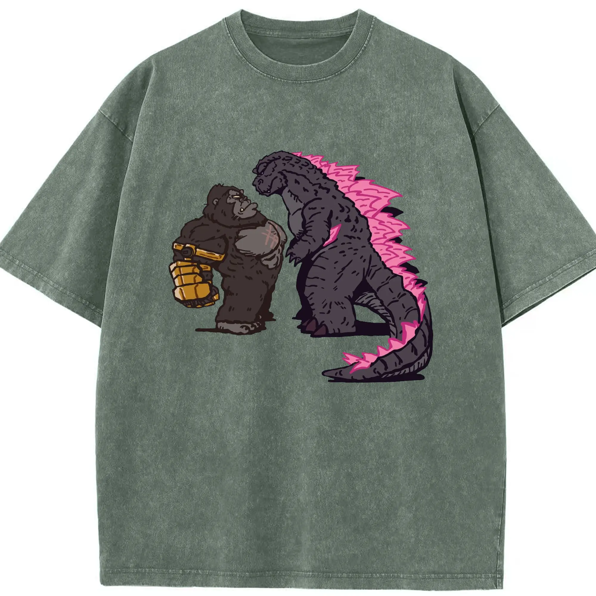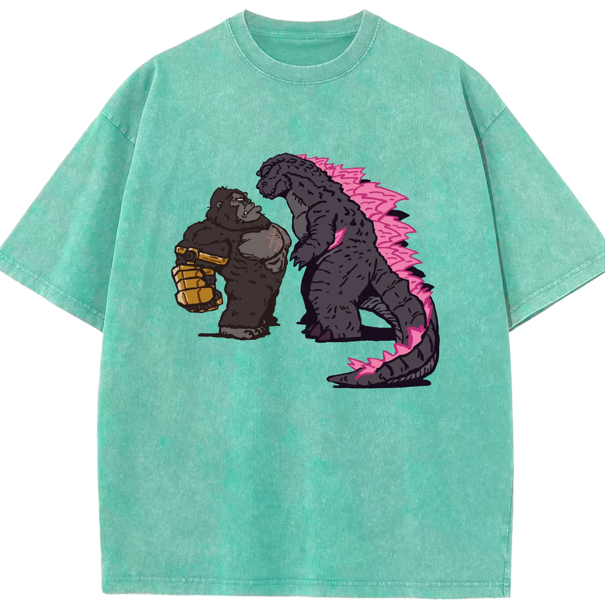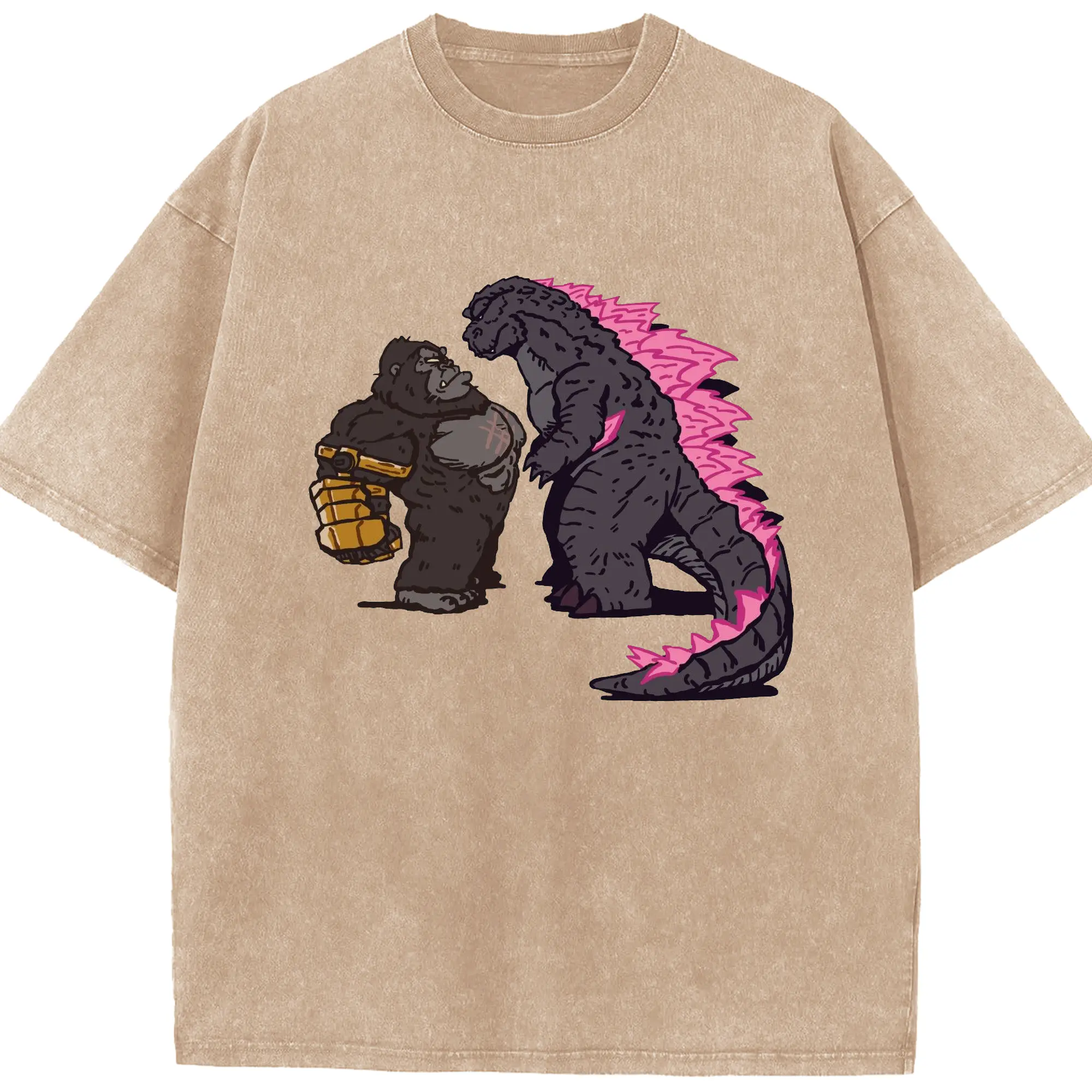 ゴジラ × コング - 綿100% ヴィンテージ風 半袖Tシャツ ・ フロントプリント ・ 柔らか肌触り ・ 通気性 快適 ・ スポーツ カジュアル 外出用