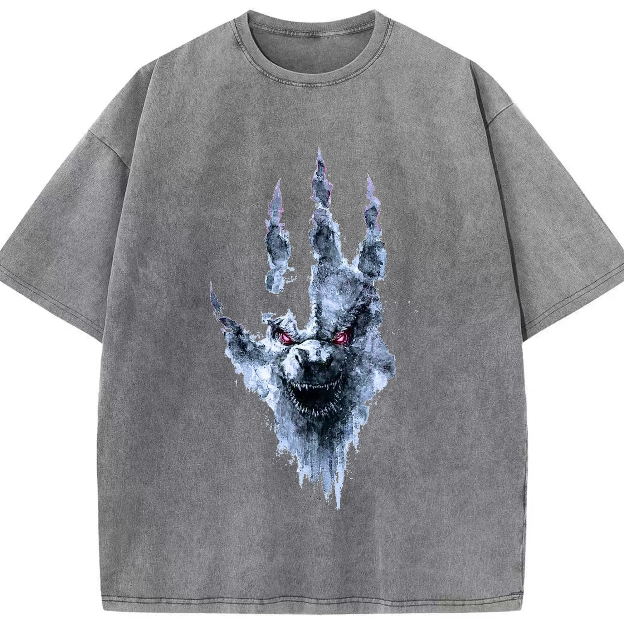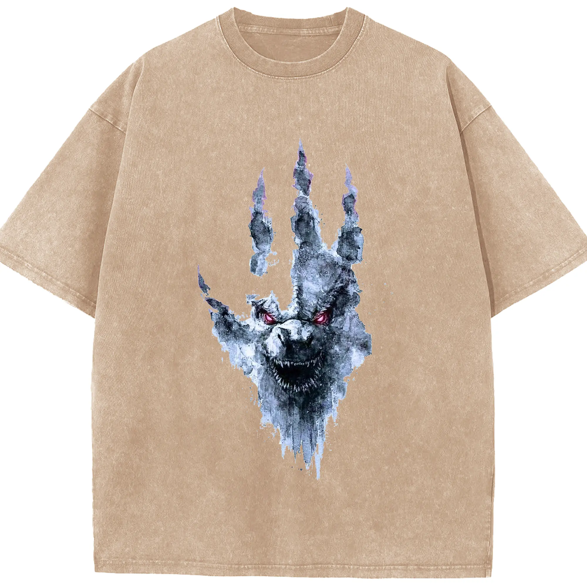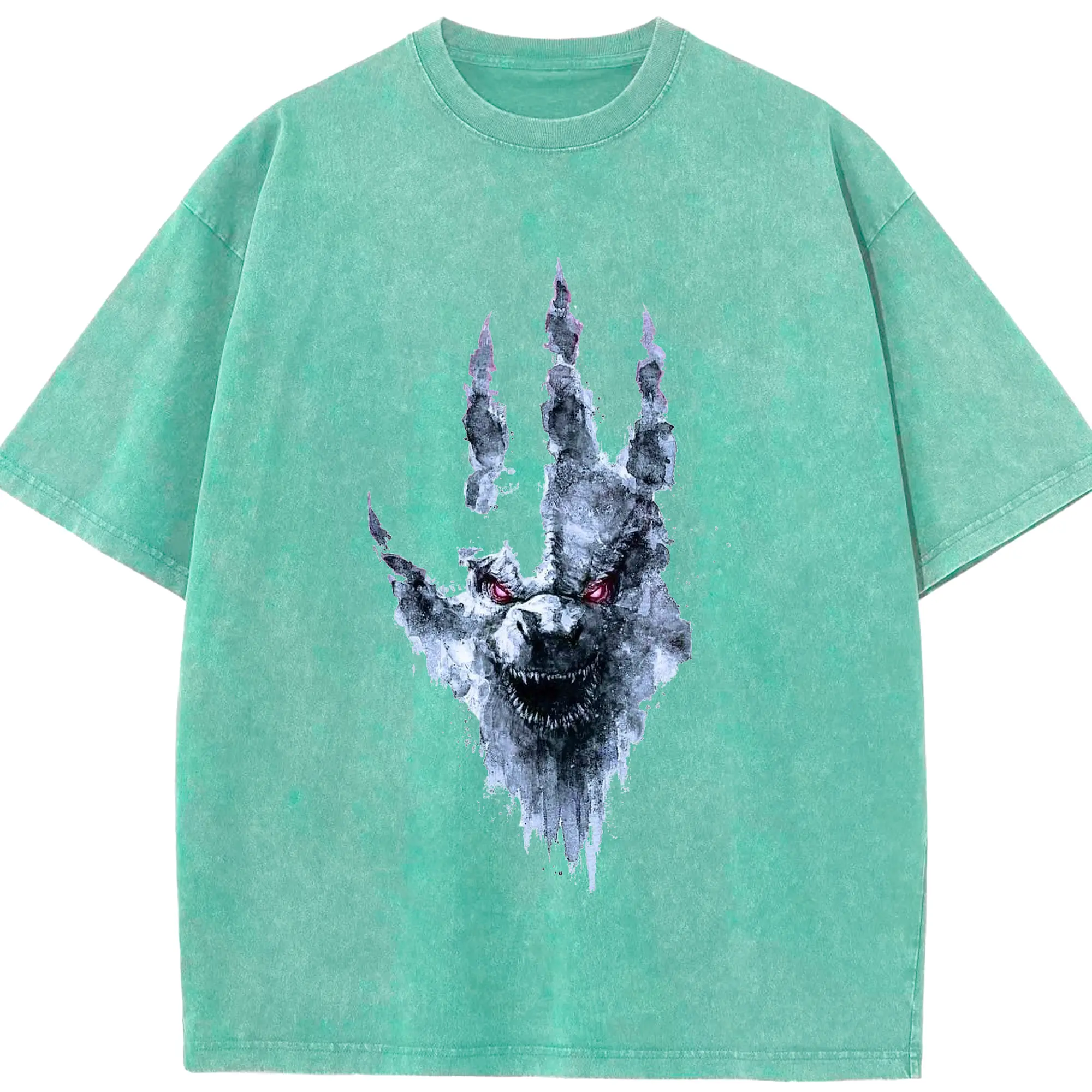 ゴジラ 手のひらアート - 綿100% ヴィンテージ風 半袖Tシャツ ・ フロントプリント ・ 柔らか肌触り ・ 通気性 快適 ・ スポーツ カジュアル 外出用