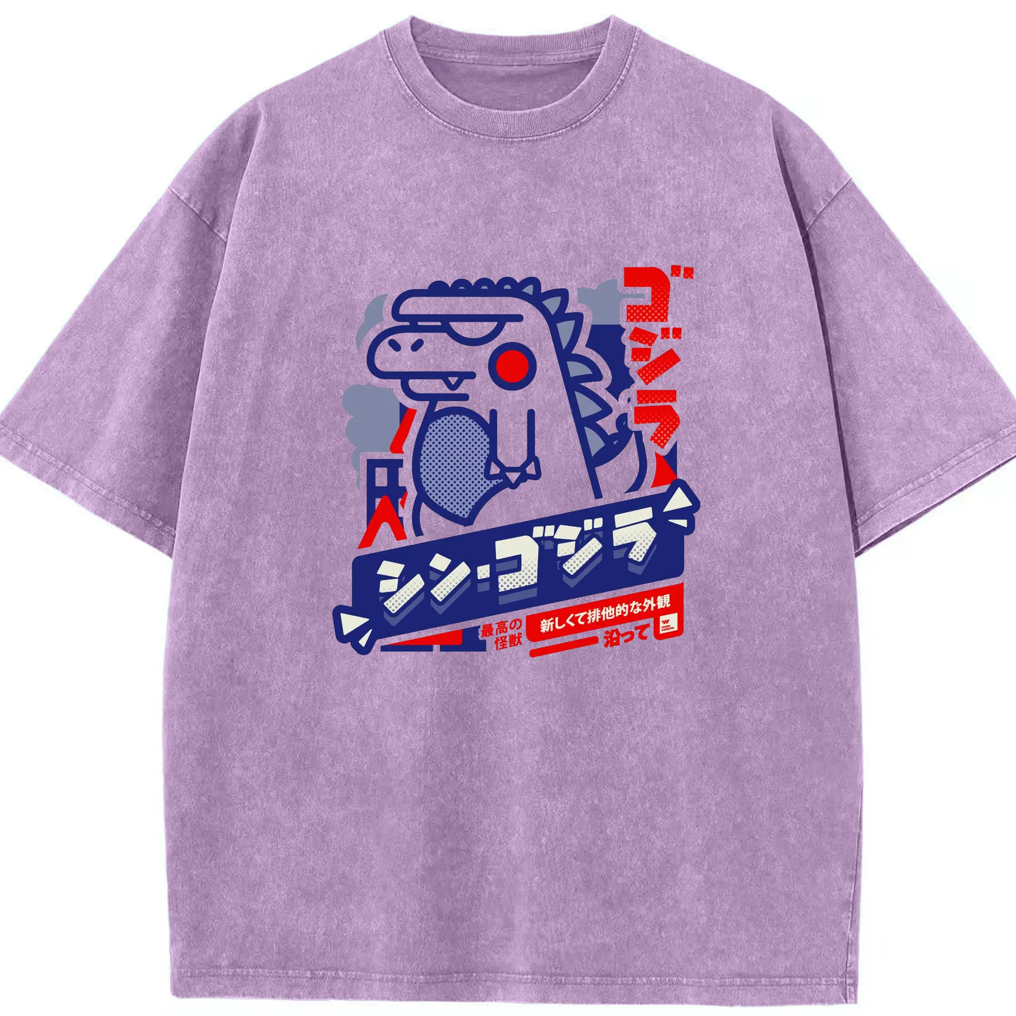 ゴジラの食事タイム - 綿100% ヴィンテージ風 半袖Tシャツ ・ フロントプリント ・ 柔らか肌触り ・ 通気性 快適 ・ スポーツ カジュアル 外出用