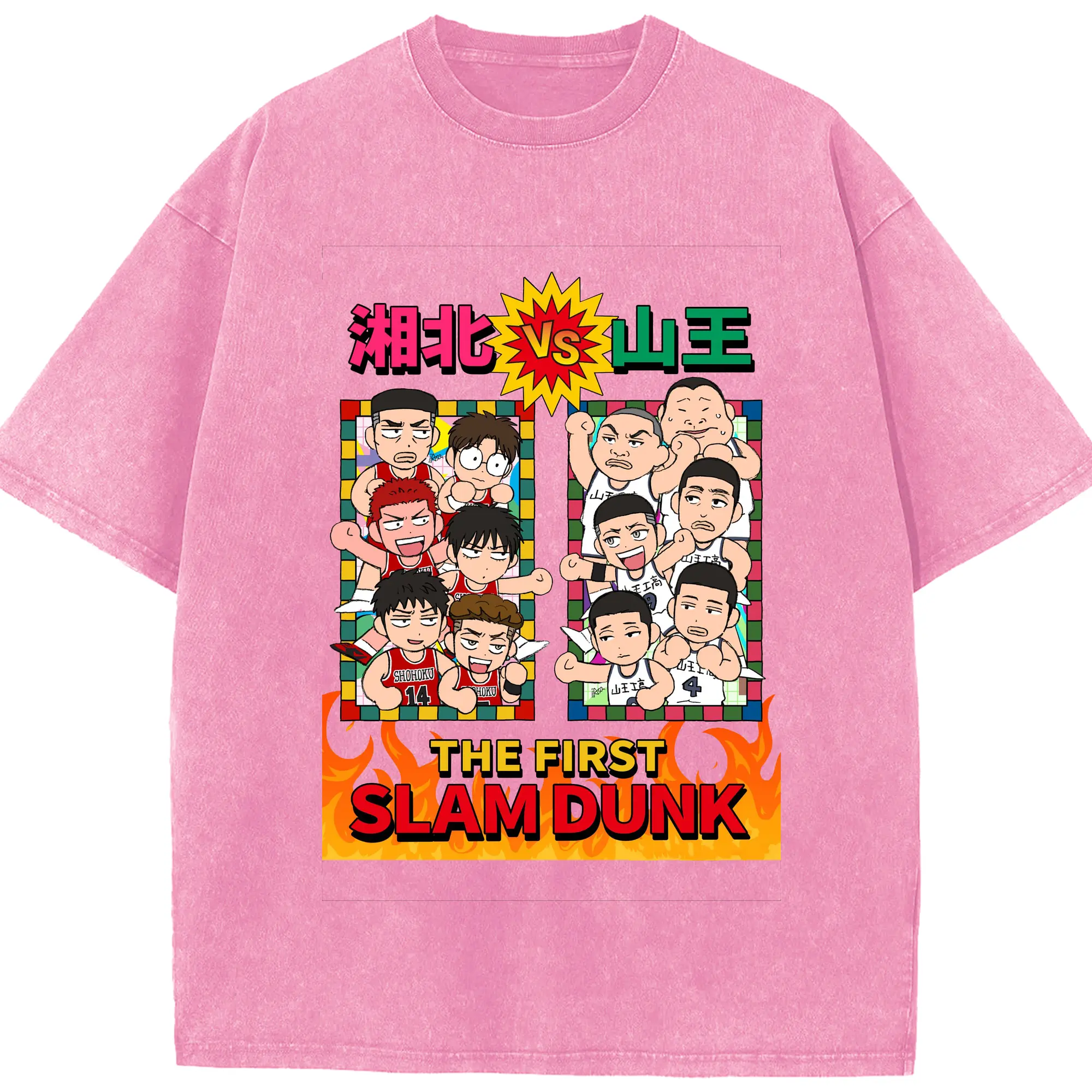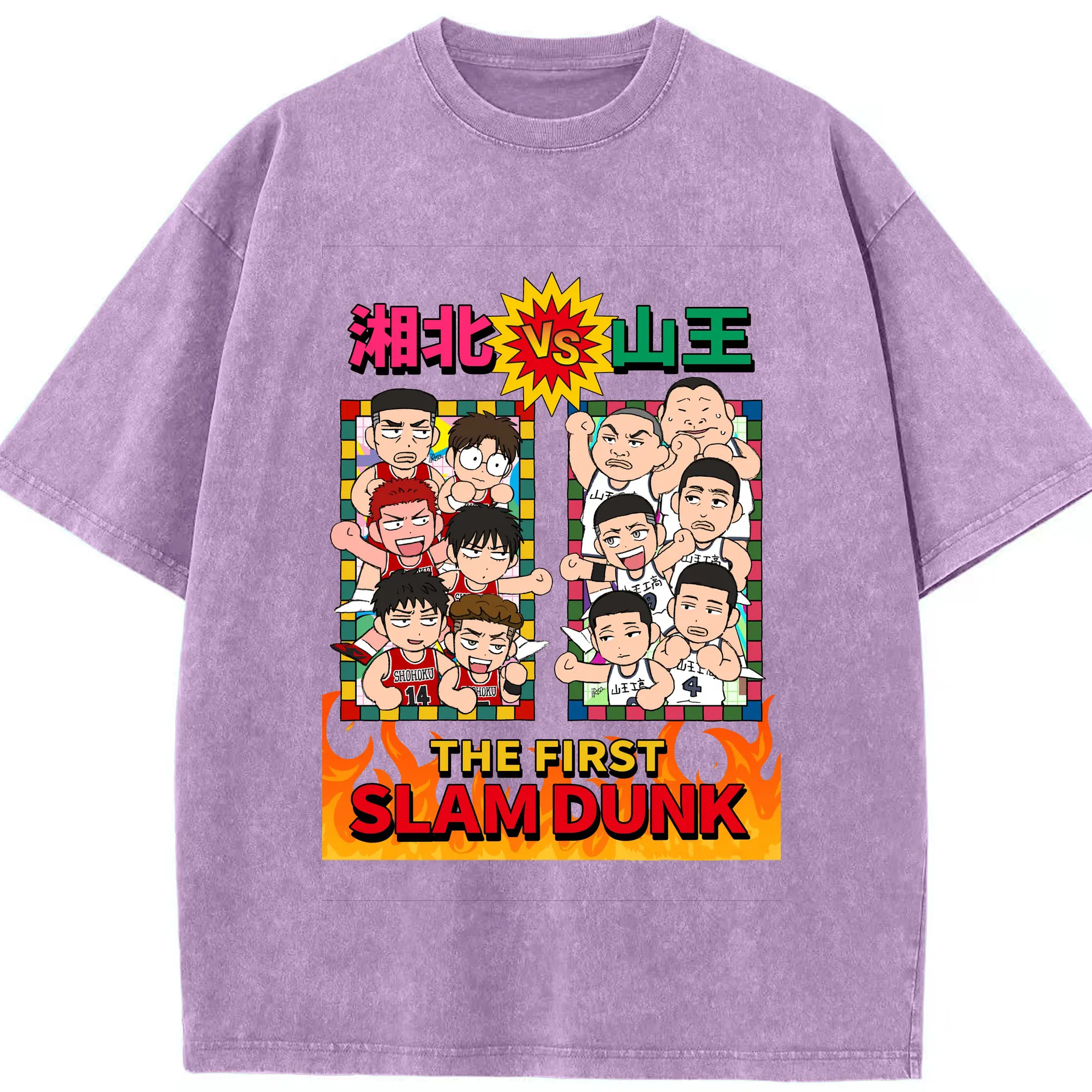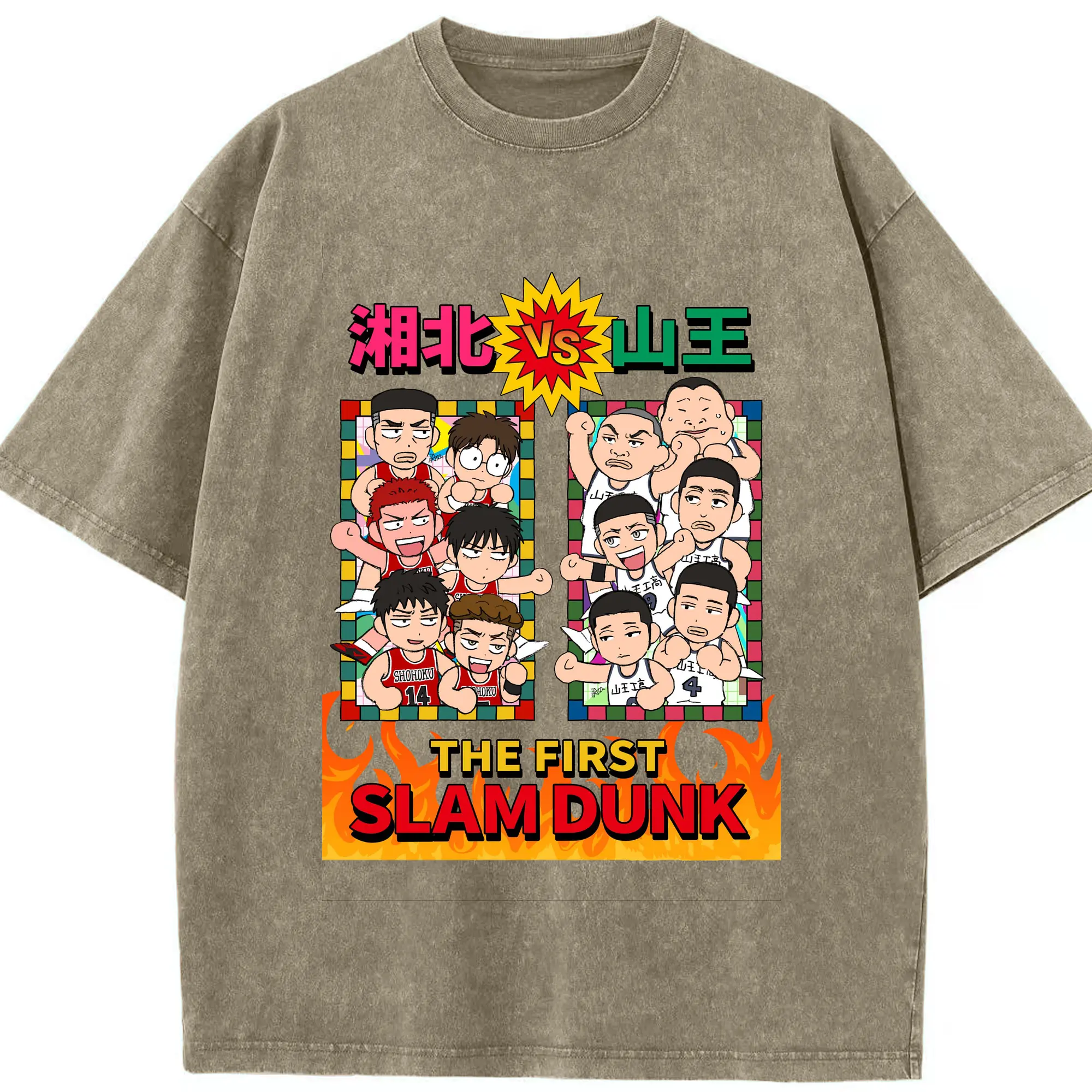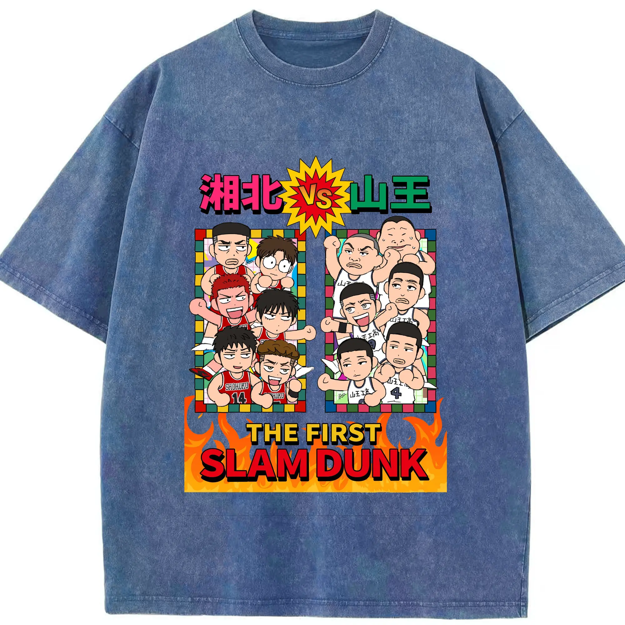 スラムダンク 全国大会湘北VS山王 デフォルメ - 綿100% ヴィンテージ風 半袖Tシャツ ・ フロントプリント ・ 柔らか肌触り ・ 通気性 快適 ・ スポーツ カジュアル 外出用