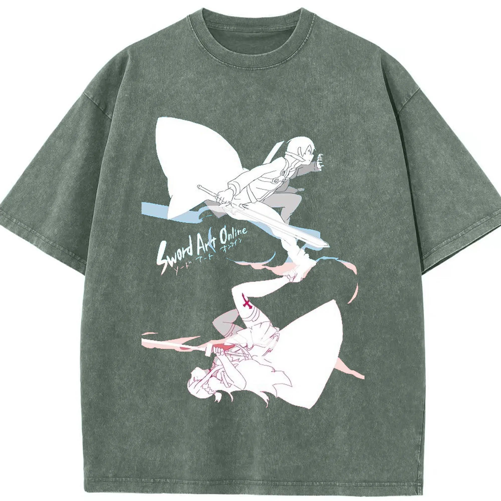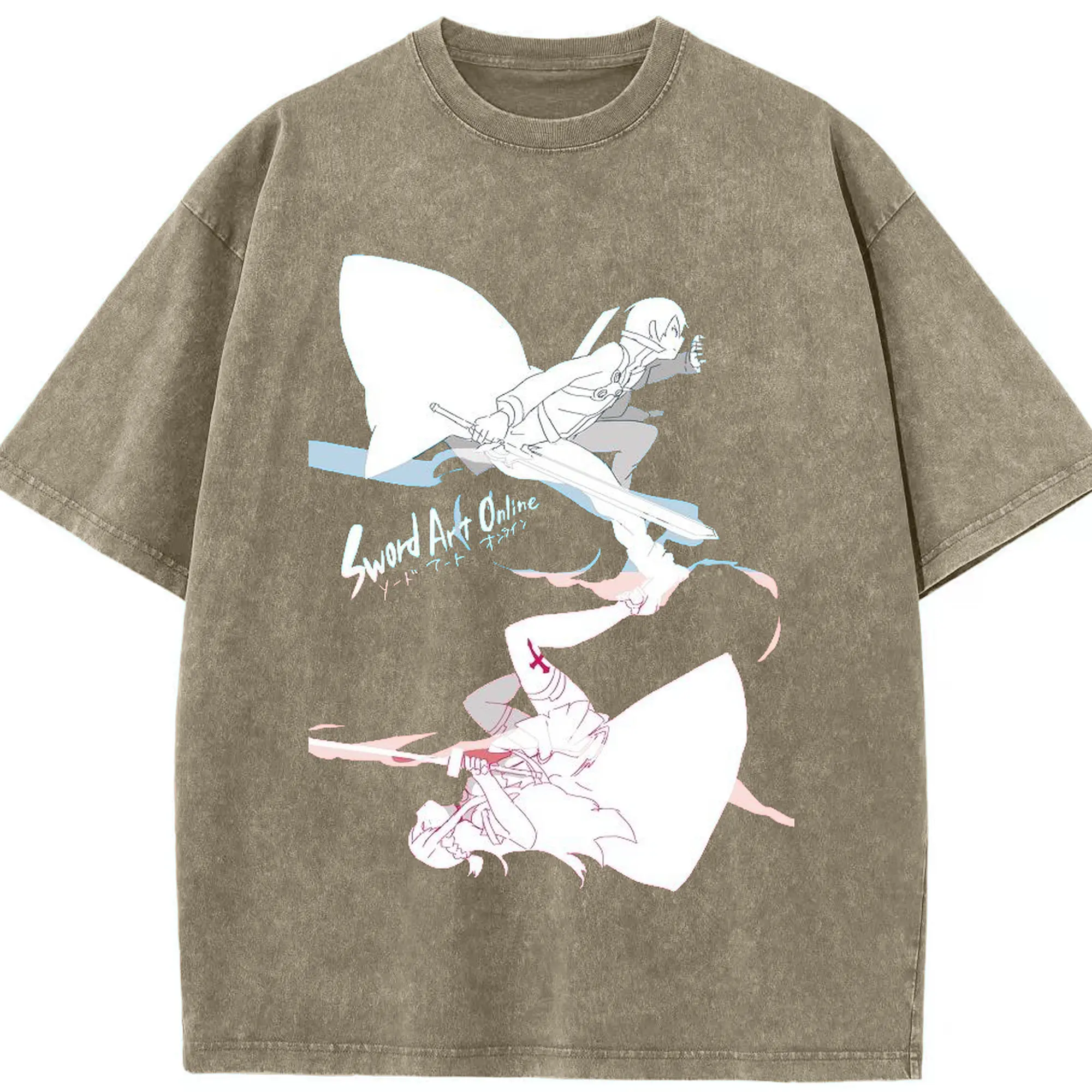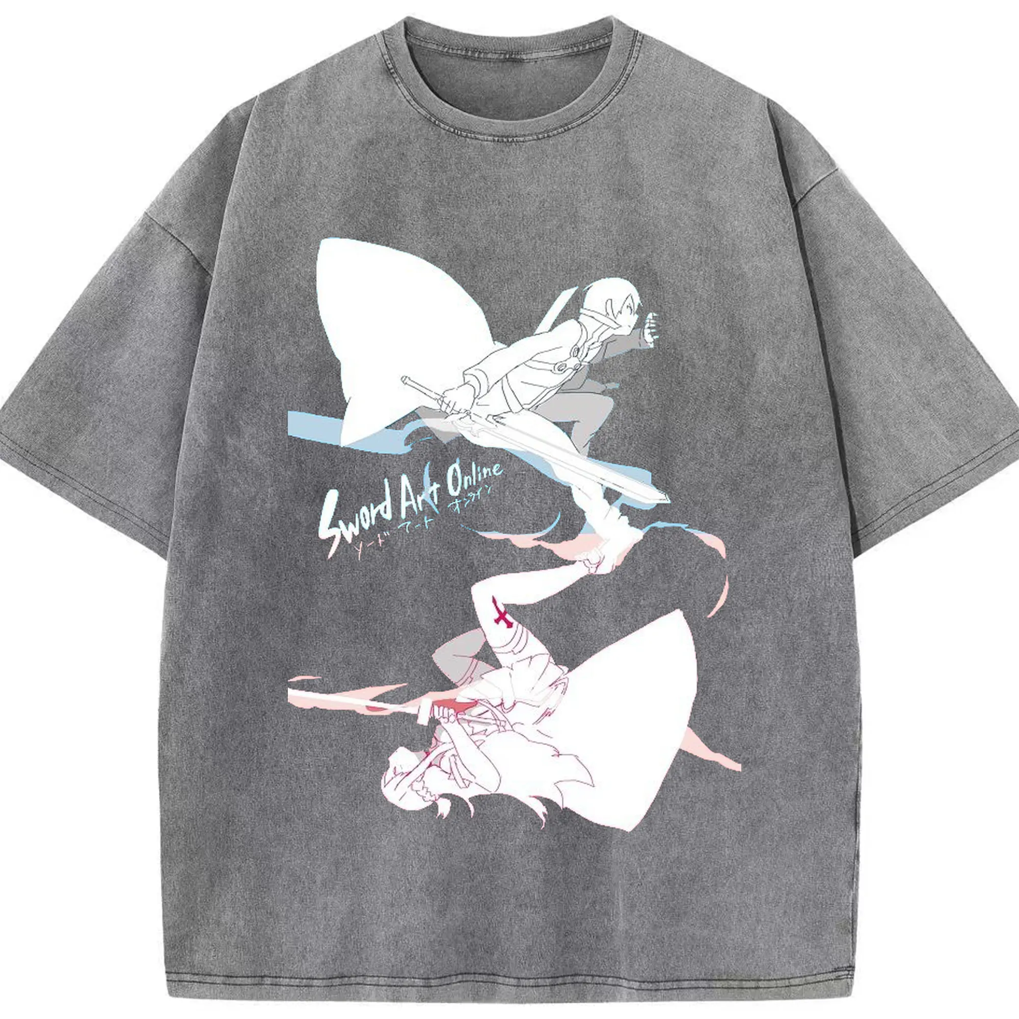 ソードアートオンライン キリトアスナ - 綿100% ヴィンテージ風 半袖Tシャツ ・ フロントプリント ・ 柔らか肌触り ・ 通気性 快適 ・ スポーツ カジュアル 外出用