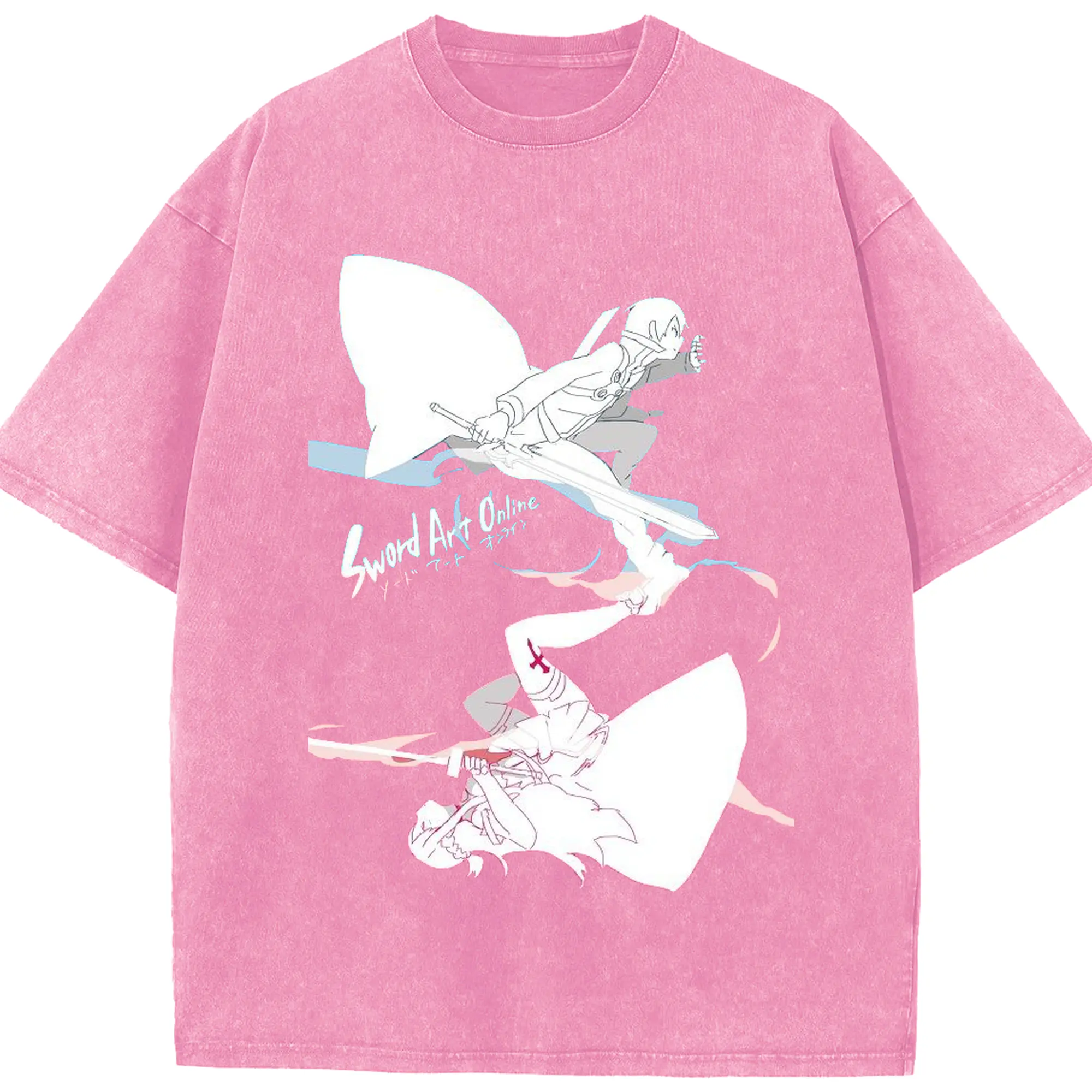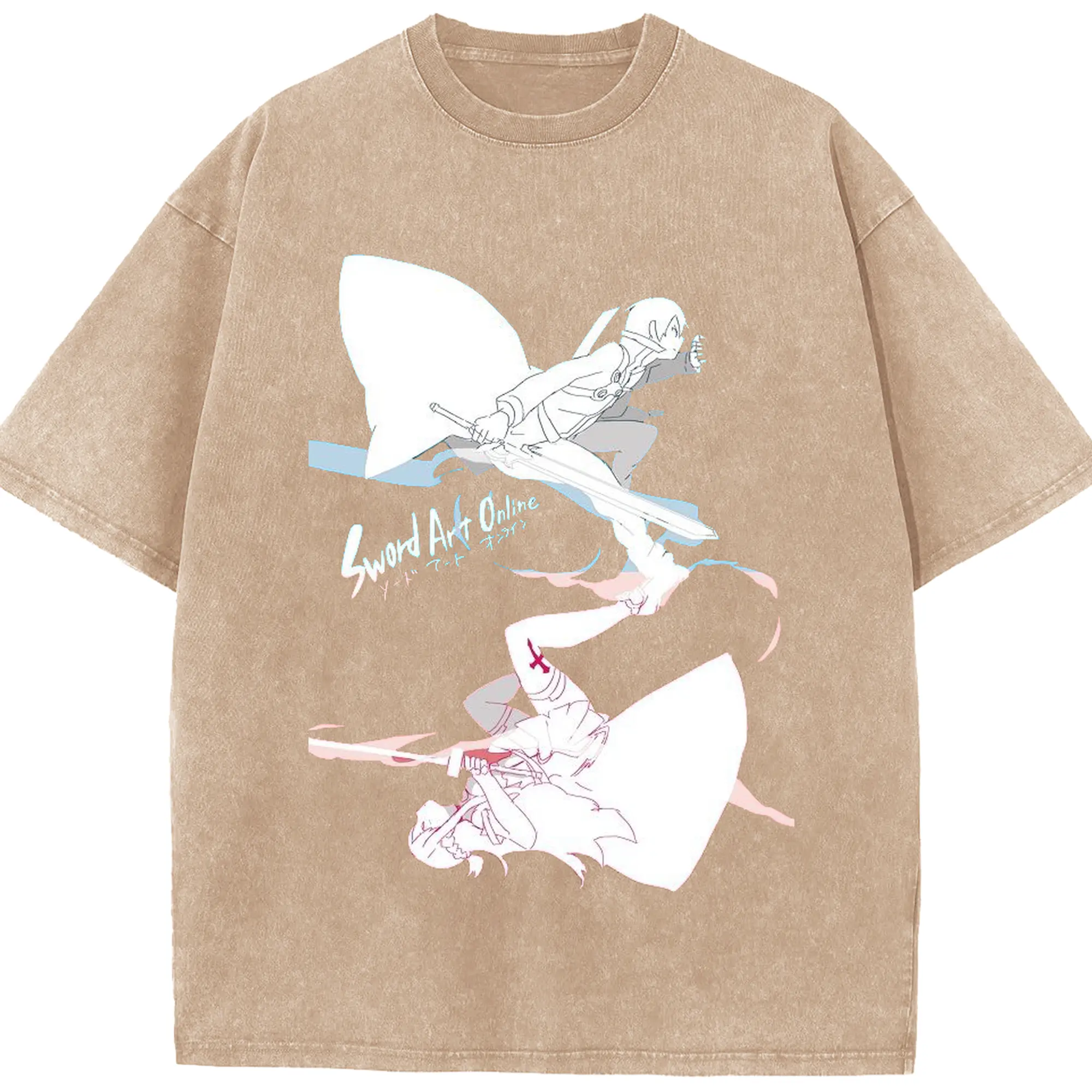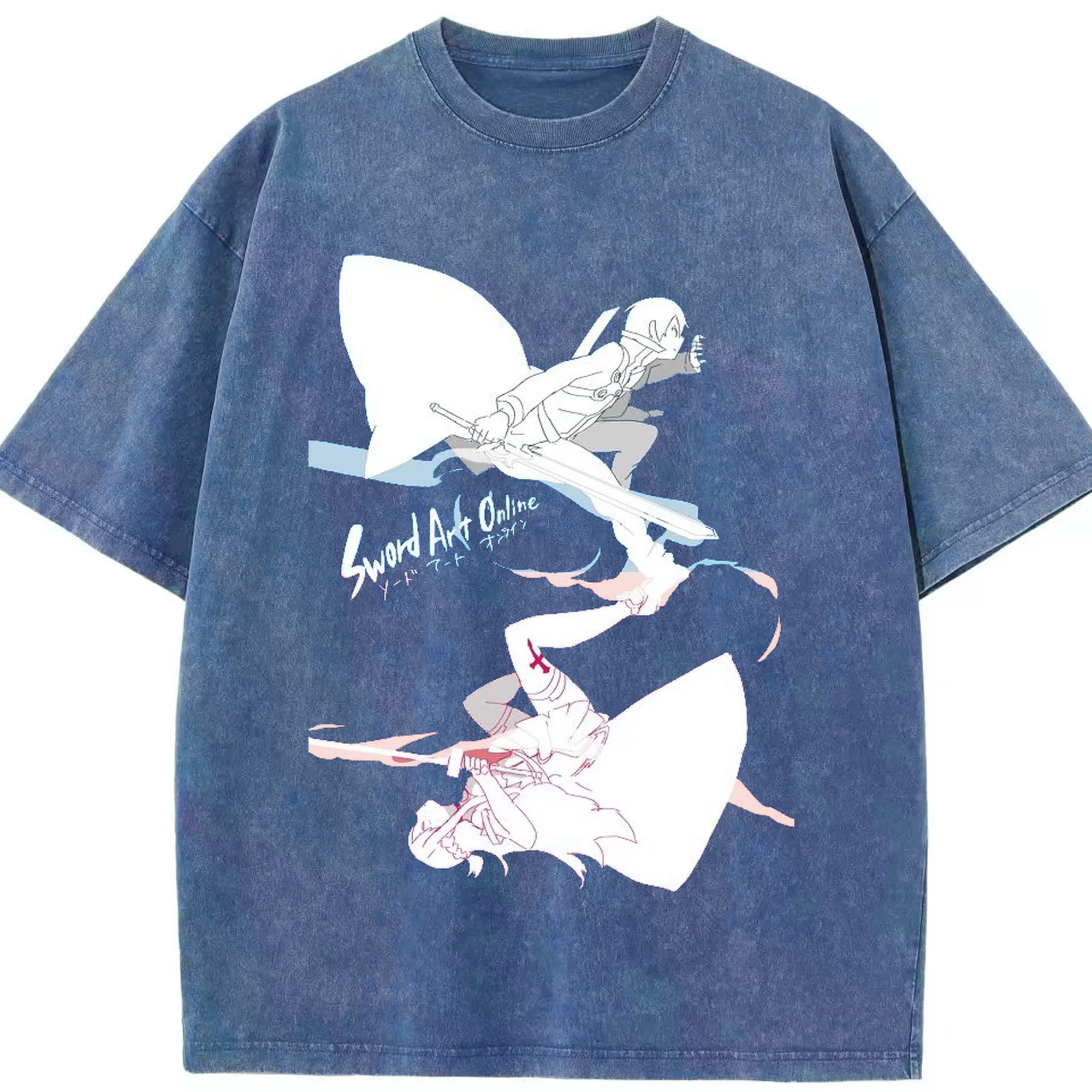 ソードアートオンライン キリトアスナ - 綿100% ヴィンテージ風 半袖Tシャツ ・ フロントプリント ・ 柔らか肌触り ・ 通気性 快適 ・ スポーツ カジュアル 外出用