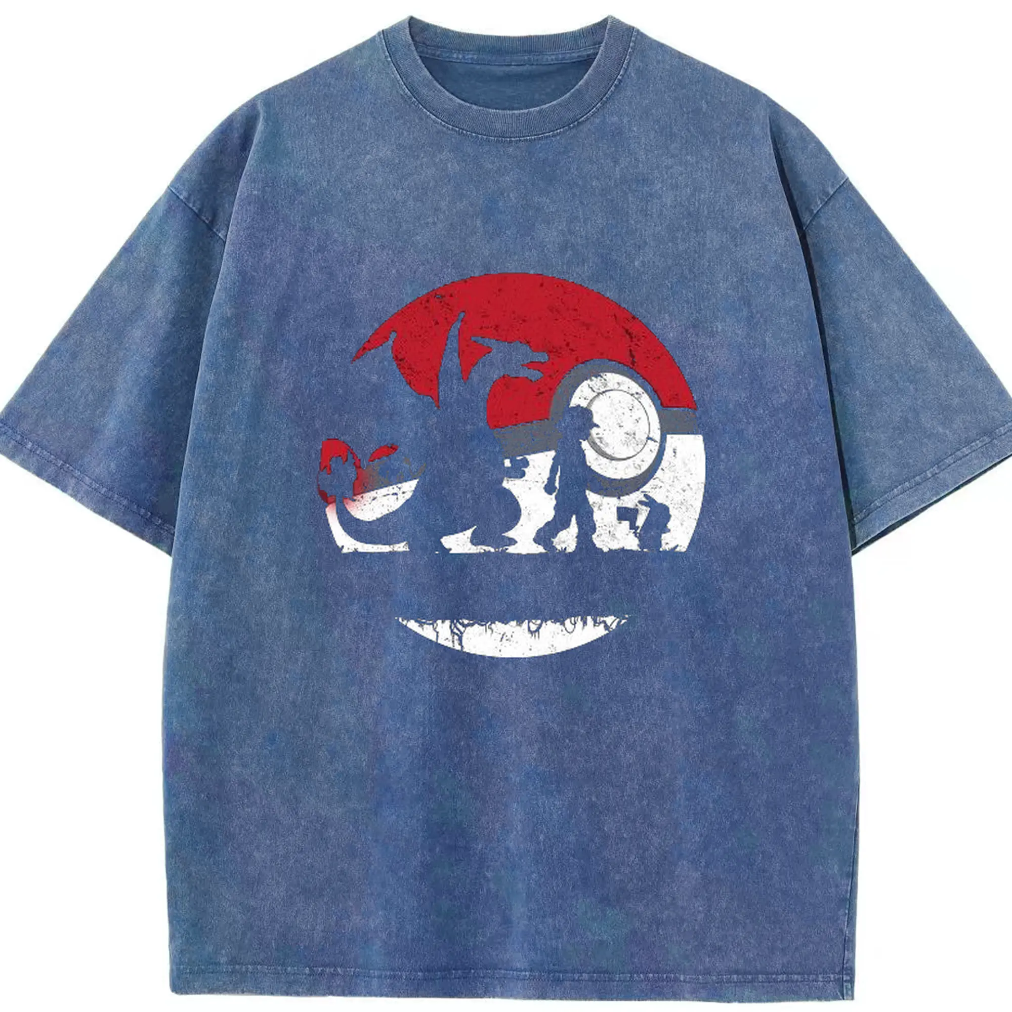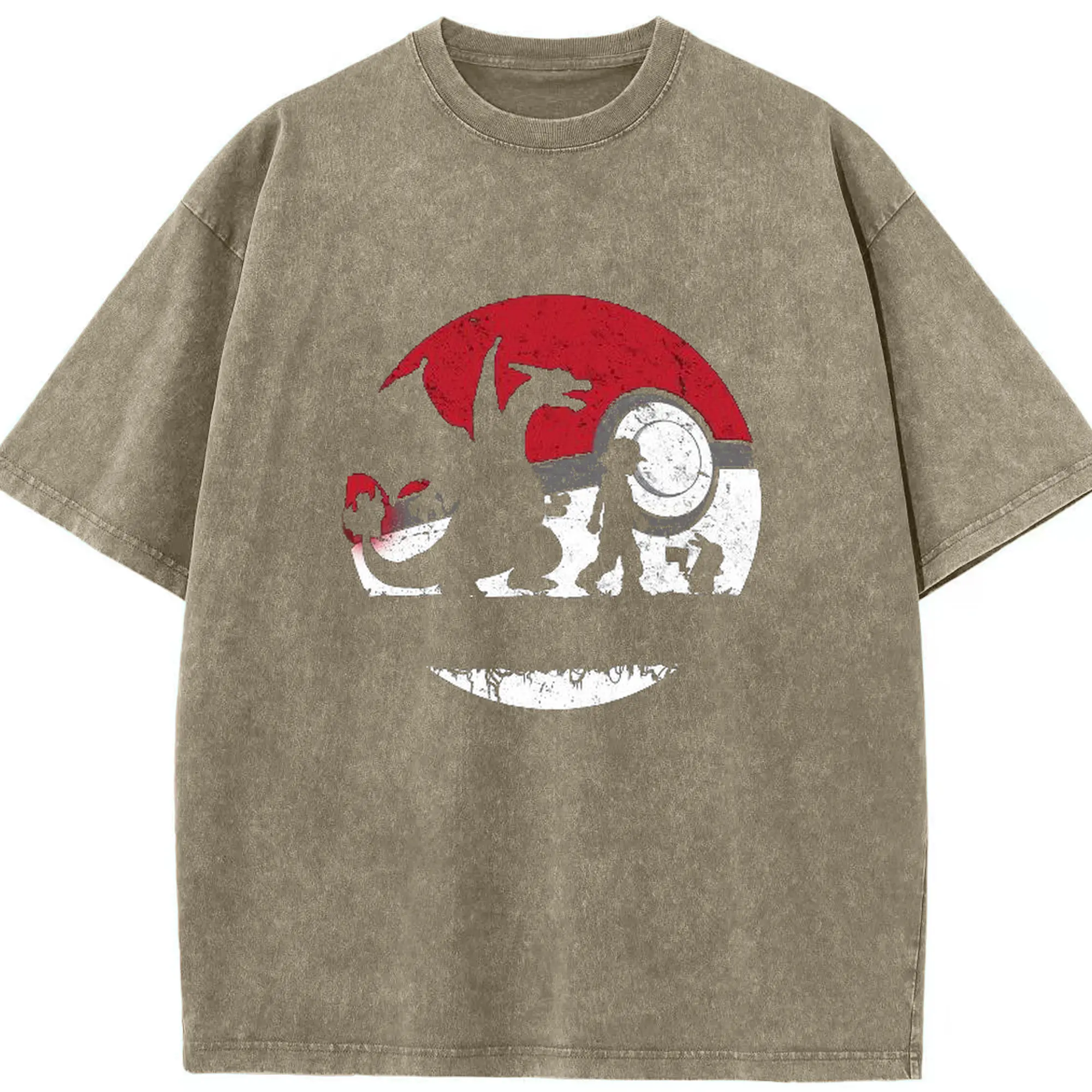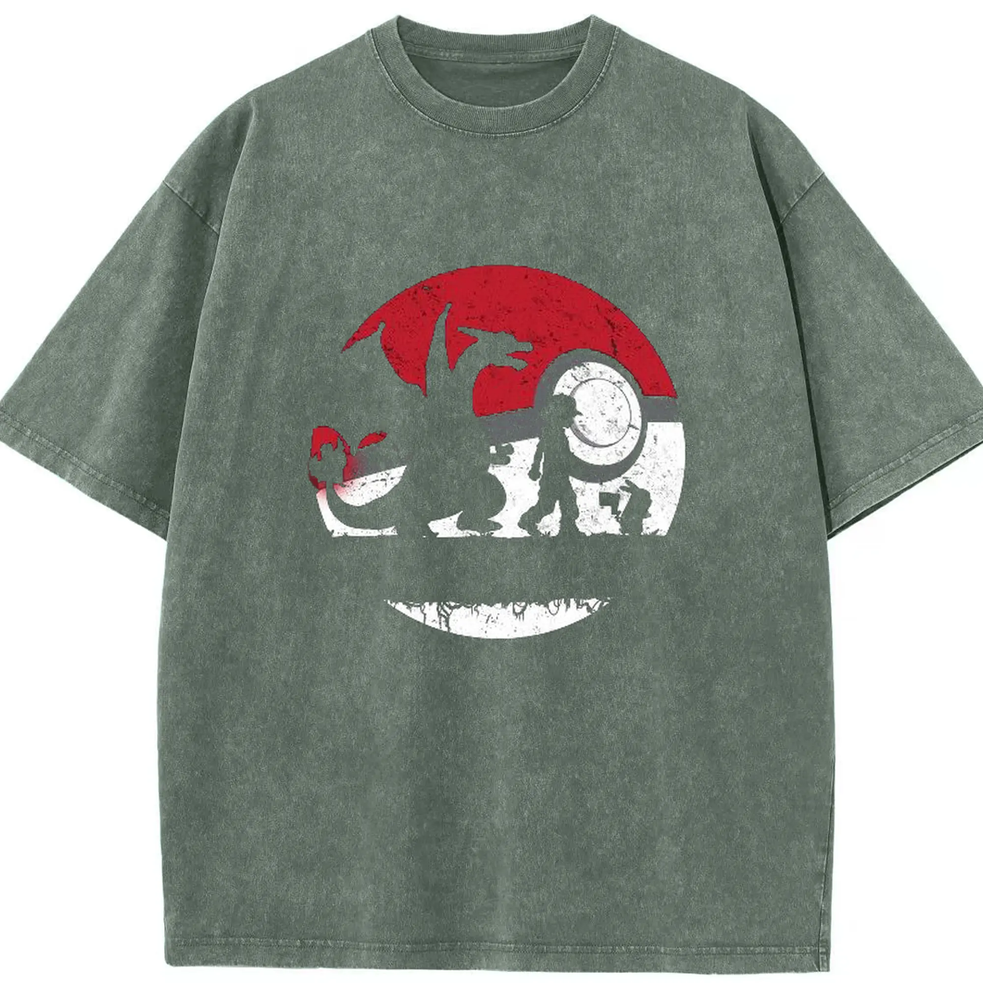 ゴジラの食事タイム - 綿100% ヴィンテージ風 半袖Tシャツ ・ フロントプリント ・ 柔らか肌触り ・ 通気性 快適 ・ スポーツ カジュアル 外出用