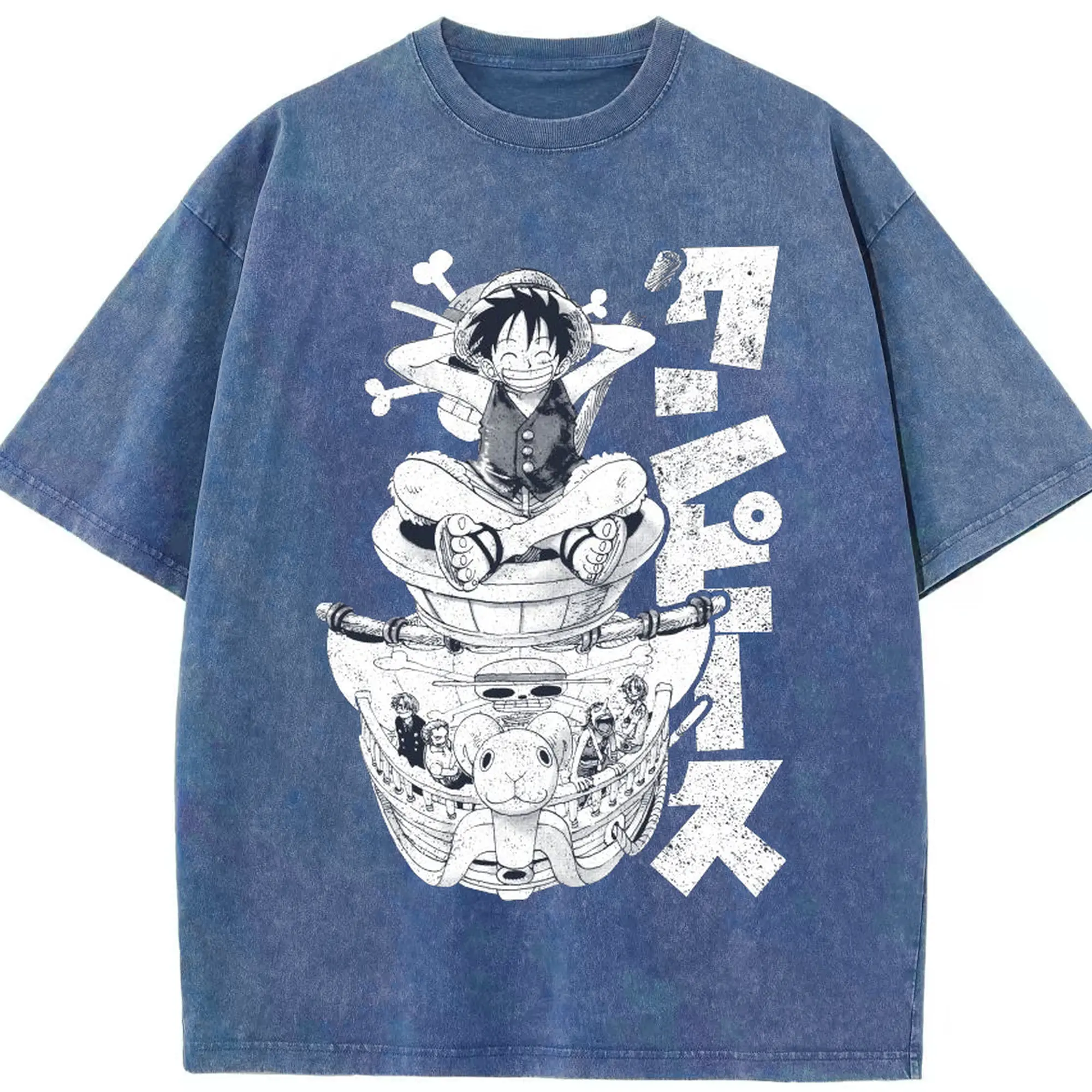 ワンピース モンキー・D・ルフィ - 綿100% ヴィンテージ風 半袖Tシャツ ・ フロントプリント ・ 柔らか肌触り ・ 通気性 快適 ・ スポーツ カジュアル 外出用