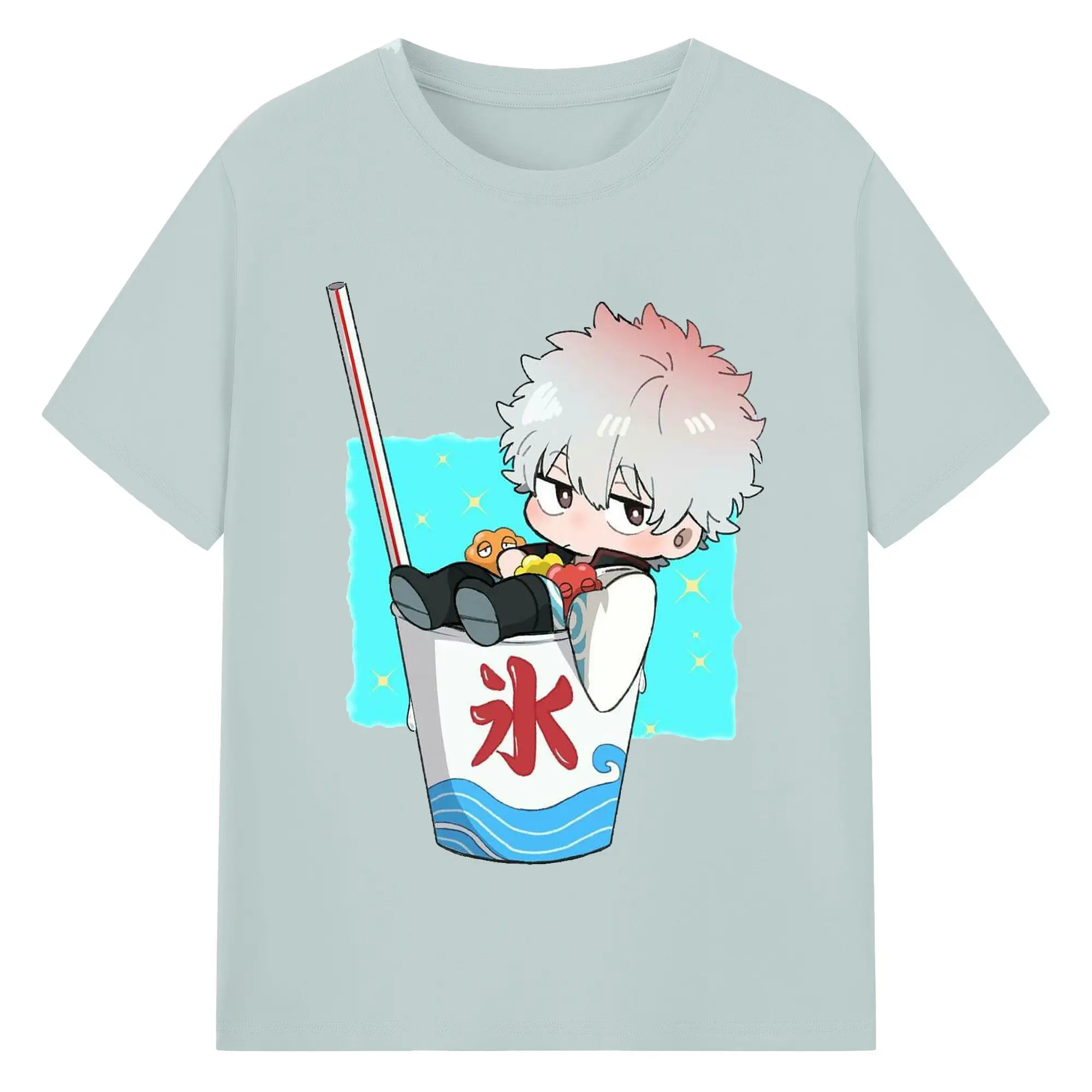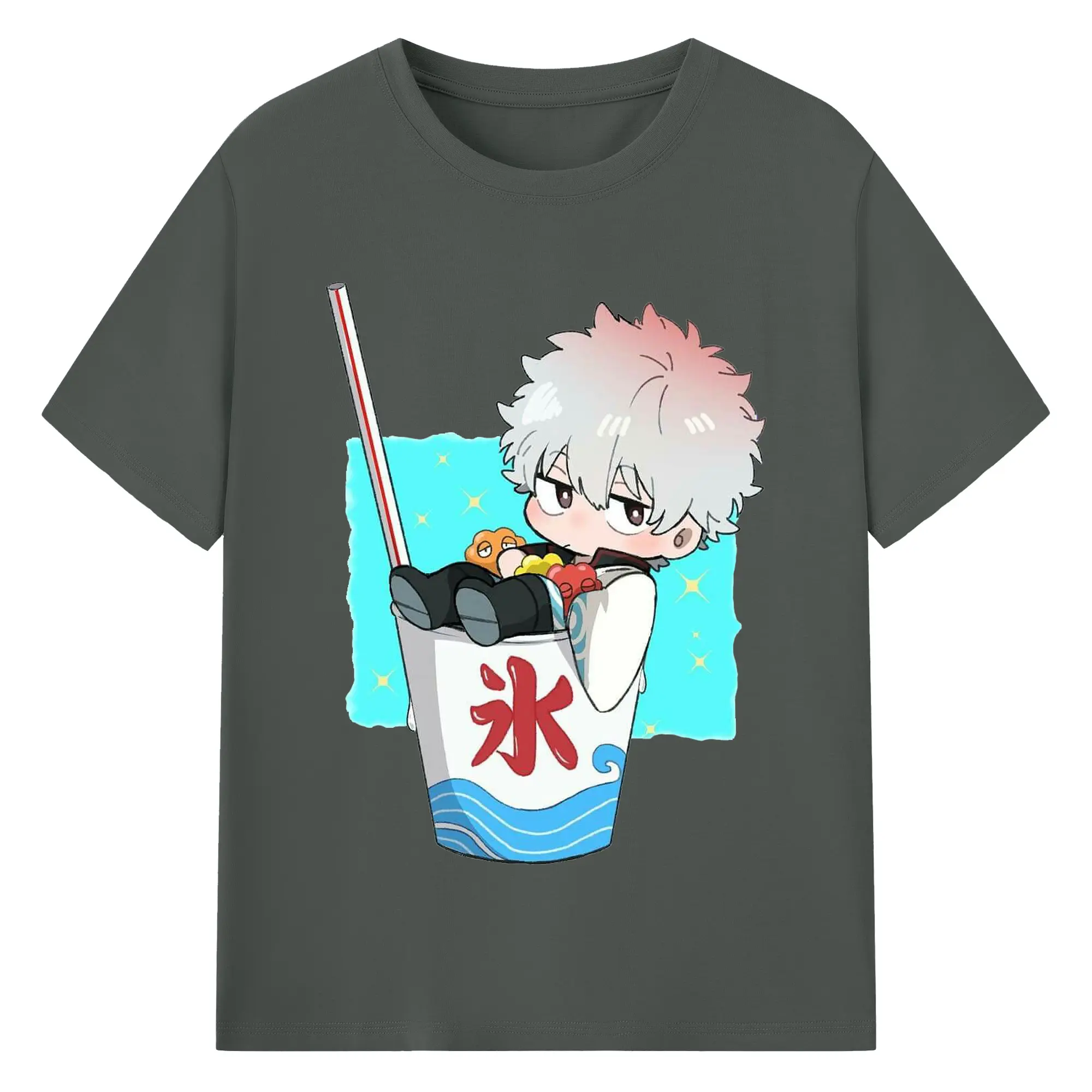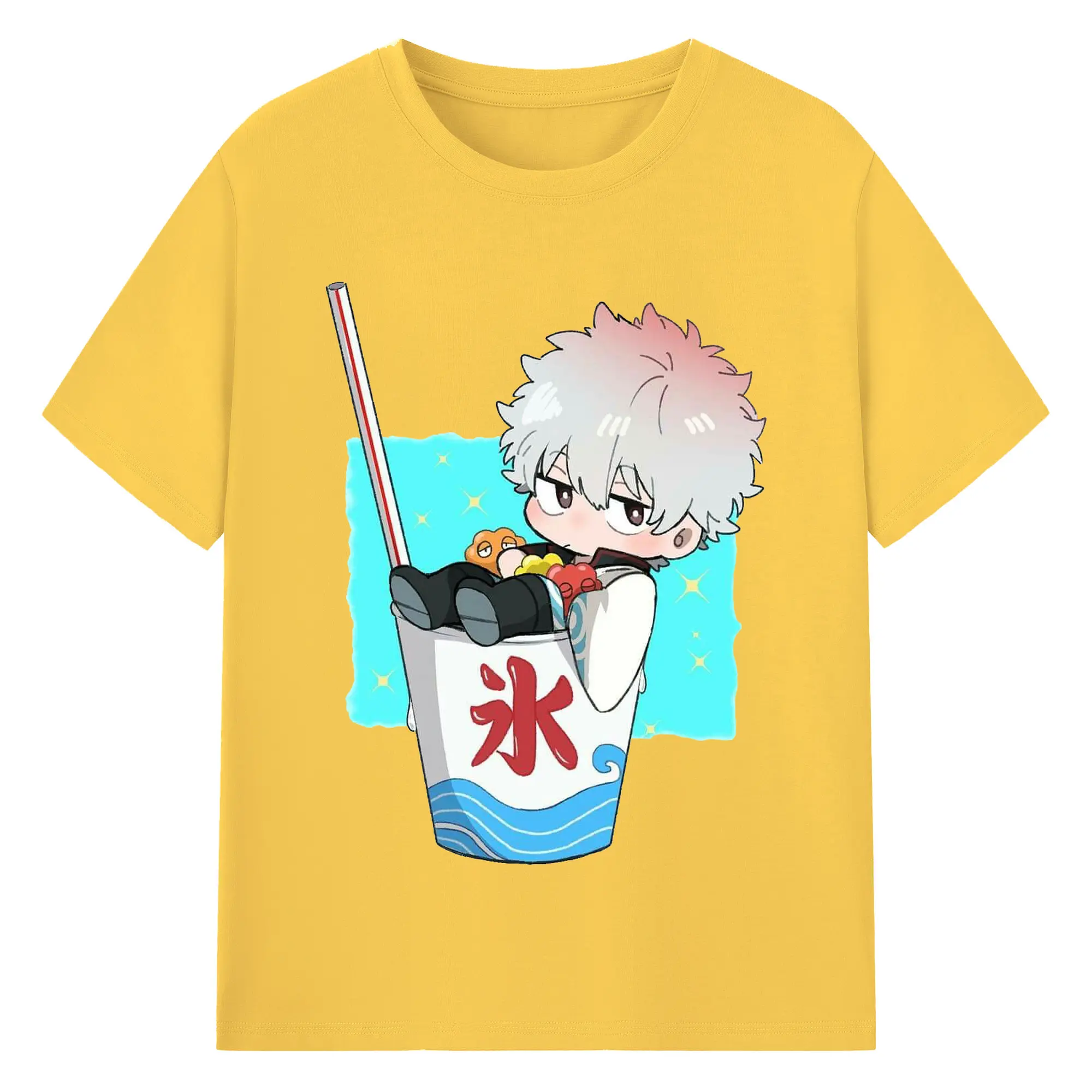 银魂 銀時と夏の冷たいドリンク - 綿100% ヴィンテージ風 半袖Tシャツ ・ フロントプリント ・ 柔らか肌触り ・ 通気性 快適 ・ スポーツ カジュアル 外出用