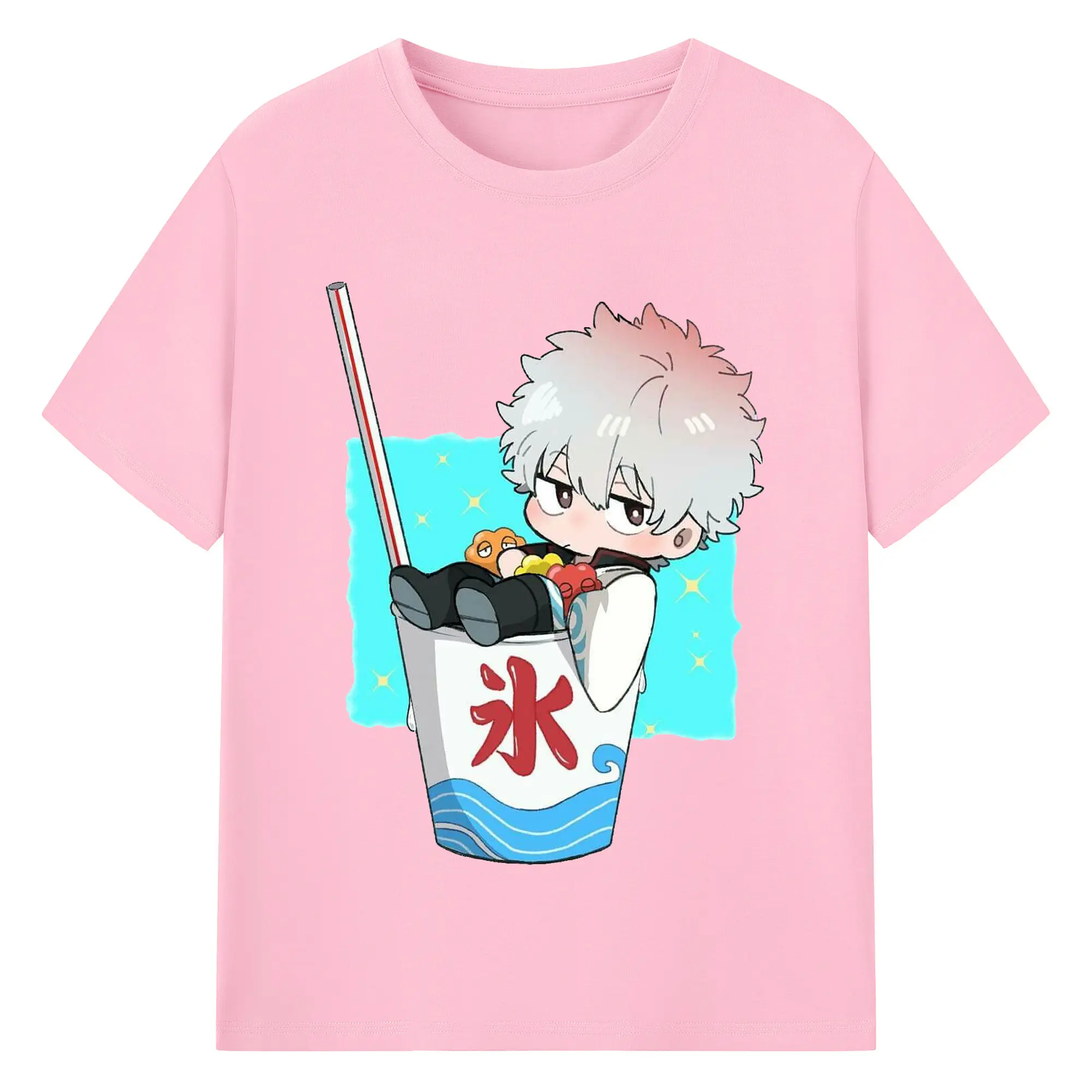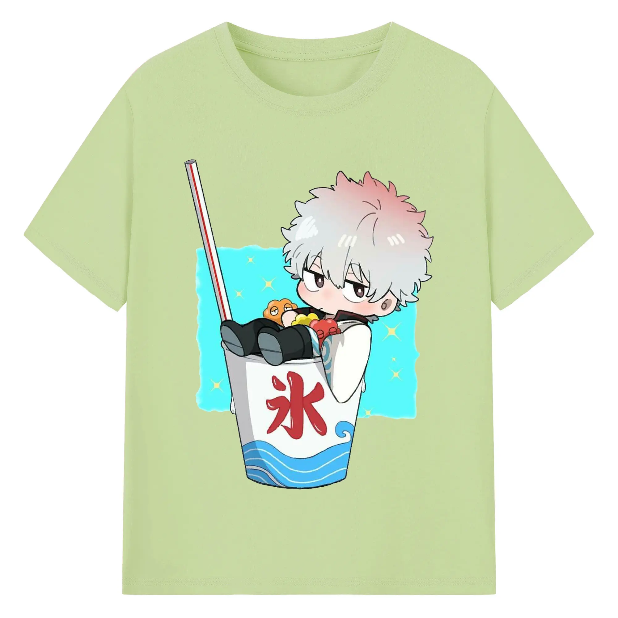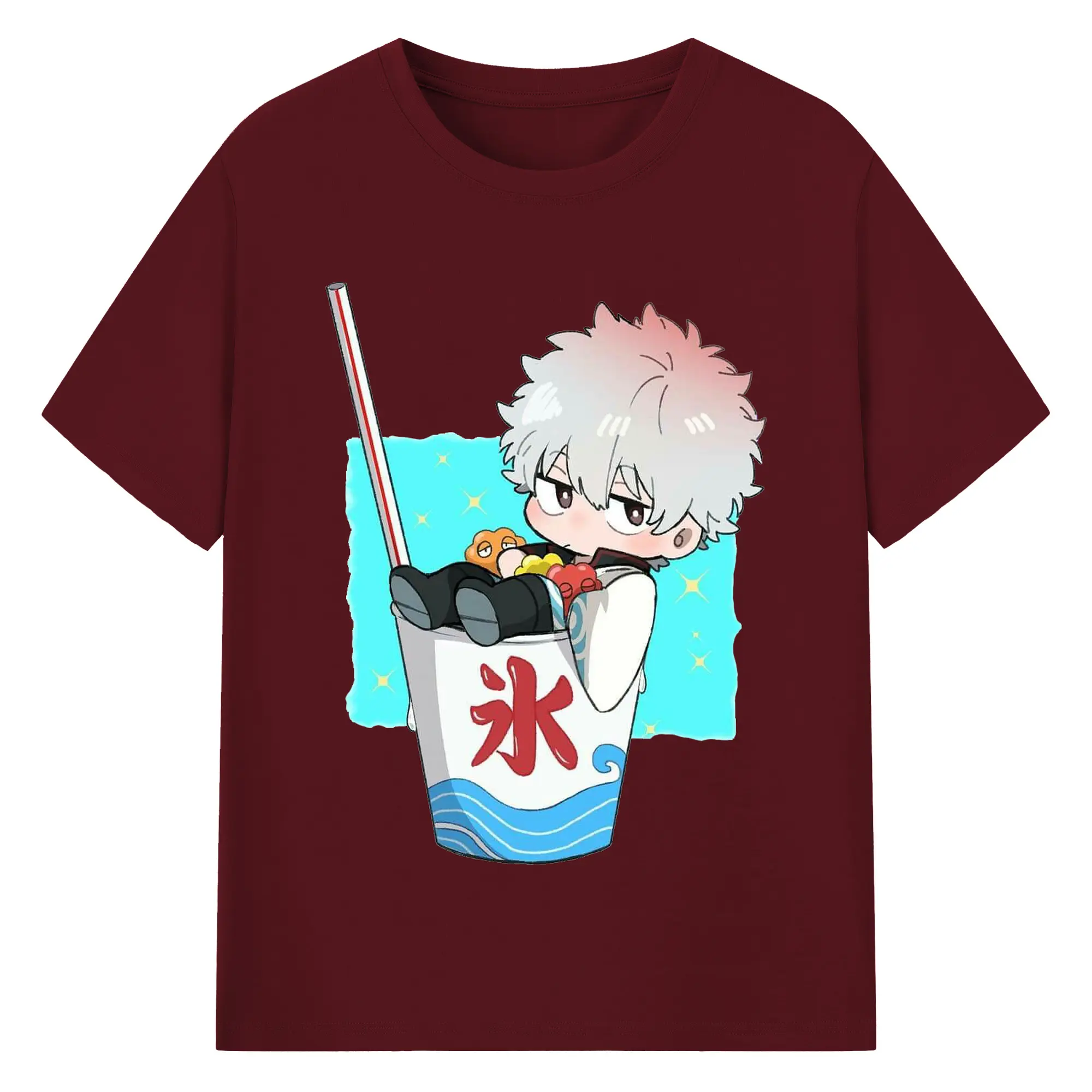 银魂 銀時と夏の冷たいドリンク - 綿100% ヴィンテージ風 半袖Tシャツ ・ フロントプリント ・ 柔らか肌触り ・ 通気性 快適 ・ スポーツ カジュアル 外出用