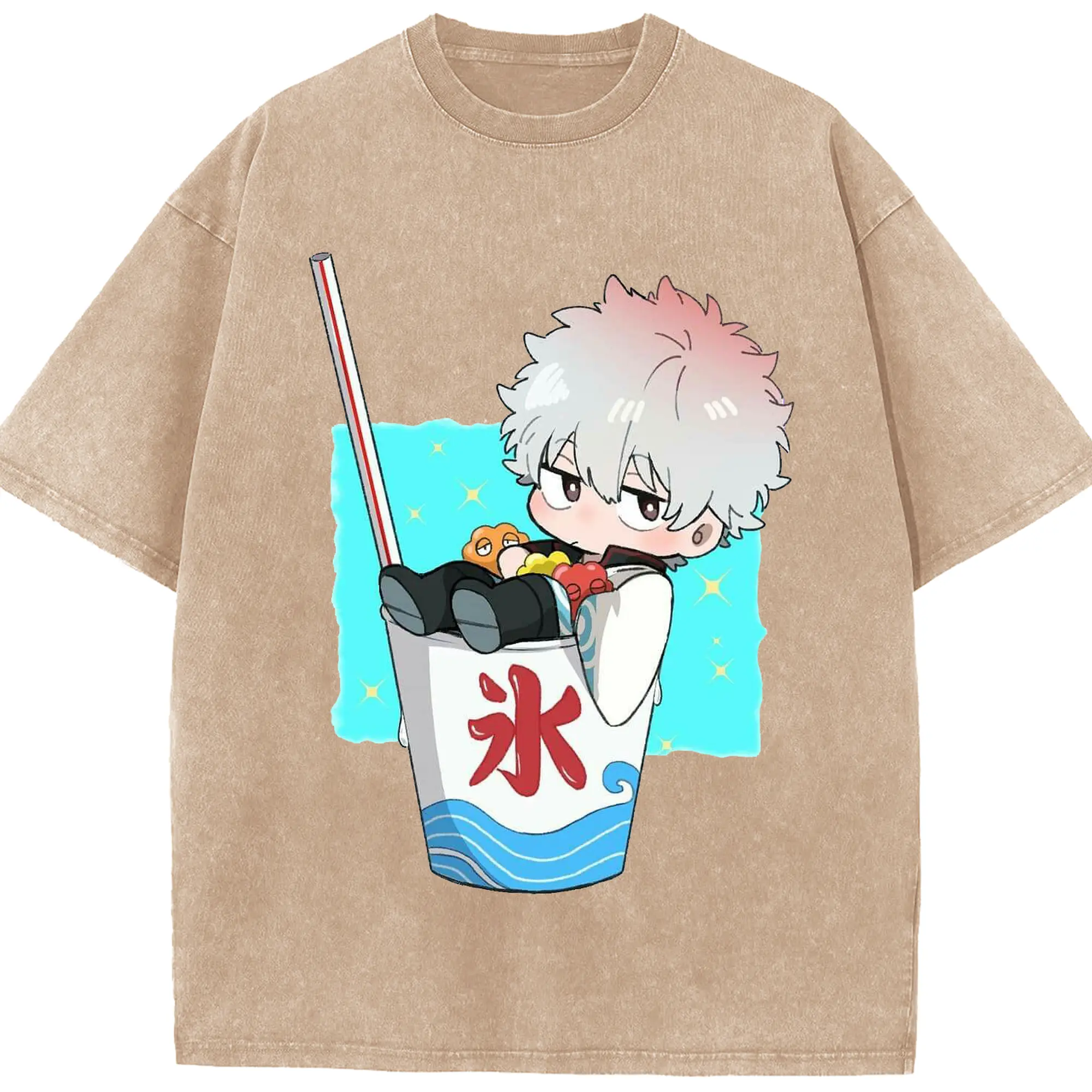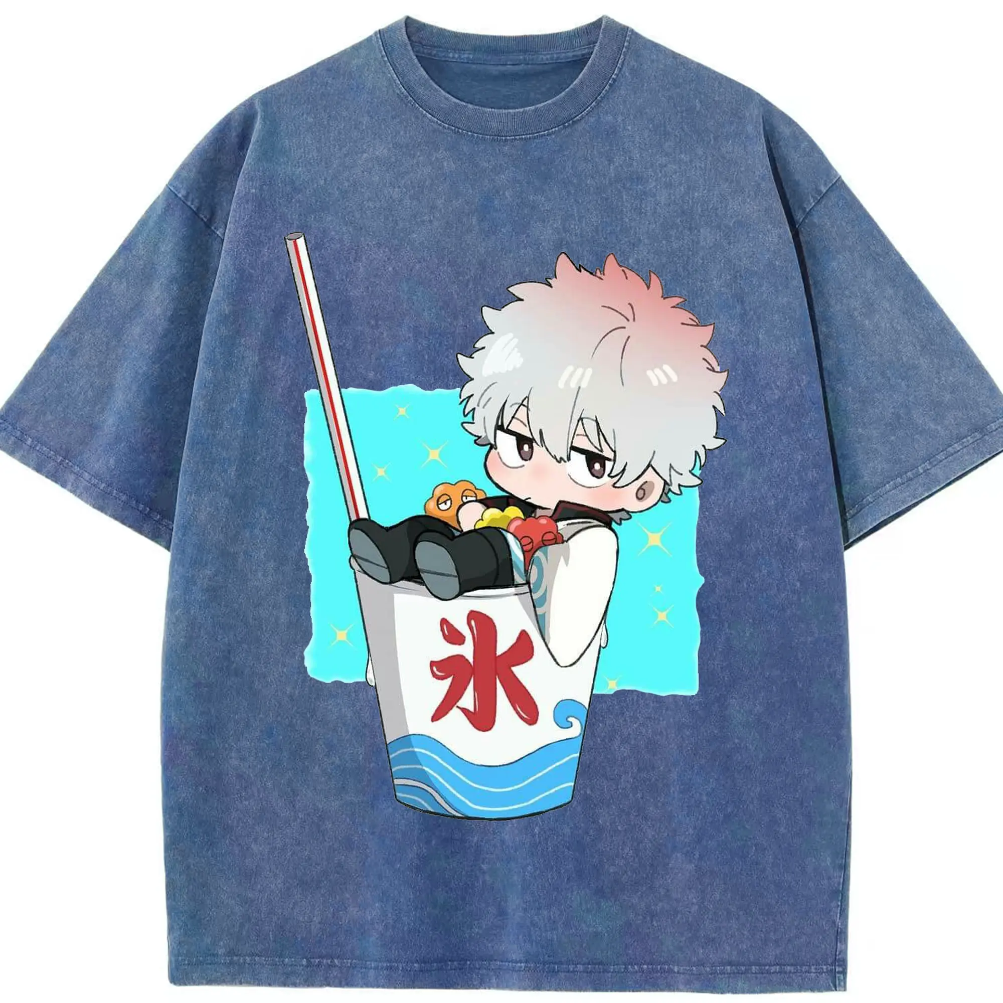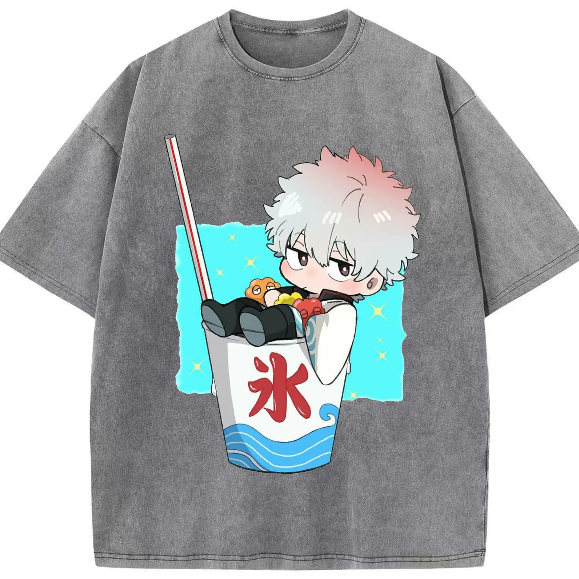 银魂 銀時と夏の冷たいドリンク - 綿100% 半袖Tシャツ ・ フロントプリント ・ 快適 通気性 ・ 日常使い 散歩 スポーツ用
