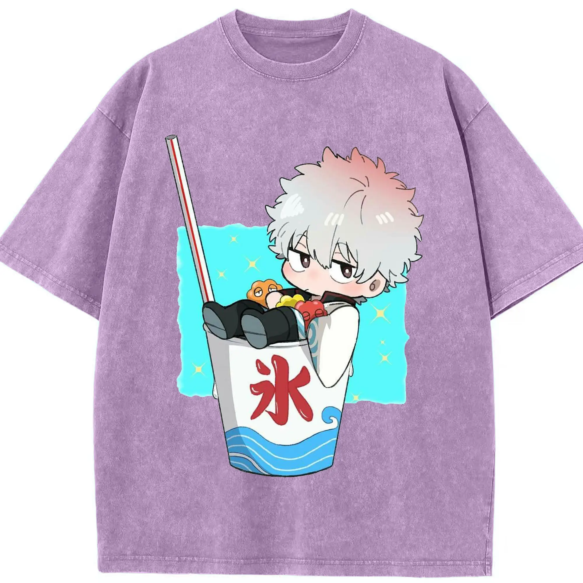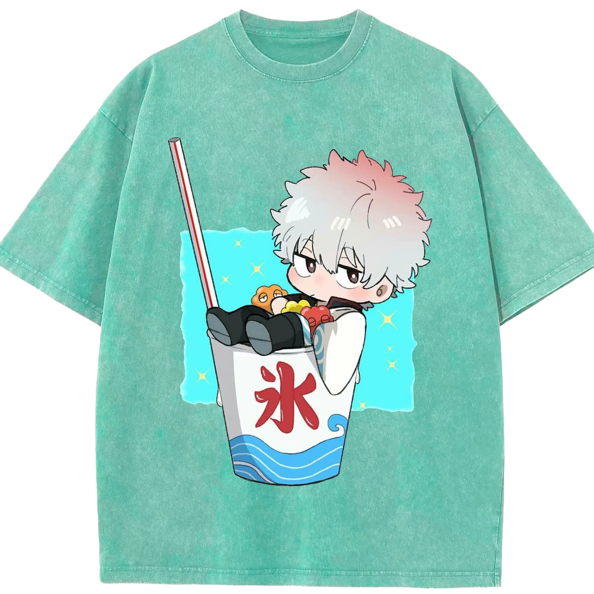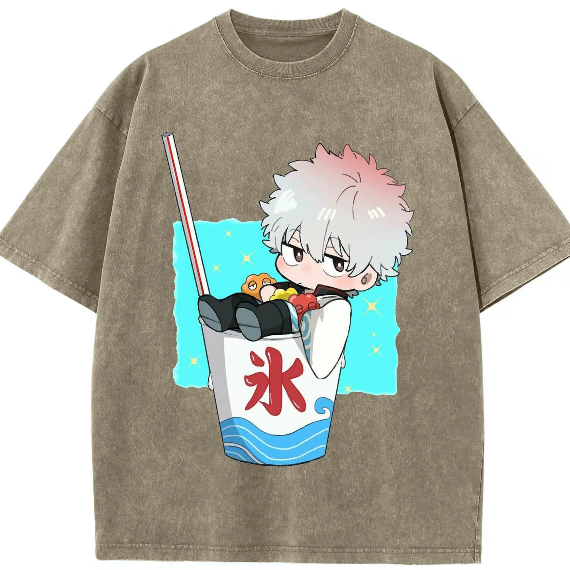 银魂 銀時と夏の冷たいドリンク - 綿100% 半袖Tシャツ ・ フロントプリント ・ 快適 通気性 ・ 日常使い 散歩 スポーツ用