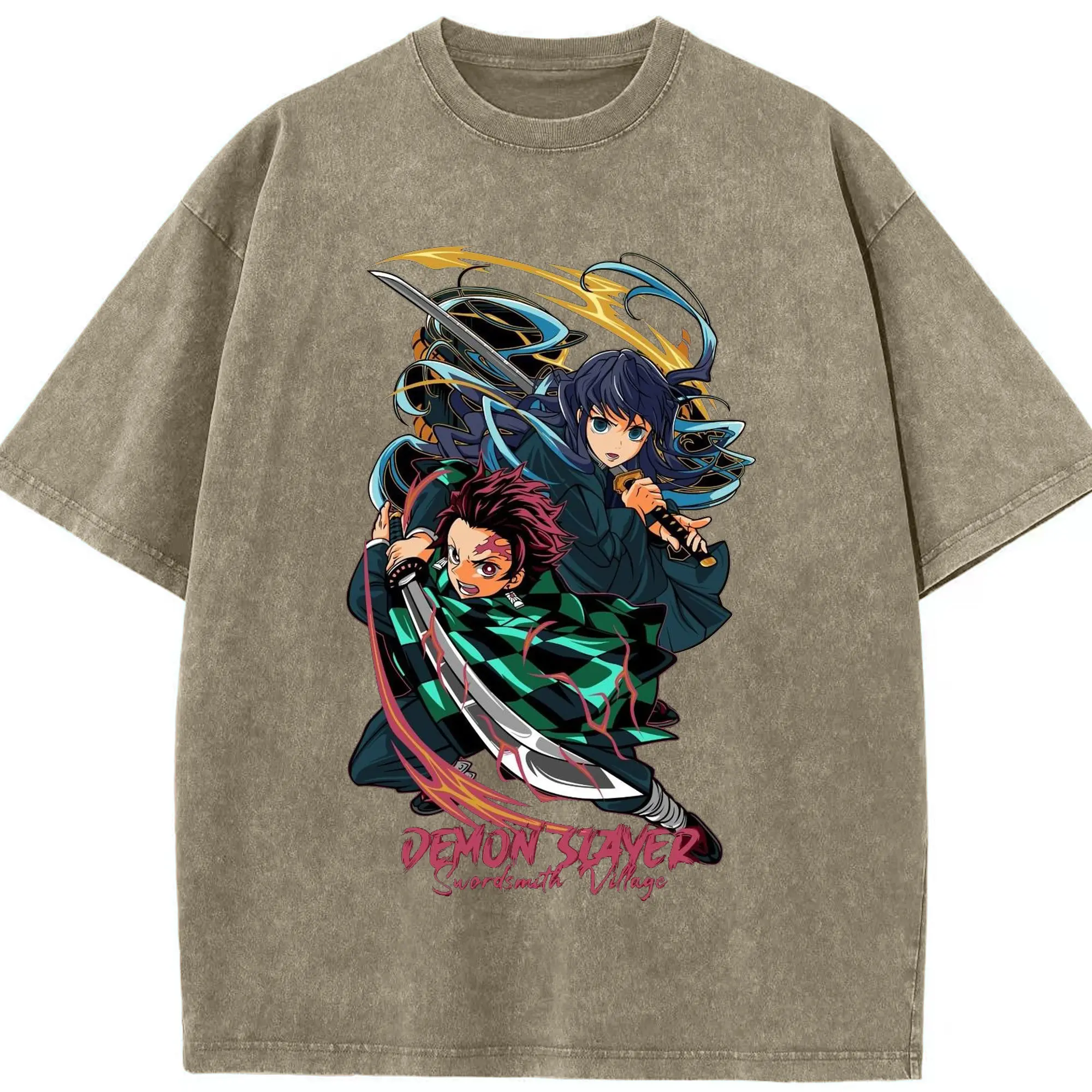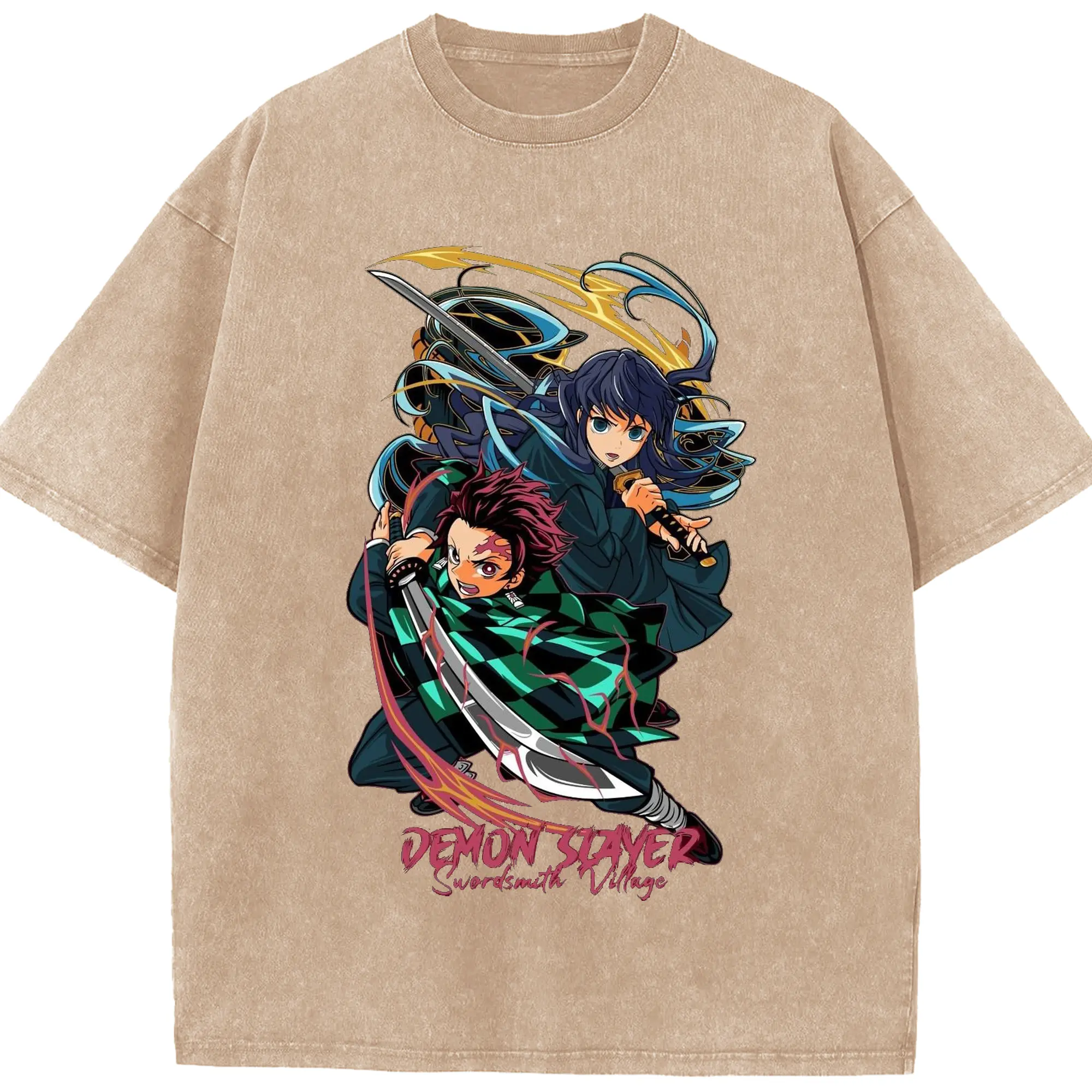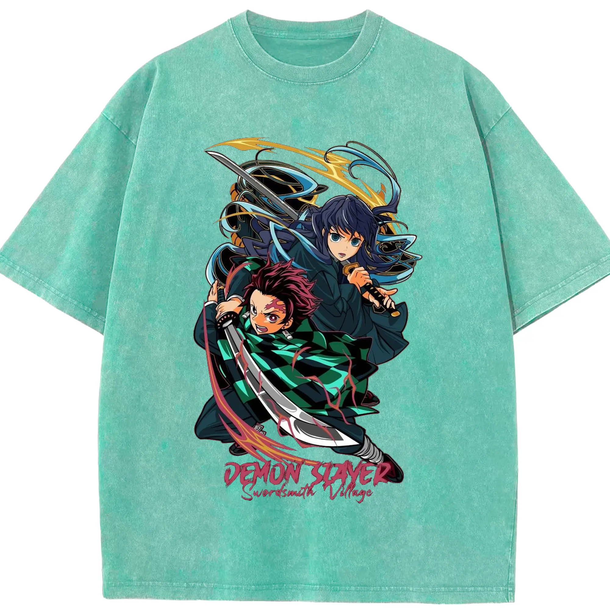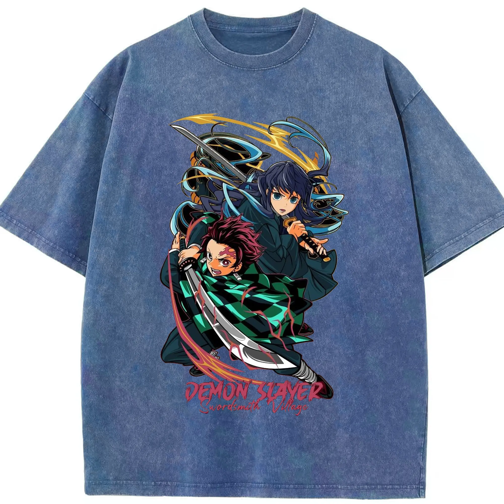 鬼滅の刃 冨岡義勇 - 綿100% ヴィンテージ風 半袖Tシャツ ・ フロントプリント ・ 柔らか肌触り ・ 通気性 快適 ・ スポーツ カジュアル 外出用