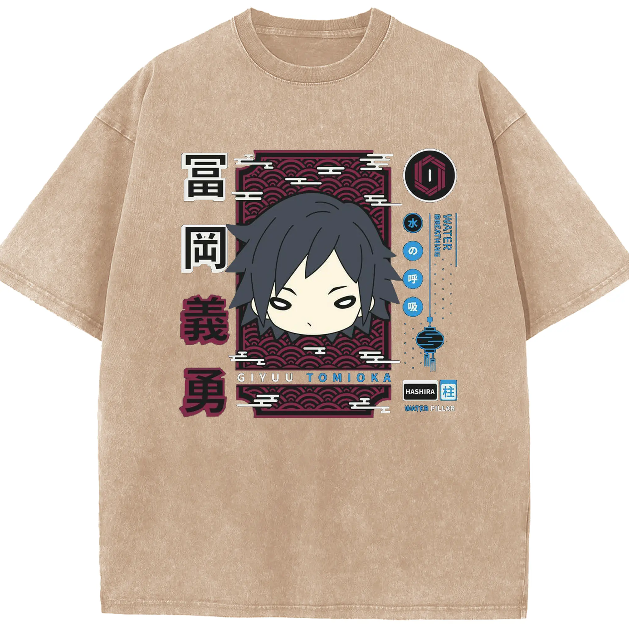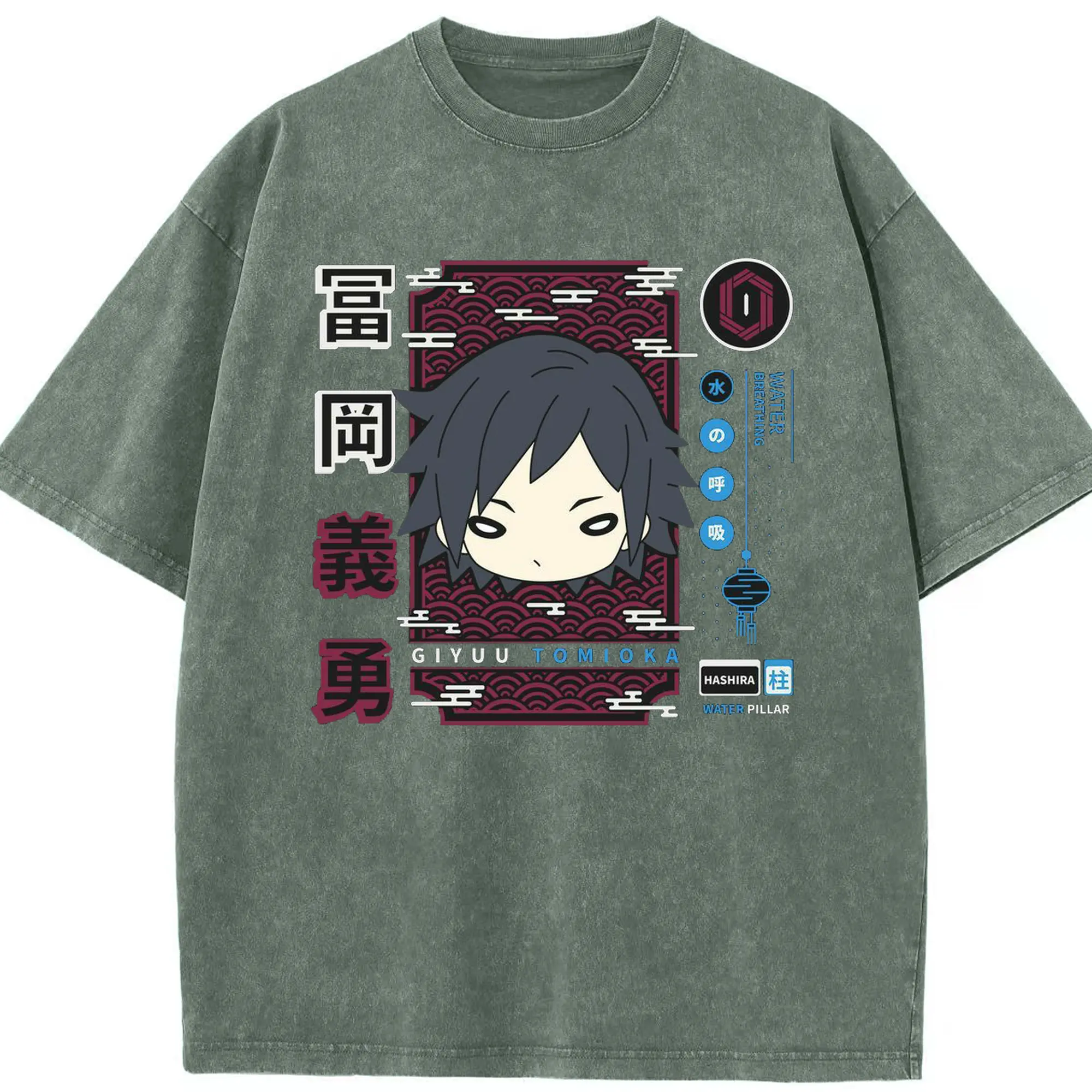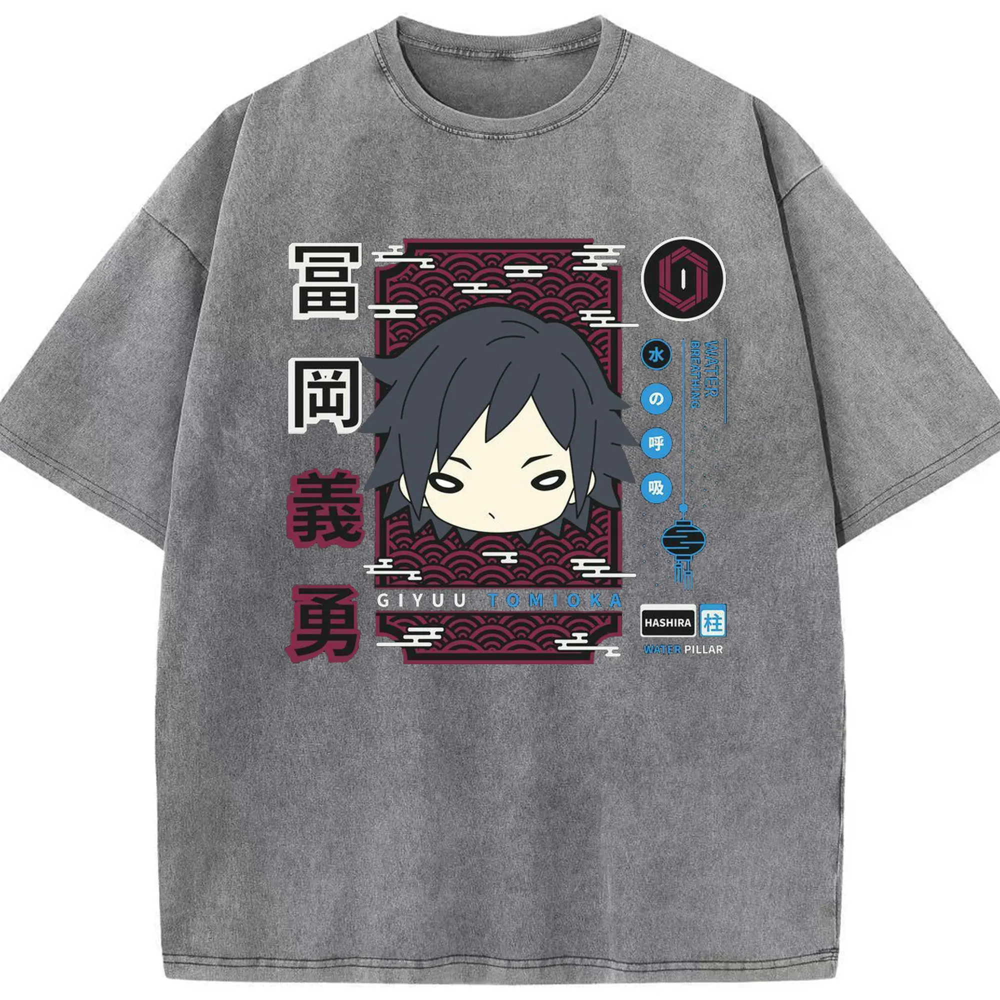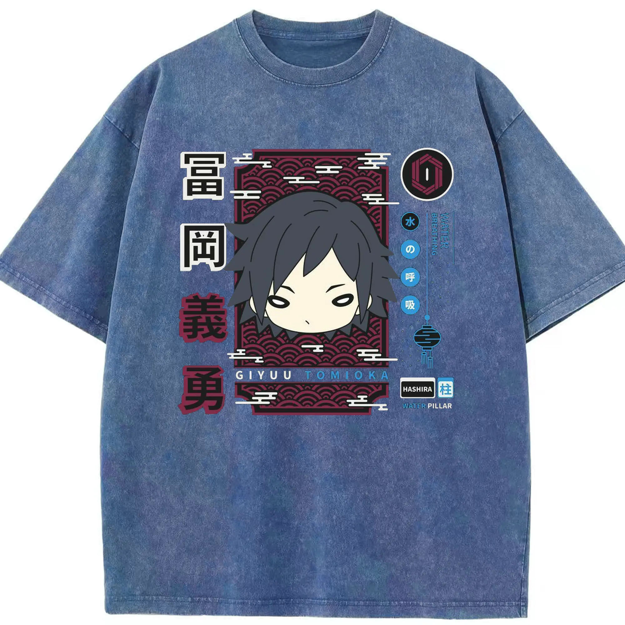 鬼滅の刃 冨岡義勇 - 綿100% ヴィンテージ風 半袖Tシャツ ・ フロントプリント ・ 柔らか肌触り ・ 通気性 快適 ・ スポーツ カジュアル 外出用