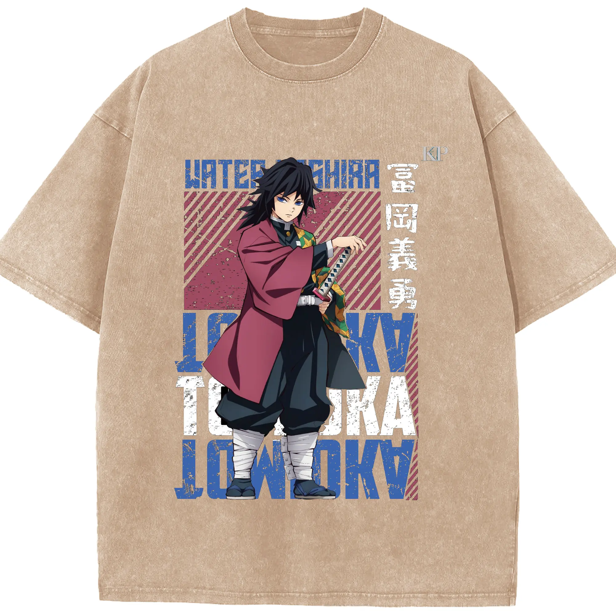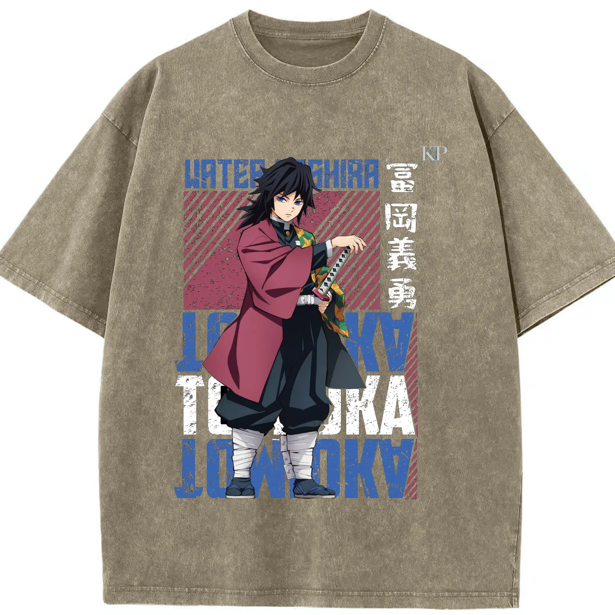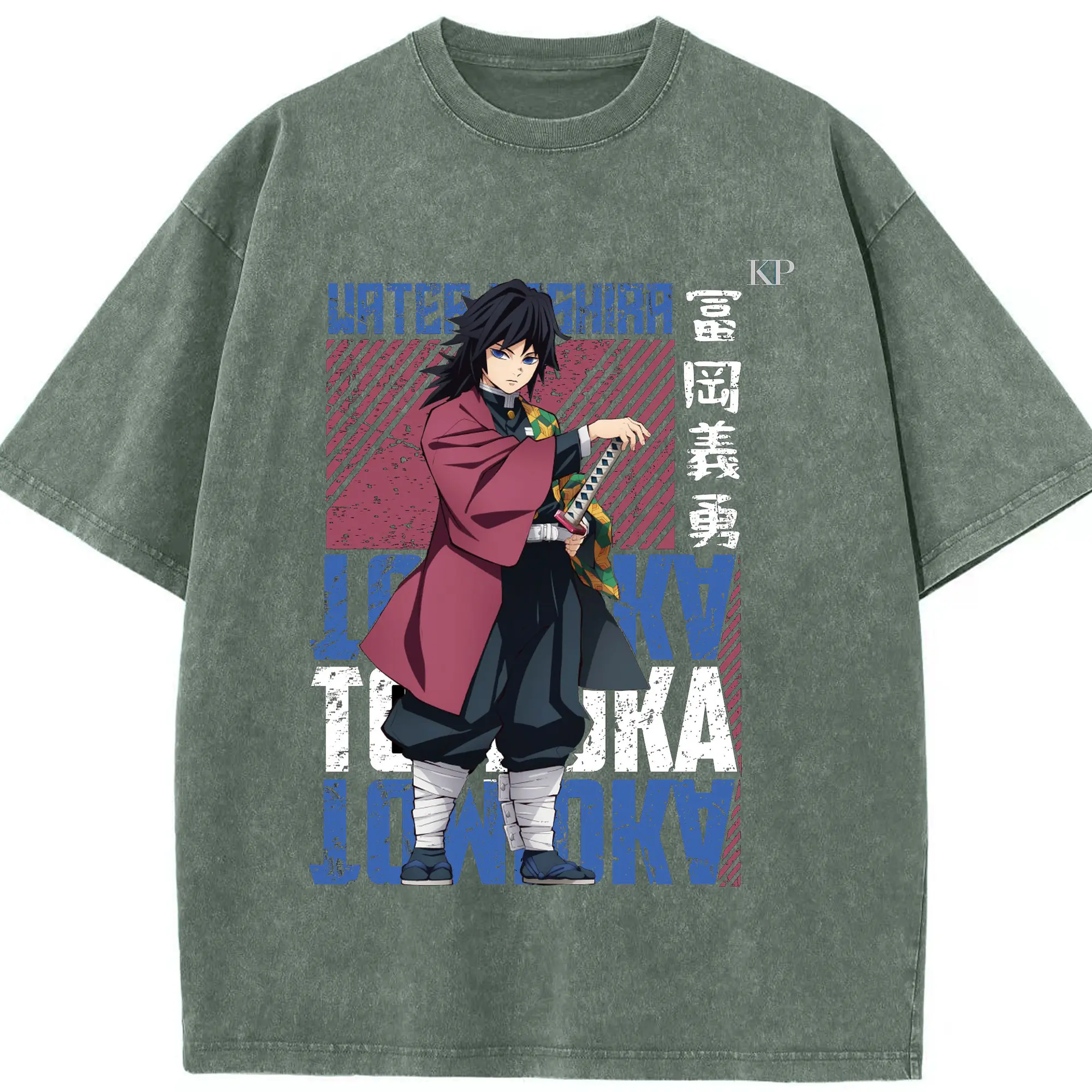 鬼滅の刃 冨岡義勇 - 綿100% ヴィンテージ風 半袖Tシャツ ・ フロントプリント ・ 柔らか肌触り ・ 通気性 快適 ・ スポーツ カジュアル 外出用