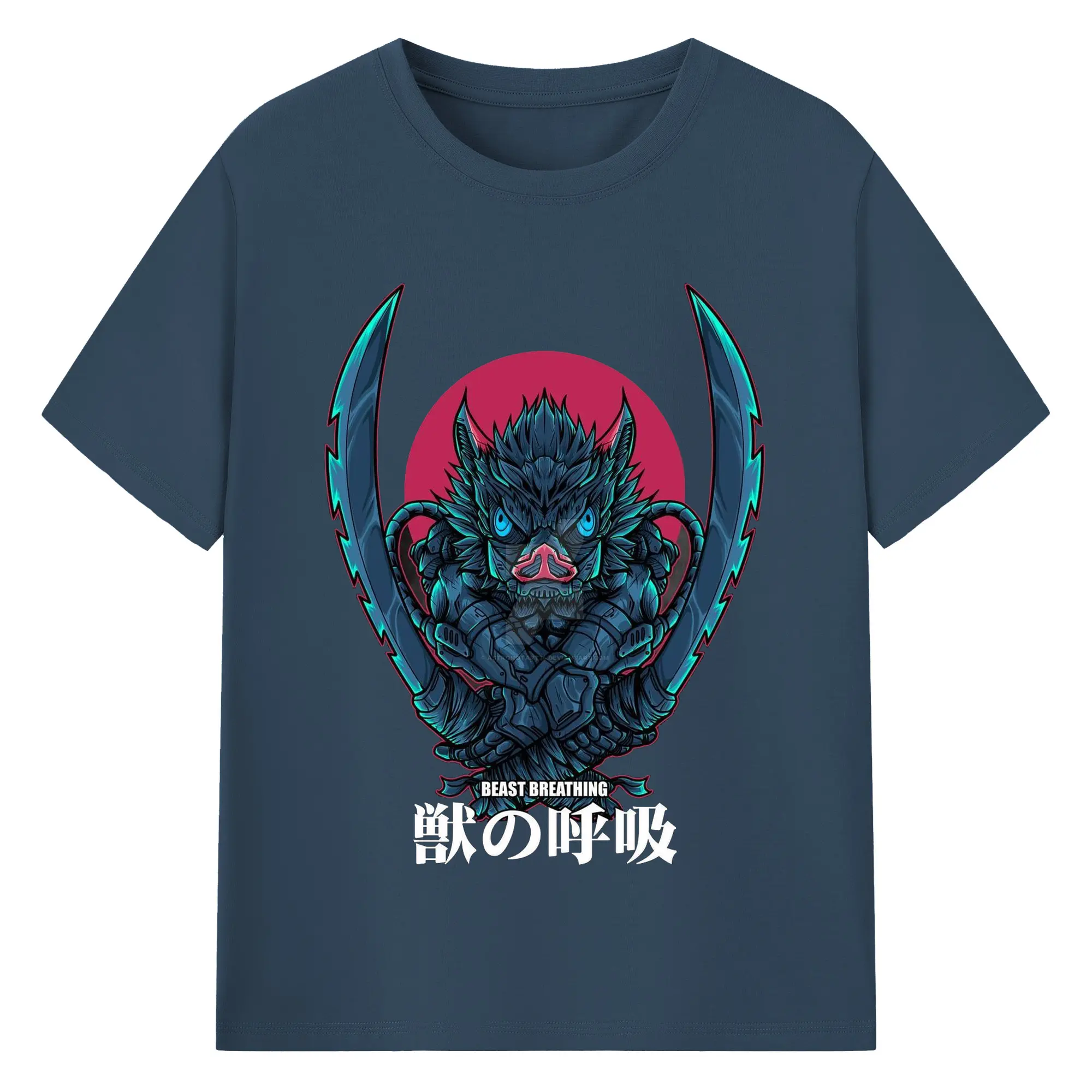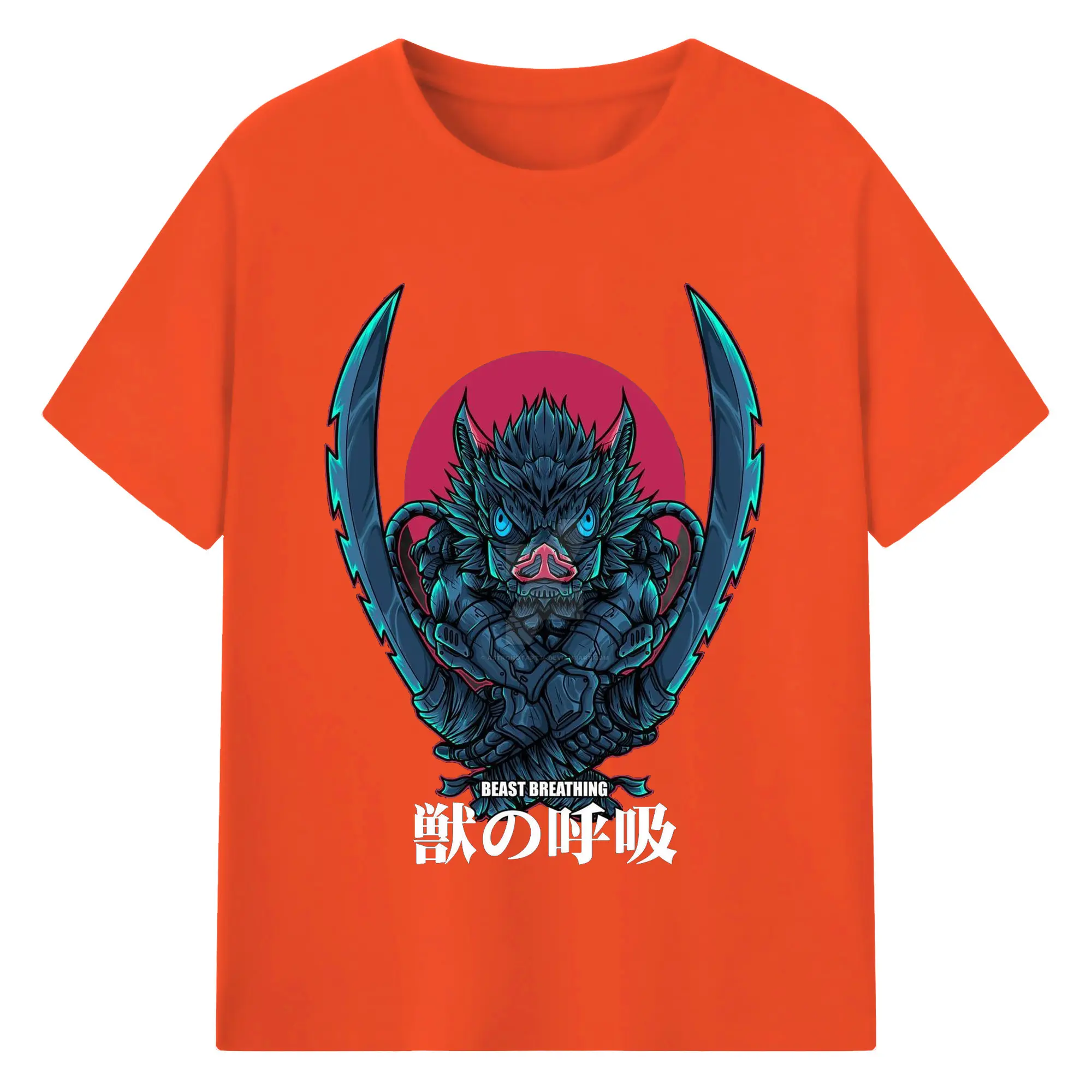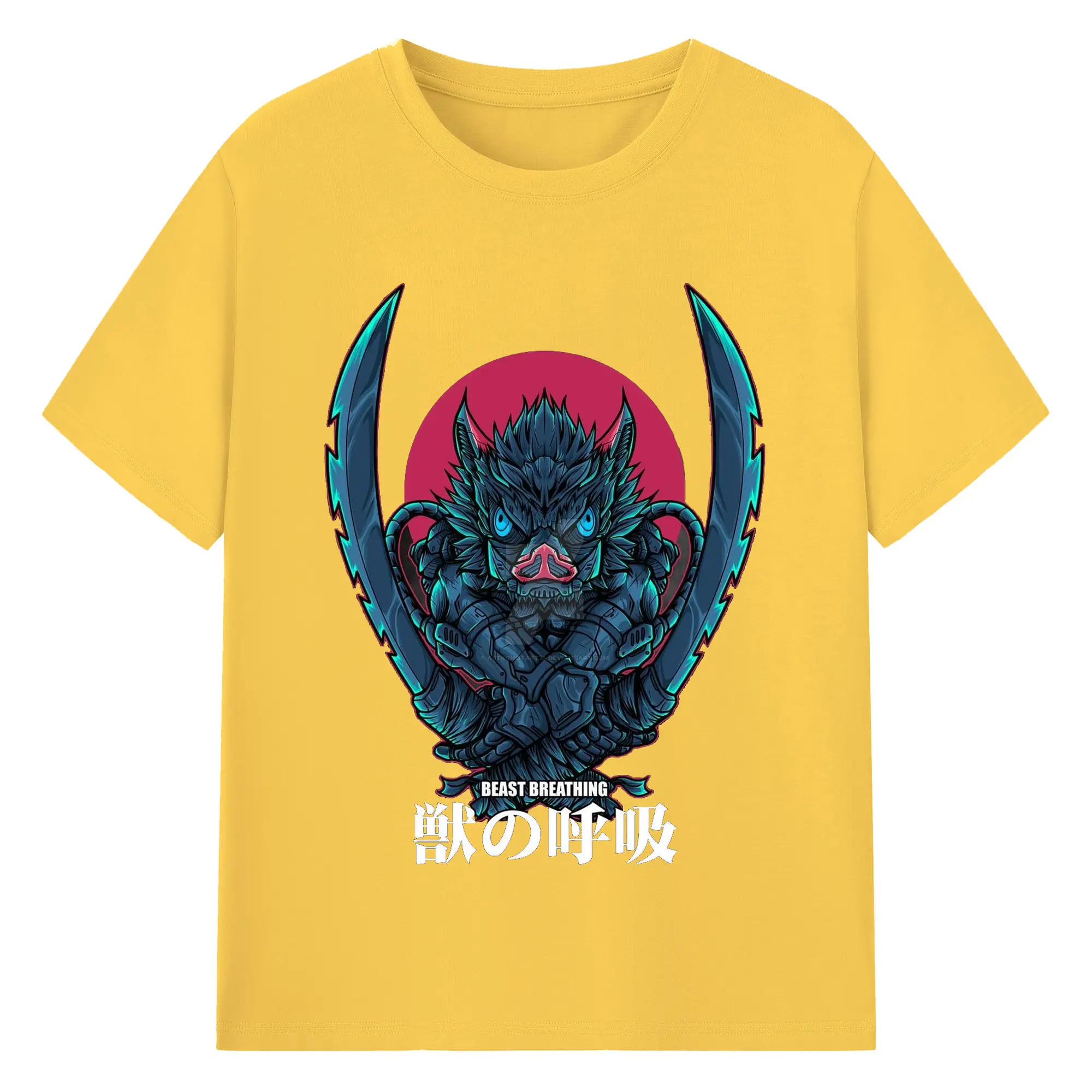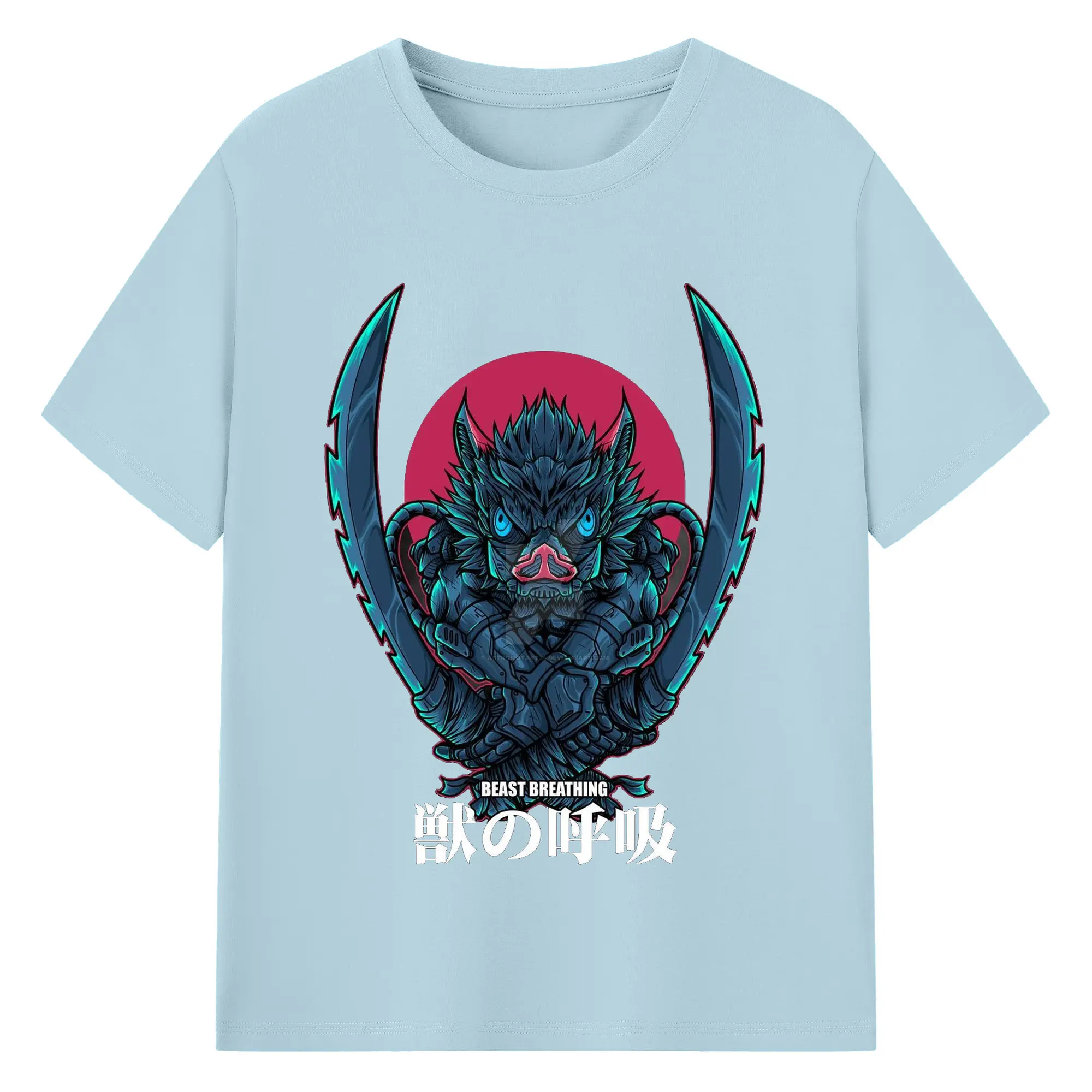鬼滅の刃 嘴平伊之助 - 綿100% 半袖Tシャツ ・ フロントプリント ・ 快適 通気性 ・ 日常使い 散歩 スポーツ用