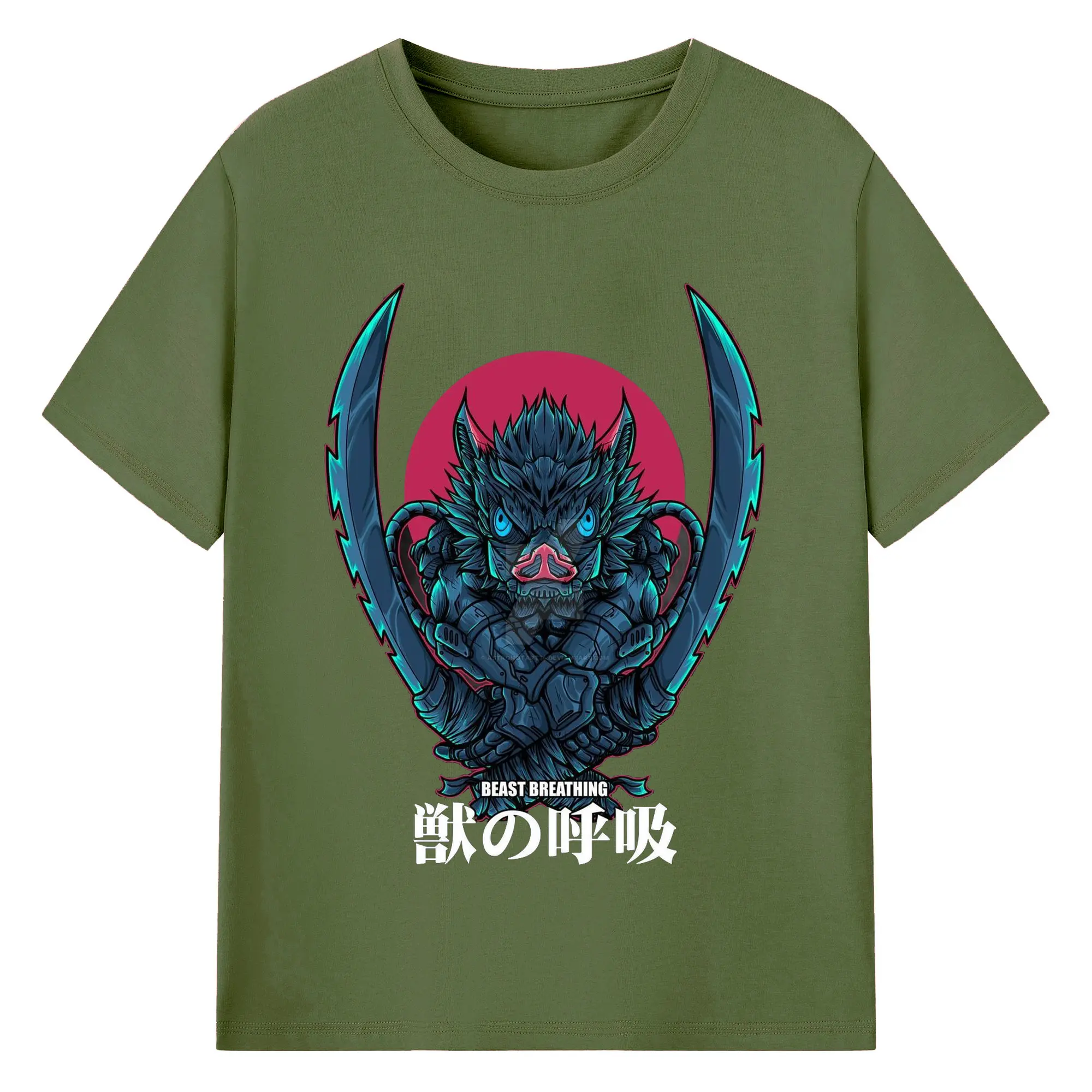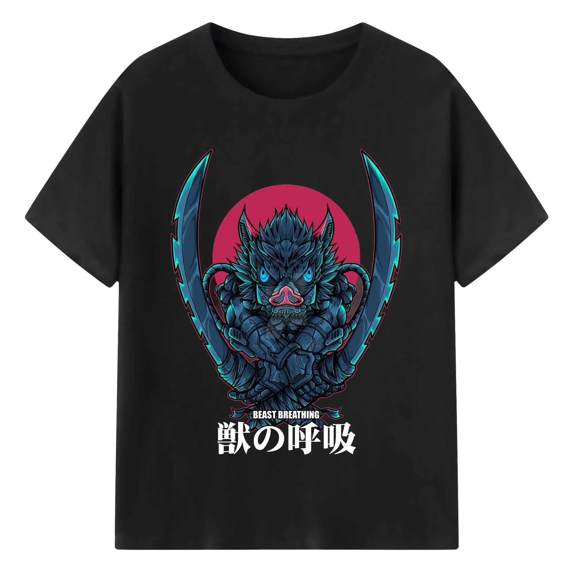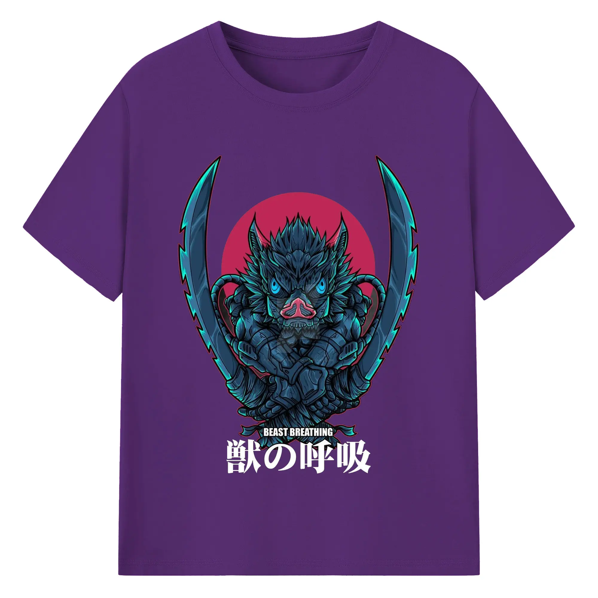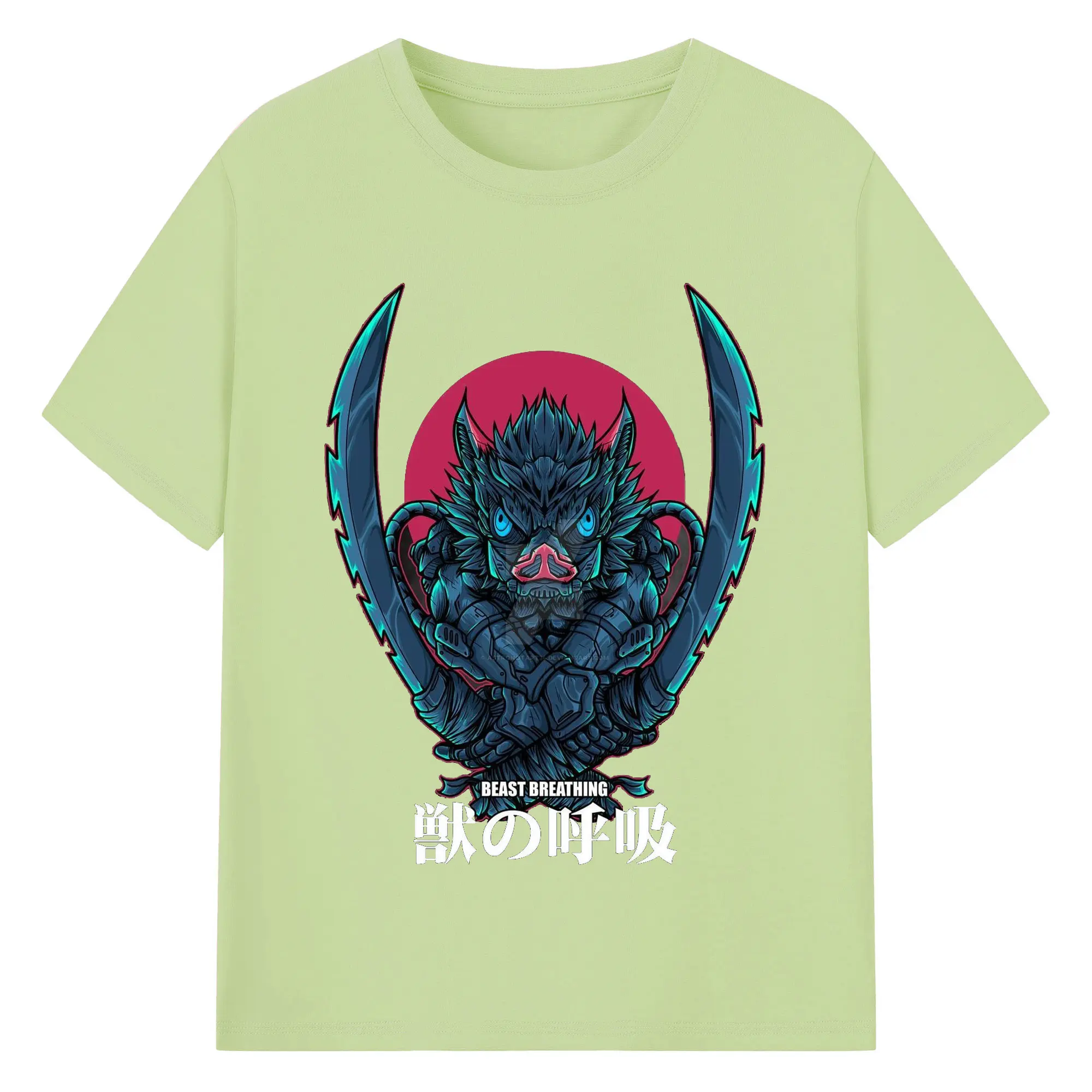 鬼滅の刃 嘴平伊之助 - 綿100% 半袖Tシャツ ・ フロントプリント ・ 快適 通気性 ・ 日常使い 散歩 スポーツ用
