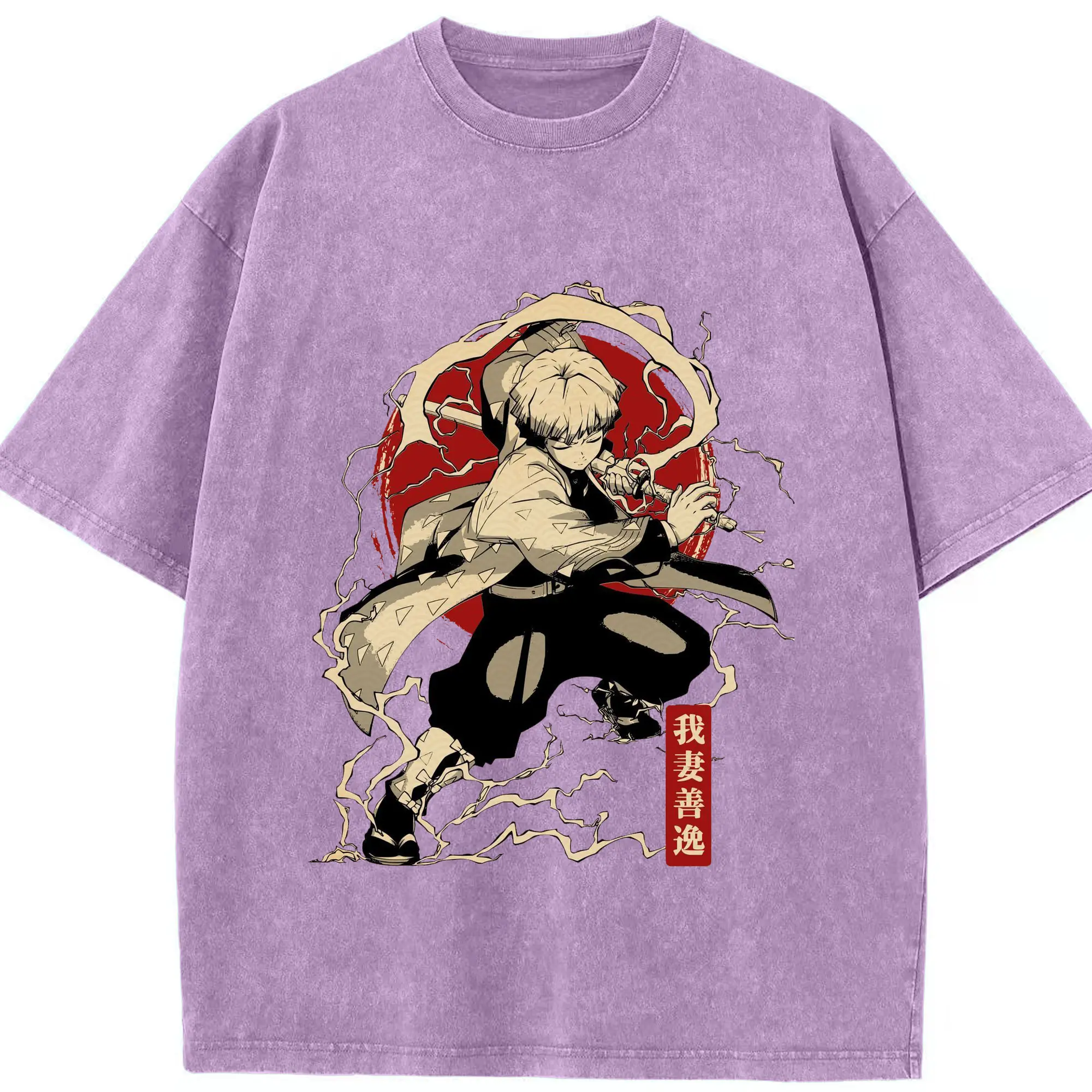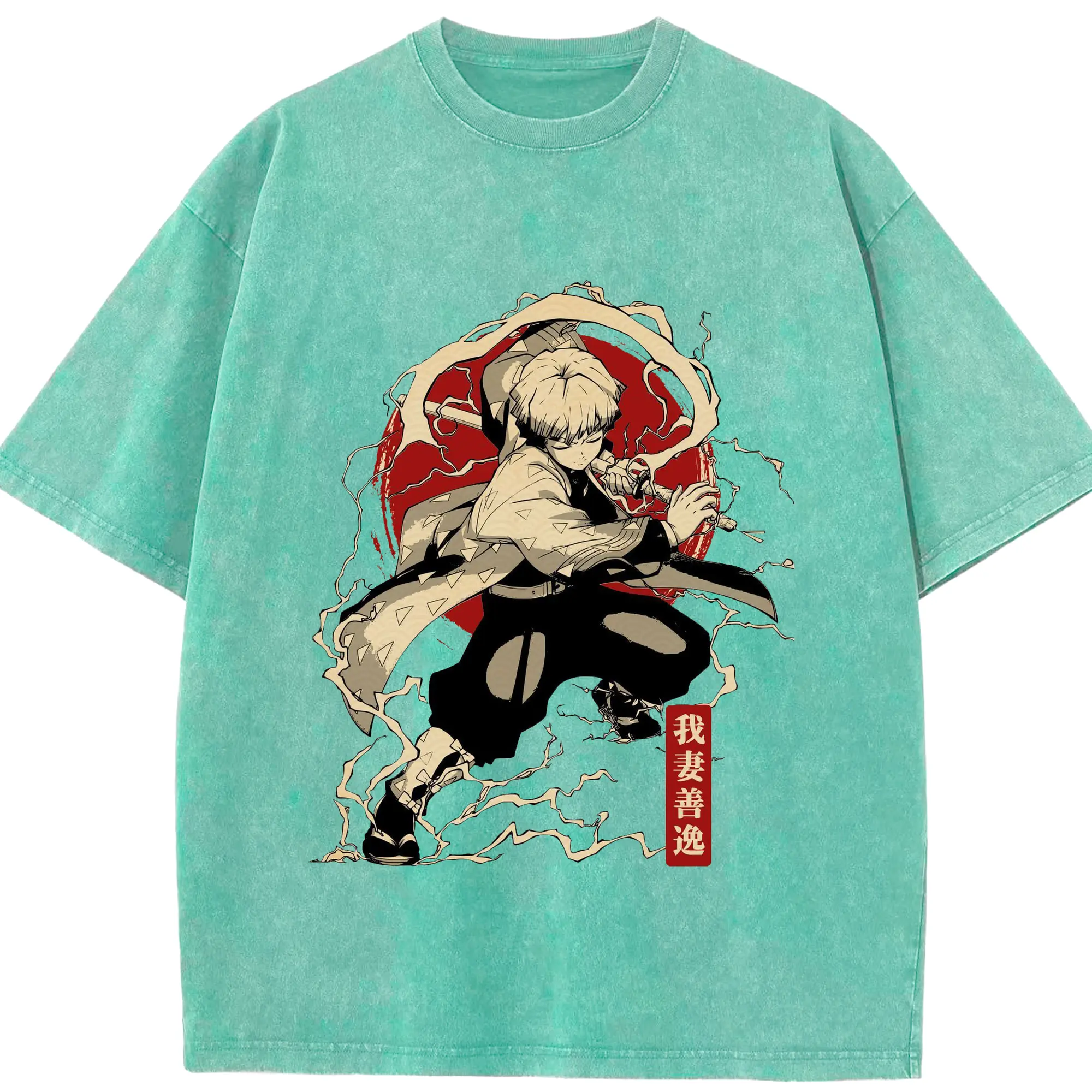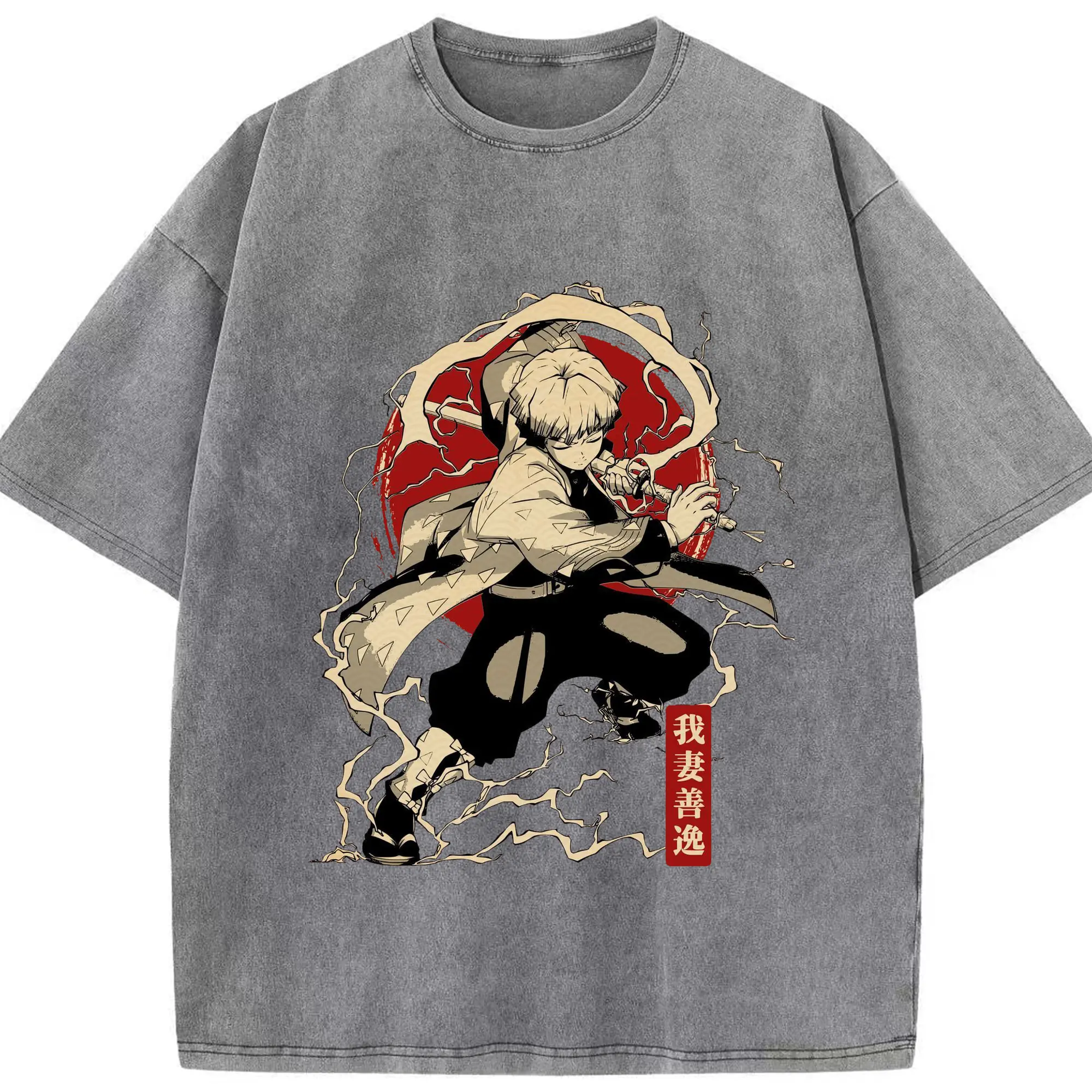 鬼滅の刃 我妻善逸 - 綿100% ヴィンテージ風 半袖Tシャツ ・ フロントプリント ・ 柔らか肌触り ・ 通気性 快適 ・ スポーツ カジュアル 外出用